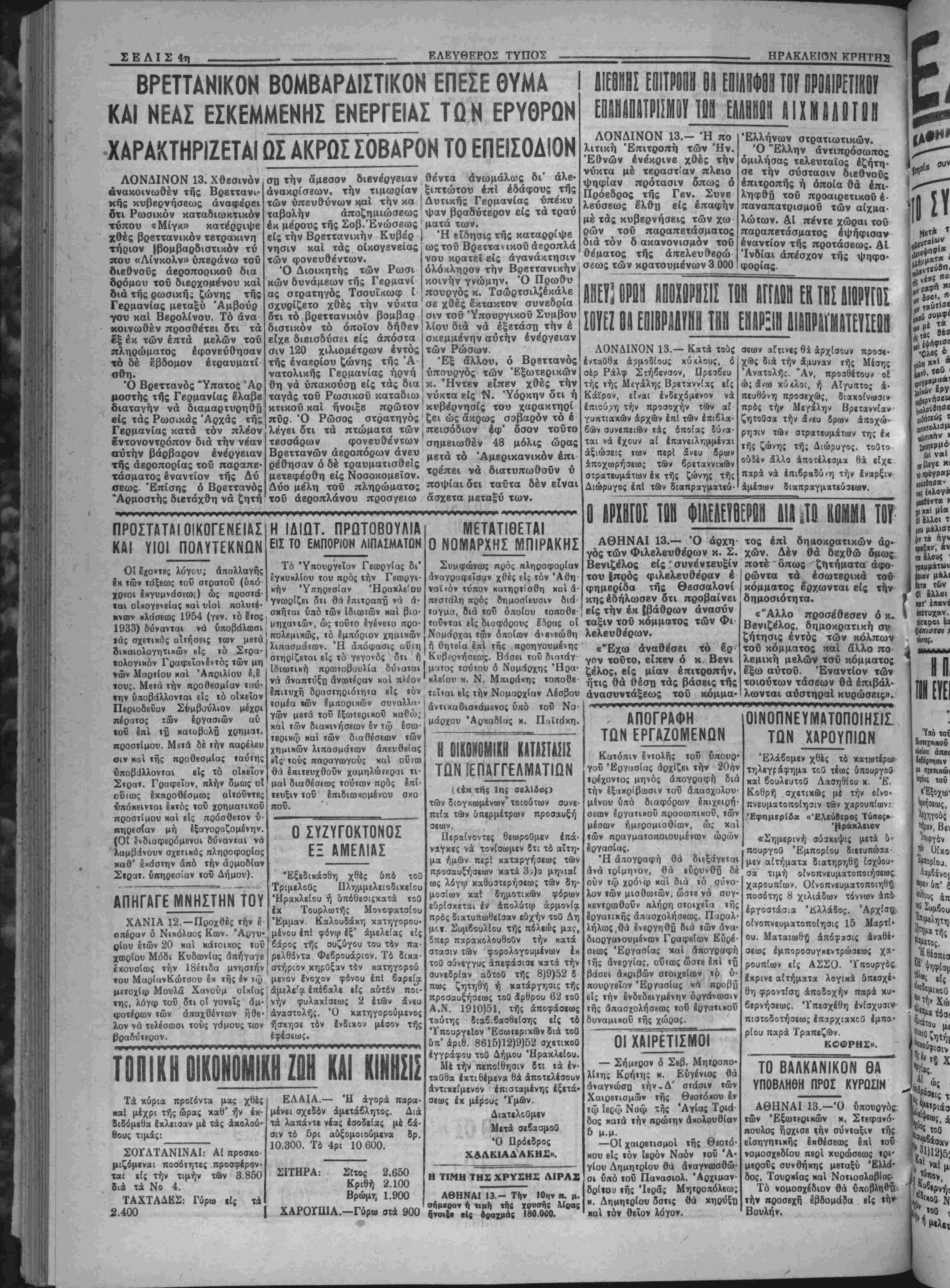 ένταθθα άρμοδίους κύ<λους, 6 σέρ Ράλφ Στήβενσον, Πρεσβευ τής τής Μεγάλης Βρετχννίας είς Κάϊρον, είναι ενδεχόμενον νά έπιούρη την προσοχήν των αί γυπτιακών άρχών επί των έπιβλα· δών συνεπειών τάς οποίας ϊύ/α· ται νά ϊχουν αί ίιτανειλημμέναι αξιώσεις των περί ανευ δρων άποχωρήσεως των βρεταννικων ατρατευμάτων έκ τής ζώνης τή; Διώρυγος έΐχΐ των διαπραγματεύ· σεων αίτινες 6λ άρχίσουν προσε· χ®ς διά την άμυναν τής Μίσης Ανατολή*:. "Αν, προοθίτουν ο! ώ; άω κύ«λοι, ή Αΐγυΐττο; α¬ πευθύνη προσεχώς, διακοίνωσιν πρός την Μεγάλην Βρεταννίαν ζητοθαα την 2/ευ δρων αποχώ¬ ρησιν των στρατευμάτων της ίκ τής ζώνης τή"; Διώριιγος. τοθτο ουδέν άλλο αποτέλεαμϊ θά εΐχβ π*ρά νά έπι6ρ»δύ/η την Εναρξιν άμέσων διαπραγματεύσεων. ο βΡΧΗΓθΐ τιιη φιαεαεμιι ιιυι κομμα τοιτ ΑΘΗΝΑΙ 13.— Ό άρχη γός των Φιλελευθέρων κ. Σ. Ββνιζέλος είς' συνέντευξιν τού |πρός φιλελευθέραν έ φημερίδα τής Θεσσαλονί κης εδήλωσεν ότι προβαίνει είς την έκ {βόθρων άνασύν τάξιν τοΰ κόμματος των Φι λελευθέρων. «"Εχω άναθέσβι τό Ιρ· γον τουτο, είπεν ό κ. Βενι ζέλος, βίς μίαν επιτροπήν, ήτις θά θέση τάς βάσβις τής ανασυντάξεως τοϋ κόμμα· "ΕξεδικάοΘη χθές δπό τοθ Τριμελοθς Πλημμελειοδιχείου "Ηρακλείου ή δπ.όθεαιςκατά τοθ έκ Τουρλωτής Μονοφατσίου Έμμαν. Καλουδάκη κατηγορου μένου ίπί φίνφ έξ' άμελείας εις βάρος τής συζύγου τού τόν πά ρελθόντα Φεβρουάριον. Τό δικα οτήριον κηρΰξαν τόν κατηγορού ' μενον ϊνοχον φόνου επί βαρεία ' άμελε'α έπέβαλε είς αυτόν ποι- {νήν φυλακίαιως 2 έτών άνευ , άναστολής. Ό κατηγορούμενος ήσκησε τόν ίνδικον μέσον τής έφέσεως. ΤΟΠΙΚΗ ΟΙΚΟΝΟΜΙΚΗ ΖΩΗ ΚΑΙ ΚΙΝΗΣΙΣ Τα κόρια προϊόντα μας χτ3ές καί μέχρι τής ώρας καθ9 ήν εκ¬ διδόμενα ίκλεισαν μέ τάς άκολού- θους τιμάς: ΣΟΥΛΤΑΝΙΝΑΙ: Αί προσχο- μιζόμεναι ποσότητες προσφέρον- ται είς την τιμήν των 3.850 διά τα Νο 4. ΤΑΧΤΑΔΕΣ: Γόρω είς τα 2.400 ΕΛΑΙΑ.— 'Η άγορά παρα· μένει σχεδόν άμετάβλητος. Διά τα λαπάντε νέας εσοδείας μέ βά¬ σιν τό 5ρι αύξομοιούμενα δρ. 10.300. Τό 4ρι 10 600. ΣΙΤΗΡΑ: Σΐτος 2.650 Κριθή 2.100 Βρώμτ; 1.900 ΧΑΡΟΥ111Α.—Γύρω σία 900 Η ΟΙΚΟΚΟΜΙΚΗ ΚΑΤΑΣΤΑΣΙΣ ΤΩΝ ΙΕΠΑΓΓΈΛΜΑΤ1ΩΝ ι (έκ της 1η$ σελίδος) των διογκωμένιον* τοιούτων συνε¬ πεία των ΰπερμέτρων προσαυξή σεων. Περαίνοντες θεωροθμεν Ιπά- ναγχες νά τονίσωμεν δτι τό αϊτη· μα ημών περΐ καταργήσεως των προσαυξήαεων κατά 3>)ο μηνιαί