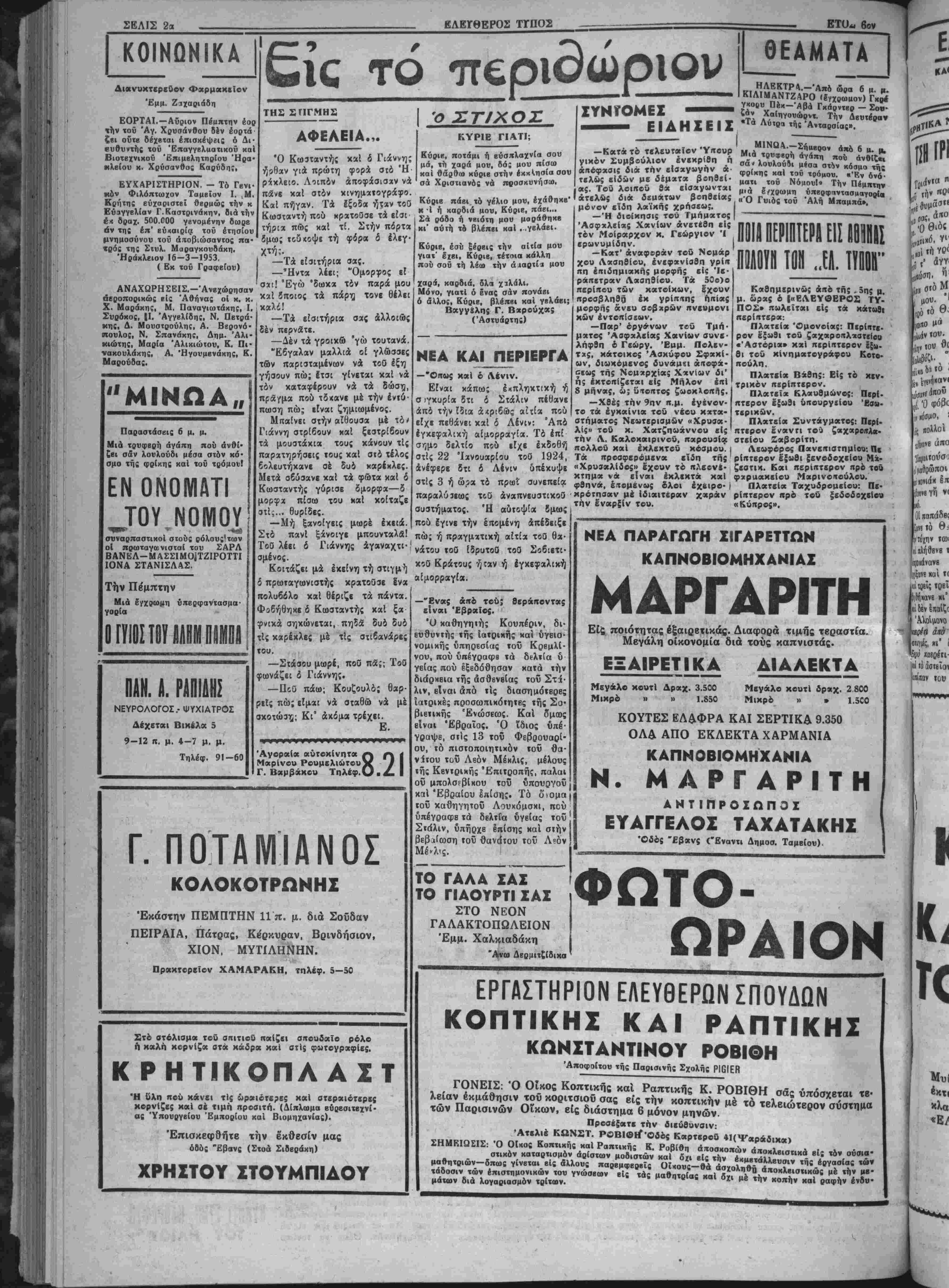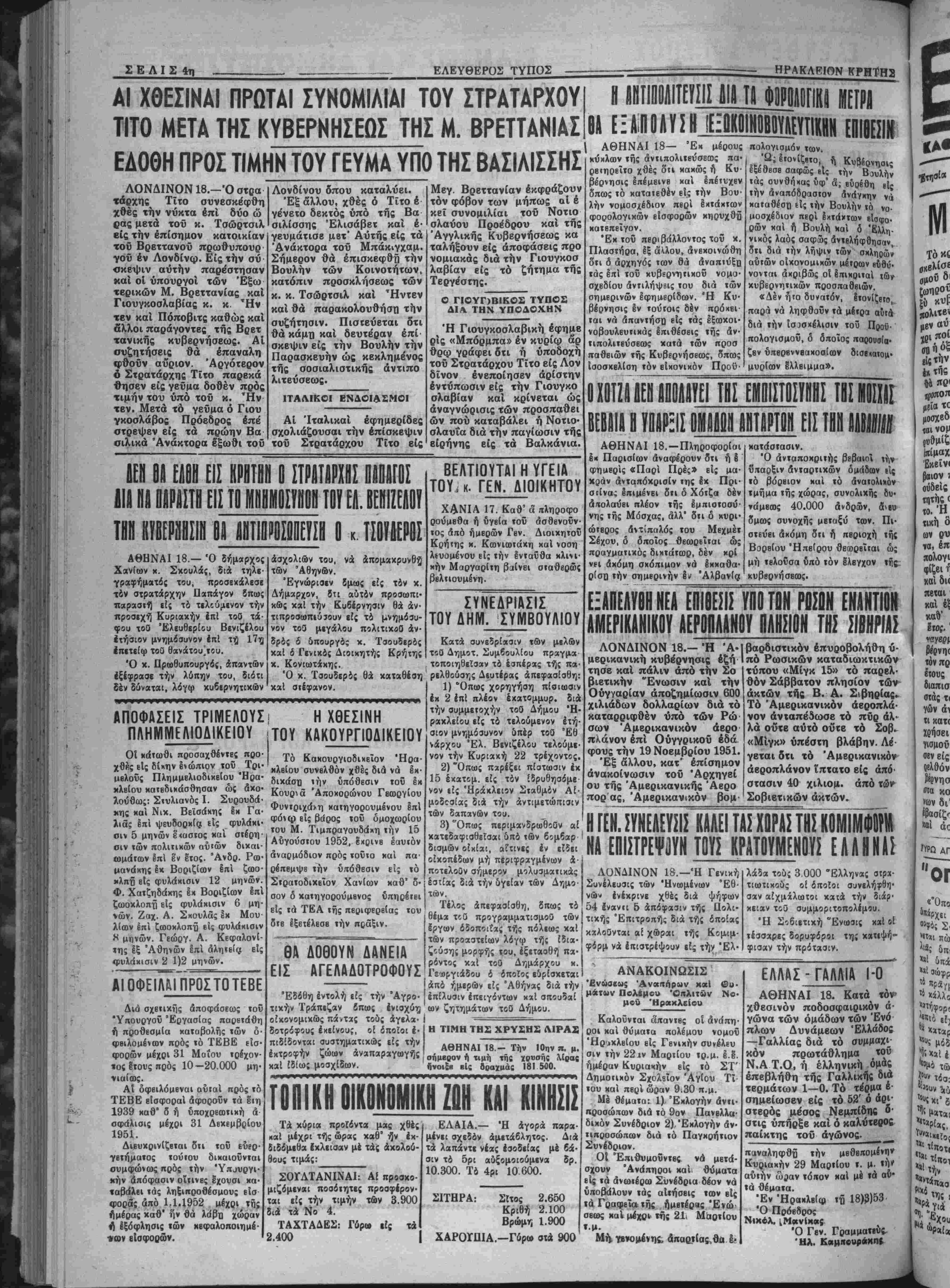 την σημερινήν έ*< Άλβανία κατάστασιν. Ό άνταποχριτής βεβαιοί την ΰιταοξιν ανταρτιχών δμάδων είς τό βόρειον καί τό ανατολικήν τμήμα τής χώρας, συνολιχης δυ¬ νάμεως 40.000 άνδρών, δ»Βυ δμως συνοχης μετηξύ των. Πι· στεύει άχόμη δτι ή πεοιοχή τής Βοοβίου Ηπείρου θβωοεΐται ώ; μή τελοΰσα υπό τόν έλεγχον τής. κυβερνήσεως. ΕΞΑΠΕΛΥΒΗ ΗΕΑ ΕΠΙΒΕΣΙΣ ΥΠΟ ΤΟΝ ΡΟΪΟΗ ΕΝΑΝΤΙΟΝ ΑΜΕΡΙΚΑΝΙΚΟΥ ΑΕΡΟΠΛΑΝΟΥ ΠΛΗΣΙΟΝ ΤΗΣ ΣΙΒΗΡΙΑ! ΛΟΝΔΙΝΟΝ 18.- Ή Ά- μερικανική κυβέρνησις έζή τησε καί πάλιν άπό την Σο βιβτικήν "Ενωσιν καί την Ούγγαρίαν αποζημίωσιν 600 χιλιάδων δολλαρίων διά τό καταρριφθέν υπό των Ρώ σων Αμερικανικόν άερο πλάνον επί Ούγγρικοΰ εδά φους την 19 Νοεμβριού 1951. Έξ άλλου, κατ' επίσημον ανακοίνωσιν τοΰ 'Αρχηγεί ου τής 'Αμερικανικής 'Αβρο πορ άς, Αμερικανικόν βομ- βαρδιστικόν έπυροβολήθη υ¬ πό Ρωσικών καταδιωκτικών τύπον «Μίγκ 15» τό παρελ¬ θόν Σάββατον πλησίον των άκτών τής Β. Λ. Σιβηρίας.. Τό Αμερικανικόν άεροπλά- νόν άνταπέδωσε τό πΰρ άλ· λά όντε αΰτό όντε τό Σοβ. «Μίγκ» υπέστη βλάβην. Λέ γεται δτι τό Αμερικανικόν άεροπλάνον ΐπτατο είς από¬ στασιν 40 χιλιομ. άπό των- Σοβιετικών άκτών. Η ΓΕΝ. ΣΥΝΕΛΕΥΣΙΣ ΚΛΛΕΙ ΤΑΣ ΧΟΡΑΣ ΤΗΣ ΚΟΜΙΜΦΙγΗ ΗΛ ΕΠΙΣΤΡΕΨΗ ΤΟΥΣ ΚΡΑΤΟΥΜΕΝΟΥΣ ΕΛΛΗΝΑΣ ΛΟΝΔΙΝΟΝ 18.—Ή Γενική Συνέλευσις των Ήνιομένων Εθ¬ νών ενέκρινε χθές διά ψήφων 54 ίνανιι 5 απόφασιν τής Οολι- τικής Επιτροπήν διά τής οποίας καλοθνται αί χώραι τής Κομιμ- φίρμ νά έπιστρέψουν είς την Έλ· λάδα τοΰς 3.000 "Ελληνας στρα¬ τιωτικάς οί ίποΐοι συνελήφθη¬ σαν αίχμάλωτοι χα:ά την διάρ¬ κειαν τοθ συμμοραοπολίμου. Ή Σοδιετική Ένωσις καί οί τέσσαρες δορυφίροι της χατιψή- φισαν την πρότασιν. Η ΤΙΜΗ ΤΗΣ ΧΡΥΣΗΣ Λ1ΡΑΧ ΑΘΗΝΑΙ 18.- Την ΙΟην π. μ. σήμερον ή τιμή τής χρυσή; λίρας ήνοιίβ βίς δραχμάς 181 500. ΤΟΠΙΚΗ ΟΙΚΟΝΟΜΙΚΗ ΖΟΗ ΚΑΙ ΚΙΝΗΣΙΣ Τά κύρια προΓδντα μας χθές καί μέχρι τής ώρας καθ ήν έκ- ϊιδόμεθα {χλεισαν μέ τάς άχολού- θους τιμάς: ΣΟΥΛΤΑΝΙΝΑΙ: Αί ιτροσχο- μιζέμεναι ποσόΊητες προσφέρον- ται είς την τιμήν των 3.900 διά τα Νο 4. ΤΑΧΤΑΔΕΣ: Γύρ» είς 2.400 τά ΕΛΑΙΑ.— Ή άγορά παρα- μένει σχεδον άμετάβλητος. Διά τά λαπάντε νέας εσοδείας μέ βά¬ σιν το 5ρι αύξομοιούμενα δρ. 10.300. Τό 4ρι 10600. ΣΙΤΗΡΑ: 2ΐτος 2.650 Κριθή 2.100 Βρώμη 1.900 ΧΑΡΟΓΠΙΑ.—Γ6ρ» στά 900 ΑΝΑΚΟΙΝΩΣΙΣ Ενώσεως #Αναιτηρων καΐ @υ· μκτΜν Πολέμου Όπλιτών Νο· μοΰ Ήρακλβίοι» Καλοΰνται άπαντες οί άνάπη- ροι καί θύματα πολέμου νομοϋ Ήβ'^κλείου είς Γενικήν συνέλευ σιν την 22 ιν Μαρτίου τη.μ. ε.έ. ημέραν Κυριακήν είς (ό ΣΤ' ΔημοτΐΗΟν Σχολείον ΆγΙου Τί¬ του καί περί ώραν 9.30 π.μ. Μέ θέματα: 1), Εκλογήν άντι- ηοοσώηων διά τό 9ον Πανελλα- δικόν Συνέδριον 2) Εκλογήν άν ιιποοσώπων διά τό Παγκοήΐιον Συνέδριον. Οί Επιθυμούντες νά μετά¬ σχουν Άνάπηροι καί θύματα είς τά ανωτέρω Συνέδρια δέον νά ύποβάλουν τάς αίτήσεις των είς τά Γραφεΐα τής ήμετέρβς Ένώ σεως χα· μέχοι »ή. 21, Μαοτίου τ.μ. Μή, τβνομένης, απαριίας,θα. εί, ΕΛΛΑΣ - ΓΑΛΛΙΑ Ι-Ο ΑΘΗΝΑΙ 18. Κατά τόν χθεσινόν ποδοσφαιρικόν ά- γώνα των όμάδων των Ένό πλων Δυνάμεων Ελλάδος —Γαλλίας διά τό συμμαχι κόν πρωτάθλημα τοΰ Ν.Α Τ.Ο, ή έλληνική ομάς επεβλήθη τής Γαλλικής δι* τβρμάτων 1—Ο. Τό τέρμα ε¬ σημείωσεν είς τό 52' ό άρι- στερός μβ'σος Νεμπίδτκ ό¬ στις ΰπήρξβ καί ό καλύτερος παίκτης τοΰ αγώνος. πιιναληφβ'ό την μβθβπομένην Κυριακήν 29 Μαοτίου τ. μ. τή* αυτήν ώ^αν τόιιον καί μέ ιά αυ· τά θέματα. Έν ΉρακλβΙφ τη 18)3)53 Ό Πρόεδρος Νικόλ. ιΜοτνίχοις Ό Γεν. Γραμματϊύς. Ηλ. Κ«μκο»ρ·κηι