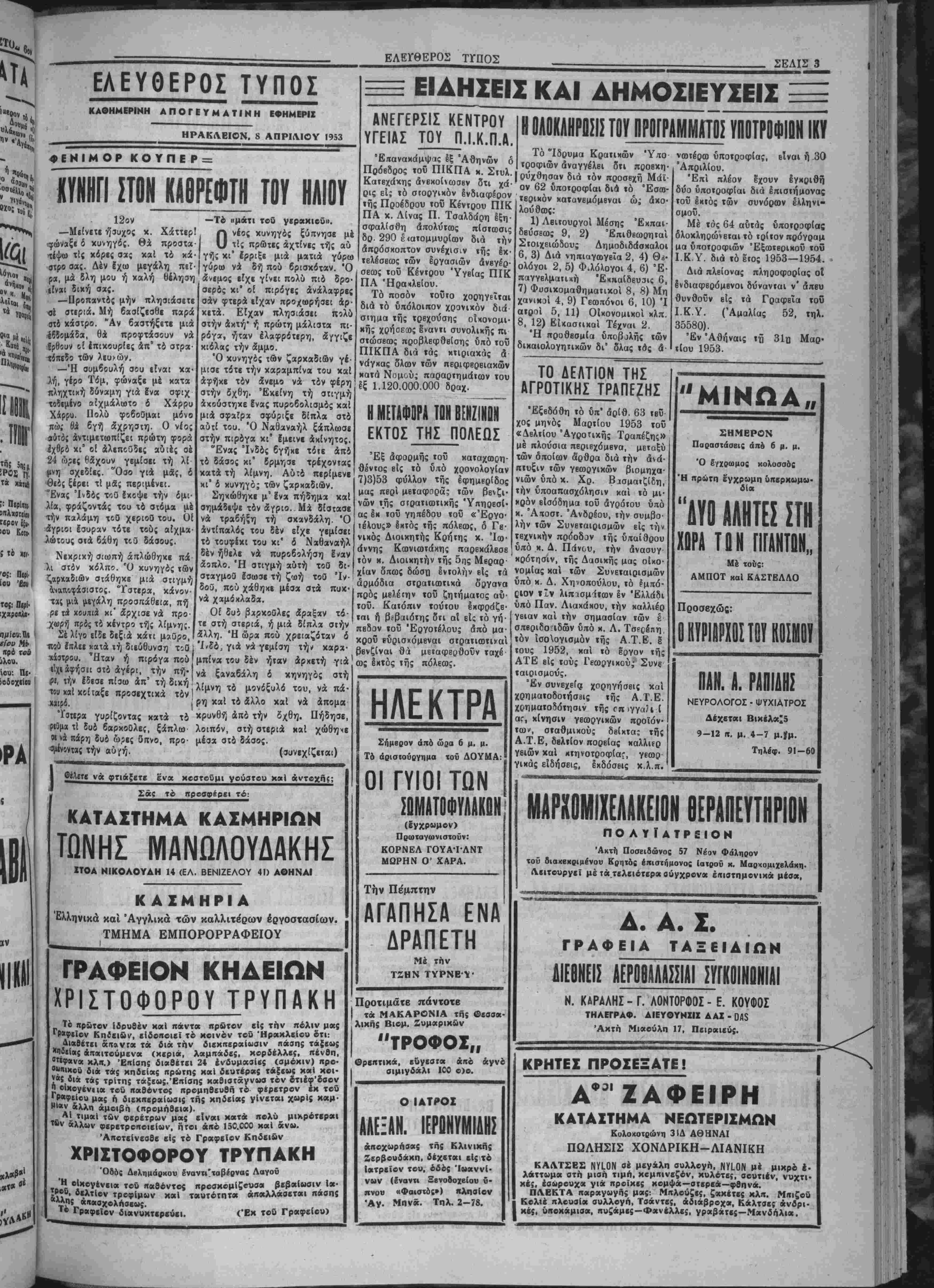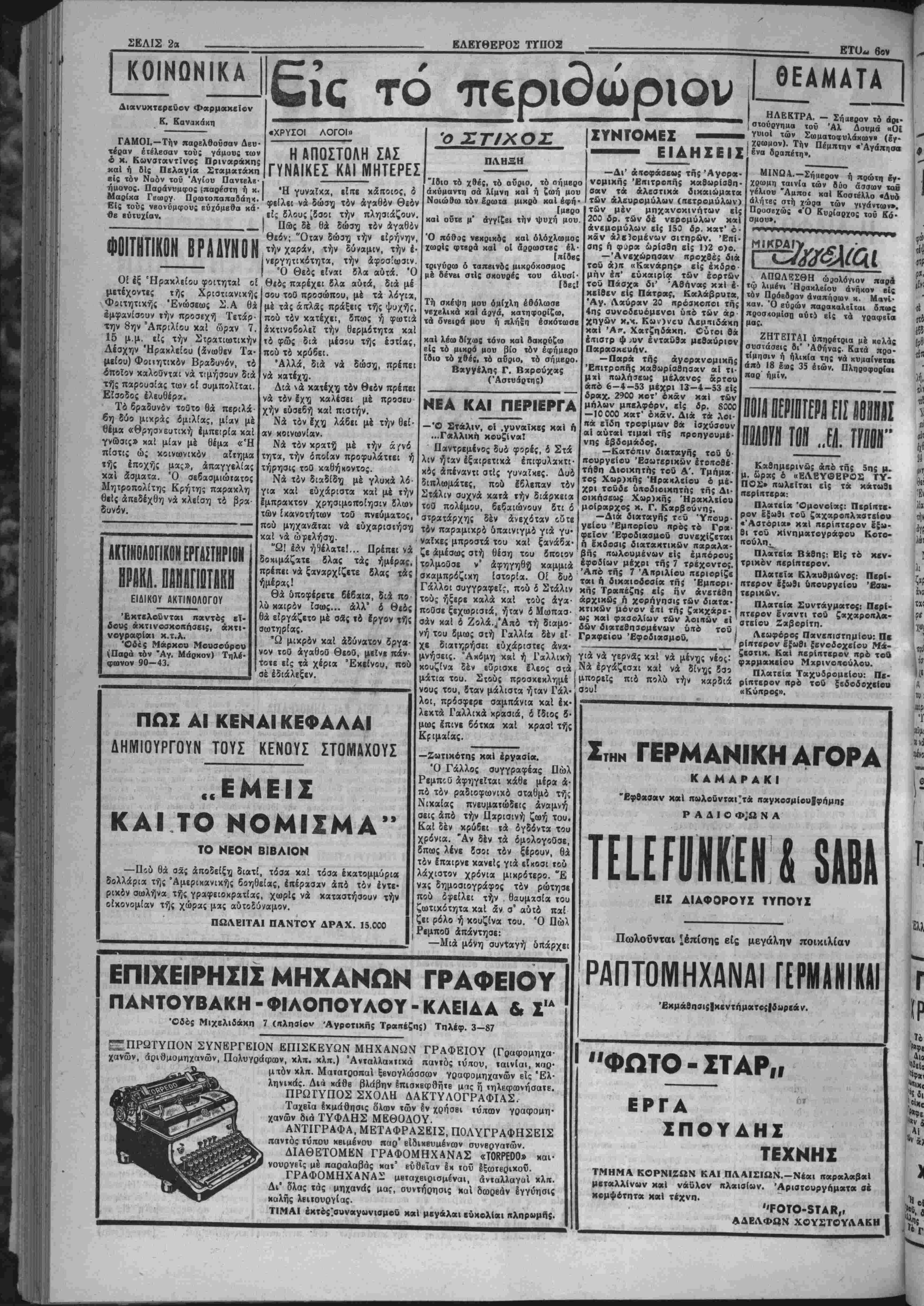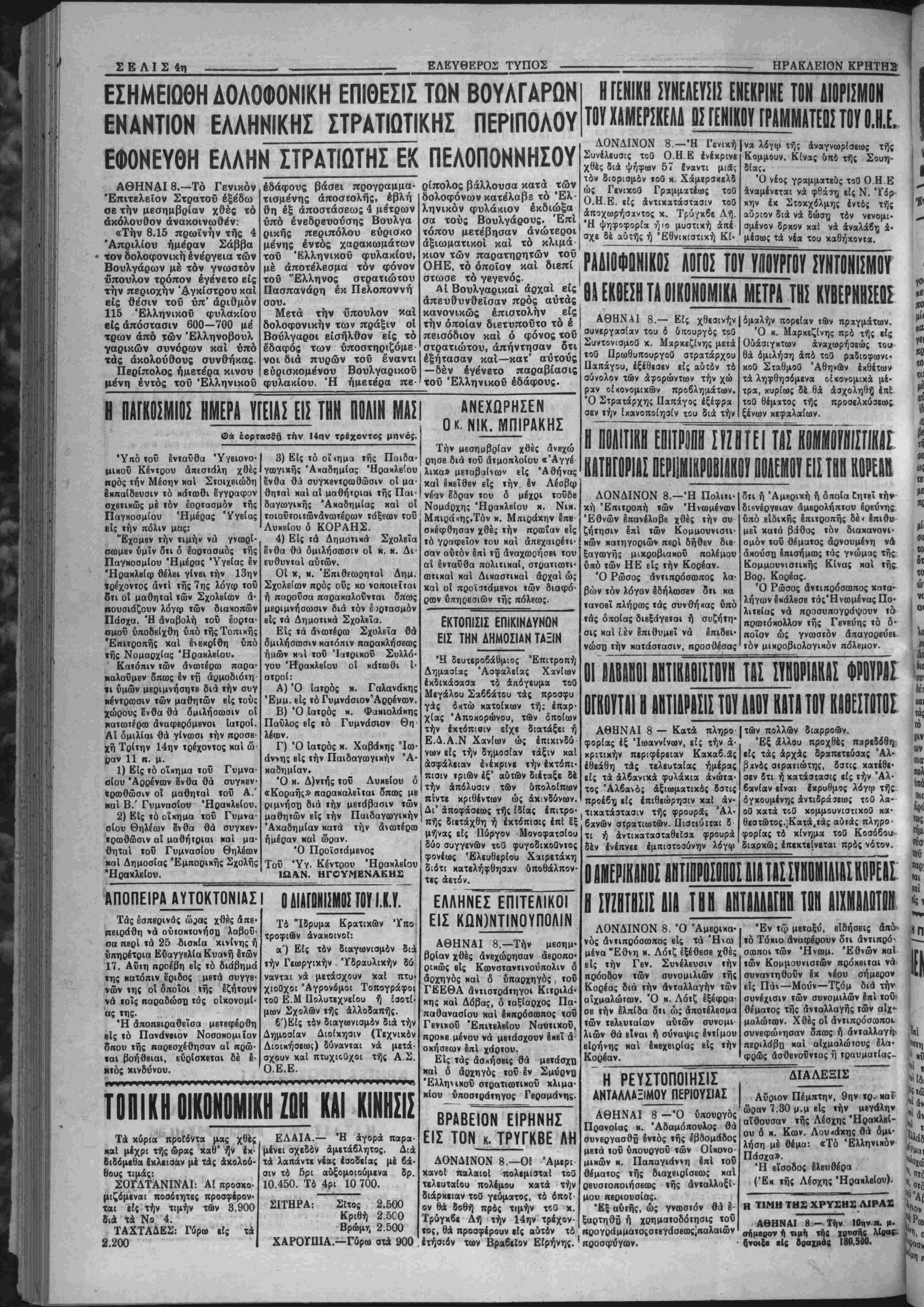 "Η ψηφοφορία ή<ο μυστική άπέ σχε δέ αυτής ή Έθνικιστική Κί· να λίγφ τή; άναγνωρίσεως τής Κομμουν. Κίνας δπό τί); Σουη¬ δίας. Ό νέος γραμματεύς τοθ Ο.Η.Ε αναμένεται νά φθάση είς Ν. "Υόρ κην έκ Στοκχόλμης Ιντα; τής αυριον διά νά δώση τόν νενομι- σμένον δρκον χαί νά αναλάβη ά· μέσω; τα νέα τού χαθήκονια. ΡΑΛΙΟΦΟΝΙΚΟΣ ΑίίίΣ ΤΟΥ ΥΛΒΪΡΓΟΥ ΣΥΝΤΟΝΙΣΜΟΥ ΗΠΚΟΕΣΗΤΑΟΙΚίΗίΜΙΚΑΜΕΤΡΑΤΗΣ ΚΥΒΕΡΝΗΣΕΙ! ΑΘΗΝΑΙ 8.— Είς χθεσινήν|ομαλήν πορείαν τδν πρχγμάτων. συνεργασίαν τού ό δπουργός τοθ Ό κ. Μ»ρκεζίνης πρό τής είς ΣυντονισμοΟ χ. Μαρχεζίνης μειά τοθ Ηρωθυπουργοΰ στρατάρχου Παπάγου, έξέθεσεν είς αυτόν τό σύνολον των άφορώντων την χώ ραν οίκονομιχών προβλημάτιαν. Ό Στρατάρχη; Παπάγος ίξέφρα σεν την ικανοποίησιν τού διά την Οδάσιγκτων αναχωρήσεως τοι* θά ομιλήση άπό τοθ ραδιοφωνι· κοθ Σταθμοΰ Αθηνών έκθέτων τά ληφθησόμενα οίκονομικα μέ- τρα, κυρίως δέ θά άσχοληθ-ζ ίηΐ τοθ θίματο; τής προοελκύσεω; ξένων κεφαλαίων. Η ΠΟΑΙΤΙΚΗ ΕΟΙΤΡΜΐΊ ΙΪΖΗΤΕΙ ΤΑΣ ΚΙΤΙΤΟΡΙΙΣ ΠΕΡΙίΜΙΚΡΟβΙΛΗΟΪ Ι1ΕΜ0Υ ΕΙΣ ΤΙΙΙΙΚΙ1 ΛΟΝΔΙΝΟΝ 8.—Ή Πολιτι· χή Έπιτροπή των Ήνωμένων Εθνών έπανέλοββ χθές την συ ζήτησιν επί «ών Κομμουνιστι- κων κατηγοριών περί δήθεν διβ- ξαγοαγή; μιχροβιακοΰ πολέμου υπό των ΗΕ εί; την Κορέαν. Ό Ρώσος άντιπρόσωπος λα¬ βών τόν λόγον εδήλωσεν οΊι χά τανοεΐ πλήρως τάς συνθήκας υπό τάς οποίας διεξαγβται ή συζητη· σις καί Ιέν έπιθυμεΐ νά έπιδει- την κατάστασιν, προσθέσας δτι ή Άμβριχή ή διτοΐα Γητβΐ την διβνέργβιαν άμβρολήπτου ερεύνης υπό είδικής έπιτροπή; δέ ν §πιθν μ εί χατά βάθος τόν διακανονι¬ σμόν τοϋ θέματος αρνουμένη νά άχούστι επισήμως τάς γνώμας τής Κομμουνιστικήν Κίνα; καΐ «ής Βορ. Κορέας. Ό Ρώσος άντιπρόσαΐπος κατα¬ λήγων εκάλεσε τάςΉνωμένας Πο· λιτείας νά προσυπογράψουν τό πρωτόκολλον τή; Γβνεύη; τό δ· ποίον ώ; γνωστόν απαγορεύει τόν μικροβιολογιχόν πόΆβμον. ΟΙ ΒΛΒίΙιΊΟΙ ΙίΤΙΙΙΙίΙΙΙίΤΙΙ Τ»Ι ίΥΒΡΡΙΑΚΟΙ ΦΡΟΥΡΑΙ ΟΓΚΟΥΤΑΙ Η ΑΠΤ1ΑΡΑΣΙΣ ΤΟΥ ΑΑΟΤ ΗΑΤΑ ΤΟΤ ΚβΒΕΣΤΐΙΤαΣ ΑΘΗΝΑΙ 8 — Κατα πληρο φορίας έξ Ιωαννίνων, εί; την ά- χριτιχήν περιφέρειαν Καχαβ.βς εθεάθη τάς τελευταίας ημέρας είς τά άλβανιχά φυλάχια άνώτα· τος Άλβανό; άξιωματιχός δστις προέβη είς επιθεώρησιν χαί άν· τιχατάστασιν τής φροκρδ; Άλ· βανων στρατιωτών. Οισΐιύίται δ τι ή άντικατασταθεΐσα φρουραί δέν ένέπνεε ίμπιστοσύνην λίγψ Ι των πολλών διαρροών. Έξ αλλου προχθές παρεδόθη είς τάς αρχάς δραπετεΰσας Άλ· βχνός στρατιώτας, δστις κατέθε¬ σεν δτι ή κατάστασις είς την Αλ¬ βανίαν είναι ίκρυθμο; λόγω τής δγχουμένη; αντιδράσεως τίθ λα· οθ χατά τοθ κομμουνιστικαί] χα· θεστώτος.ϊΚατά,ΐάς αύτάς πληρο¬ φορίας τό κίνημα τοθ Κοσάβου διαρχώ; ίπεχτείνιται πρός νότον. ΜΜΜΜΙ ΰπΙΙΠΡΟΣΰΠΟΣ Α1Α ΤΑΣ 1ΪΜ0Μ1&1ΑΙ ΚΡΡΕΑΣ Ι ΣΥΖΗΤΗΣΙΣ 11) ΤΙΗ ΑΗΤΑΑΑΑΓΒΒ ΤΟΗ (ΜΙΜ ΛΟΝΔΙΝΟΝ 8. Ό Άμερικα- νός άντιπρόσωπος είς τα Ήνω μενά "Εθνη κ. Λότζ εξέθεσε χθέ; εί; την Γεν. Συνέλευσιν την πρόοδον των συνομιλιών τής Κορέας διά την ανταλλαγήν των αϊχμαλώτων. Ό κ. Λότζ εξέφρα¬ σε την έλπίδα δτι ώ; άποτέλεσμα των τελευταίον αυτών συνομι λιών θά είναι ή συναψις έντίμου είρήνης καί έκβχειρίας είς την Κορέαν. Έν τώ μεταξύ, είδήσεις αηό «ό Τονιο άναφέρουν ότι άντιπρό- σοοποι των 'Ηνωμ. Εθνών καί των Κομμουνισιών πρόκειται νά συναντηθοΰν έκ νέου σήμερον είς Πάν—Μούν-Τζόμ διά την συνέχισιν των συνομιλών επί τοΰ- θέματος τής δνταλλαγής των αΐχ- μαλώτων. Χθέ; οί αντιπρόσωπον συνεφώνησαν δποο; ή ανταλλαγήν περιλάβη καί αΐχμαλώτους Ιλα· φρόός άσθενοΰντας ή τραυματίας- Η ΡΕΥΣΤΟΠΟ