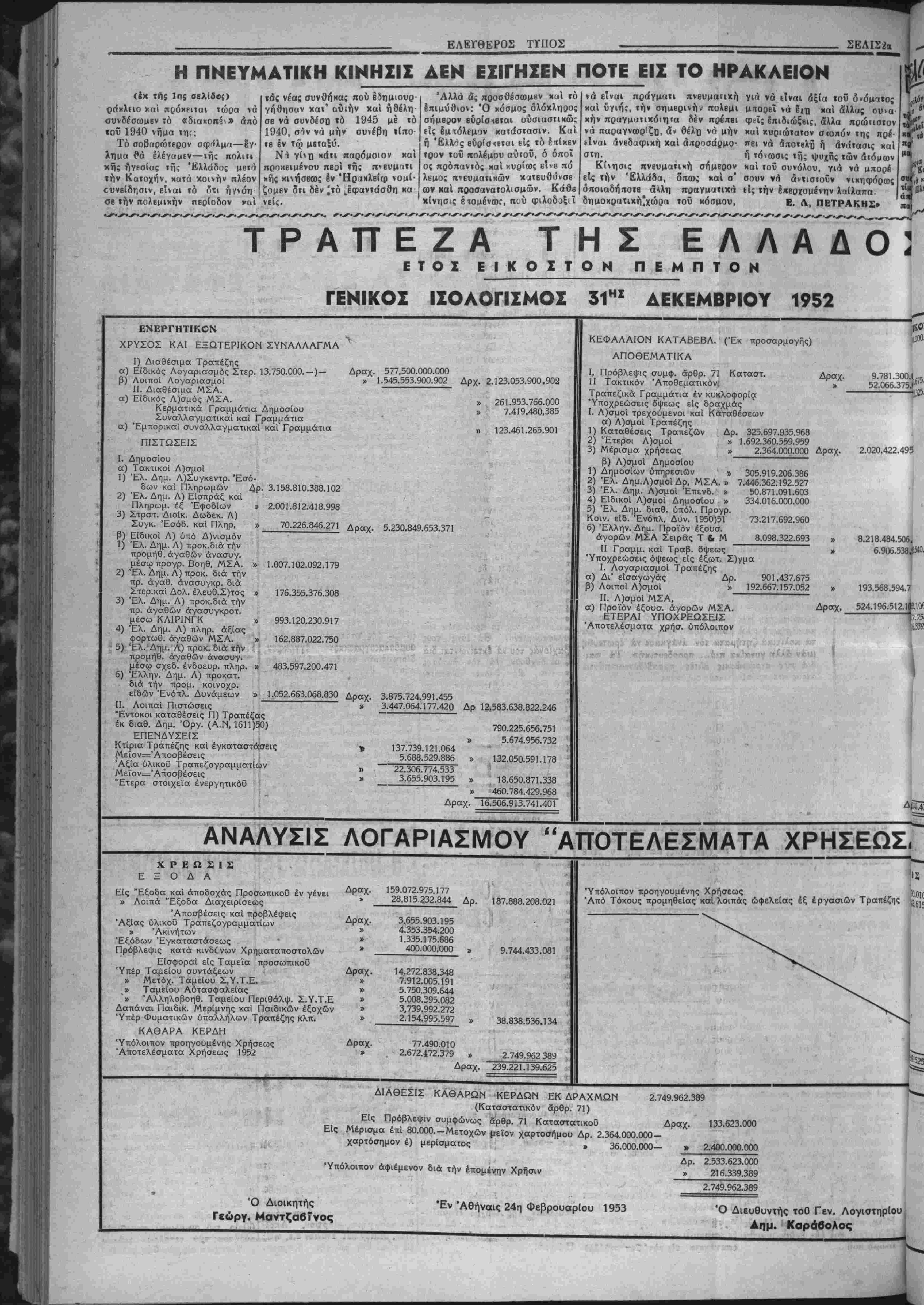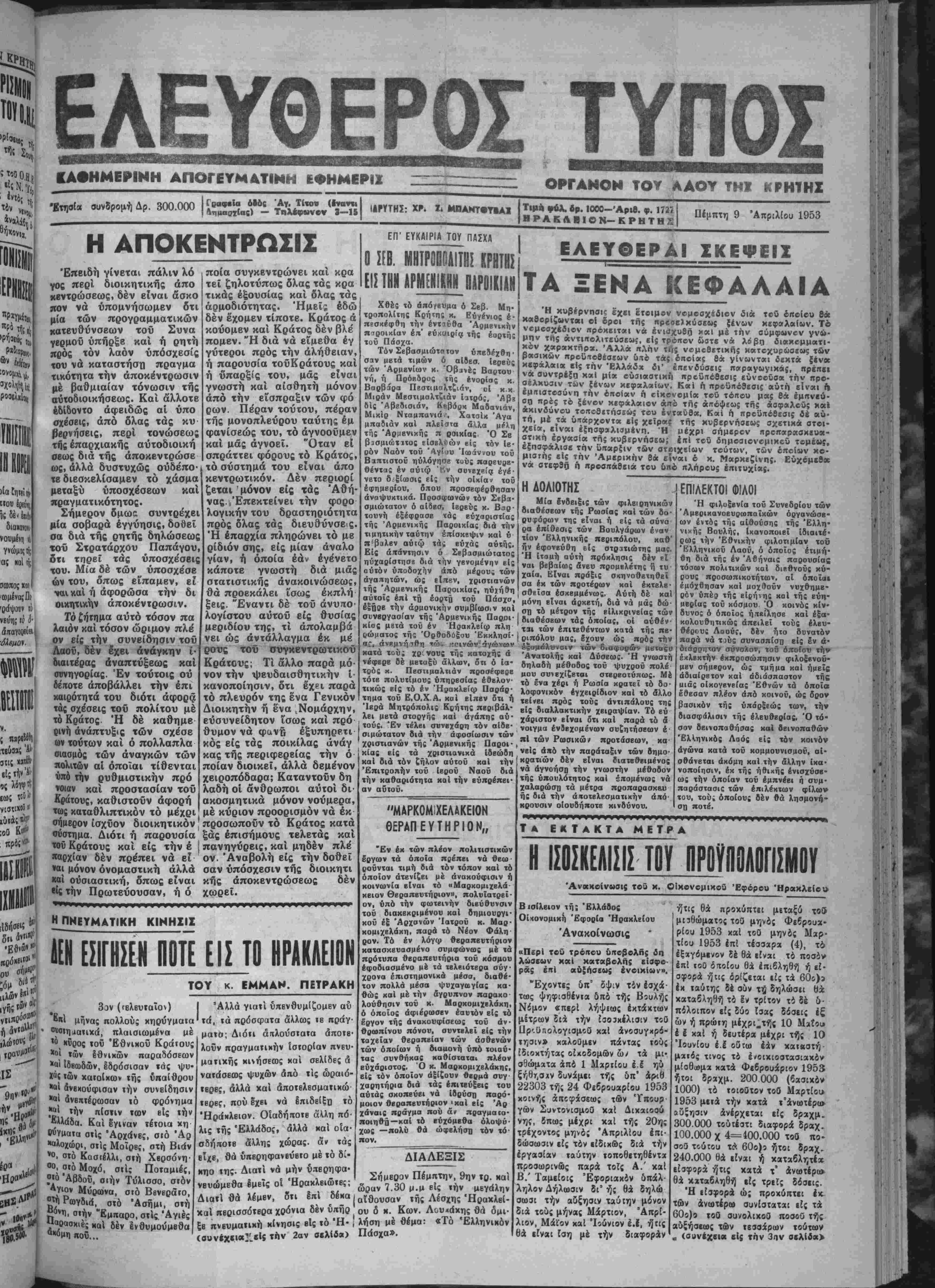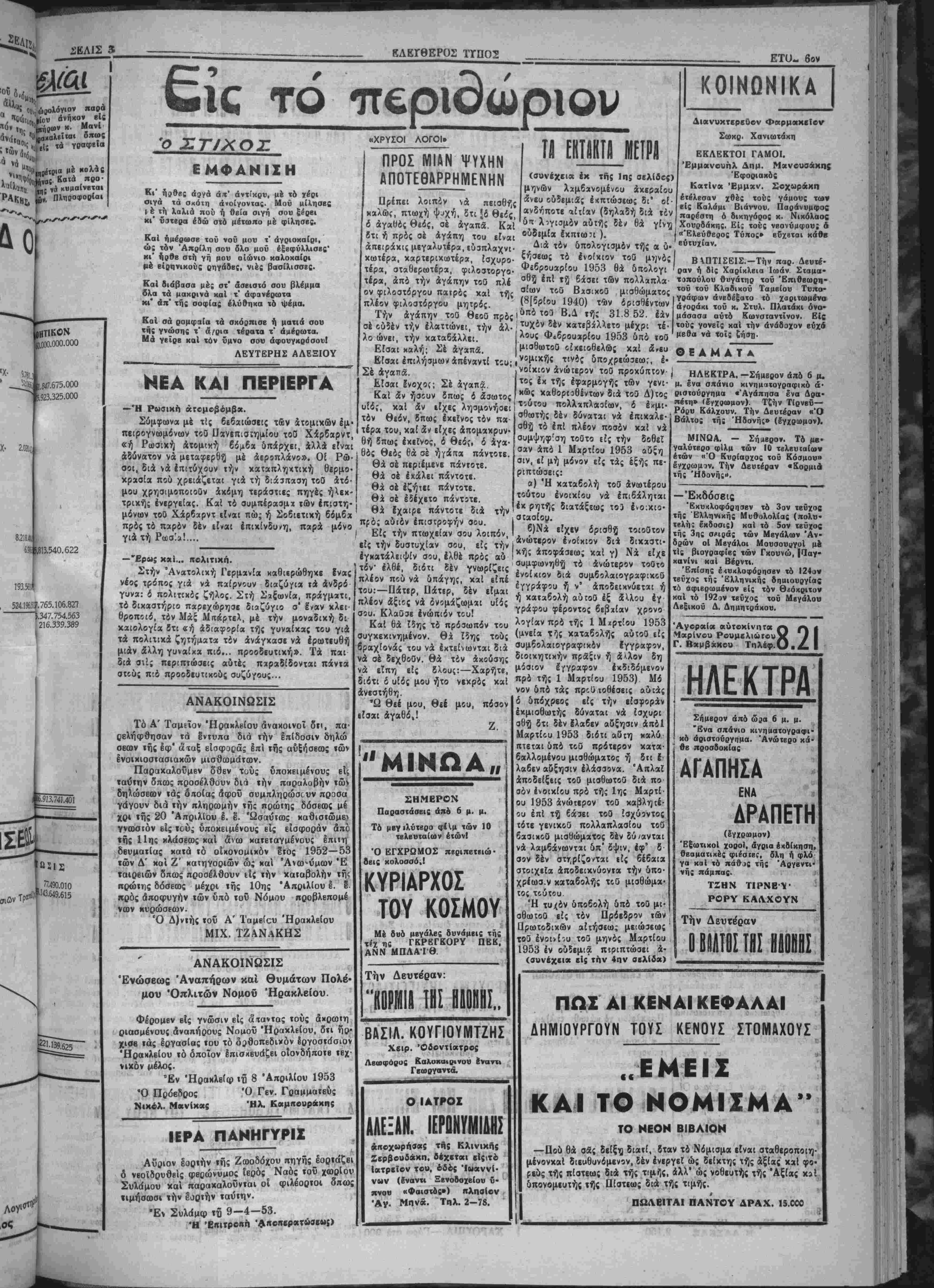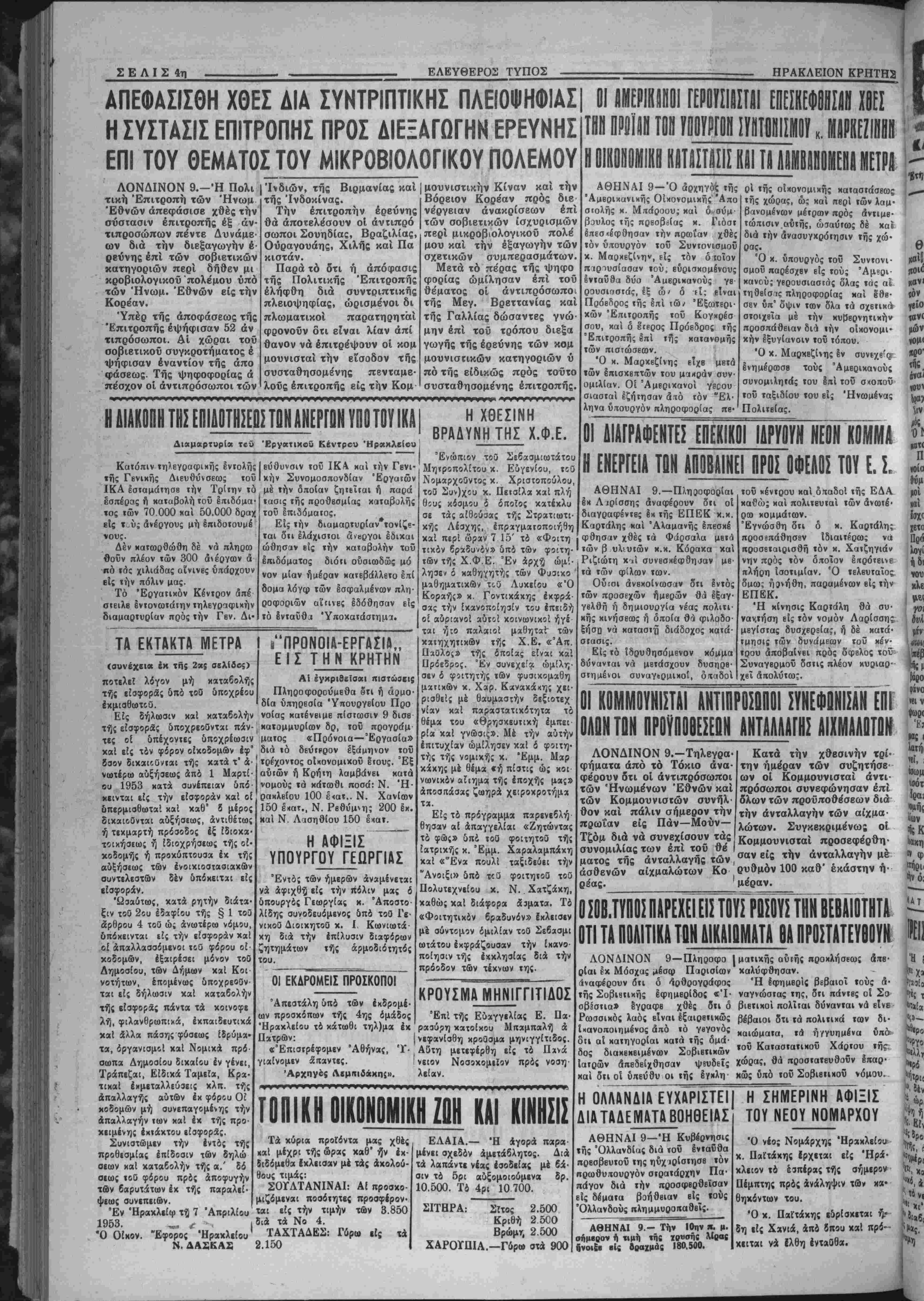 ρακλείου 100 έ<ατ.. Ν. Χανίων 150 Ικατ., Ν. Ρβθύμνη; 200 εκ. καί Ν Λασηθίου 150 εκατ. Η ΑΦΙΞΙΣ ~~~ ΥΠΟΥΡΓΟΥ ΓΕΩΡΓΙΑΣ Έντό; των ημερών άναμένεται νά αφιχθή είς την πόλιν μας δ ύπουργός Γεωργίας μ. Αποστο¬ λίδη; συνοδευόμενο; δπό τοθ IV νΐκοθ Διοικητοθ χ. Ι Κωνΐωτά- κη διά την επίλυσιν διαφόρων ζητημάτων τής άρμοδιότητός τού. ΟΙ ΕΚΔΡΟΜΕΙΣ ΠΡΟΣΚΟΠΟΙ Απεστάλη δπό των έκδρομέ ών προσκόπων τής 4ης ομάδος τ*. Είς τό πρόγραμμα παρενεβλή θησαν αί απαγγελίαι «Ζητώντας τό φώς» δπό τοθ φοιτητοθ τή; ίατριχή; κ. Έμμ. Χαραλαμπάκη χαί «Ένα πουλί ταξιδεύει την Άνοιξι» δπό τε Ο φοιτηΐοθ τοΰ Πολυτεχνείου κ. Ν. Χατζάκη, χαθώ; χαί διάφορα όμματα. Τό «Φοιτητιχόν βραδυνόν» Ιχλεισεν μέ σύντομον όμιλίαν τοθ Σεβασμι ωΐάτου έκφράζουσαν την ίχανο ποίησιν τή; έκκλησίας διά την πρόοδον των τέχνων τη;. ΚΡΟΥΣΜΑΜΗΝΙΓΠΤΙΔΟΣ Επί τή; Εύαγγελία; Ε. Πά ρ η μς ής γγς Ηρακλείου τό κάτωθι τηλ)μα έκ ραούοη κατοίκου Μπαμπαλή ά Π | θ ίδ ρ Πατρών: ρη μή | νεφανίσθη κροθσμα μηνιγγίτιδος. ΑΟ έθ ί ό Πά «Έπιστρέφομεν Αθήνας, Τ· | ΑΟτη μετεφέρθη εί; τό Πχνά γιαίνομεν ά'παντες. 'Αρχηγος Λεμηιδκκη;». ρη νειον Νοσοκομείον πρός νοση λείαν. ΤΟΠΙΚΗ ΟΙΚΟΝΟΜΙΚΗ ΖΟΗ ΚΑΙ ΚΙΝΗΣΙΣ Τά χύρια προΓόντα μας χθές «αί μέχρι τής ώρας χαθ ήν εκ- διδόμεθα ίκλεισαν μέ τάς άκολού- θους τιμάς: ΣΟΥΛΤΑΝΙΝΑΙ: Αί προσχο- ρ μιζέμεναι ποσότητε; προσφέρον· η ή των βαρυτάτων έκ τής παραλεί ψεως συνεπειών. Έν Έραχλείφ τή 7 Απριλίου ται εί; την τιμήν των 3.850 1953. „, 4 ι διά τά Νο 4. Ό Οίκον. Έφορο; Έραχλείου' ΤΑΧΤΑΔΕΣ: Γύρω είς τά Ν. ΔΑΣΚΑ5 2.150 ΕΛΑΙΑ.— 'Η άγορά παρα μένει σχεδόν άμετάβλητος. Διά τά λαπάντΐ νέας εσοδείας μέ βά¬ σιν τό 5ρι αύξομοιούμενα δρ. 10.500. Τό 4ρι 10 700. ΣΙΤΗΡΑ: ϋτό^ 2.500 Κριθή 2 500 Βρώμτ, 2.500 ΧΑΡΟΪΠΙΑ.—Γ6ρ» οτά 900 Ριζιώτη κ»ί τά των φίλων των. Ούΐοι άνβχοίνωσαν δτι μβ· έντό; τιχόν βραδυνόν» δπό των φοιτη·' των β υλιυτών κ.κ. Κόρακα καί των τή; Χ.Φ.Ε. Έν άρχή ώμί λησεν ό καθηγητή; των Φυσικο μαθηματικών τε.0 Αυκείου «Ό Κοραής» κ. Γοντικάκης εκφρά¬ σας την ικανοποίησιν τού έπειδή οί αύριανοί αύτοι κοινωνικαί ήγέ ται ήτο παλαιοί μαθητ;α^ τώι κατηχητικων τή; Χ.Ε. «Άπ Παθλος» τή; οποίας είναι κα Πρόεδρος. Έν συνεχε'α ώμίλη σεν δ φϊΐτητή; των φυσικομαθη ματικών χ. Χαρ. Κανακάκη; χει ρισθεί; μέ θαυμαστήν δεξιοτεχ νίαν καί παραστατικότητα τό θέμα τού «θρησκευΐική έμπει ρία καί γνώσις». Μέ την αυτήν επιτυχίαν ωμίλησεν χαί δ φοιτη τή; τή; νομΐκής χ. Έμμ. Μαρ κακη; μέ θέμα «ή πίστις ώ; κοι νωνικόν αΐιημα τής έποχής μα;3 άποσπάσας ζωηρά χεΐροχροτήμα των προσεχών ήμβρών θά έξαγ- γβλθή ή δημιουργία νέας πολιτι- κης κινήσεως ή όποία θά φιλοδο- ξήσο νά καταστή διάδοχος κατά¬ στασις. Είς τό Ιδουθησόμβνον κόμμα δύνανται νά μετάσχουν δυσηρβ- στημένοι συναγίρμιχοί, όπαδοί τοΰ χέντρου χαί όΐταδοί τής ΕΔΑ χαβώ; καί πολιΤΒυταί των ανωτέ¬ ρα) κομμάτων. Εγνώσθη ότι προσβπάθησβν ό κ. Καρτάλη; Ιδιαιτέρως νυ προσεταιρισθή τόν κ. Χατζηγιάν νην πρός τόν οποίον έαρότεινε πλήρη ίσοτιμίαν. Ό τελβυταϊος υμω; ηρνήθη, παραμένων εί; την ΕΠ Κ Κ. Ή κίνησις Καρτάλη θά συ· ναν,τήση είς τόν νομόν Λαρίσσης, μεγίστας δυσχερβία,', ή δέ κατά- τμησις των δυνάμεων ΐοΰ χέν- τρου άποβαίνβι πρός όφβλος τοϋ Συναγεομοϋ δστις πλέον κυριαρ- χβΐ απολύτω;. ΟΙ ΚΟΜΜΟΥΝΙΣΤΑΙ ΑΝΤΙΠΡΟΣΟΠΟΙΣΥΝΕΦΟΝΙΣΑΝ ΕΠΙ ΟΑΟΝΤΟΝ ΗΡΟΫΟΟΟΕΣΕΟΝ ΑΝΤΑΑΛΑΓΙΣ ΑΙΧΜΑΛΟΤΟΝ ΛΟΝΔΙΝΟΝ 9.-Τηλεγρα· φηματα άπό τό Τόκιο άνα¬ φέρουν δτι οί άντιπρόσωποι των Ήνωμένων Εθνών καί των Κομμουνιστήν συνήλ θον καί πάλιν σήμερον την πρωΐαν βίς Πάν—Μούν— Τζόμ διά νά συνβ