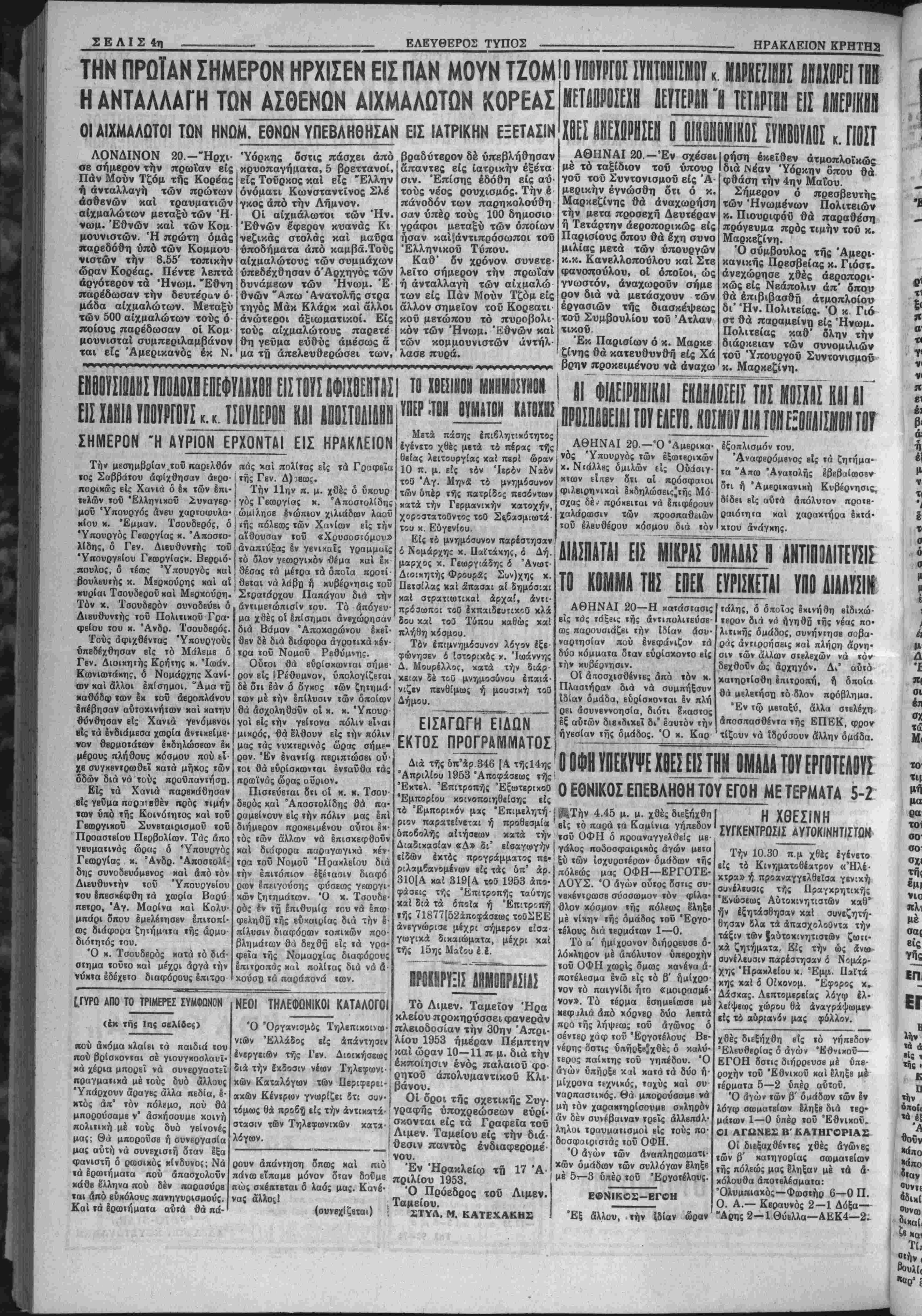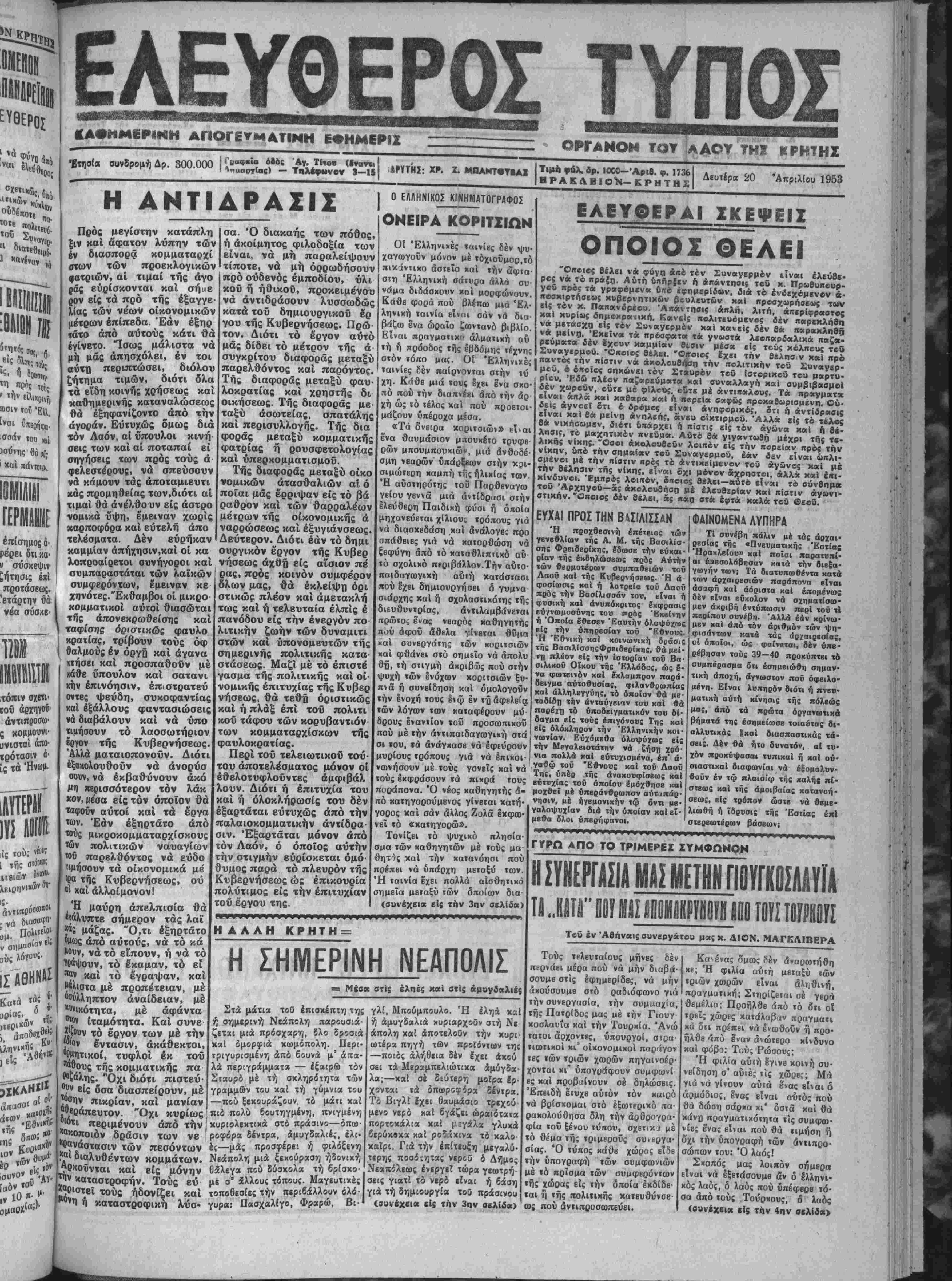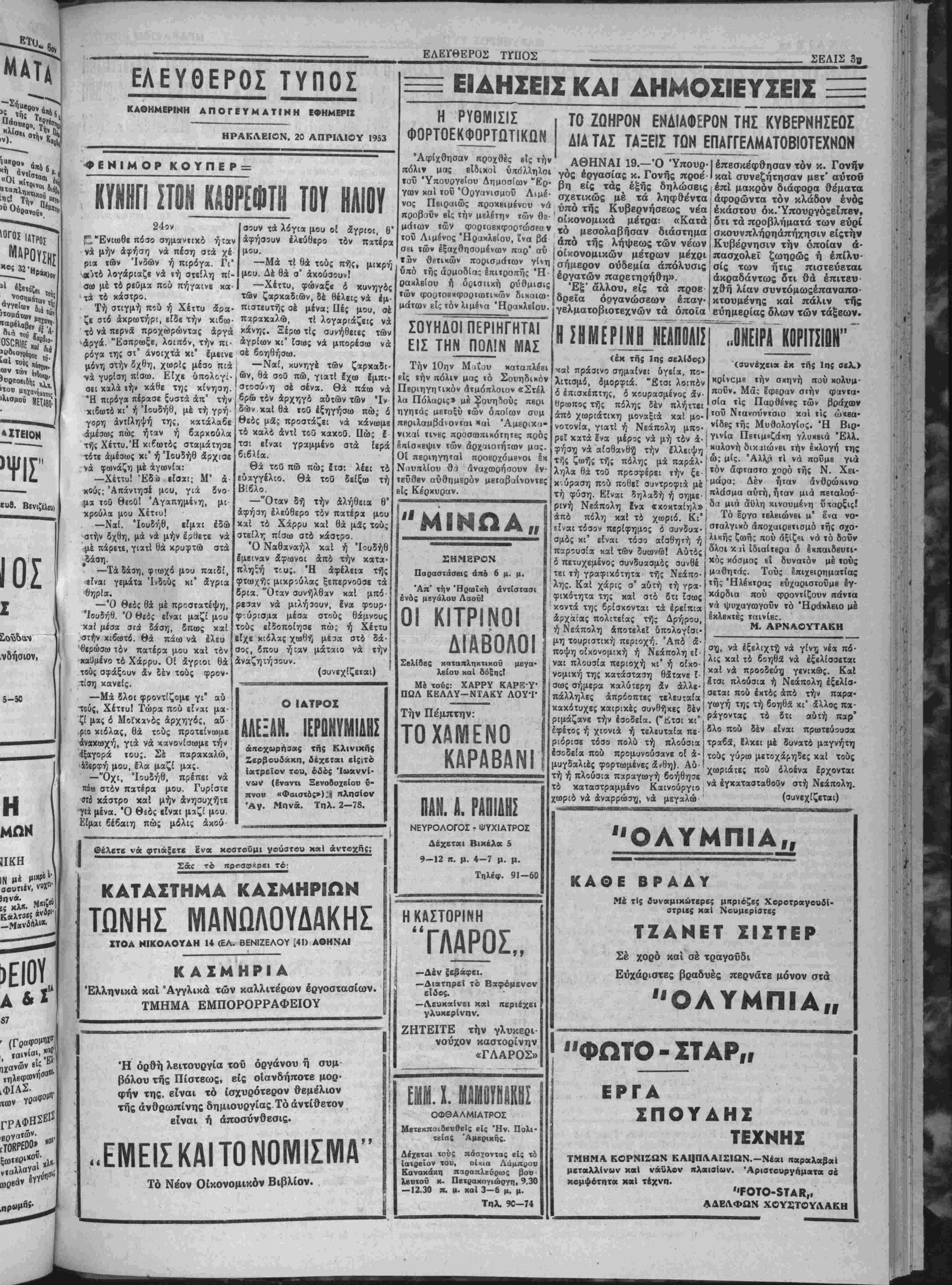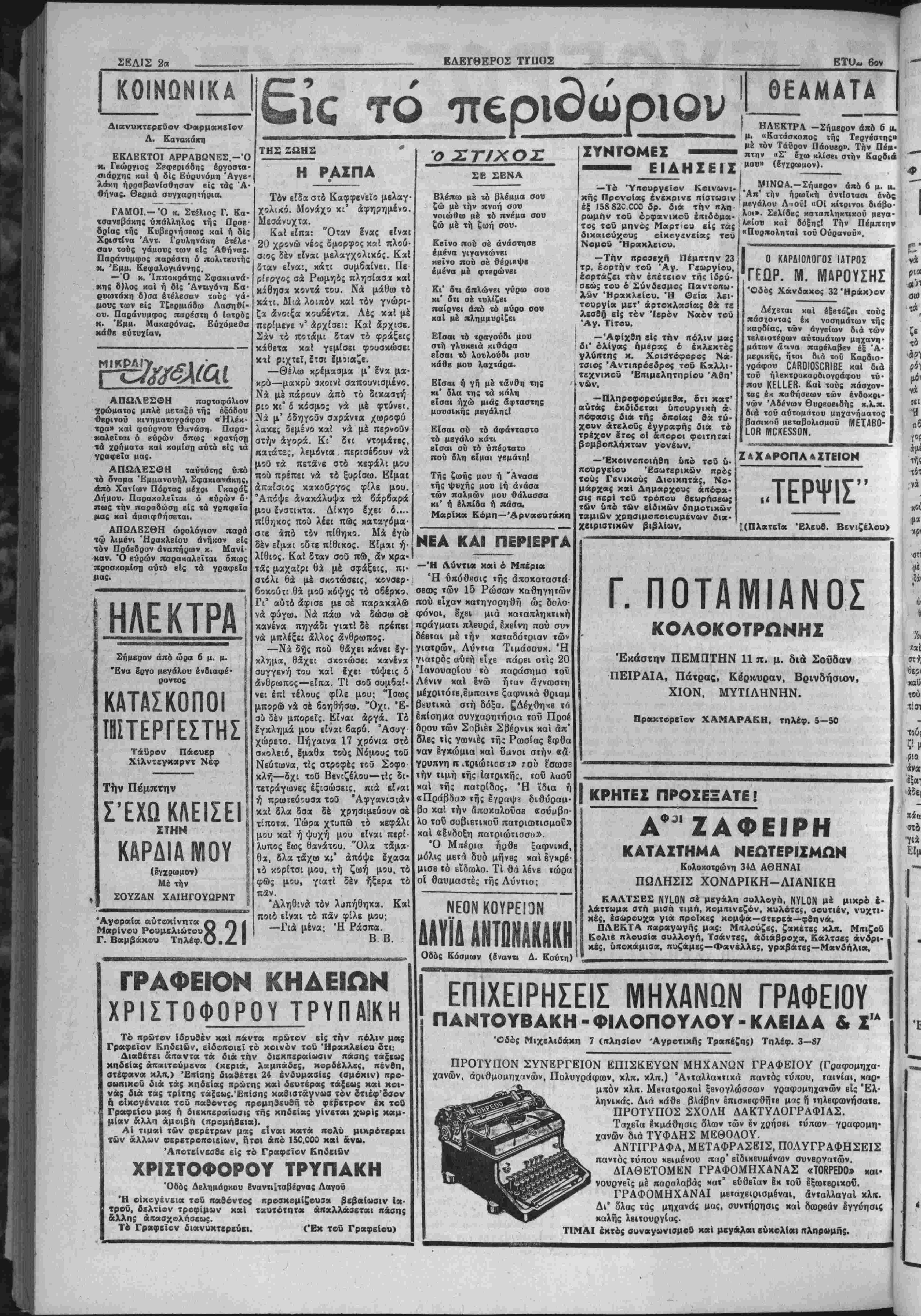 Τιμη φό*. ορ. 1000-Άριβ. <ρ. 1736 ΗΡΑΚΛΕΙΟΝ-ΚΡΗΤΗΣ Δευτέρα 20 Απριλίου 1953 Πρός μεγίστην κατάπλη ξιν καί άφατον λύπην των εν διασπορφ κομματαρχί οτων των προεκλογικών φατριών, αί τιμαί τής άγο ράς ευρίσκονται καί σήαε ρον είς τα πρό τής έξαγγε λίας των νέων οίκονομικών μέτρων έπίπεδα Εάν έξηρ τάτο άπό αΰτοΰς κάτι θά εγίνετο. "Ισως μάλιστα νά μή μάς άπησχόλει, έν τοι αύτη περιπτώσει, ^ διόλου ζήτημα τιμών, διότι δλα τα βΐδη κοινής χρήσεως καί καθημερινήν καταναλώσεως ■θά έξηφανίζοντο ^άπό την αγοράν. Εύτυχώς όμως διά τόν Λαόν, αί ΰπουλοι κινή σβις των καί αί ποταπαί εί σηγήσεις των πρός τούς ά φελεστέρους, νά σπεύσουν νά κάμουν τάς άποταμιευτι χάς προμηθείας των,διότι αί τιμαί θά άνέλθουν είς άστρο νομικά ΰψη, έμειναν χωρίς καρποφόρα καί εύτελτΐ άπο τελέσματα. Δέν εύρήκαν' καμμίαν άπήχησιν,καί οί κα λοποοαίρετοι συνήγοροι καί ουμπαραστάται των λαϊκών συμφέρον των, έμειναν κε χηνότες.Έκθαμβοι οί μικρο κομματικοί αύτοι θιασώτα τής άπονβκρωθείσης κα ταςρίσης οριστικώς φαυλο χρατίας, τρίβουν τούς όφ Οαλμούς εν όργη καί άγανα «τήσβι καί προσπαϋοΰν μί κάθβ ΰπουλον καί σατανι χήν έπινόησιν, έπστρατεύ όντες ψευδη, συκοφαντία χαί έξάλλους φαντασιώσει νά διαβάλουν καί νά υπο τιμήσουν τό λαοσωτήριον έργον τής Κυβερνήσεως Άλλά ματαιοπονοΰν. Διότ έςακολουθοϋν νά άνορύσ οονν, νά έκβαθύνουν άκό ΜΊ περισσότερον τόν λάκ χον, μέσα είς τόν οποίον θά ταφοΰν αύτοι καί τα έργα των. Εάν έξηρτάτο άπό τους μικροκομματαρχίσκους των πολιτικών ναυαγίων Μΰ^ παρελΰ. όντος νά εύδο Ημήσουν τα οίκονομικά μέ Φα της Κυβερνήσεως, ού «ι «αί αλλοίμονον! Ή μαύρη άπβλπισία θά «άλυπτβ σήμερον τάς λαϊ *άς μάζας. "Ο,τι έξηρτάτο ; άπό αύτούς, νά τό κά ι , νά τό είπουν, ή νά τό Υίάψουν, τό έκαμαν, τό εί *"ν «αί ιό έγραψαν, καί - .πά μέ προπέτειαν, μέ «ούλληπτον αναίδειαν, μέ *0»ιχότητα, μέ άφάντα **ν ίταμότητα. Καί συνε »{ουν τό έργον των μέ την |«ον έντασιν, άκάθεκτοι, %ητικοί, τυφλοί έκ τοΰ *49ους τής κομματικής πά βζάλης. "Οχι διότι πιστεύ- °)>ν είς δσα διασπείρουν, μέ