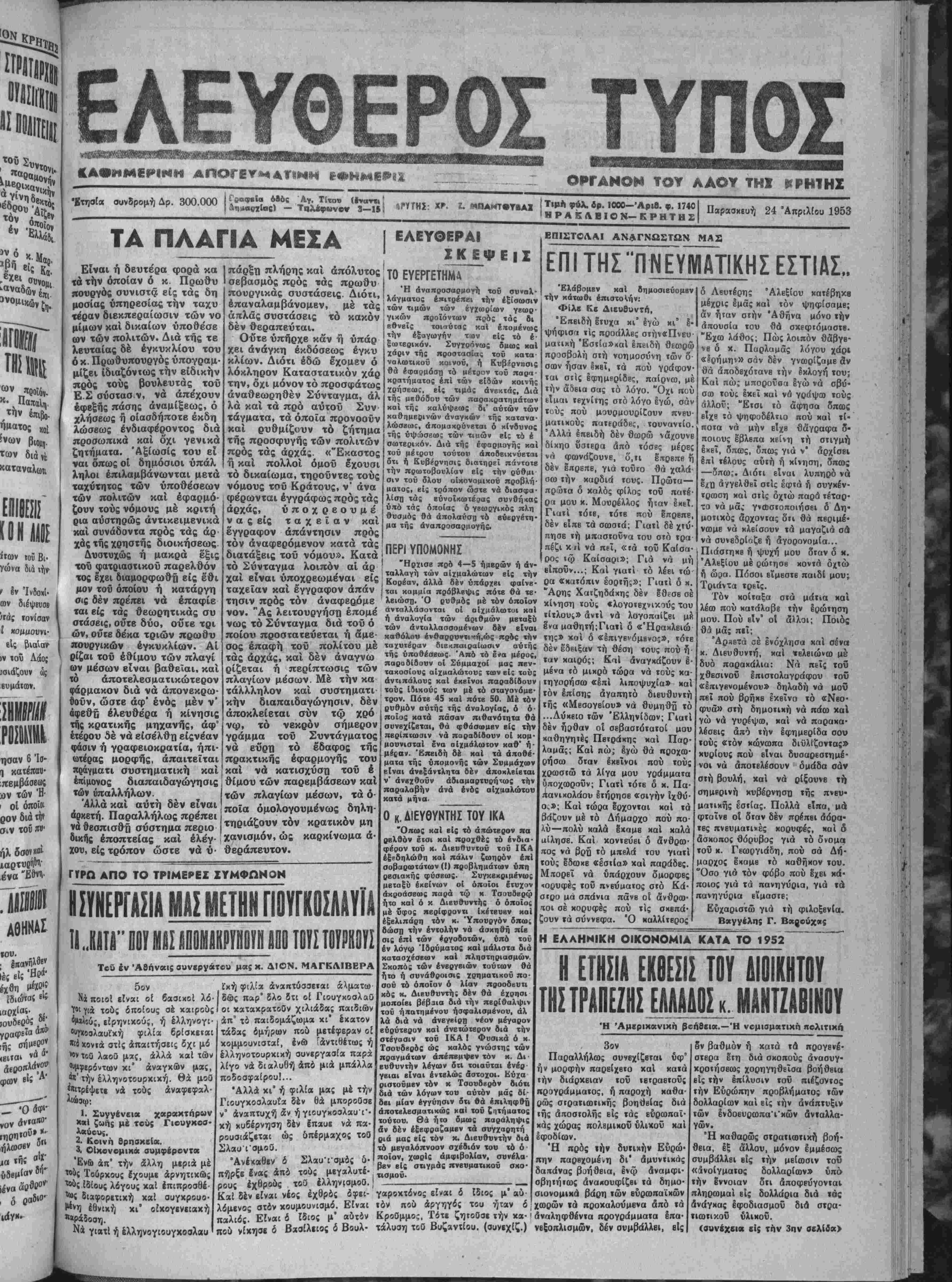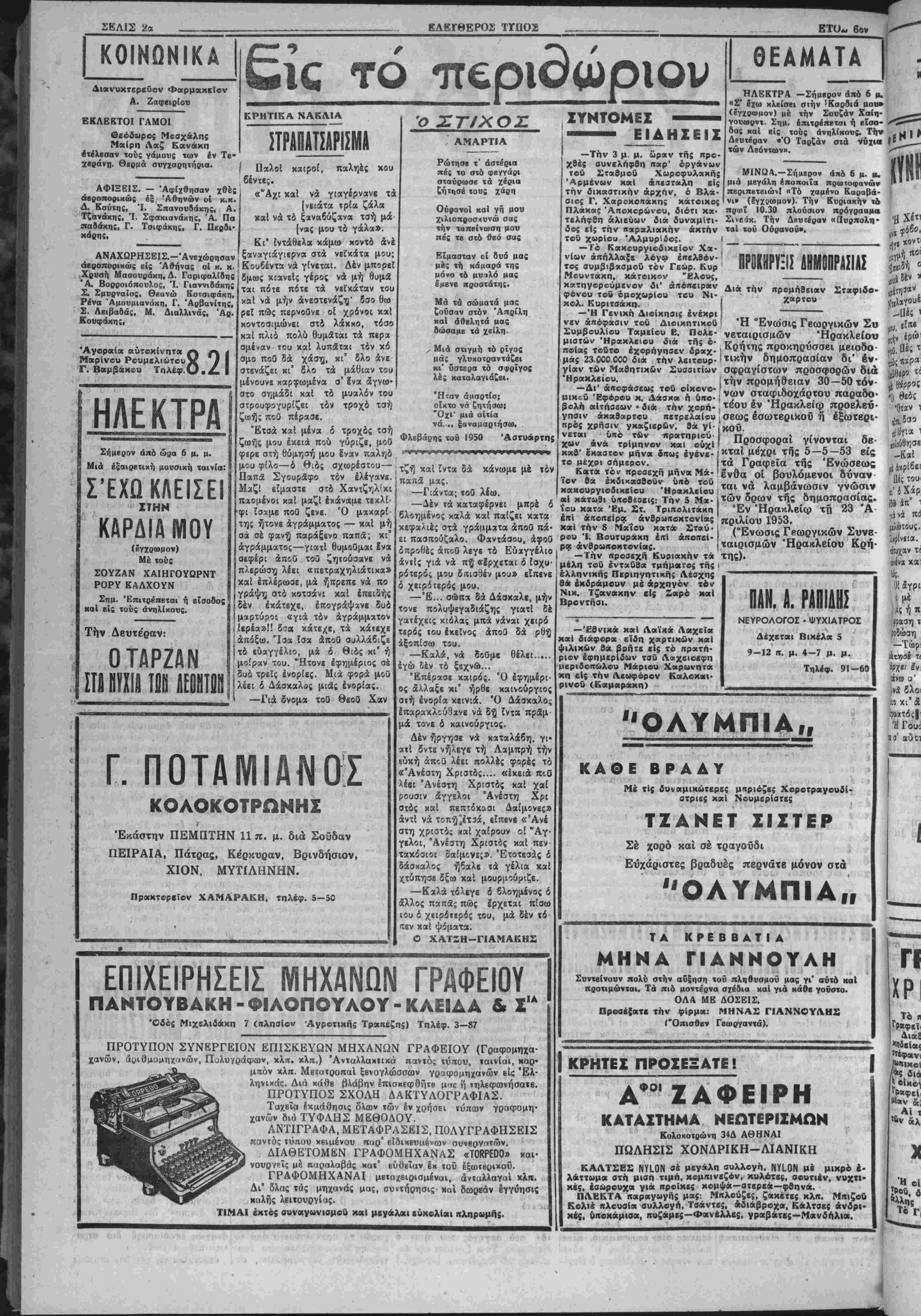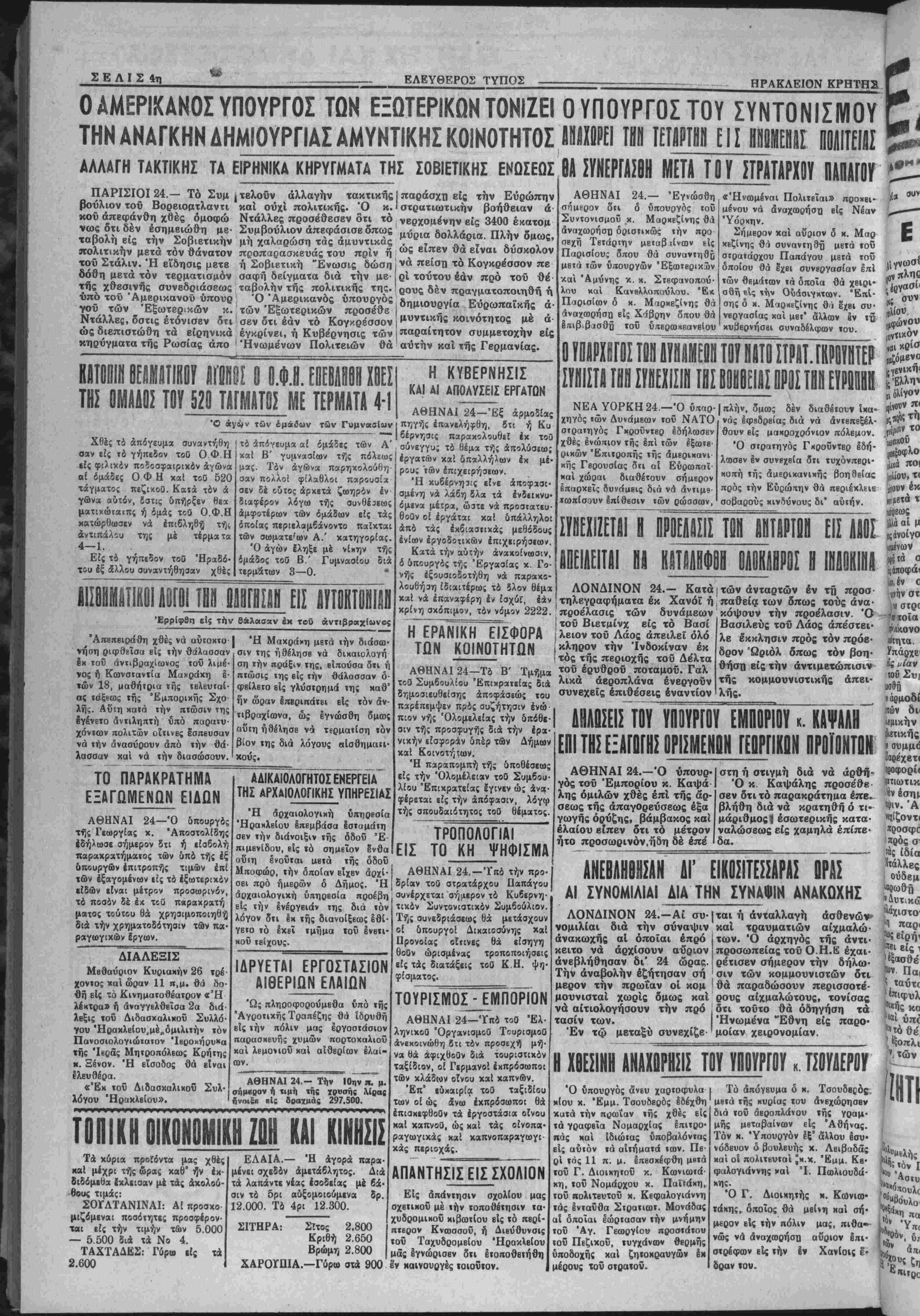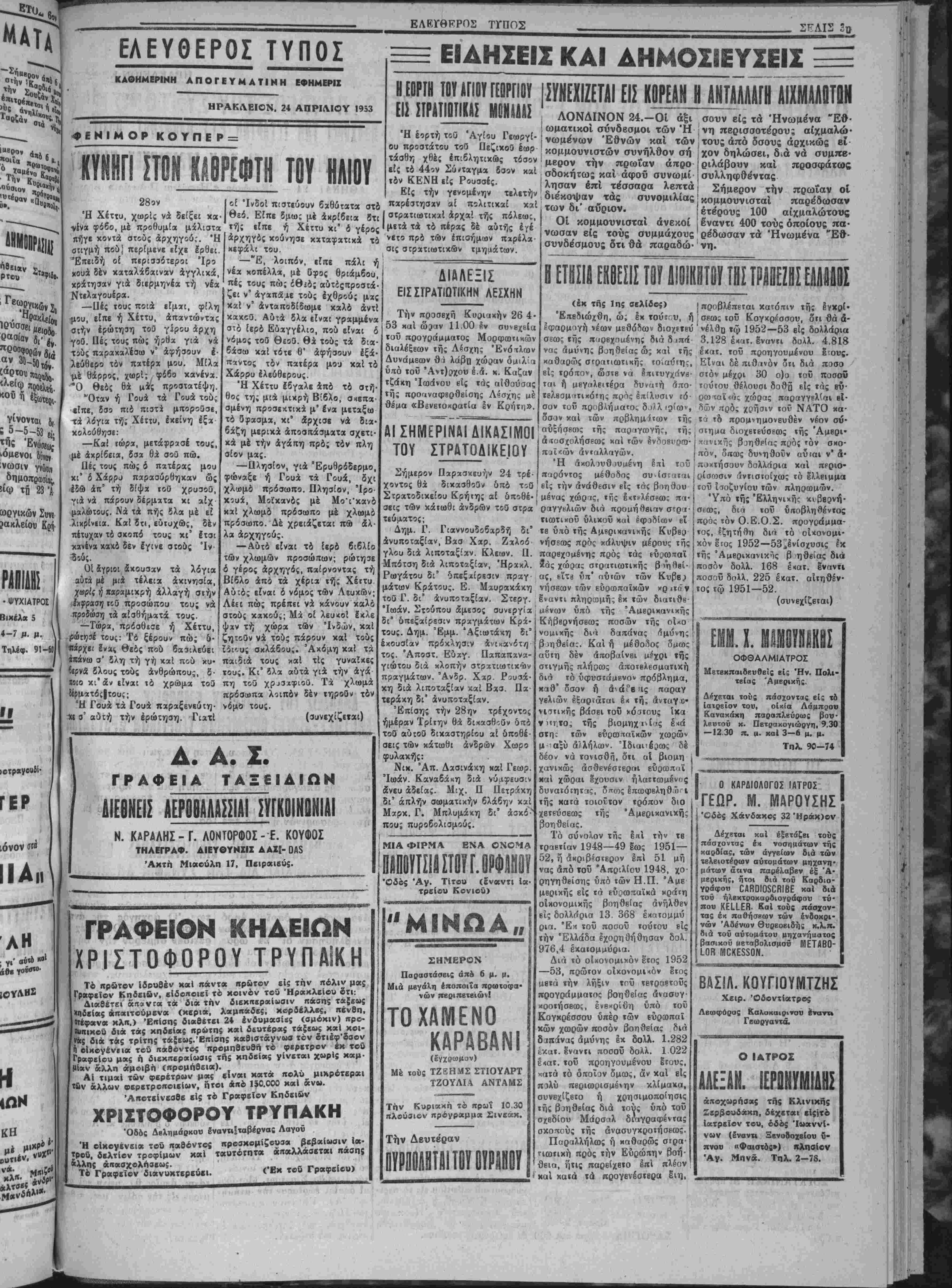 σης ό χ. Μαοχεζίνης θ<ϊ Ιχβι συ· νβργασίας καί μετ* άλλων βν τή κυβερνήσβι συναδέλφων τού. Ο ΥΟΑΡΜΟΣ ΤΗ 1ΥΗΑΠ ΤΟΥ ΗΙΤΟ ΠΜΪ. ΓΜΙΙΤΕΡ ΙΥΗΙΣΤΑ ΠΗ ΣΥΓΐΕΧΙΣίΓί ΙΗΣ ΒΟαΒίίΑί ΠΡΟΙ ΤΗ» ΕΥΡΗ ΝΕΑ ΥΟΡΚΗ 24 —Ό ύπαρ-1 πλήν, δμως δέν διαθέτουν ίκα χηγός ιών Δυνάμεων τοΰ ΝΑΤΟ στρατηγός Γχροϋντβρ έδήλωσΒν χθές ενώπιον τής επί των εξωτε¬ ρικών Έπιτοοπής τής άμερικανι- «ής Γβρουσίας δτι αί Εύοωπαΐ· καί χώοαι διαθέτουν σήμερον επαρκεΐς δυνάμεις διά νά άνΐιμβ ΐωπίσουν επίθεσιν των ρώσσων, έκ μέ· ρους των έπΐχεΐρήσεων. Ή κυβέρνησις είνε άποφχαι- σμένη νά λάβη δλα τα ενδεικνυ¬ όμενα μέτ,ρα, ώστε νά προστατευ- Θοθν οί εργάται χαί δπάλληλοι άπό τάς έκβιασκχάς μεθόδους ενίων έργοδοτιχών έπιχειρήσεων. Κατά την αυτήν ανακοίνωσιν, ό δπουργός τής Εργασίας κ. Γο· νής εξουσιοδοτήθη νά παρακο¬ λουθήση ιδιαιτέρως τό δλον θέμα καί νά έπαναφέρη έν ισχύϊ", εάν κρίνη σκόπΐμον, τάν νόμον 2222. ποοέλασις των δυνάμεων, 1 τοΰ Βιετμίνχ είς τό Βασί Ι λειον τοΰ Λάος άπειλεΐ όλό κλήρον την Ίνδοκίναν έκ τος τής περιοχής τοΰ Δέλτα τοϋ έρυθροϋ ποταμοΰ. Γαλ νάς έςρβδρείας διά νά άνΐεπεξέλ- θουν είς μακροχοόνιον πόλεμον. Ό στοατηγός Γχοοΰντερ Ιδή*- λοοσβν έν συνεχβία δτι τυχόνπβοι- κοπή τής άιιερικανικής βοηθβίας πρός την Εύβώΐτην θά περιέκλειε σοβαρούς χινδύνους δι* αύτην. ΣΥΝΕΠΕΙΑΙ 8 ΠΡΡΕΛΟΙΙΣ ΤΙΙΙΙ ΑΗΤΙΡΤΟΗ ΕΙΣ 110Σ 0ΕΙΑΕΙΤ1Ι ΗΙ ΚΑΜΗ^ίΡΟΣ Η ϋθϋ! ΛΟΝΔΙΝΟΝ 24.— Κατά | των άνταρτών έν τη προσ ! τηλεγραφήματα εκ Χανόϊ ή, παθεία των δπως τούς άνα Η ΕΡΑΝΙΚΗ ΕΙΣΦΟΡΑ ΤΩΝ ΚΟΙΝΟΤΗΤΩΝ ΑΘΗΝΑΙ 24-Τό Β' Τμί)μα , , - _, - , , -. τοθ ΣυμβουλΕου Έπιχρατείας διά λικα άβροπλανα ένερνοϋν δημοσιευθείσης αποφάσεως τού παρέπεμψεν πρός συζήτησιν ενώ¬ πιον νής Όλομελείας την υπόθε¬ σιν τής προσφυγής διά την έρα· νίκην ιϊσφοράν υπέρ των Δήμων καί Κοινοτήτ,ων. Ή παραπομπή τής υποθέσεως είς την Όλομέλειαν τοθ λ Έ συνεχεϊς έπιθέσβις εναντίον κόψουν την προέλασιν. Ό Βασιλεύς τοΰ Λάος άπε'στει- λε έκκλησιν πρός τόν πρόε¬ δρον Ώριόλ δπως τόν βοη¬ θήση είς την αντιμετώπισιν τής κομμουνιστικάς άπει· λής. λΕου Έπικρατείας έγινεν ώ; άνα- φέρεται είς την απόφασιν, λόγφ τής σπουδαιότητος τοθ θέματος. ΤΡΟΠΟΛΟΠΑΙ ΕΙΣ ΤΟ ΚΗ ΨΗΦΙΣΜΑ ΑΘΗΝΑΙ 24.—Υπό την προ- δρίαν τοθ στρατάρχου Παπάγου ΑΗΑ1ΣΕΙΣ ΤΟΥ ΥΠ3ΥΡΓ0Υ ΕΜΠ0Ρ10Υ κ. ΚΑΨΑΛΗ ΕΠΙ ΤΗΣ ΕΙΑΓΟ.ΓΗΣ ΟΡΙΣΜΕΝΗΝ ΓΕΟΡΠΚΟΝ ΗΡΟΤΟΝΤΟΗ ΑΘΗΝΑΙ 24.-Ό ύπουρ¬ γός τού Έμπορίου κ. Καψά λης ομιλών χθές επί τής άρ- σεως τής άπαγθρεύσεως έξα γωνής όρύζης, βάμβακος καί ελαίου είπεν δτι τό μέτρον ήτο προσωρινόν,ήδη δέ έπέ στη ή στιγμή διά νά άρθή- Ό κ. Καψάλης προσέθε¬ σεν δτι τό παρακράτημα έπβ. βλήθη διά νά κρατηθή ό τι- μάριθμοςΐ έσωτερικης κατα¬ ναλώσεως είς χαμηλά έπίπε- δα. άρχαιολογικί) ύπηρβσία ποοέβη, συνέρχεται σήμΐρον τό Κυδερνη είς την ενέργειαν της διά τόν λόγον δτι βχ τής διανοίξεως εθί- τμήμα τού ένβτι- γειο «ό έχεΐ χοΰ τείχους. ΙΔΡΥΕΤΑΙ ΕΡΓΟΣΤΑΣΙΟΝ Α1ΘΕΡΙΩΝ ΕΛΑΙΩΝ Ώς πληροφορούμεθα υπό τής Άγροτικής Τραπέζης θά ιδρύθη είς την πόλιν μας εργοστάσιον παρασκΕυής χυμών πορτοκαλιοϋ χαί λεμονιοΰ καί αίθερίων έλαι¬ ων. ΑΘΗΝΑΙ 24.— Την Ιθην η. μ > ή τιμή τής ϊρυσής λίρας