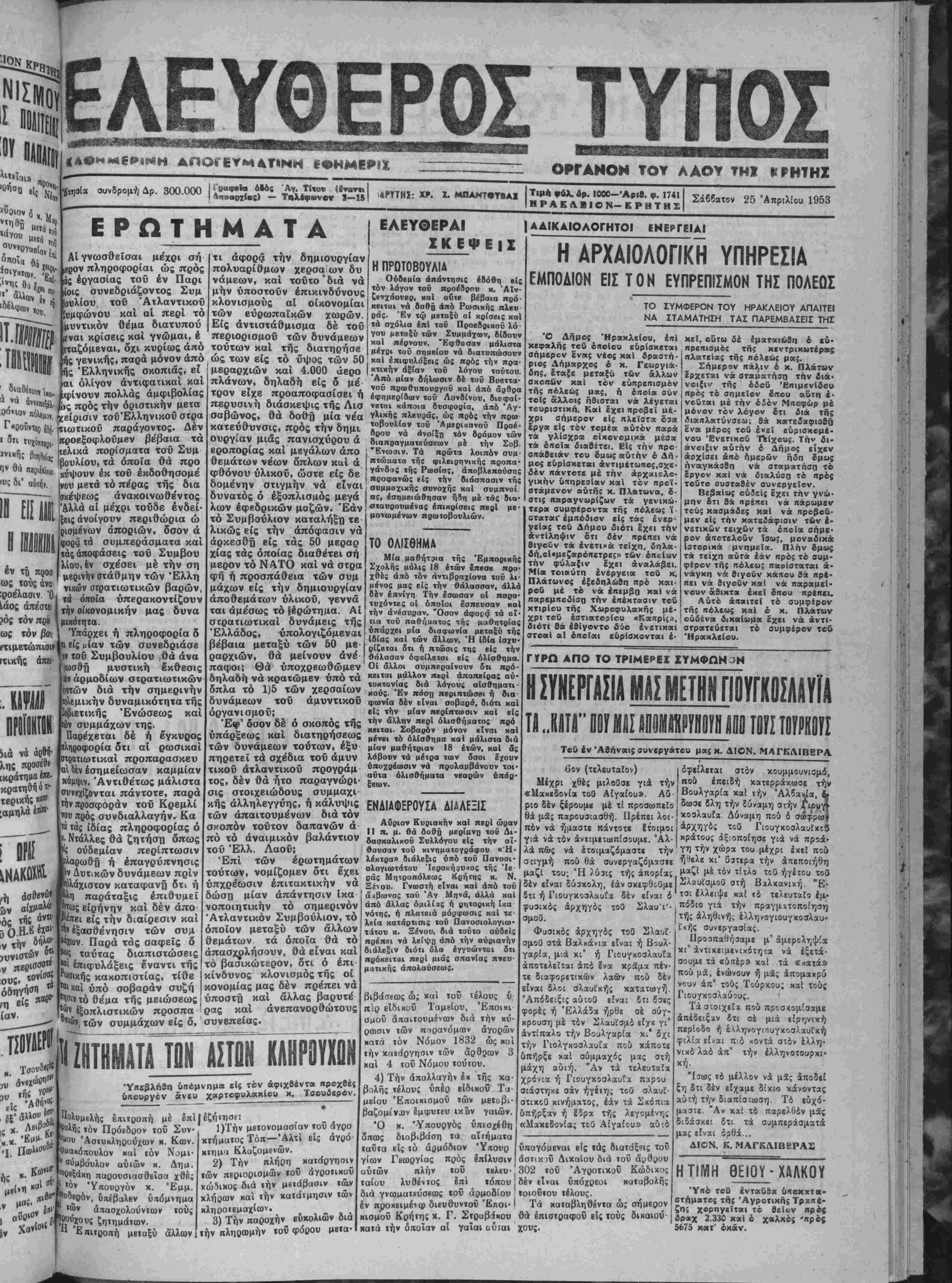 ίζ Ο έ ολογιωτάτου Ίβροχη9υ<ος τής Ίβ τοίς άλλοις ηθισται νά λέγβται τουριβτική. Καί έχει προβεί αί- χρι σήμερον είς πλείστα ο?α εργα είς χον τομέα αυτόν παρά τα γλίσχρα οΐκονομικά μέσχ τα έηοΐα διαθέτει. Είς την προ¬ σπάθειαν τού έμω; αύτην έ Δη· μο; ευρίσκεται άντιμέτωτχος,σχε- ύέ,ν παντβτε μέ την αρχαιολο¬ γικήν υπηρεσίαν καί χον προϊ- στάμενον αύτη; κ. Πλάτωνα, δ- στις παραγνωρίζων τα γβνικώ- Τίρα ουρφέροντα της πόλεω; ϊ βταται' έμπόδιον είς τάς ενερ¬ γεια; τοΰ Δήμου διότι εχΐι την αντίληψιν επ δέν πρίπει νά θιγοΰν τα ένβτιχά τείχη, δπλα- δη,οί«μΕζαρόιτετρε?» των όηαίυν την φύλα£ιν έχει άναλάβει. Μία τοιαύτη ενεργεια τοΰ κ, Πλάτωνο; εξεδηλώθη πρό καί· ροϋ μέ τό νά επέμβη καί νά παρεμποδίση την επέκτασιν τοΰ κτιρίου τής Χωροφυλαχή; μέ πλατεία; τη; πόλεώς μας. Σήμερον ιτέλ,ιν ο κ. Πλάτων Ερχεται νά σταματήση την διά· νοιξιν τής όδοΰ Έπιμενίδοο πρός τό σημείον δπβυ αυτή έ· νοϋται μέ την οίον Μποφώρ μέ μόνον τόν λόγον δτι δια της ίιαπλατύνσεω. _θά χατΕδχφΐσθή ενα μέρος τοΰ έχει ΐύρισχομί- νοο 'Βνεηκοΰ τεείχβυ;. Την δι- άνοιξιν αύτην ό Δήμο; ΐΐχβν άρχίβΕΐ άπό ημερών ηδη δμως ηναγκάσθη νά σταματήση τέ έργον καί νά διαλύση τό πρός τούτο αυσταθέν συνεργεϊον. Βεβαίως ούίεί; έχει την γνώ¬ μην δτι θά ηρίπιι νά πάρωμεν τού; κασμάδε; καί νά προβοΰ- μέν είς την κατείάφισιν των ε¬ νέτικών τειχών χά οποίαι σήμε¬ ρον άποτελοΰν ϊσω;, μοναδικά Ιατορικά μνημεΐα. Πλήν δμως τα ΤΕΪχη αΰτά εάν πρό; τό συμ¬ φέρον τή; πόλβω; παρίσταται ά- νάγκη νά θιγοΰν κάπου θά πρί- πει νά θιγοΰν «αί νά παραμεί- νουν άθικτα έκεί δπου πρίπει. Αύτό άπαιτΕϊ τό συμφέρον τη; πόλεω; καί έ κ. Πλάτων χρι τοΰ έστιατορίβυ «Καπρίς), Ι ουδένα δικκίωμα έχει νά άντι- διότι θά έθίγοντο δύο ένετικαΐ βτρατεύΐται τό συμφέρον τού οτοα'ι α! οποίαι ευρίσκονται έ- Ήρακλϊίου. ΓΪΡΩ ΑΠΟ ΤΟ ΤΡΙΜΕΡΕΙ ΖΥΜΦΩΝ 3Η "" Η ΣΥΗΕΡΓΑΣΙΑ ΜΑΣ ΜΕΤΗΝ ΓΙΟΥΓΚΟΣΛΑΥΙΑ ΤΙ Μί" Μ ΜΪΜΜΜΜΜ ΤΟΠ ΪΙΜΪί Τοΰ έν Αθήναι; συνεργάτου μας κ. ΔΙΟΝ. ΜΑΓΚΛΙΒΕΡΑ 6ον (τελευταίον) Μέχρι χθές μιλοθσε γιά την «Μακεδονία τοθ Αίγαίου». ΑΟ ριο δέν ξέρουμβ μέ τί προσωπεΐο θά μά; παρουσιασθή. Πρέπει λοι- πόν νά ήμαστε πάντοτε Ιτ'οιμοι γιά νά τόν άντιμετωπίαουμε. 'Αλ-1 ^ Α __ι- - ..Α ί_____ Κ Ι________ -Λ. . ' όφείλεται στόν κουμμουνΐαμέ, πού έπειδή κατερράχωσε Βουλγαρία καί την Άλ5: δωσε δλη την ίύναμη στήν κοσλαυΐα Δύναμη πού δ ( άρχηγός Τ6θ Γίουγκοσλαυϊκίδ χρατους άξιοποίησε γιά νά προά· ά π&ς νά έτοιμαζόμαατε την Υ*) τήν ΧώΡ» τού μέχρι έχεΐ σςιγμή πού θά συνεργαζόμχσιε τηιΊτι-Λν υπιιιΤηιιΑι ΛτΓ ρυρι ολογιωτάτον Ιβροκήρυκος τής Ίε· ' ~"*Γ' ·~υΤ' "ίί-^γ--·· τούτων, νομιςομεν ότι εχ«ι ^ Μητοοπολβω(. Κοήιηί „ Ν. μαζίτου-Η λύσις τής άπορίας ύπχρέωσιν επιτακτικήν/νά ^^Τ-^.,^Η'ώ τ"υ δωσχι μίαν απάντησιν ικα·| άιβωνος τού Αγ Μηνά, άλλά καί νοποιητικήν τό σημερινόν Ατλαντικόν Συμβούλιον, τό οποίον μεταξύ των αλλων Οεμάτων τα όποία §ά τό μ άπασχολήσουν, Οά είναι καί τό βασικώτερον, ότι ό επι κίνδυνος κλονισμός τής οί κονομίας μας δέν πρέπει νά Νιν τό θέμα τής μειώσεως υποστή καί άλλας βαρυτέ *^ έξοπλιστικών προσπα ' ρας καί άνεπανορθώτους ν, των συμμάχων είς δ, συνεπείας. ΙΐΙΖΗΤΗΜΑΤΑ ΤΟΜ ΑΣΤΟΝ ΚΛΗΡΟΥΧΩΝ •Υπεβλήθη ύπόμνημα εις τόν αφιχθέντα προχβές υπουργόν άνβυ χβρτοφυλαχίου κ. Τοουδερόν. έπιτροπί) μέ έπί|εζήτησε: Νής τόν Πρόβδρον ΐοϋ Συν ' 1)Τήν μετονομασιαν τού άγρο 'ιματος Τόπ—Άλτί εις αγρο· "Ιίου Άσιυκληρούχων κ. Κων. Νομι- Δημ. παρουσιασθβΐσα χθές ['ΡϋαΜΟΐτουλον χαί τόν αύιών μ. »ον "Υπουργόν κ. Έμμ. μοί. «ιθ0Τ"Ί8