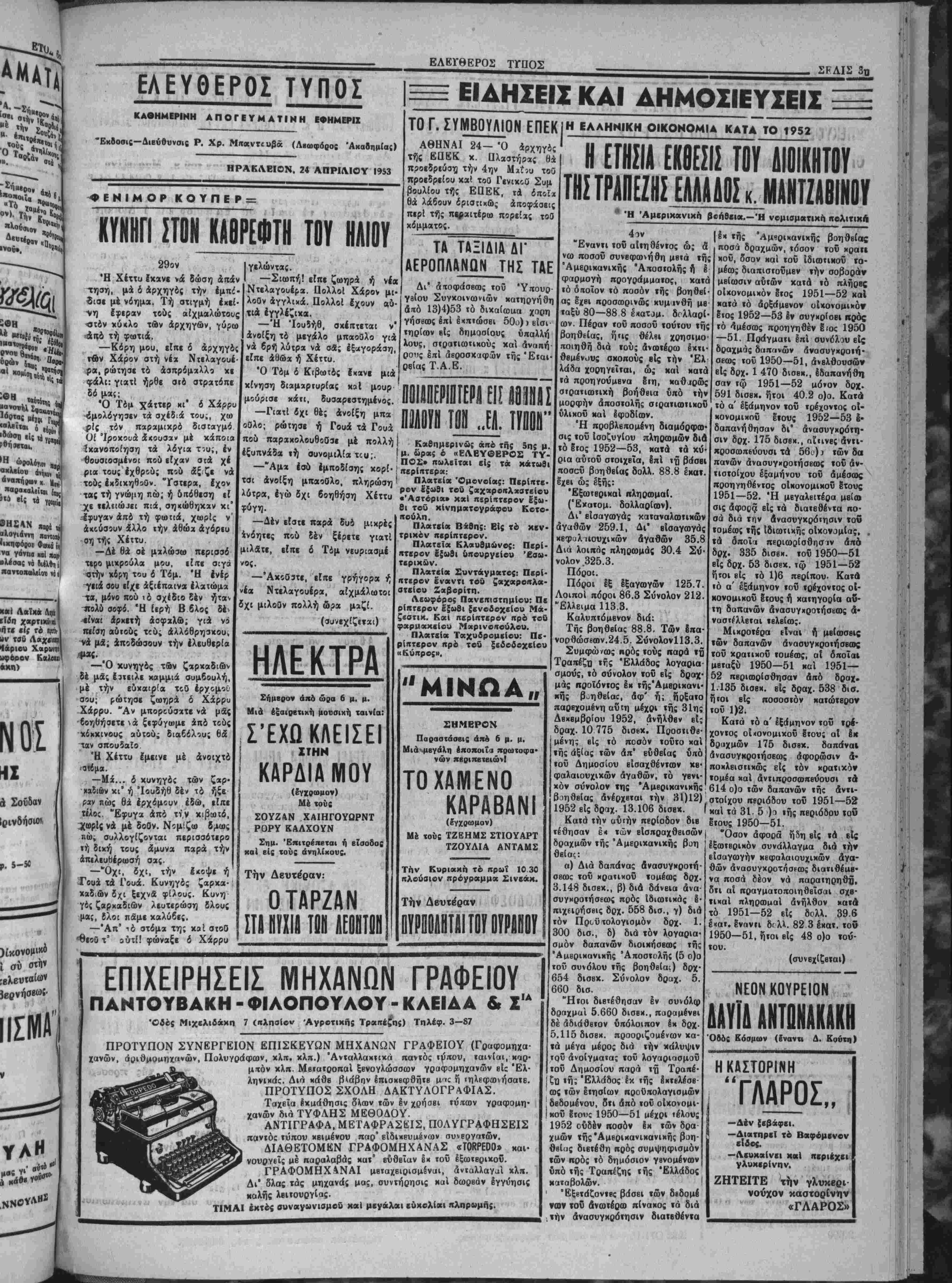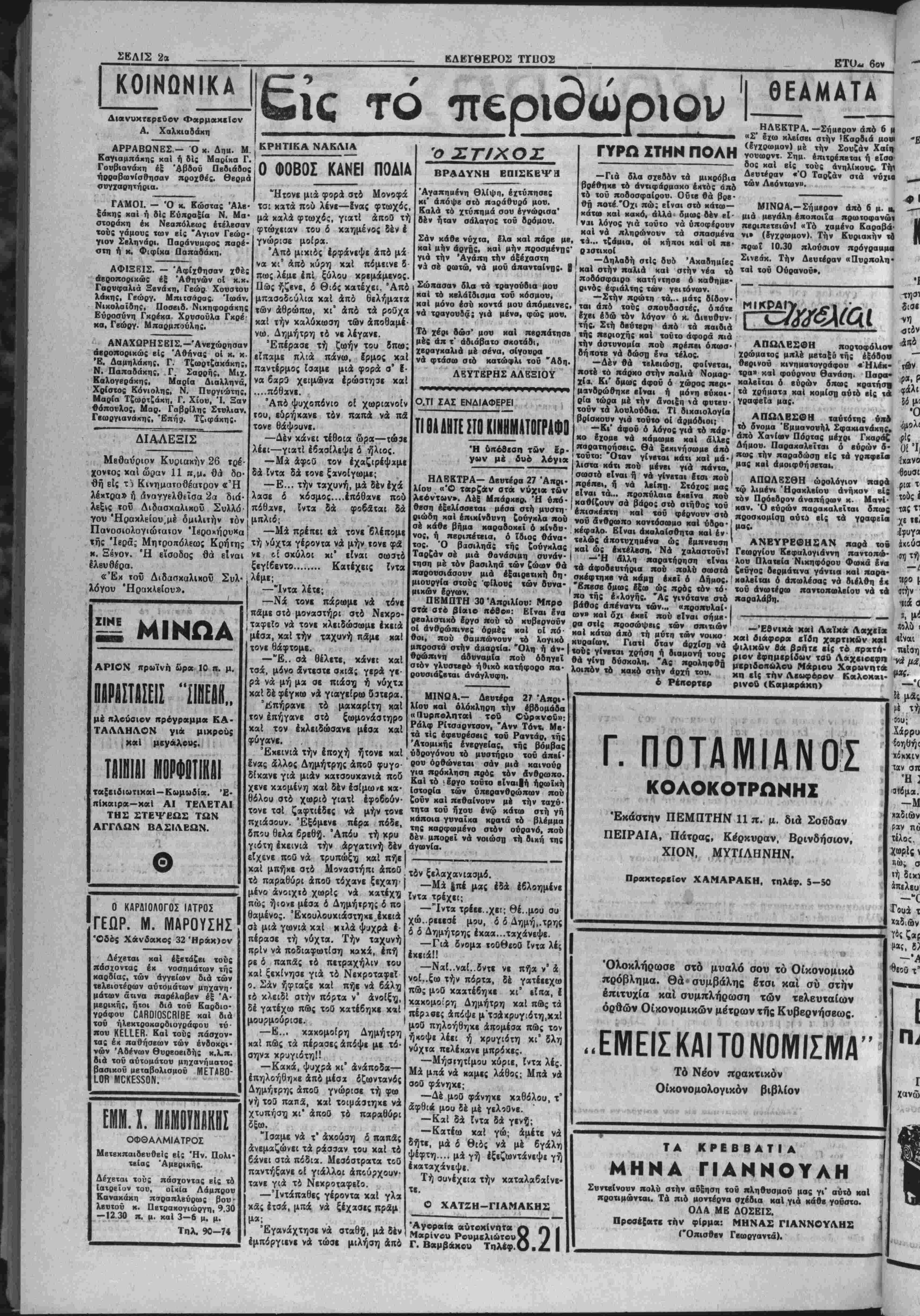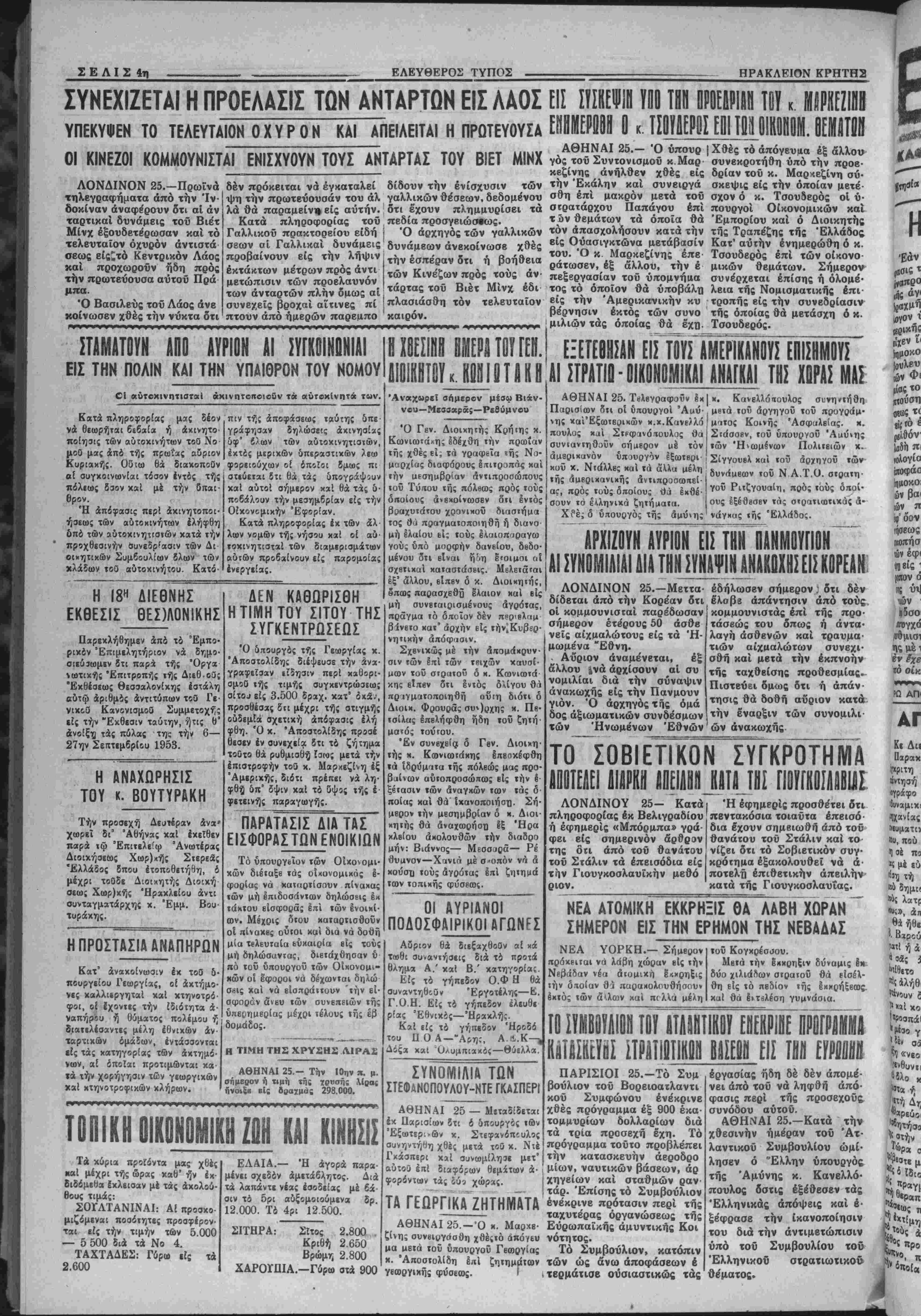 *<ϊ έπιφυλάξεις έναντι τής ί'ωοιχής κακοπιστίας, τίθε Τϊιχαί υπό σοβαράν συζή Η ΠΡρΤΟΒΟΥΛΙΑ θύδεμία απάντησις εδόθη είς τόν λόγον τοϋ πρόεδρον κ. Άϊν· ζβνχάονερ, καί οδΐβ βεβαία πρό κείται νά δοθή άπό Ρωσικής πλβυ ράς. Έν τώ μβταξύ αί χρίαεις χαί τα σχόλια επί τβϋ ΠροεΒρικοΰ λό¬ γον μεταξύ των Σύμμαχον, δίδουν καί πέρνουν. "Εφθασαν μάλιστα μέϊρι τοϋ σημείον νά διατυπώσουν καί έπιφυλάξβις ώς πρός την προ- | κτιχήν αξίαν τοΰ λόγον τούτον. Άπό μίαν δήλωσιν δέ τοϋ Βοεττα- ψς μεραρχιών καί 4.000 άερο Ι κΤικίιν -λάνων, δηλαδή είς δ αέ Α τρον εϊχε ποοαποφασίσει ή %ΉίΖΉ^% περυσΐνη διάσκεψις τής ΛΐΟ νβται κάποια δυσφορία, άπό Άγ- σαβώνθς, θά δοθή μία νέα Υλι)«)ί πλευβάς, ώς πρός την πρω κατβύθυνσις, πρός την δημι ϊ°Ρ°υλί°ν τού "Αμερικανόν Προέ¬ ουργίαν μιάς πανισχύρου ά δρου νά ανοίξη τόν δρόμον των - _ διαποαγματεύσβων μέ την Σοβ. εροπορίας καί μεγάλων άπο , "Ενωσιν. Τα πρώτ<ΐ λοιπόν συμ θά έ δ ρρς μγ ο θεμάτων νέων δπλων καί ά πτώματα τής αιιλβιρηνιχής προπα- Γηθόνηιι ιΊλινηίι ιί'ίητρ ρίεΛρ * νάνβος τής Ρωσίας, άΐτοβλβπούσης φθθνου υλΐκθυ,^ωστε ν-^ΟΒ , Πβ0(ρανώς ϊίς την διάσπασιν τής φ , ς δομένην στιγμήν νά είναι δυνατάς ό έξοπλισμός μέγα λων έφβδρικών μαζών. Εάν τό Συμβούλιον καταλήξη τε λικώς είς την απόφασιν νά αρκεσθή είς τάς 50 μεραρ χίας τάς οποίας διαθέτει σή μερον τό ΝΑΤΟ καί νά στρα φή ή προσπαθεία των συμ μάχων είς την δημιουργίαν άποθεμάτων ύλικοΰ, γεννά ται άμέσως τό (έρώτημα. Αί στρατιωτικαί δυνάμεις τής λλάδ λζό ρ ς ς Ελλάδος, υπολογιζόμενον ς συμμαχιχής συνοχήο χαΐ συμπνοί αί, έσημβιώθησαν ηδη μέ τάς δια- σταυρουμένας έπιχρίσεις πβρί με- μονωμένων πρωΐοβουλιών. Η ΑΡΧΑΙΟΛΟΠΚΗ ΥΠΗΡΕΣΙΛ ΕΜΠΟΑΙΟΝ ΕΙΣ Τ ΟΝ ΕΥΠΡΕΠΙΣΜΟΝ ΤΗΣ ΠΟΛΕΩΣ ΤΟ ΣΥΜΦΕΡΟΝ ΤΟΥ ΗΡΑΚΛΕΙΟΥ ΑΠΑΙΤΕΙ ΝΑ ΣΤΑΜΑΤΗΣΗ ΤΑΣ ΠΑΡΕΜΒΑΣΕΙΣ ΤΗΣ Ό Δήμος Ηρακλείου, έι<1 κεΐ, ούτω δέ έματαιώβη έ εύ· κεφαλής τού όίτοίου ευρίσκεται , πρεπισμό; τή; κΐντρικΜΤίρ»; ς ευρίσκεται σήμερον ενα; νέος καί δρκστπ· ριος Δήμαρχος ο κ. Γεωργιά¬ δης, εταξε μεταξύ των αλλων σκοπ&ν καί τόν βΰπρκπισμόν της πόλεώς ή οποίαι αΰν Τ0 ΟΛΙΣΘΗΜΑ Μία μαθήτνια τής Έμπορικης Σχολής μόλις 18 έτών έπεσκ προ χόες άπό τόν άντιβραχίονα τού λι μένος μας είς την θάλασσαν, άλλά 8έν έπνίγη Την έσωσαν οί παρο- τυχόντες οί όποϊοι έσπευσαν κα την άνέσυραν. Όσον άφορΐ} τα οί ηα τού παθήματος τής μυβητρίας ύπάρχκι μία διαφωνία μεταξΰ τής βεβαία μεταξυ των 50 θά , Ιδίας καί των άλλων. Ή ιδία ίσ*υ μβ■ οίεβιαι δϊι ή ΠχωσιΕ της β1ί την νβθάλ ύί τοχτονίας διά λόγονς αΐσθηματι κου;. Έν πάσι) πβριπτώσει ή δια άμυντΐκθΰ φωνία δέν είναι σοβαρά, διότι χαί εί; την μίαν περίπτωσιν καί Είς ραρχΐων, θά μεΐνουν ανβ | θάλασαν ύφείλεται είς όλίσθημα. παφοΐ; Θά ύποχρεωθώμεν Οί άλλοι συμπεραίνονν ότι πρό- δηλαδή νά κρατώμβν υπό τα κβιται μάλλον *ββΙ αποπείρας αύ- οπλα το 1)5 των δυνάμεων τοΰ όργανισμοϋ; Έφ' δσον δέ ό σκοπός τής Τ^.ν. "λλ5νΒ"!Α1 ολιΛσθιί'ιατο5 πβ° υπάρξεως καί διατηρήσεως των δυνάμεων τούτων, έξυ πηρετεΐ τα σχέδια τοΰ άμυν τικοΰ άτλαντικοΰ προγράμ τος, δέν θά ήτο παραγνώρι· |"ων>