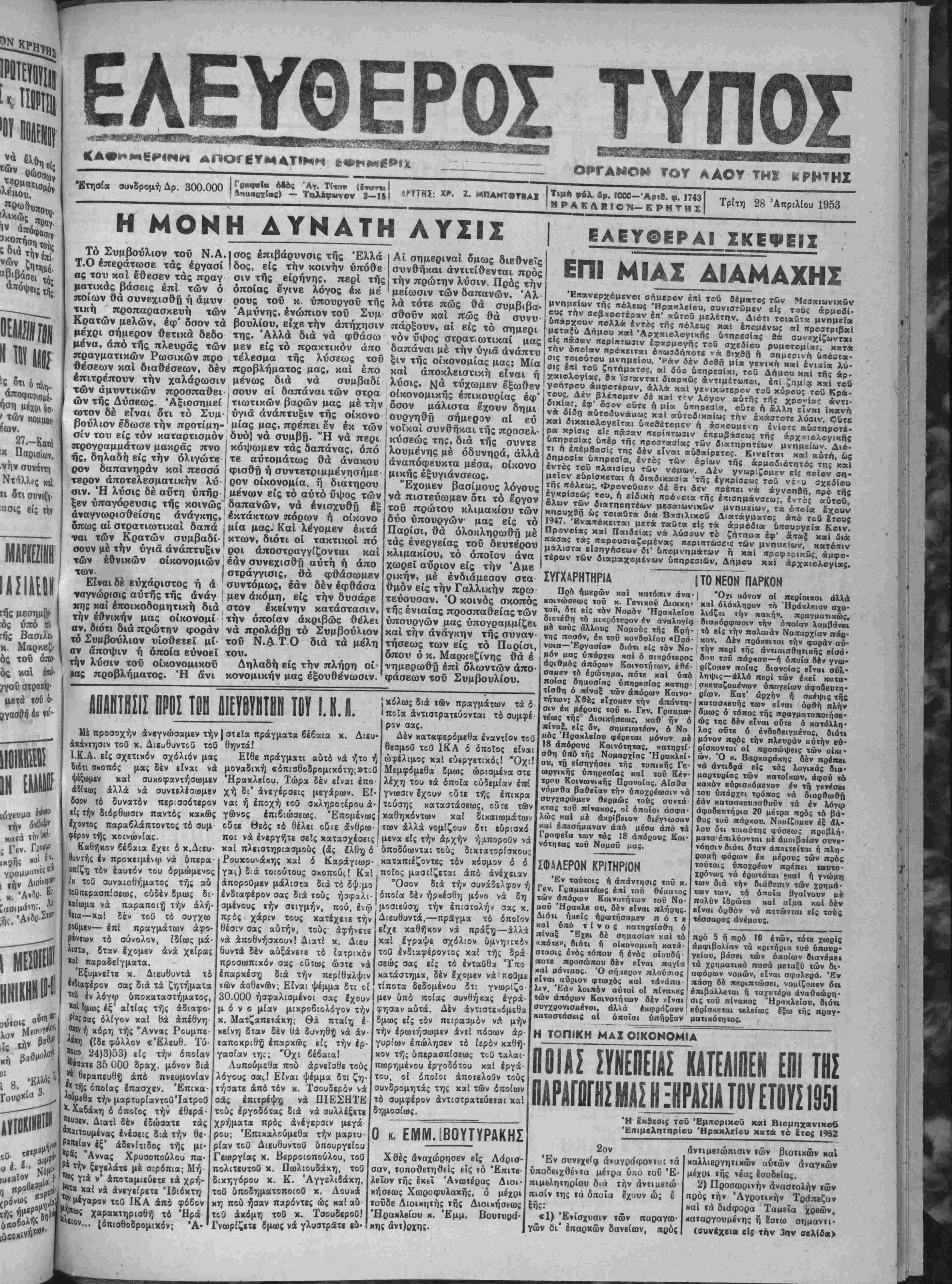 <ναι των Κρατών συμβαδί· σουν μέ την ύγιά ανάπτυξιν των έθνικών οίκονομιών των Είναι δέ ευχάριστος ή ά •ναννώρισις αυτής τής άνάγ κης καί έποικοδομητική διά την εθνικήν μας οϊκονομί αν, διότι διά πρώτην φοράν τό Συμβούλιον υίοθετεΐ μί¬ αν άποψιν ή όποία εύνοεϊ την λύσιν τοϋ οικονομικόν μας προβλήματος. Ή άνι σος έπιβάρυνσις τής Έλλά δος, είς την κοινήν ύπόθε σιν τής είρήνης, περί τής οποίας έγινε λόγος έκ μέ ρους τοΰ κ ύπουργοΰ τής Αμύνης, ενώπιον τοΰ Συμ βουλίου, εϊχβ την απήχησιν της. Άλλά διά νά φθάσω μέν είς τό πρακτικόν άπο τέλβσμα τής λύσεως τοΰ προβλήματος μας, καί έπο μένως διά νά συμβαδί σουν αί δαπάναι των στρα ι τιωτικών βαρών μας μέ την , ΰγιά ανάπτυξιν τής οίκονο μίας μας, πρέπει εν έκ των δυό) νά συμβή· "Η νά περι κάψωμεν τάς δαπάνας, όπό τε αυτομάτως θά άνακου φισθή ή συντετριμμένησήμε ρον οίκονομία, ή διατηρου με'νων είς τό αύτό ΰψος των δαπανών, νά ενισχυθή έξ έκτάκτων πόρων ή οίκονο μία μας. Καί λέγομεν έκτά κτων, διότι οί τακτικοί πό ροι άποστραγγίζονται καί εάν συνεχισθή αύτη ή άπο στράγγισις, θά φθάσωμεν συντόμως, εάν δέν έφθάσα μέν άκόμη, είς την δυσάρε στον εκείνην κατάστασιν, την όποιαν ακριβώς θέλει νά προλάβτι τό Συμβούλιον τοΰ Ν.Α Τ Ο διά τα μέλη τού. Δηλαδή είς την πλήρη οί κονομικήν μας έξουθένωσιν. Αί σημεριναί δμως διεθνεΐς συνθήκαι άντιτίθενται πρός την πρώτην λύσιν. Πρός την μείωσιν των δαπανών. Άλ λά τότε πώς θά συμβιβα- σθοΰν «αί πώς θά συνυ πάρξουν, αί είς τό σημερι νόν ΰψος στρατιωτικαί μας δαπάναι μέ την ύγιά άνάπτυ ξιν τής οίκονομίας μας; Μία καί άποκλειστική είναι ή λύσις. Νά τύχωμεν έξωθεν οικονομικάς έπικουρίας έφ' δσον μάλιστα έχουν δημι ουργηθή σήμερον αί βύ νοϊκαί συνθήκαι τής προσελ- κύσεώς της, διά τής συντε [ λουμένης μέ όδυνηρά, άλλά άναπόφευκτα μέσα, οίκονο μικής έξυγιάνσβως. "Έχομεν βασίμους λόγους νά πιστεύωμεν ότι τό έργον τοϋ πρώτου κλιμακίου των δύο ύπουργών μας είς τό Παρίσι, θά όλοκληρωθή μέ τάς ενεργείας τοΰ δευτέρου κλιμακίου, τό οποίον άνα χωρεΐ αυριον είς την Άμε ρικήν, μέ ένδιάμεσον στα θμόν είς την Γαλλικήν πρω τεύουσαν. Ό κοινός σκοπός τής ένιαίας προσπαθείας των ύπουργών μας ύπογραμμίζει καί την ανάγκην τής συναν¬ τήσεως των είς τό Παρίσι, όπου ό κ. Μαρκεζίνης θά έ νημερωθη επί όλωντών άπο φάσεων τοϋ Συμβουλιον. ΕΛΕΥΘΕΡΑ! ΙΚΕΦΕΙΣ ΕΠΙ ΜΙΑΣ ΑΙΑΜΑΧΗΣ Έπανερχόμενβι σήμερον έκΐ τοΰ Θέμκτος των Μεσαιωνιχών μνημπίων τής ηόλϊΜί Ηρακλείου, ουνιστωμβν βΐς τους άρμοδί· ούς την σοβχροτέρχν ίη' αυτού μελέτην. Διότι τοιβδτα μνημβϊα θΛαρχουν πολλά έντο; τής πόλεως καί έττομένω; «Ι προατριβαΐ μεταξυ Δημου καί Αρχαιολογικήν υπηρεσίας θά συν«χίς&>ντο«