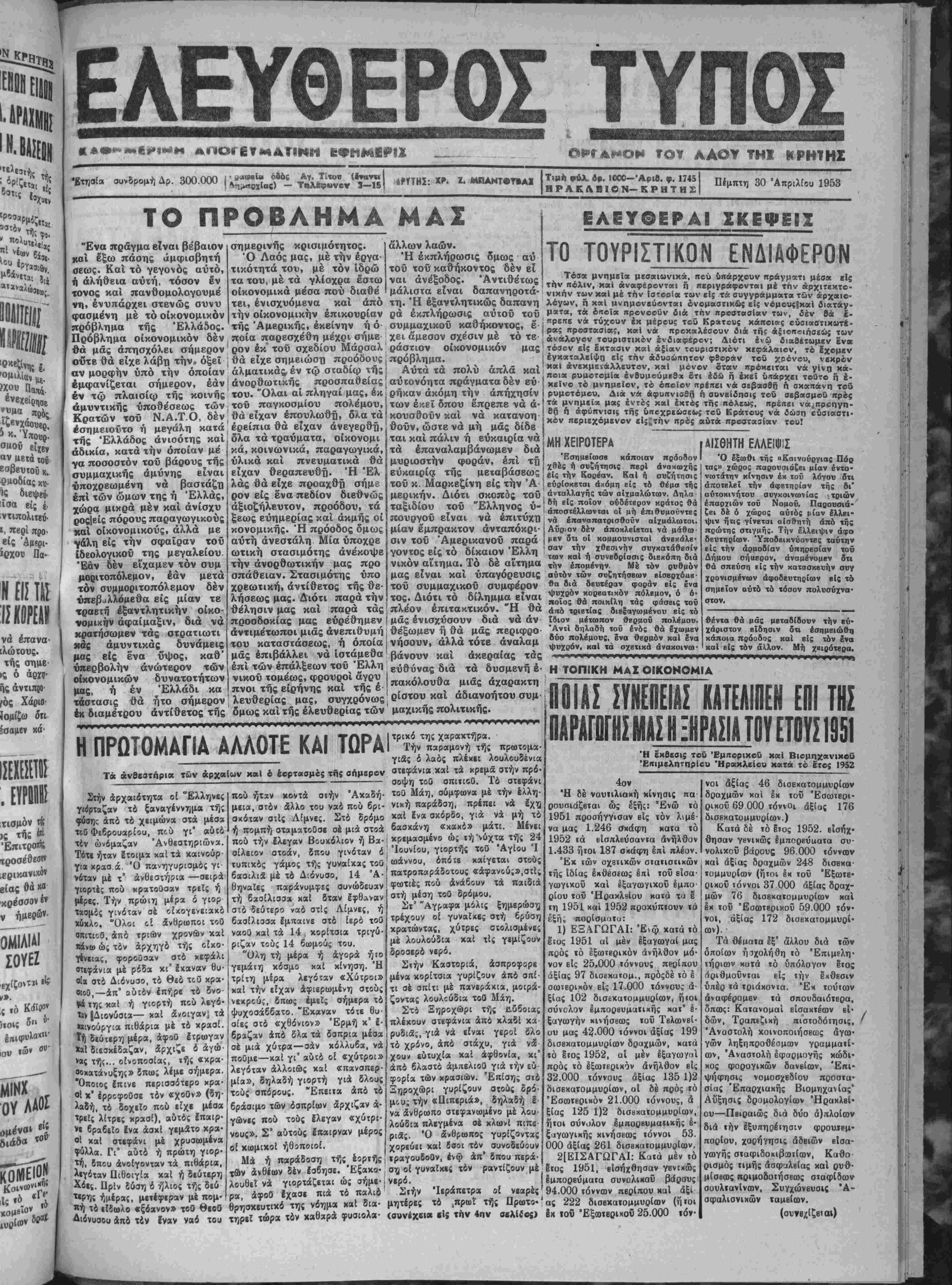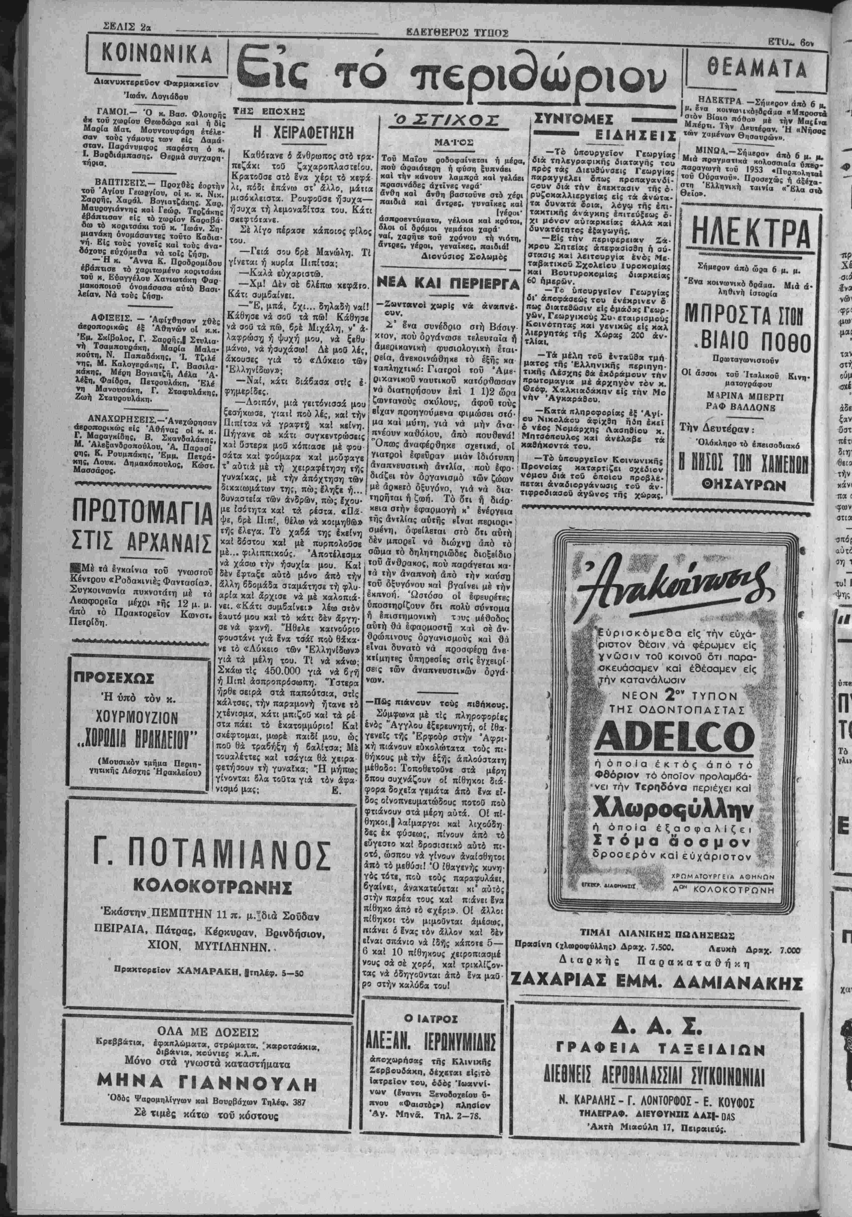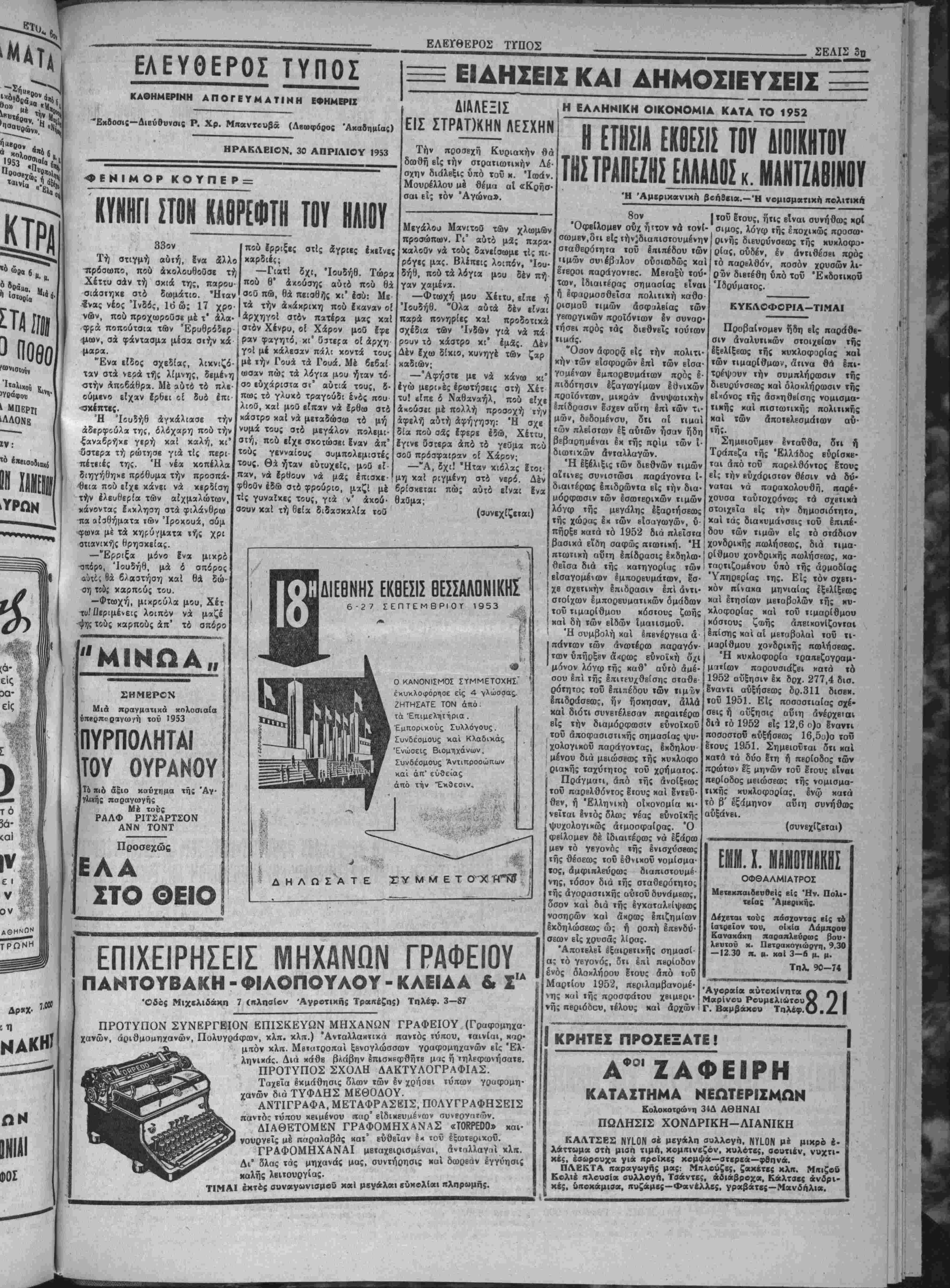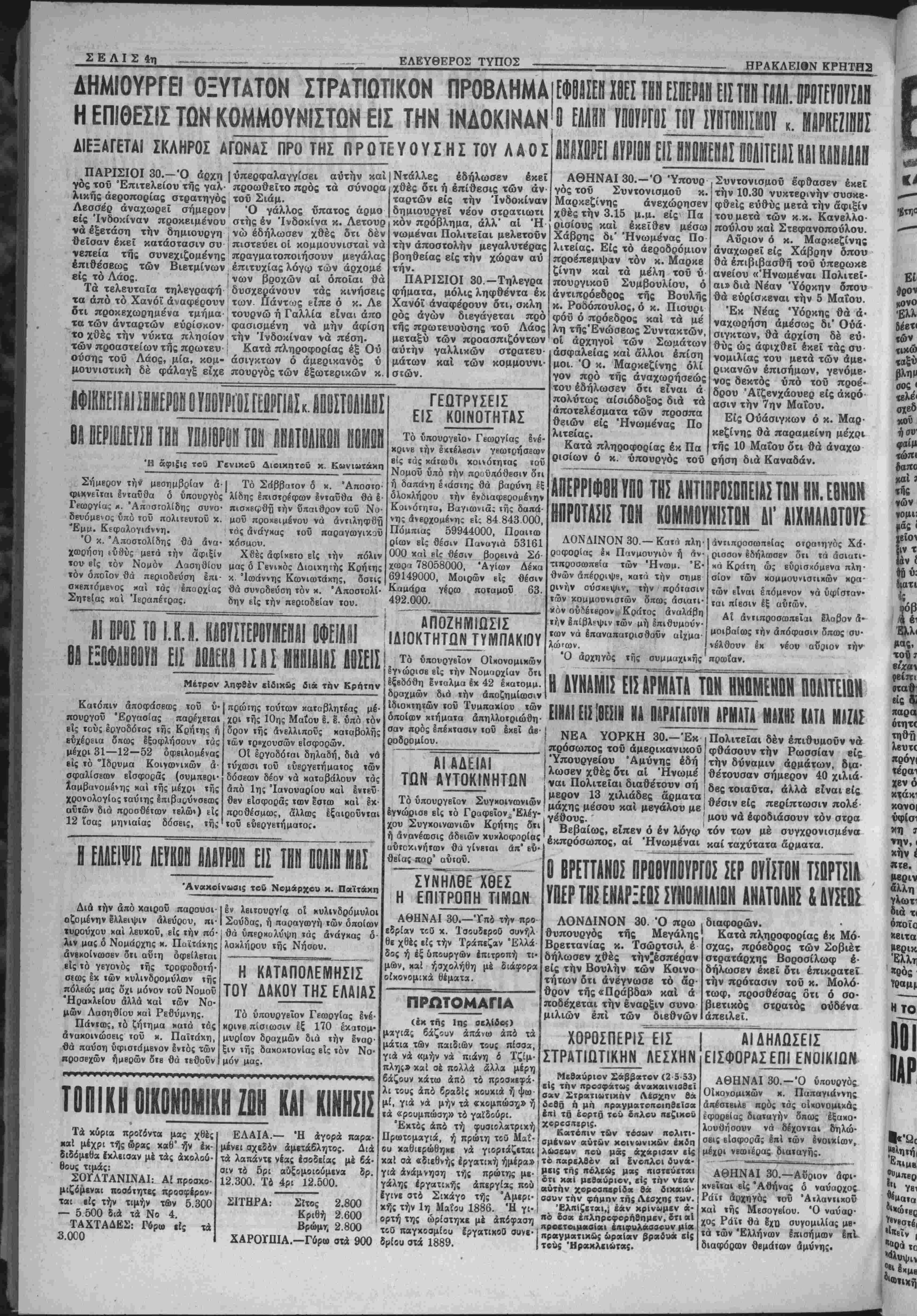 < ΔΗΜΙΟΥΡΓΗ ΟΞΥΤΑΤΟΝ ΣΤΡΑΤΙΩΤΙΚΟΝ ΠΡΟΒΛΗΜΑ ΕΦβΊΙΕπ" ΧΟΕΣ ΤΗΠ ΕΙΟΕΡΙϋ ΕΙΙΤ1Η ΗΛί. ΠΤΕιΊΠιΊ Η ΕΠΙΘΕΣΙΣ ΤΩΝ ΚΟΜΜΟΥΝΙΣΤΟΝ ΕΙΣ ΤΗΝ ΙΝΔΟΚΙΝΑΝ Ο ΕΙΑΙΙΤΠΟΤΡΓΟΣ ΤΟΥ ΠΙΪΗ1ΗΙΪ, ΗΙΡΚΕΖΙ1Ι ΑΙΕΞΑΓΕΤΑΙ ΣΚΛΗΡΟΣ ΑΓΟΝΑΣ ΠΡΟ ΤΗΣ Π Ρ Ο ΤΕ Υ Ο Υ Σ Η Σ ΤΟΥ Λ Α Ο Σ ΙΙΙΧΙΡΕΙΙΙΠΗ ΕΙΣ ΒΠΐΕίίΙ Β1ΙΙΕΙΑΙ ΚΑΙ Μίΐϋΐ ΠΑΡΙΣΙΟΙ 30.—Ό ώρχη | γός τού Έπιτελβίου τής γαλ¬ λικής άεροπορίας στρατηγός Λεσσερ αναχωρεί σήμερον| είς Ίνδοκίναν προκειμε'νου νά εξετάση την δημιουργή , •θβΐσαν έκεΐ κατάστασιν συ νεπβία τής συνεχιζομένης έπιθέσεως των Βιετμίνων είς τό Λάος. ! Τα τελευταία τηλεγραφή τα άπό τό Χανόϊ άναφέρουν δτι προκεχωρημένα τμήμα-, τα των άνταρτών ευρίσκον¬ το χθές την νύκτα πλησίον των προαστείων της πρωτευ- ' ούσης τού Λάος, μία, κομ- μουνιστική δέ φάλογξ εΐχε ΰπερςραλαγγίσβι αυτήν καί | Ντάλλες εδήλωσεν έκεΐ προωθείτο πρός τα σύνορα τοΰ Σιάμ. Ό γάλλος ΰπατος άρμο στής έν Ίνδοκίνα κ. Λβτουρ νώ εδήλωσεν χθές ότι δέν πιστεύει οί κομμουνισταί νά πραγματοποιήσουν μεγάλας επιτυχίας λόγφ των άρχομβ^ νων βροχών αί οποίαι θά δυσχεράνουν τάς κινήσεις των Πάντως *1πβ ό «. Λβ τουρνώ ή Γαλλία είναι άπο φασισμένη νά μην αφίση την Ίνδοκίναν νά πέση. Κατά πληροφορίας έξ Ου άσιγκτων ό άμερικανός ύ πουργός των εξωτερικών κ. χθές ότι ή επίθεσις των άν¬ ταρτών βίς την Ίνδοκίναν δημιουργβΐ νέον στρατιωτι κόν πρόβλημα, άλλ' αί Ή νωμέναι Πολιτειαι μβλβτοϋν την αποστολήν μεγαλυτέρας βοηθείας είς την χώραν αΰ την. ΠΑΡΙΣΙΟΙ 30-Τηλεγρα φηματα, μόλις ληφθέντα έκ Χανόϊ άναφέρουν ότι, σκλη ρός αγών διβγάγεται πρό τής πρωτευούσης τοΰ Λάος μεταξύ των προασπιζόντων αυτήν γαλλικών στρατευ- μάτων καί των κομμουνι- σΐών. Κ. II ΟΕΡΙ01ΕΥΙΗΙΗΙΙ ΜΙΜΗ ΤΡ. ΜΜΜΙΗΟΚΟΗ Ή άφιξις τοΰ Γενικβΰ Διοικητοϋ κ. Κωνιωτάχη Σήμερον την μεσημβρίαν α¬ φικνείται ενταύθα δ ύπουργός Γεωργίας χ. Αποστολίδης συνο· δευόμενος υπό τοΰ πολιτευτοϋ κ. Έμμ. Κεφαλογιάνντ]. "Ο κ. Αποστολίδης θά ανα¬ χωρήση ευθύς μετά την άφιξιν τού είς τόν Νομόν Λασηθίου τόν οποίον θά περιοδεύση επι- σκεπιό'μβνος καί τάς επαρχίας Σητείας και Ιεραπέτρας. Τό Σάββατον δ κ. Αποστο¬ λίδης επιστρέφων ενταύθα θά Ι Ηισχεψθχ) την ύπαιθρον τού Νο· μού προχειμένου νά αντιληφθή τάς ανάγκας τοΰ παραγωγικοϋ κόσμου. Χθές αφίκετο είς την πόλιν μας δ Γενικάς Διοικητής Κρήτης κ Ιωάννης Κωνιωτάκης, όστις θά συνοδεύση τόν κ. Άποστολί- δην είς την περιοδείαν τού. ΑΙ ΟΡΟΣ II Ι.Κ.1. ΚΑΟΥΣΤΕΡΟΥΜΕΙΙΑΙ ΟΦΕΙΛΗ ΒΦίϋϊΜ ΕΙΣ Ι1ΕΙΙΙΙΣ11Η1Ι11Σ ΑΟΣΕ1Σ Μέτρον ληφθέν ειδικώς διά την Κρήτην Κατόπιν αποφάσεως τοΰ ΰ· | πουργοΰ Εργασίας παρέχεται είς τού; έργοδότας τής Κρήτης ή εύχέοεια όπως έξοφλήσουν τάς μέχρι 31—12—52 όφβιλομένας βίς τό Ίδρυμα Κοινωνιχών ά· σφαλίσεων εϊσφορας (συμπΒρι- Χαμβανομένης καί τής μέχρι τής χρονολογίας ταύιης έπιβιις>ύνσεα>ς
