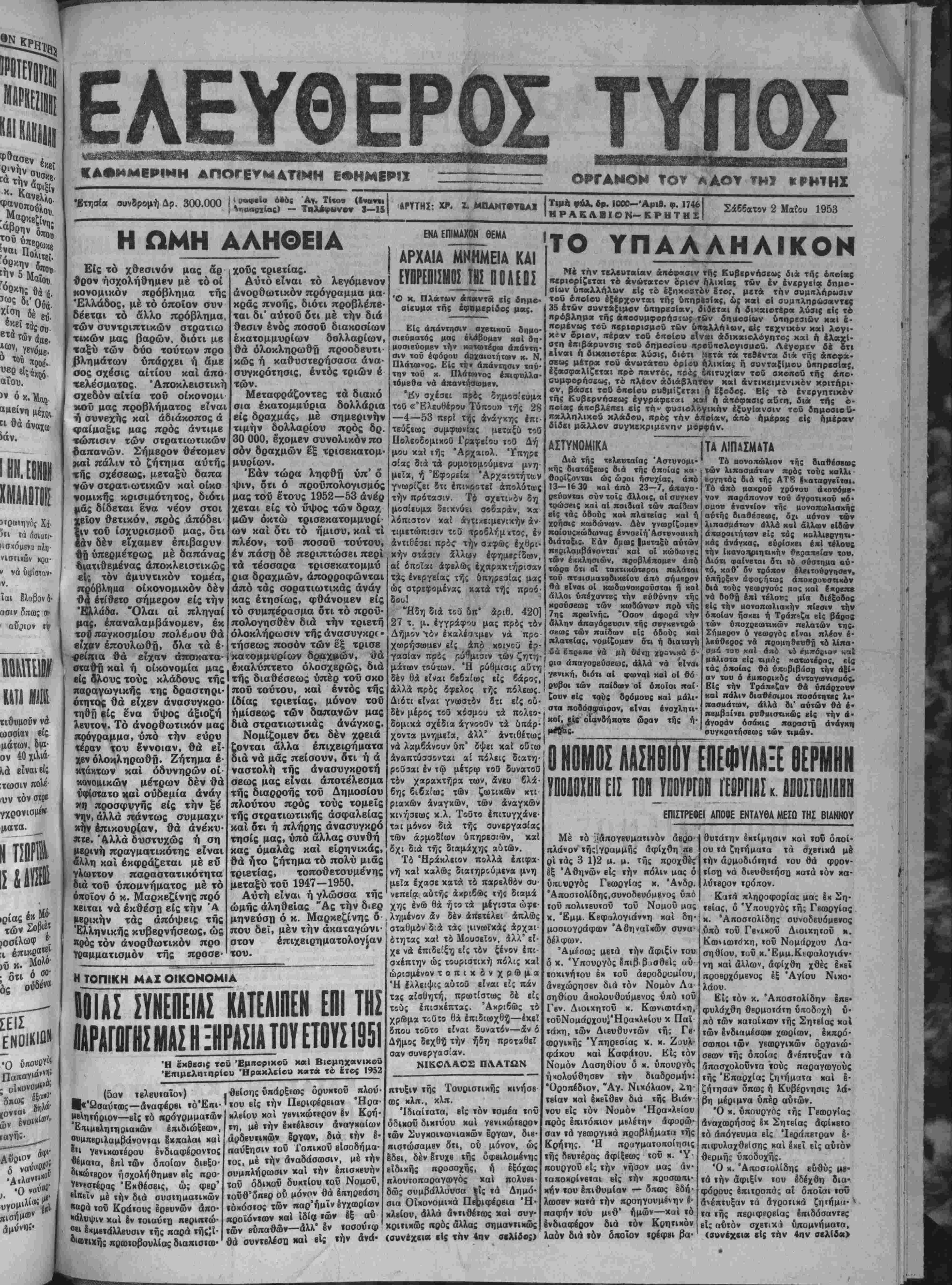 <νών στρατιωτικών καί οίκο νομικής κρισιμότητος, διότι «.άς δίδεται ένα νέον στοι χβίον θετικόν, πρός άπόδει Ιιν τοΰ ίσχυρισμοΰ μας, δτι εάν δέν είχαμεν έπιβαρυν τ)ή ύπερμέτρως μέ δαπάνας δ,ατιθεμένας αποκλειστικώς «Ις τόν άμυντικόν τομέα, πρόβλημα οικονομικόν δέν θβ ετίθετο σήμερον είς την Έλλάδα. "Ολαι αί πληγαί μας· επαναλαμβάνομεν, έκ τοϋ παγκοσμίου πολέμου θά βίχαν έπουλωθχι, δλα χά έ· ■οείπια θά είχαν αποκατα¬ σταθή καί ή οίκονομία μας . είς δλους τούς κλάδους τής | παραγωγικής της δραστηρι¬ ότητος θά είχεν άνασυγκρο· τηθί) είς ένα ΰψος άξιοζή λβυτον. Τό άνορθωτικόν μας ποόγραμμσ, υπό την εΰρυ τέραν τού έννοιαν, θά εί¬ χεν όλοκ,ληρωθή- Ζήτημα έ κτάκτων καί όδυνηρών οί χονομ,ικών μέτρων δέν θά νφίστατο καί ούδεμία άνάγ «Π προσφυγής είς την ξε νην, άλλά πάντως συμμαχι· «ήν έπικουρίαν, θά άνέκυ- πιβ. Άλλά δυστυχώς ή ση μερινή πραγματικότης είναι δλλη καί έκφράζεται μέ εΰ γλωττον παραστατικότητα διά τοΰ ύπομνήματος μέ τό οποίον ό κ. Μαρκεζίνης πρό χβιται νά εκθέση είς την Ά μερικήν τάς άπόψεις τής Έλληνικής κυβερνήσεως, ώς Χο,ός τόν άνορθωτικόν προ ΤΡ,αμματισμόν τής προσε¬ χούς τριετίας. Αΰτό είναι τό λεγόμενον άνορθωτικόν πρόγραμμα μα¬ κράς πνοής, διότι προβλέπε· ται δι' αΰτοΰ δτι μέ την διά θέσιν ενός ποσοϋ διακοσίων έκατομμυρίων δολλαρίων, θά όλοκληρωθή προοδευτι- κώς ή καθυστερήσασα άνα- συγκρότησις, έν τος τριών έ τών. Μεταφράζοντες τα διακό σία έκατομμύρια δολλάρια είς δραχμάς, μέ σημερινήν τιμήν δολλαρίου πρός δρ. 30 000, έχομεν συνολικόν πό σόν δραχμών εξ τρισεκατομ- μυοίων. Εάν τώρα ληφθή ύπ' δ ψιν, δτι ό προϋπολογισμόν μας τοΰ έτουε 1952—53 άνέρ χβται είς τό ΰψος τών δραχ μών όκτώ τρισεκατομμυρί- ων καί ότι τό ήμισυ, καί τί πλέον, τοΰ ποσοϋ τούτου, έν πάση δέ περιπτώσει περί τα τέσσαρα τρισεκατομμύ ρια δραχμών, άπορροφώνται άπό τάς στρατιωτικάς άνάγ κάς ετησίως, φθάνομεν είς τό συμπέρασμα δτι τό προϋ- πολονησθέν διά την τριετή όλοκλήρωσιν τής άνασυγκο» · τήσεως ποσόν τών εξ τρισε καΐομμυρίων δραχμών, ϋά έκαλύπτετο όλοσχερώς, διά τής διαθέσεως υπέρ τοΰ σκο ποϋ τούτου, καί έντός τής ίδίας τριετίας, μόνον τοϋ ημίσεως τών δαπανών μας διά στρατιωτικάς ανάγκας. Νομίζομεν δτι δέν χρειά ζονται αλλα έπιχειρήματα διά νά μάς πείσουν, δτι ή ά ναστολή τής άνασυγκροτή σεως μας είναι άποτέλεσμα τής διαρροής τοϋ Δημοσίου πλούτου πρός τούς τομείς τής στρατιωτικάς ασφαλείας καί δτι ή πλήρης άνασυγκρο τησίς μας, υπό άλλας συνθή κάς ομαλάς καί είρηνικάς, θά ήτο ζήτημα τό πολύ μιάς τριετίας, τοποθετουμένης μεταξύ τοΰ 1947—1950. Αυτή είναι ή γλώσσα τής ώμής αληθείας "Ας την διερ μηνεύση ό κ. Μαρκεξίνης δ που δεί, μέν την άκαταγώνι στον έπιχειρηματολογ^αν τού. ΛΡΧΛΙΛ ΜΪΗΜΕΙΛ ΚΑΙ ΕΥΠΡΕΠΙΣΜΟΠΟΑΕΟΣ Ό κ. Πλάτων ίπκντκ (Ις 2ημο· σίβυμα τής εφημερίδος μβ{. Είς απάντησιν σχετικόν βημο- σιεύματός μας ελάβομεν χαί 0η· μοσιεύομεν την κατωτέρω απάντη¬ σιν τού έφόρου άοχαιοτήτων κ. Ν. Πλάτωνος. ΕΙ; τη* άπάνΐησιν ταύ¬ την τού χ. Πλάιωνος έπιφυλλα- χόμεθα νά Βπανιήσωμβν. "Εν σχέσει πρός δημοσίεαμα τοθ «Έλευθέρου Τύπου» τής 28 —4—53 περί τ^ς άνάγκης Ιπι· τεύξεως αυμφωνίας μεταξύ τοθ ΠολεοδομιχοΟ Γραφείου τοθ Δή μου καί τής Άρχαιολ. 'Γπηρε οίας διά τα ρυμοχομούμενα μνη μεϊα, ή Έφορεία Άρχαιοτήτα,ν γνωρίζει δτι έπικροτεΐ απολύτως την πρότασιν. Τό σχετικόν δή μοσίευμα δεικνύει σοβαράν, κα λόπιστον καί αντικειμενικήν αν τιμετώπιαιν τΐθ ιιροβλήμϊτος, έν αντιθέσει πρός την σ^φώ; εχθρι¬ κή