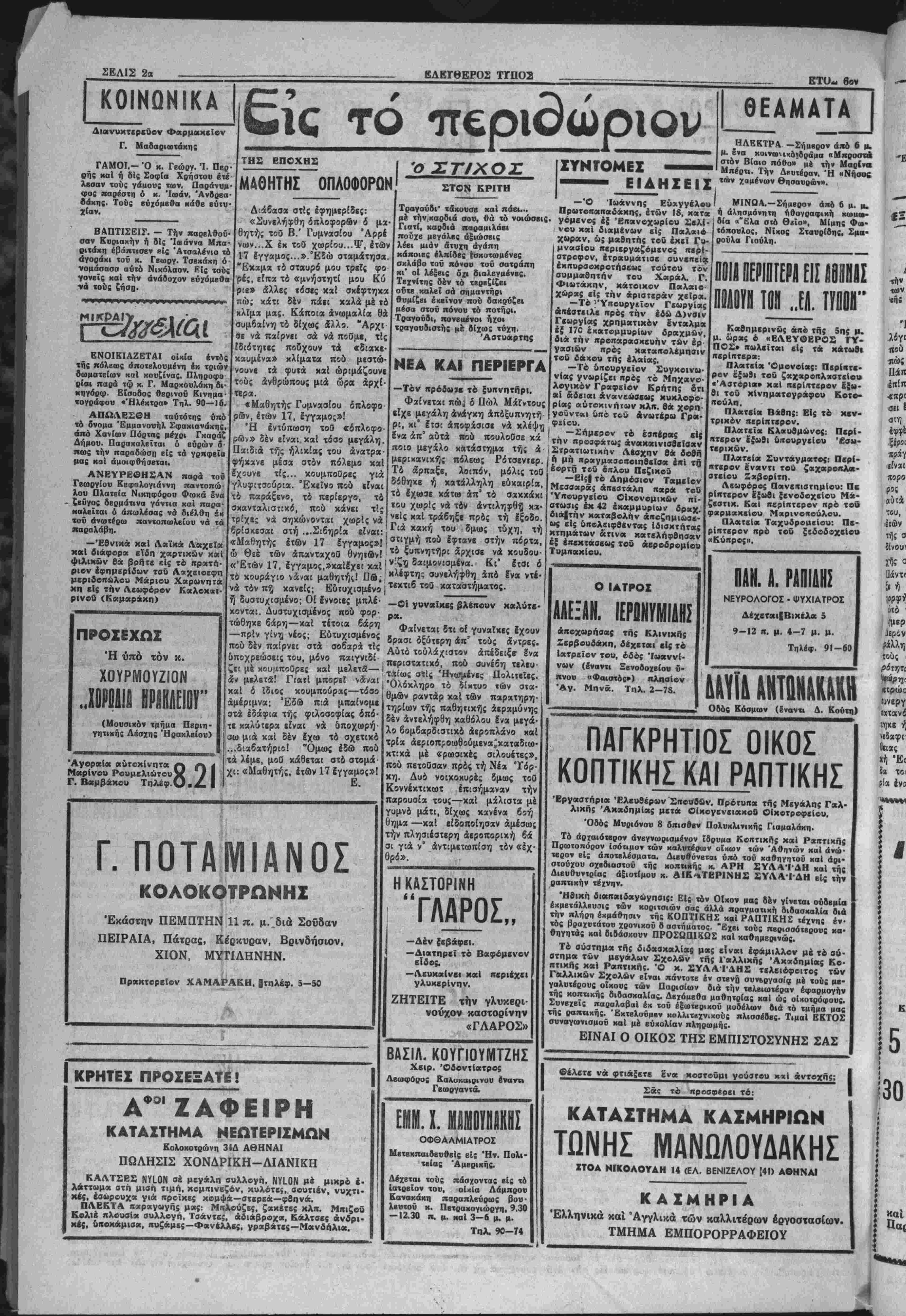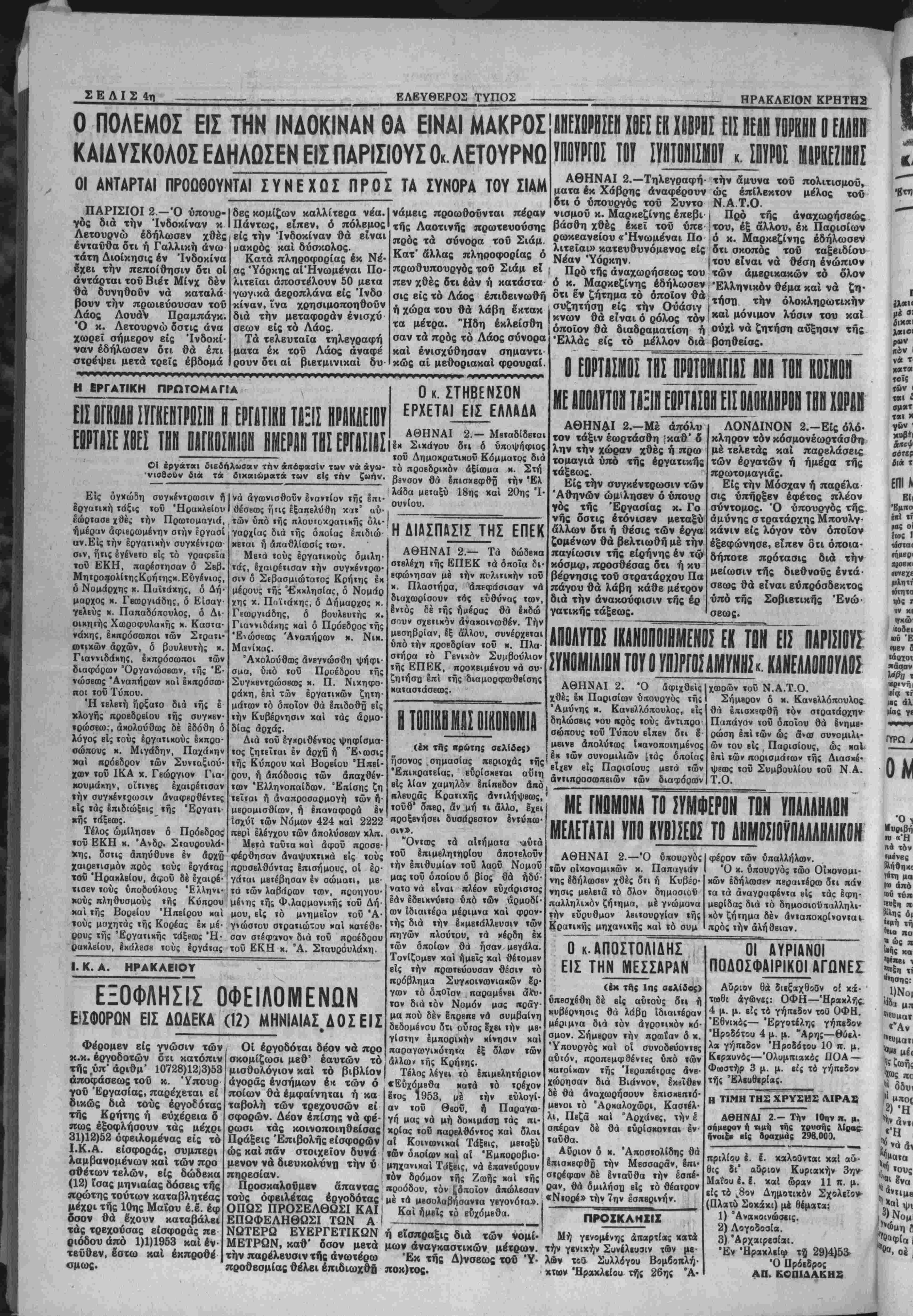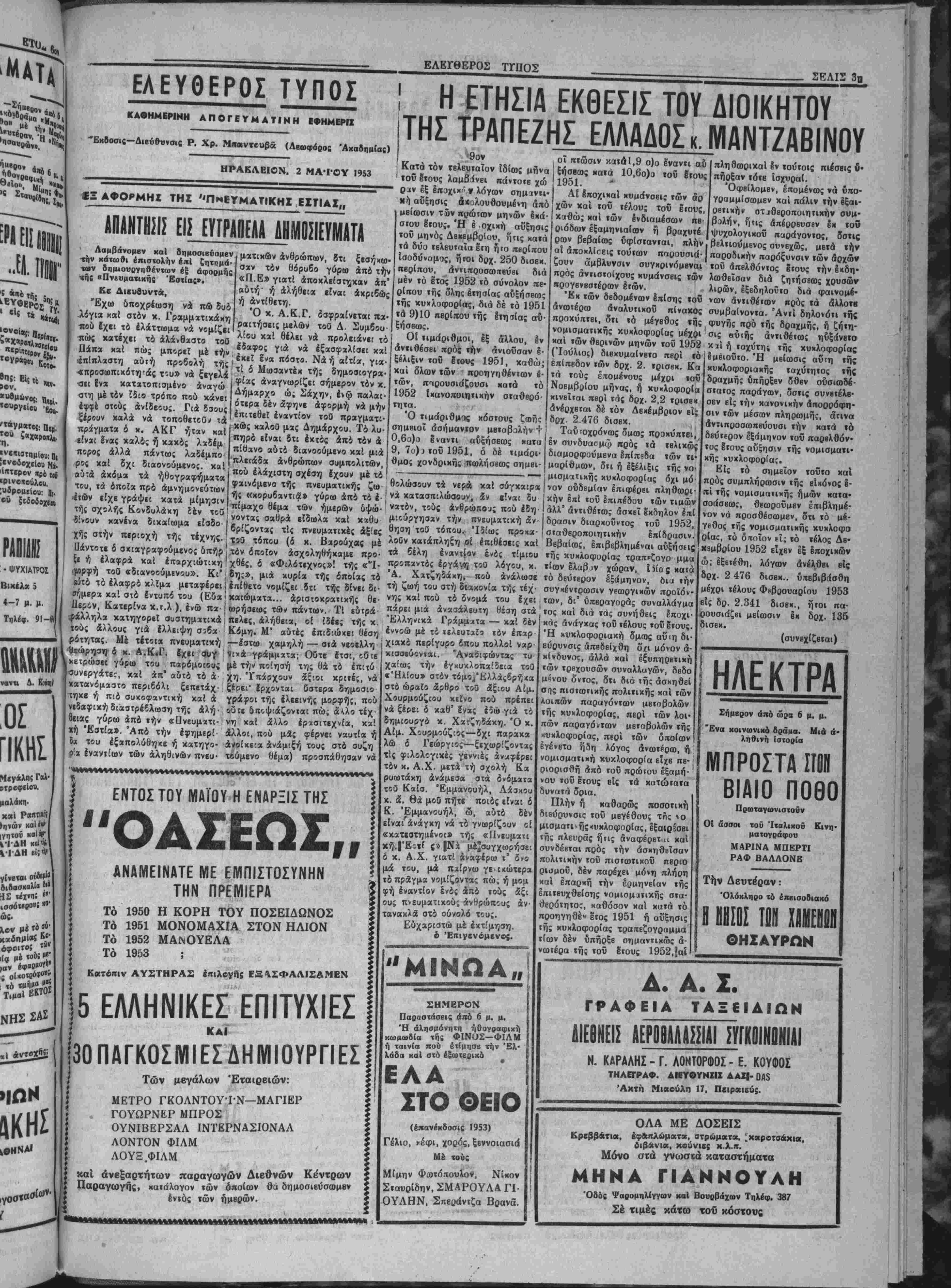 ων Ιδιαιτέρα μέριμνα καί <ρρον· τής διά την εκμετάλλευσιν των πηγών πλούτον, τα χέρδη έχ των οποίων θά ήσαν μεγάλα. Τονίζομεν καί ημείς καί θέτομεν είς την πρωτεύουσαν θέσιν τό πρόβλημα Συγκοινωνιακόν έρ¬ γων τό οποίον παραμϊνει ά<νυ· τον διά τόν Νομόν μας πράγ- μα πού δέν Ιπρβπε νό συμβαίνη δεδομένου δτι ούτος εχει την μβ· γίστην εμπορικήν κίνησιν καΐ παραγοογικό«ητα έξ δλων των άλλω' τής Κρήτης. Τέλος λέγει τό έπιμελητήριον «Ευχόμεθα κατά τό τρέχον 8ιος 1953, μέ την εύλογί- αν τοΰ θεοΰ, ίΐ Παραγω- γη μας νά μή δοκιμάση τάς πι· χρίας τοΰ παρελθόντος καί δλαι α! Κοινωνικαί Τάξβις, μβταξύ των δηοίων καί αί Έμποροβιο· μηχανικαί Τάξεις, νά επανεύρουν «όν δρόμον της Ζωής καί της προοδον, τόν [οποίον άπώλβσαν μέ τα μεσολαβήσαντα γεγονότα». Καί ημείς τό ευχόμεθα. ή είσπραξις διά των νομί- μων άναγκαστικών μέτρων. Έκ τής Δ)νσεως τοΰ Ύ· ποκ)ΐος. ΑΘΗΝΑΙ 2.-Τηλεγραφή· ματα έκ Χάβρης άναφέρουν δτι ό ύπουργός τοϋ Συντο νισμοΰ κ. Μαρκεζίνης έπεβι βάσθη χθές έκεΐ τοΰ ύπβ- ρωκεανείου «Ηνωμεναι Πό λιτβΐαι» κατευθυνόμενος βίς Νέαν Υόρκην. Πρό τής αναχωρήσεως τού ό κ. Μαρκεζίνης εδήλωσεν δτι έν ζήτημα τό οποίον θά συζητήση βίς την Ούάσιν κνων θά είναι ό ρόλος τόν οποίον θά διαδραματίση ή Ελλάς είς τό μέλλον διά την δμυνα τοΰ πολιτισμοΰ, ώς έπίλβκτον μέλος τοΰ Ν.ΑΤ.Ο. ! Πρό τής άναχωρήσβώς [τού, έξ αλλου, έκ Παρισίων ό κ. Μαρχβζίνης εδήλωσεν δτι σκοπός τοϋ ταξβιδίου τού είναι νά θέση ενώπιον των άμερικακών τό όλον Ελληνικόν θέμα καί νά ζη¬ τήση την ολοκληρωτικήν καί μόνιμον λύσιν τού καί ούχι νά ζητήση αύξησιν τής βοηθείας. Ο ΕΟΡΤΑΣΗΟΙ ΤΗ! ίΡΙΤΒΜΙΠΙΣ ΙΗΙΤΟΗ ΚΟΣΜΟΗ ΜΕ ΙΙΛΪΙΡϋ Τ1:Ι« ΕΪΤ11 ΕΙΣ ΟΛΟΚΛΗΡΟΗ ΤΗΗΙ1Ρ1Η ΑΘΗΝΑΙ 2.-Μέ άπόλυ τον τάξιν έωρτάσθη καθ" δ λην την χώραν χθές ή πρω τομαγιά υπό τής έργατικής τάξεως. Είς την συγκέντρωσιν των Αθηνών ωμίλησεν ό υπουρ γός τής "Εργασίας κ. Γο νής όστις ετόνισεν μβταξύ άλλων δτι ή θέσις των έργα ζομένων θά βελτιωθή μέ την παγίωσιν τής είρήνης έν τώ κόσμω, προσθέσας δτι ή κυ βέρνησις τοϋ στρατάρχου Πά πάγον θά λάβη κάθε μέτρον διά την ανακούφισιν τής έρ γατιχής τάξεως. ΛΟΝΔΙΝΟΝ 2.-Είς ολό¬ κληρον τόν κόσμονέωρτάσθτι μέ τελετάς καί παρβλάσεις των έργατών ή ήμέρα τής πρωτομαγιάς. Είς την Μόσχαν ή παρέλα σις υπήρξεν εφέτος πλέον σύντομος. Ό ύπσυργός τής αμύνης στρατάρχης Μπουλγ- κάνιν βίς λόγον τόν οποίον εξεφώνησε, είπεν δΐι όποια- δήποτε πρότασις διά την μείωσιν τής διεθνοΰς εντά¬ σεως θά είναι εύπρόσδεκτος υπό τής Σοβιετικάς Ενώ¬ σεως. ΑΗΟΛΥΤΟΣΙΚΑΝΟΟΟΙΗΜΕΝΟΣ ΕΚ ΤΟΝ ΕΙΣ ΠΑΡΙΣΙΟΥΣ ΣΥΝΟΜΙΛΙΟΝ ΤΟΥ Ο ΥΟΙΡΤΟΣΑΜΥΙΣκ. ΚΑΝΕΛΛΟΑΟΥΛΟΣ ΑΘΗΝΑΙ 2. Ό αφιχθείς χθέ; 1κ Παρισίων ύπουργός τής "Αμύνης κ. Κανελλόπουλος, βϊς δηλώσεις νού πρός τούς άντιπρο σώπους τοΰ Τύπου είπεν δτι Ι μεινε απολύτως Ικανοποιημένος έκ των συνομιλιών ^τάς οποίας είχεν είς Παρισίους μετά των άντιπροσιοπειών των διαφόρων χωοών τοϋ Ν.Α.Τ.Ο. Σήμερον δ κ. Κανελλόπουλος θά έπισκβφθή τόν στρατάρχην Παπάγον τοΰ δ/ΐοΐου θά ένηαε- ρώση επί των ώς <5νω συνομιλι* ών τού είς , Παρισίους, ώ; καί επί των πορισμάιων τής Διασχέ· ψβως τοΰ Συμβουλίου τοϋ Ν Α. Τ.Ο. ΜΕ ΓΝΟΜΟΝΑ ΤΟ ΣΥΜΦΕΡΟΝ ΤΟΝ ΥΟΑΛΛΗΑΟΝ ΜΕΛΕΤΛΤΛΙ ΥΠΟ ΧΥΙ1ΣΕΟΣ ΤΟ ΑΗΜΟΣΙΟΙΌΛΛΛΗΛΙΚΟΗ ΑΘΗΝΑΙ 2.—Ό ΰπουργός των οίκονομικών κ. Παπαγιάν νης εδήλωσεν χθές δτι ή Κυβέρ¬ νησις μελετα τό δλον δημοσίου παλληλικόν ζήτημα, μέ γνώμσνα την εύ'ρυθμον λειτουργίαν τής Κρατιχής μηχανιχής καί τό συμ φέρον των ύπαλλήλων. Ό κ. ΰπονργός τώο Οϊκονομι- κων έδήλωσβν π