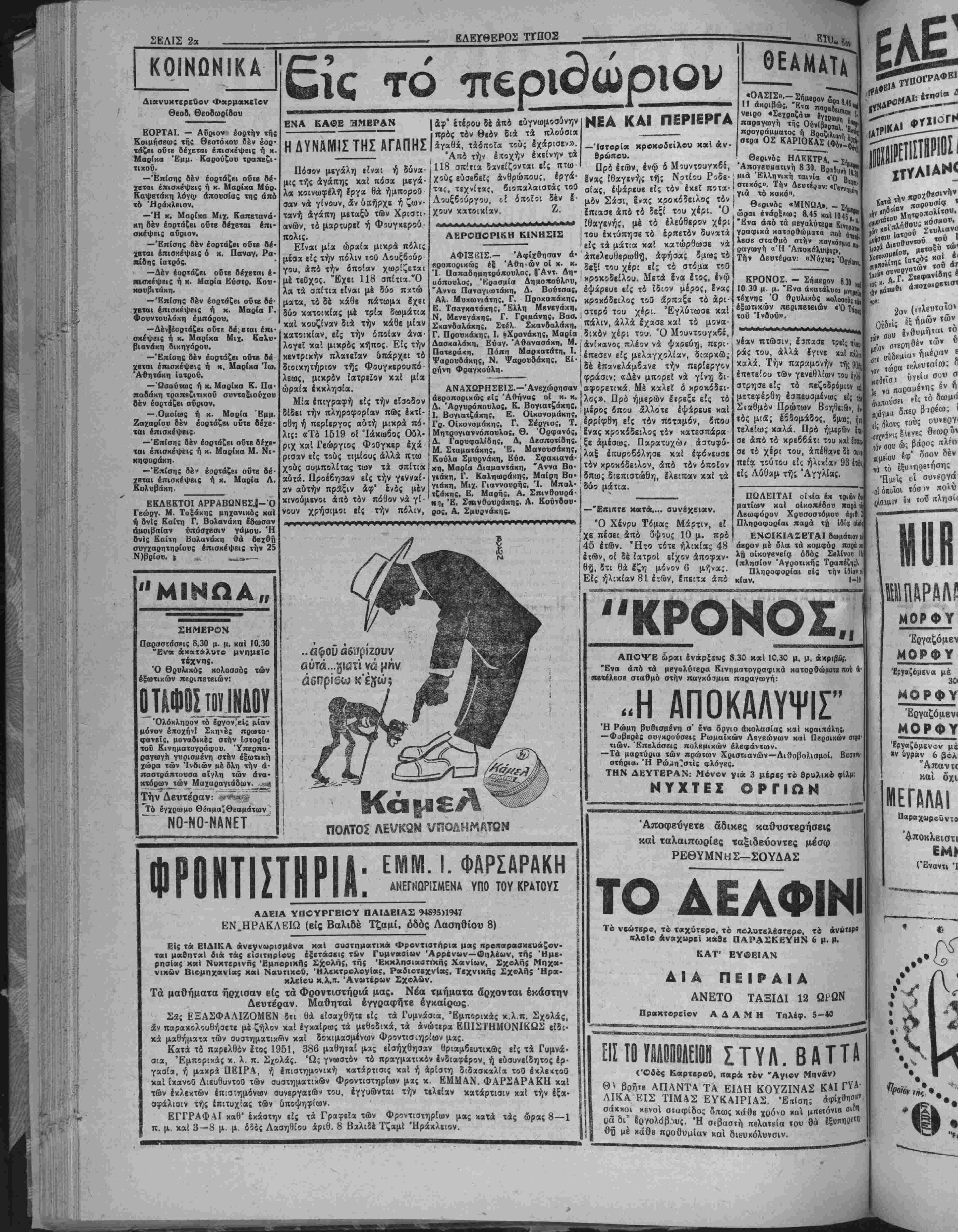 θά ύπάρΐτι, βσον ζβϊ καί Οό ζή <Ι η ιι Έλλά;, ή άνάμνησις ή τραγιχή χαί φωτεινή μαζύ τοϋ τορπιλλισμοΰ της «Έλλης». Ποίος δίν ένβυμϊϊ- —ι την στιγμήν εκείνην—άπόγβυ- ρα Δβχαπβνταιιγούατου—πού Εφθα¬ σεν είς τή ν άνήσνχον Ατμόσφαιραν ή όχοία επεκράτει καί έδώ, τό^ αγ- γελμα τοϋ τορπιλλισμοΰ τής «"Ελ- Ιης» μας! Συγχλονισμός ήτο τό αγ- γιΐμα έκεϊνο καί μαζύ μέ τόν συν κλονισμόν καί προειβοκοίησις. Ή¬ το ή προειβοποίησις τοϋ αρχόμε¬ νον μαρτυρίου τής Ελλάδος άλλά ■αί τής μβγαλβιώβους έξορμήσεως —ς ιίς τα Ήπειρωιιχά ύψίπεοα. Δεν ίχάμφθη ή Ελλάς άπό τόν τοοπιλλισμόν τής «'Ελλης». Ήτοι· κάσθη τουναντίον μέ θάρρος, αύ· τακάοντισιν κοΐ ηρωϊσμόν άχατά- {ΙΙηχον νά κατέλθη σύσσωμος είς ών άγώνα καί νά διεκβικήση είς ύίαΐ νά ηεΒία την νίκην. Καί την επέτυχε την νίκην —νίκην ηθικήν *{0 παντός έφ' όσον αί θυσίαι της Βέν άντημείφθησαν ώς έπρβπε. Μέ την νίκην της επανελήφθη καί έ καγιώθη ή αθάνατος βόξα της. Ή νεατέρα λοιπόν Έλληνική δόξα άρ χίίιι άκδ την Τήνον. Ή ανανβρος τορπΙΗη ποΰ κατεβύθισβ τό Θρυ λικόν καταοοομικόν ύπήρξβν ή πρώ τη κροϊσις είς τό βαθύτατον πα_ αΐσθημα πού ηνωσε ά π' την 'Ελλάδα καί χαί φιλότιμος οργάνωσις τής με γάλης τοπικής εορτής, πού άναΑει κνύϊΐ δντως άπέναντι ολοκλήρου της Κρήτης την μαγευτικήν Νεά πόλιν. β είς αχρον εδημιούργησε τό τού 1910—41 χαί βριάμβους τού άθάνατον τού: μετέπειτα πολυπαθοΰί *£ *£ θνους μας καί τής αίωνίας 'Ελλά- Βος. Η ΜΕΓΑΑΗ ΠΑΝΑΓΙΑ Αΰοιον είς Μεγάλην Παναγίαν Νεαπόλεως θά τελεσθή ή βίθισμέ· — "ακήγυοις, Ος γνωστόν ή πα· 'υ0>ί αύτη Β έν περιορίίειαι είς