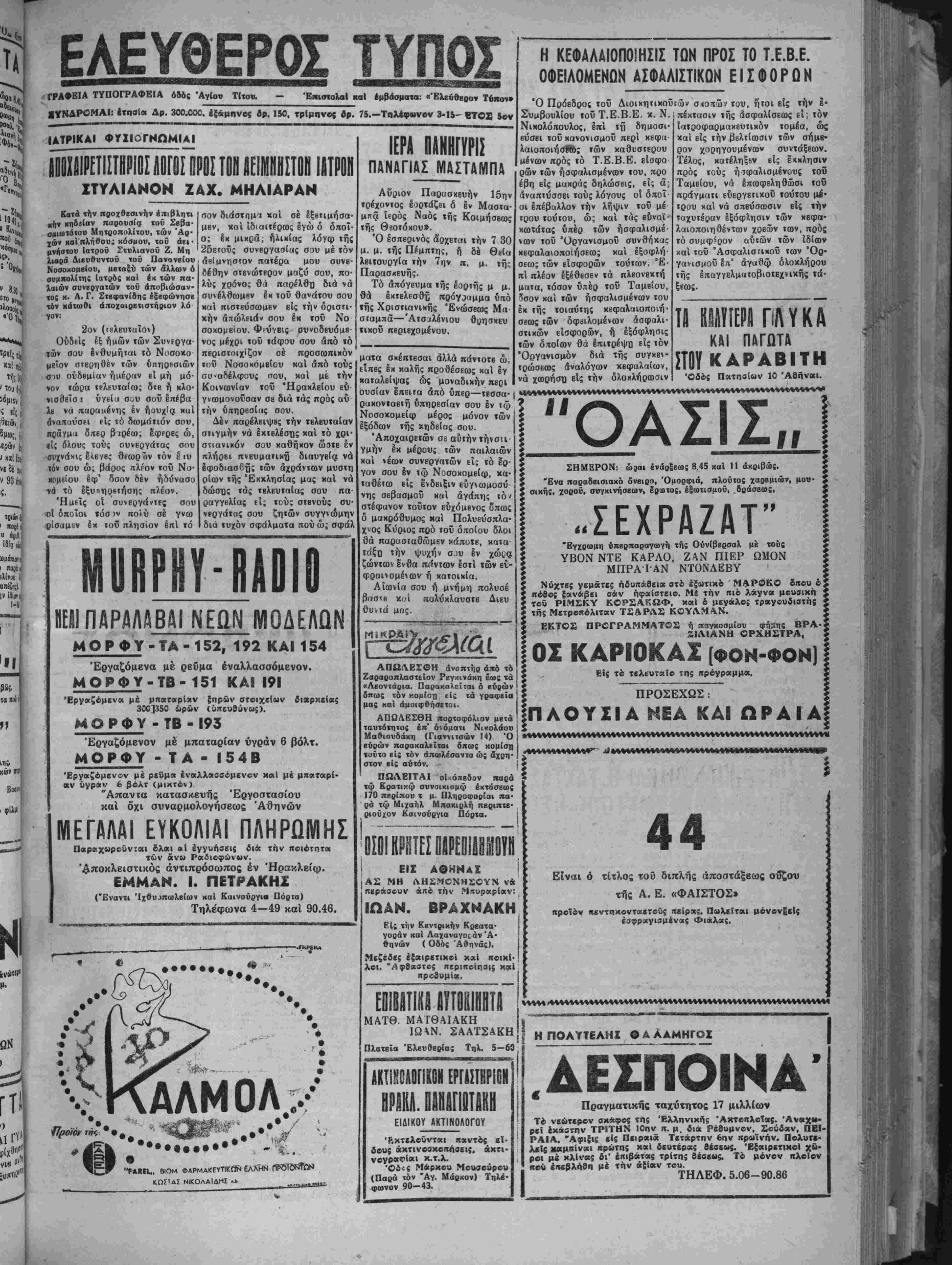 λοντας νά άπαρτίβουν την Διοι< κοΰσαν Επιτροπήν τοΰ 37 Κ. Τ.Ε.Λ. Κων. Κοντογιάννην, Μ. Κατσιρντάχην, Γρ. Λαζαράχην, Κων. Χαλκιαδάχην, Ιω. Δαβά κτιν, Άθ. Γαβριδάκην καί Ιω. Παπαδάκην. ι ΑΝΕΧΩΡΗΣΕ ΚΑΙ ΤΟ ΔΕΥΤΕΡΟΝ ΦΟΡΤΙΟΗ ΣΤΑΦΥΑΩΝ ΔΙΑ ΤΗΝ ΔΥΤΙΚΗΝ ΓΕΡΜΑΝΙΑΝ Την παρελθούσαν Τρίτην ανε¬ χώρησε διά τοθ ατμοπλοίου «Δέ¬ σποινα» τό .δεύτερον κατά σειράν κατά την εφετεινήν περίοδον φορ τΐον σταφϋλών ροζχκί μέσψ Πει¬ ραιώς δια Δυτικήν Γερμανίαν. Ή Έξαγωγική έφόρτωσε 20 000 χλγ., δ οΐκος «Ά6ραμίδης—Σα· μαρας» 10.000 χλγ. καί οί άδελ- φοί Γιαρδίγλου 6.220 χλγ. "Η τοι έν συνόλφ 36.220 χιλιίγρ. ή 36 τόννοι καί 220 χιλ*. ΟΙ ΠΡΩΤΑΙΠΟΙ ΤΟΝΤΑΡΑΧΩΝΕΙΪΜΐ ΒΑ ΔΙΚΑΣΟΟΥΝ ΥΠΟ ΤΟΥ ΣΤΡΑΤΟΛ» ΘΑΠΕΡΙΑΗΦΘΗ ΚΑΙΟΤΑΧΤΑΣ ΕΙΙΤΗΝΟΙΝΟΠΝΕΥΜΑΤΟΠΟΙΗΣΙΝ Καθ' ά πληροφορούμεθα αρ¬ μοδίως ίΐς την Ιχδοθίϊσαν υπό των υπουργείων Γεωργίας, Έμ· πορίου καί ΟΙκονομικών απόφα¬ σιν ήτις άποχλείβι (ήν οΐνοπνευ- ματοποίησιν τοΰ ταχτδ ελήφθη βασικώς ύπ' όψιν ή περί τούτου σχβτιχή είσήγησις τοΰ Γενικοΰ ΧημβΙου τοΰ Κράιους τό οποίον ίχ λάθους ή διά λόγοις σκοπι- μότητος δέν ύπέδβιξβν τουτο εις τάς αρμοδίας υπηρεσίας των έν λέγω υπουργείων. Συνεπεία δ- |μως των άπό ημερών έντονον έ· νεργειών τάς οποίας καταβάλουν αί κατά «όπους Γεωργιχαί Έ νώσβις διά την ταχυτέραν έπα νόρθωσιν τοΰ σφάλματος τό Γ β νικόν Χημεΐυν τοΰ Κράτους υ πεσχέθη δτι θά άναθεωρήσχ) την πρώτην άπόφασΐν τού διά νά εί σηγηθϋ {Ίς τό αρμόδιον υπουρ γβΐον δπως συμπβριληφθί καί ό ταχτάς είς την οΐνοπνβυματοποΐ ησιν των λοιπών προϊόντων. ΤΟΠΙΚΗ ΟΙΚΟΝΟΜΙΚΗ ΖΟΗ ΚΑΙ ΚΙΝΗΣΙΣ Τα κύρια προΓόντα μας χθές καί μέχρι τής ώρας καθ ήν έκ- διδόμεθα έκλειααν μέ τάς άχολού- θους τιμάς: ΕΛΑΙΑ.— Γυαλιά 5 δξία δέ¬ ον νά δπολογίζωνται γύρω σία 10.900 4 δξέα γύρω στά 11.100 χαί 3 δξία 11.250. ΣΟΓΛΤΑΝΙΝΑΙ: Έξακολουθοθν νά φθάνουν μιχροποσότητες είς την αγοράν, προσφερόμεναι είς την τιμήν των 3 650—3.850 α¬ ναλόγως ποιότητος καί ποσότη¬ τος. ΣΙΤΗΡΑ: 2ίτος 2.400. Κριθή 1.500 Βρώμη 1.550 Ε Ο ΡΤ Α Ι Ή χ, Μαίρη Αλεξ. Ίερωνυμίδη Ιατοοϋ δέν έορτάζβι οΰτβ δέχειαι επίσκεψις αυριον εορτήν τής Θε- οτόχου. — Επίσης δέν,έορτάζβι οδτβ δέ· χεται έπισχέψβις ή χ. Δέσποινα Φωτ. Κούτη. —Έπίσης βέν έορτάζει οΰτβ δέ- χβται έπισχέφβις ή χ. Μαίρη Ε. Ταχάχη. —Δέν έορτάζβι αύριον ή κ. Μα(· ΛΟΝΔΙΝΟΝ 14.- Τό Αί γυπτιακόν Στρατοδικείον πρόκειται νά δικάση άμέσως τα άτομα τα όποία κατηγο· ροΰνται διά τάς χθεσινάς αιματηράς ταραχάς είς την Αλεξάνδρειαν. Ή άπόφα σις αυτή ανεκοινώθη υπό τού Αϊγυπτίου Πρωθυπουρ γοΰ Άλή Μάχερ κατόπιν πό λυώρου έκτάκτως συγκροτη· θείσης συσκέψεως των άρ μοδίων παραγόντων τής Αί- γυπτιακής κυβερνήσεως. Οί ' κλωστοΰφαντουργοί έξηκρι βώθη δτι είχον σκοπόν νά - έκκαθαρίσουν όπωσδήποτε τάς Διοικήσεις των έργοστα- Η ΕΚΑΡΟΜΗ ΠΑΓΚΡΗΤΙΟΥ ΣΥΝΑΕΣΜΟΪ ΕΑΛΗΝΟΤΟΥΡΚΙΚΗΣ Σχετικώς μέ την έκδρομήν την διτοίαν όργανώνει ώ; γνωστόν δ ένταθθα Παγκρήτιος Σύνδεσμος Έλληνοιουρκικής φιλίας ίστάλη χθές ιίς τό Ναυτικόν Πρακτορεί¬ ον Άργύρη τβ κάτωθι τηλεγρά· φημα: «Έκδρομή 1ης Σεπτεμ βρίου δι* όμαδικών διαβατηοίων. Έμέτερος Αο6τσης φθάνει άερί- πορικώς Παρασκευήν πρωίαν». Είς την έκδρομήν δύνανται νά συμμετασχουν καΐ μή μέλη τοθ συνίίίμου. Η ΔΙΑΝΟΜΗ ΙΜΑΤΙΣΜΟΥ Κατά την γενομένην προχθές βΐς την 'Ιβράν Μητρόπολιν ού σκέψιν των μελών τής αρμοδίας επιτροπής διά την διανομήν τοΰ Νβοζηλανδικοϋ ίματισμοϋ 1050 κιλών έν δλφ απεφασίσθη κατ' αρχήν δπως οΰϊος διανεμηθή είς 300 έκ των απορωτέρων οίκο- Υβνβιών των δικαιούχων τοΰ Νο· μοΰ "Ηρακλε