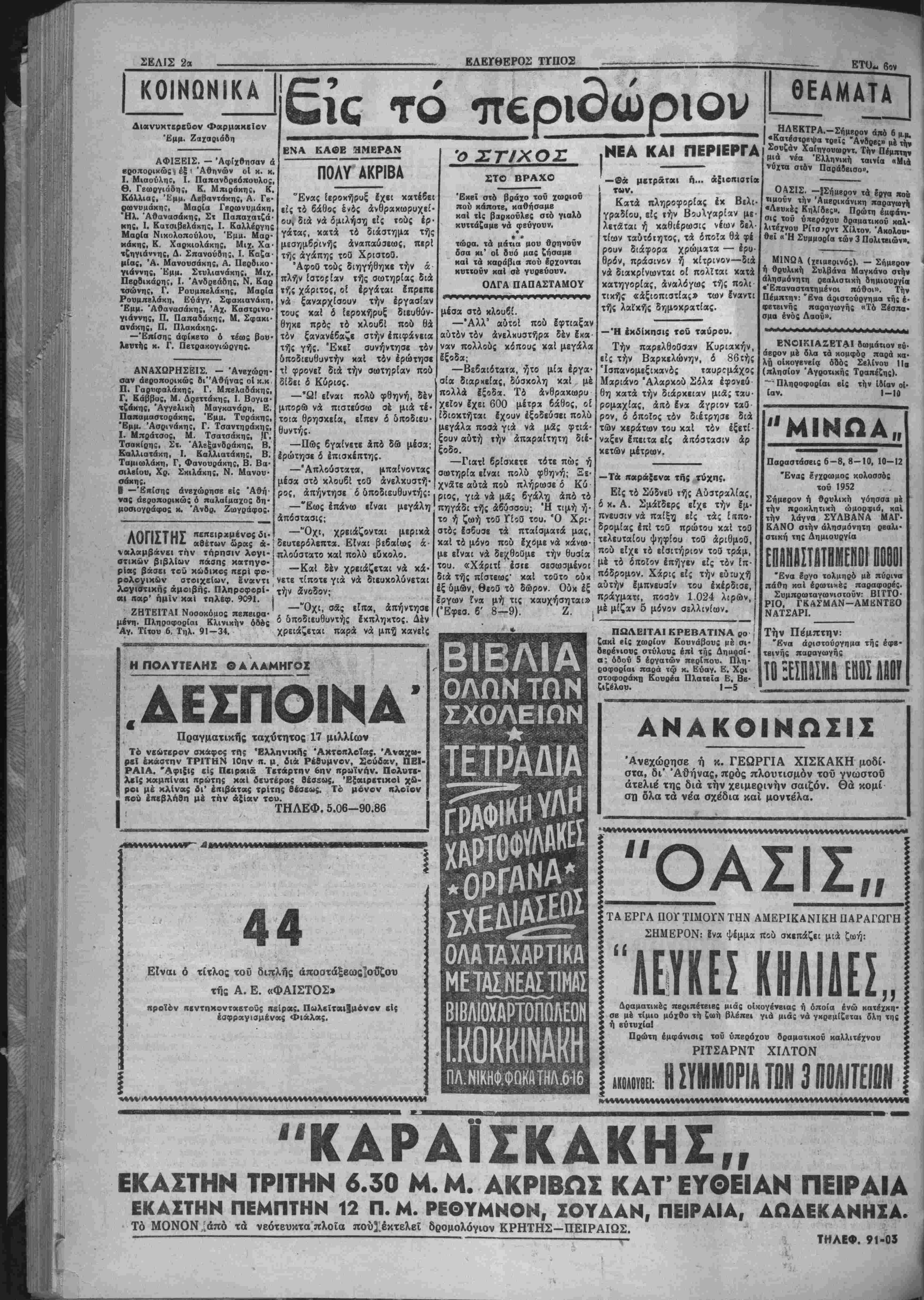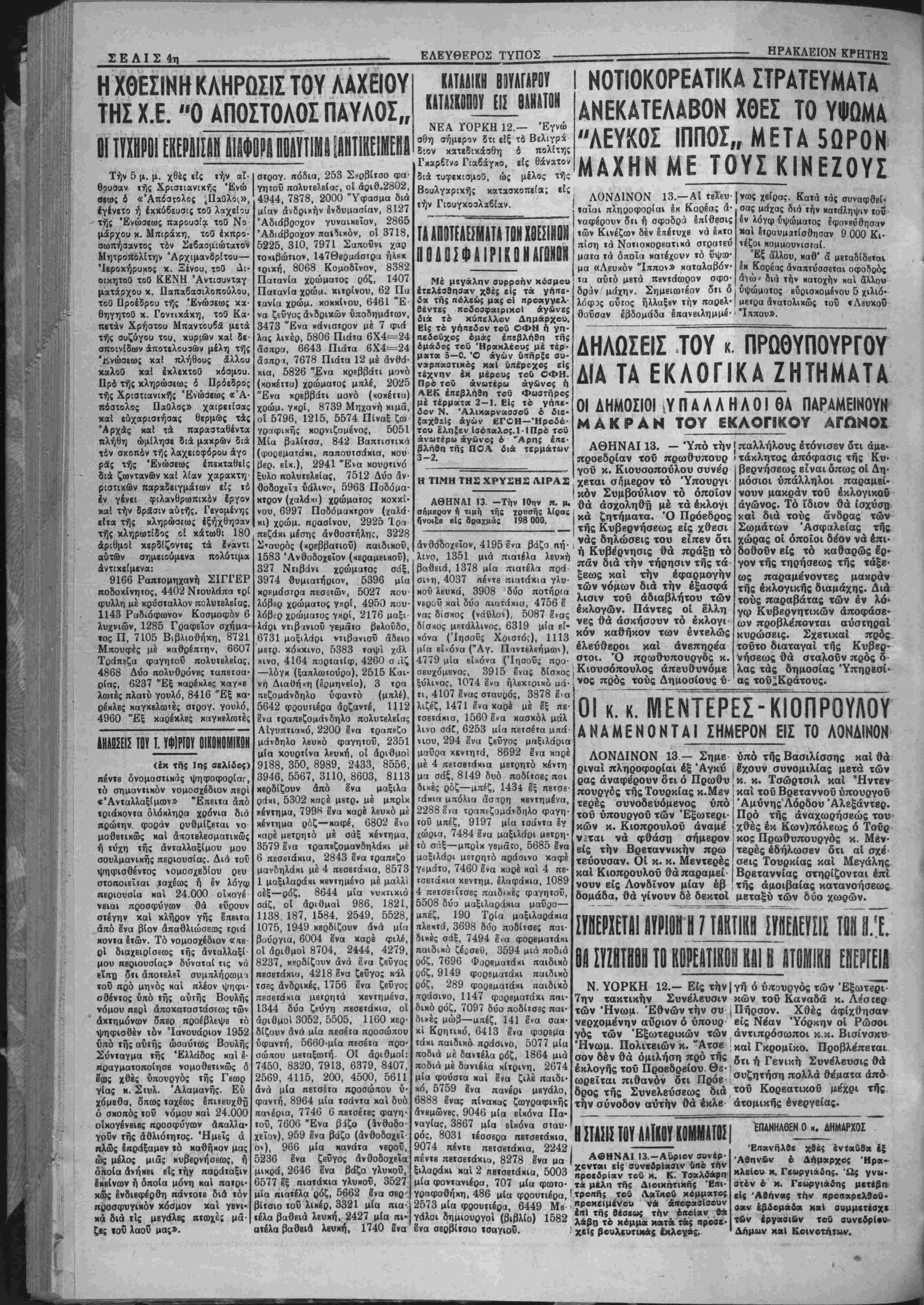<5α της πόλεώς μας οί προαγνϊλ- θβντες ποδοσφαιρικοΐ άγώνϊς διά τβ κύιτελλον Δημάρχου. Είς τό γήιτκδον τοΰ ΟΦΗ ή γη· πβδοΰχος υμάς επεβλήθη τής ομάδος χον Ήρακλέου; μέ τϊρ· ματα 5—0. Ό αγών υπήρξε συ- ναρπαβτικός καί ϋπϊροχο; είς τέχνην έκ μέρους τοϋ ΟΦΗ. Πρό τοΰ ανωτέρω αγώνος ή ΑΕΚ επεβλήθη τοϋ Φωστήρος μέ τέρματα 2—1. Είς τό γήιτε- δον Ν. 'Αλικαρνασσοΰ έ διο ξαχθΣΐς αγών ΕΓΟΗ—Ήροδό· τού έληξεν 1σόταλο;.1ΙΠρό τοΰ ανωτέρω άγωνο; έ Άρης επε¬ βλήθη τής ΠΟΑ διά τερμάτων 3-2. Η ΤΙΜΗ ΤΗΣ ΧΡΥΣΗΣ ΛΙΡΑΪ ΝΟΤΙΟΚΟΡΕΑΤΙΚΑ ΣΤΡΑΤΕΥΜΑΤΑ ΑΝΕΚΑΤΕΛΑΒΟΝ ΧΘΕΣ ΤΟ ΥΦΟΜΑ "ΛΕΥΧΟΣ ΙΠΠΟΣ,, ΜΕΤΑ 5ΟΡΟΝ ΜΑΧΗΝ ΜΕ ΤΟΥΣ ΚΙΝΕΖΟΥΣ ΛΟΝΔΙΝΟΝ 13.—Αί τελευ ΐαΐαι πληροφορίαι Ικ Κορέας ά· ναφέρουν δτι τ) σφοδρά επίθεσις των Κινέζων δεν επέτυχε νά Ιχτο πϊση τα Νοτιοχορεατικά στραΐεύ ματα τα όποϊα κατέχουν τό ϋψοο· μα «Λευκόν "Ιππον» καταλαβόν· τα αύτό μετά πβντάωρον σφο· δραν μάχην. Σημβιωτέον δτι δ λόαος ούτος ήλλαξβν ιήν παρελ¬ θούσαν έβδομάδα έπανειλημμέ νως χείρας. Κατά τάς συναφθβί· σας μάχας διά την κατάληψιν τον έν λόγω δψώματος έφονβύθησην χαί δτραυμοτίσθησαν 9 000 Κι- *έζοι κομμουνισταί. Έξ αλλου, καθ* ά μεταδίδβται βκ Κοςέας άναΐκύσσΒΤαι οφοδρός άγώ' διά την κατοχήν και δλλου ύψώματος βΰοισκομένον 5 χιλιό· μβτρα ανατολικώς τοΰ «Λβυχοϋ "Ιππου». ΑΘΗΝΑΙ 13. -Την Ιθην π. μ. σήμερον ή τιμή τής χρυσής λίρας ήνοιξε είς δραχμάς 198 000. άνθο'δοχβΐον, 4195 Ινα βάζο πή· λινο, 1351 μιά πιαιέλα λευχή βαθειά, 1378 μία πιαιέλα πρά- σινη, 4037 πέντβ πιατάκια γλυ- κου λευκά, 3908 δύο ποτηοΐα νεροΰ καί δύο πιατάχια, 4756 Ι νας δίσκος (νάϋλον), 5087 Ινας δίσχος μετάλλινος, 6319 μία εί- χόνα (Ιησούς Χοιστό;), 1113 μία βί«όνα ("Αγ. Παντελεήμων), 4779 μία βίχόνα (Ίησοΰς προ- σβυχόμβνος, 3915 ενας δίσχος ξύλινος, 1074 ενα ήλβκτοιχό αά τι, 4107 ενας σταύρος, 3878 ε-α λιζέζ, 1471 Ινα χαρέ μέ Ιξ πε τσβτάκια, 1560 Ινα κασχόλ μάλ λινο αάί, 6253 μία πβτσέτα μιτά νιου, 294 Ινα ζεΰγος μαξιλάρια μαΰρα κεντητά, 8692 Ινα καρέ μέ 4 πετσβκΐχια μετρητό κέντη μα σάξ, 8149 δυό ποδίτσες παι διχές ρόζ—μπέζ, 1434 εξ πετσβ· τάκια μπόλια άστρη κβντημένα, 2288 ενα τοαπεζομάνδηλο φαγη· τοΰ μπέζ, 9197 μία τσάντα έγ χωρία, 7484 Ινα μαξιλάοι μβτρη· τό σάξ—μπρικ νβματο, 5685 Ινα μαξιλάρι μετρητό αοάσινο καφέ Υέμάτο, 7460 Ινα καρέ καί 4 πε- ισετάχια κβντημ. έλαφάκια, 1089 4 πβτσΒΐίτσες παιδεχές φαγητοΰ, 5508 δύο μαξιλαράκια μαΰρο— μπέζ, 190 Τρία μαξιλαράχια πλεχτά, 3698 δύο ποδίτσδς παι· δικβς σάξ, 7494 Ινα φορβματάκι παιδικό ζέβσεϋ, 3594 μιά ποδιά ρόζ, 7696 Φορβματάκι παιδικό ρόζ, 9149 φορβμαΐάχι παιδιχό ρόζ, 289 φορβματάχι παιδικό πράσινο, 1147 φορβματάχι παι· δικο ρόζ. 7097 δύο ποδίισες παι· διχές μώβ—απέζ, 141 Ινα σαΗ· χί Κρητιχό, 6413 Ινα φορεμα τάχι παιδικό πράσινο, 5077 μία ποδιά μέ δαντέλα ρόζ, 1864 μιά ποδιά μέ δανιέλα κίτρινη, 2674 μία φούστα καί Ινα ζιλέ «αιδι· κό, 5759 Ινα πανέρι μβγάλο, 6888 Ινας πίνακας ζωγραφικής άνβμώνβς, 9046 μία βΐκόνα Πα· ν(1γία^ι 3867 μία είκόνα σΐαυ· θός, 8031 τέσσβρα πβτσετάκια, 9074 πέντε πβισβτάκια, 22421 πέντβ πβΐσΒΐάκΐο, 8278 Ινα μα | ξιλαράκι χαί 2 ηβτσβτάκια, 5003 μίαφοντανιέοα, 707 μία φωτο- γραφοθηκη, 486 μία φρουτιέρα,! 2573 μία φοουιιβρα, 6449 Μβ- Υάλοι δημιουργοί (βιβλίο) 1582 ενα σβρβίτσιο ισαγιοϋ. ! ΔΗΛΩΣΕΙΣ ΤΟΥ κ. ΠΡΟΘΥΠΟΥΡΓΟΥ ΔΙΑ ΤΑ ΕΚΛΟΓΙΚΑ ΖΗΤΗΜΑΤΑ ΟΙ ΑΗΜΟΣΙΟΙ ιΥΠΑΑΑΗΛΟΙθΑ ΠΑΡΑΜΕΙΝΟΥΚ ΜΑΚΡΑΝ ΤΟΥ ΕΚΛΟΠΚΟΥ ΑΓΩΝΟΧ ΑΘΗΝΑΙ 13. — "Υπό την ] παλλήλους ετόνισεν ότι άμε· προεδρίαν τοΰ πρωθυπουρ ' τάκλητος απόφασις τής Κυ· γοΰ κ. Κιουσοπούλου συνε'ρ βερνήσεως είναι όπως οί Δη· χεται σημερον τό Ύπουργι μόσιοι ύπάλληλοι παραμβΐ· κόν Συ