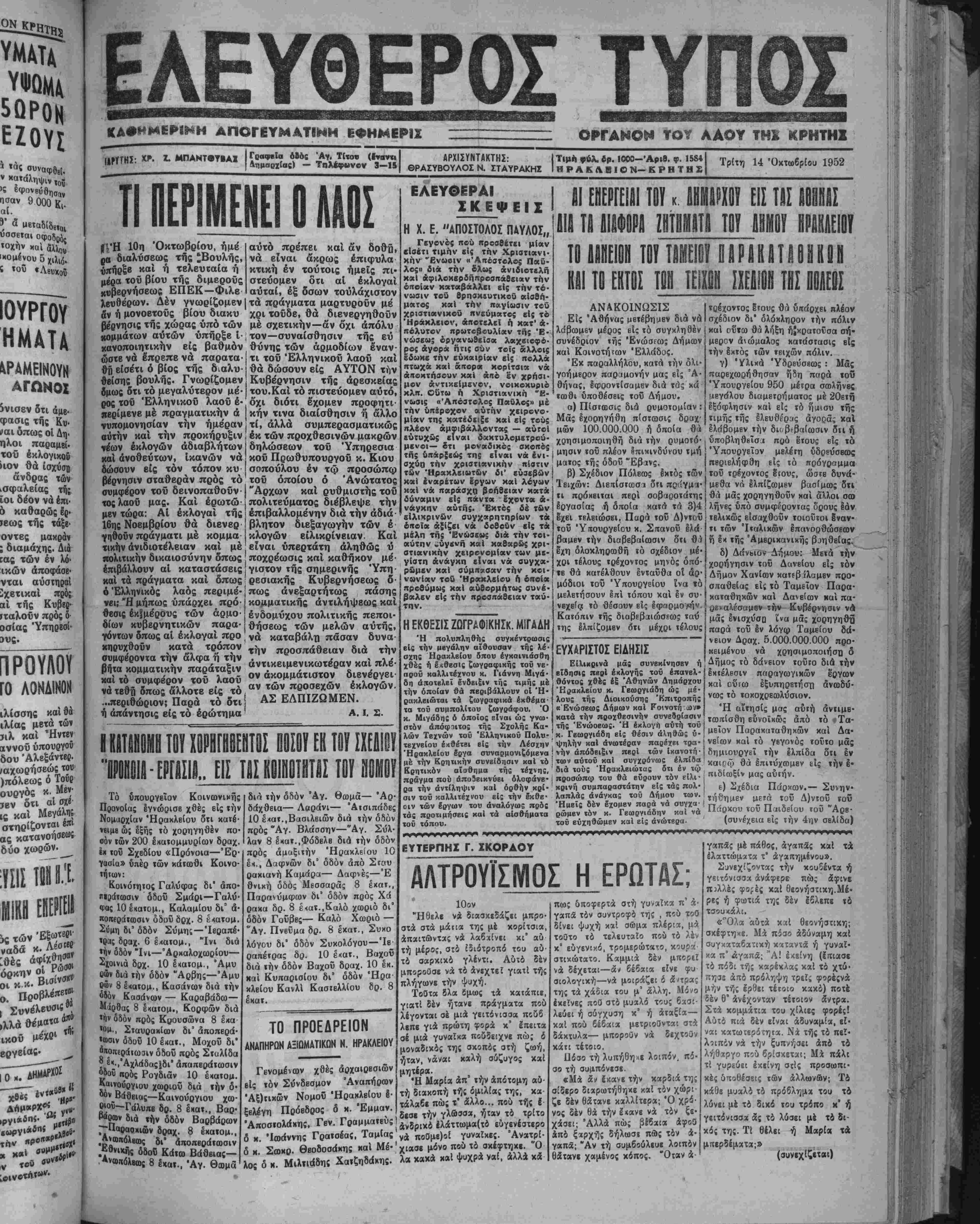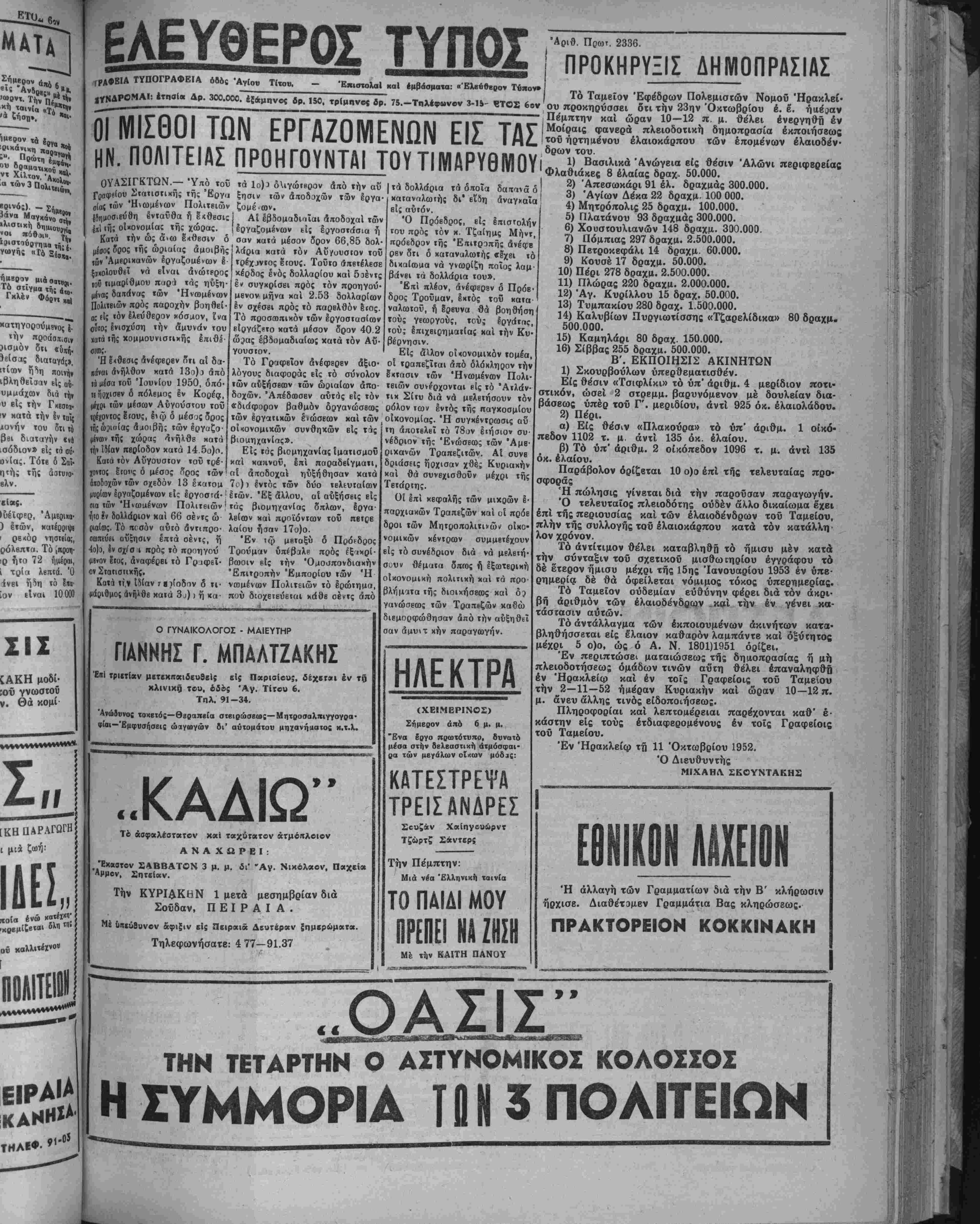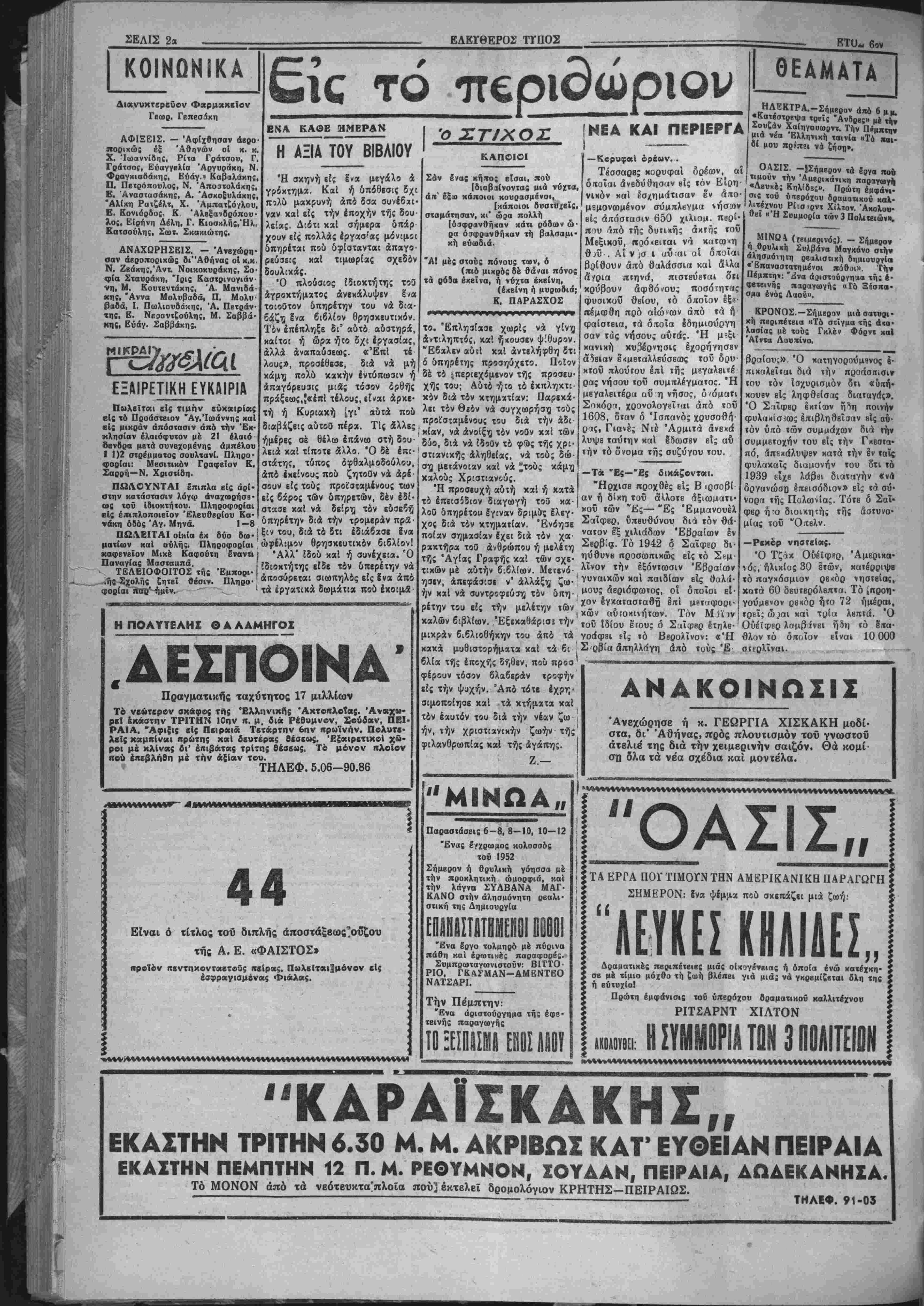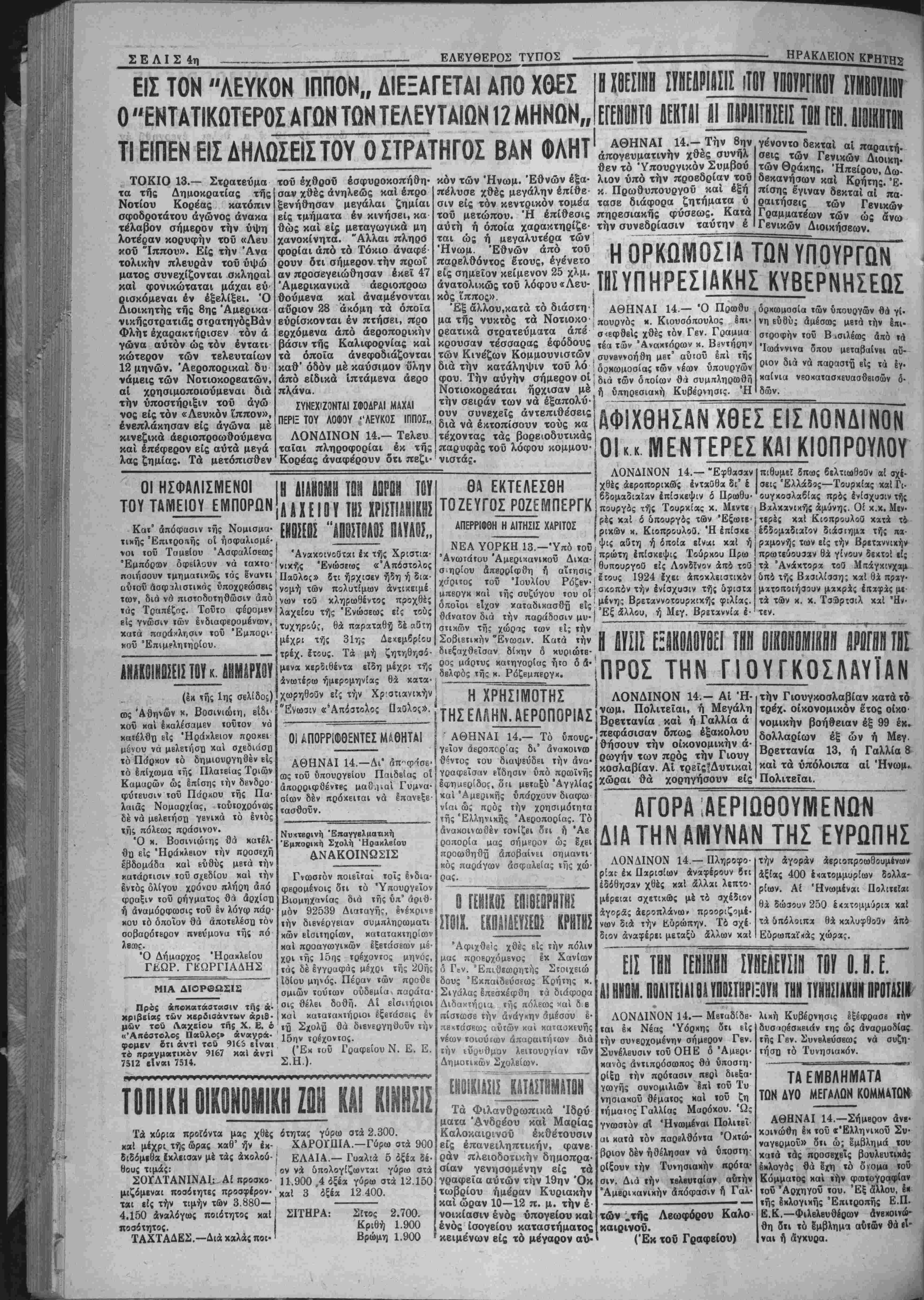 όρκωμοσία των ύπουργών θ<ϋ γί· νη ευθύς άμέσως μετά την §π.ι- σιροφήν τοΰ ΒΛσιλέως άπό τδ Ίωάννινα δπου μεταβαΐνει αυ¬ ριον διά νά παρασιη βΐς τα |γ. καίνια νΒοκατασχΕυασθβισών δ· δών. ΟΙ ΗΣΦΑΛΙΣΜΕΝΟΙ Η ΔΙΑΝΟΜΗ ΤΩΝ ΔΩΡΟΝ ΤΟΪ ΤΟΥ ΤΑΜΕΙΟΥ_Γ:ΜΠΟΡΩΝ ΑΑΧΕΙΟΥ ΤΗΣ αΡΙΣΪΙΑΝΙΚΗΣ ΕΝΩΣΕΩΣ "ΑΠΟΣΤΟΛΟΣ ΠΑΥΛ8.,, Κατ' απόφασιν ιής Νομισμα· τιχής Έπιτροηή; οί ήσφαλισμέ· νοι τοϋ Ταμείου Άσφαλίσεως 'Εμπόρων όφ&ίλουν νά τακτο- Ανακοινούται εκ τής Χριστία- . νίκης "Ενώσεως «Απόστολος ποιήσουν τμηματιχώί τάς έναντι' Παθλος» 5τι ήρχισεν ή"5η ή δια- αύιοΰ άσφ^λισΐικάς ύποχρεώσεις νομή των πολυτΕμων άντικειμέ των, διά νά πισΐοδοτηθώσιν άπό νων ιο0 χληρωθέντος προχθές τάς Τραπέζης. Τουτο φέρομεν χαχε£Οϋ τη·ς Ενώσεως εί; τού; είς γνώσιν των ενδιαφερομένων, κατά παράκλησιν τοΰ Έμπορι- χοΰ Έπιμρληΐηρίου. ΑΗΑΚΟΙΝΟΣΕΙΣ ΤΟΥ κ (εκ *ης 1ης σβλίδος) ως Αθηνών κ. Βοσινιώιη, εί6ι· κου καί εκαλέσαμεν τούτον νά κατέλθη είς Ηράκλειον προκει μένου να μελετήση χαί σχεδιάσΐ) τό Πάρκον τό δημιουργηθέν είς τό επίχωμα τής Πλαιείας Τριών Καμάρων ώ; Ιπίσης την δενδρο φύτευσιν τοϋ Πάρκου τή; Πα¬ λαιάς Νομαρχίας, τούιοχρόνως δέ νά μελετήση γβνικά τό ένιός τή; πόλεως πράσινον. Ό κ. Βοσινιώτης θά κατέλ- θϋ είς "Ηράκλειον την προσέχη εβδομάδα καί ευθύς μετά την κατάρτισιν τοΰ σχεδίου καί την εντός όλίγου χρόνου πλήρη άπό φραξιν τοΰ ρήγματος θά άρχίσγι ή άναμόρφωσις τοΰ εν λόγψ πάρ¬ κου τό οποίον θά αποτελέση τόν σοβαρότερον πνεύμονα τής πό λεως. "Ο Δήμαρχος "Ηρακλείου ΓϋΩΡ. ΓΕΩΡΓΙΑΔΗΣ ΜΙΑ ΔΙΟΡΟΩΣΙΕ Πρός αίτοκατάστασιν της α¬ κριβείας των κερδισάντων αριθ¬ μών τοΰ Λαχείου της Χ. Ε. ο «Απόστολος Παΰλβς» άναγρά- φομεν δτι αντ! τοϋ 91Ο είναι το πρ«γμ«τικόν 9167 καί άντΐ 7512 είναι 7514. Θά παραταθή δέ αθτη μέχρι τής 31ης Δεκεμβριού τρέχ. Ιτους. Τα μή ζητηθηοό- μενά κερδιθέντα ειδή μέχρι τής ανωτέρω ήμερομηνίας θά κατα- χωρηθοθν είς την Χρ'σΐιανικήν^ "Ενωσιν «Απόστολος Παθλος*. | 01 ΑΠΟΡΡίΦΘΕΝΤΕΣ ΜΑΘΗΤΑΙ ΘΑ ΕΚΤΕΛΕΣΘΗ ΤΟΖΕΥΓΟΣΡΟΖΕΜΠΕΡΓΚ ΑΠΕΡΡΙΦΘΗ Η ΑΙΤΗΣΙΣ ΧΑΡΙΤΟΣ ΑΦΙΧΘΗΣΑΝ ΧΘΕΣ ΕΙΣ ΛΟΝΔΙΝΟΝ ΟΙκκ ΜΕΝΤΕΡΕΣΚΑΙΚΙΟΠΡΟΥΛΟΥ ΛΟΝΔΙΝΟΝ 14.—"Εφθασαν χθές άεροπορικως ενταύθα δι3 έ βδομαδιαίαν επίσκεψιν δ Πρωθυ- πουργός τής Τουρκία; κ. Μεντε ρές καί δ 5πουργός των Εξωτε¬ ρικών κ. Κιοπρουλοϋ. Ή έπίσκε ψις αυτή ή όποία είναι καί ή | πρώτη επίσκεψις Τούρχου Πρω Ι θυπουργοθ είς Λονδίνον άπό τοθ ίτους 1924 ίχει αποκλειστικόν | σκοπόν την ενίσχυσιν τή; δφισΐα . μένη; Βρεταννοτουρκιχής φιλίας. ι Έξ ίλλου, ή Μεγ. Βρϊταννία έ- ΝΕΑ ΥΟΡΚΗ 13.—"Υπό τοΰ Ανωτάτου Άμεριχανικοΰ Δικα¬ στήριον απερρίφθη ή αίτησις χάριτος τού Ιουλίου Ρόζεν- μπεργκ καί τής συζύγου τού οί ό/τοΐοι ΒΪχον ναταδικασθΉ είς θάνατον διά την παράδοσιν μυ· στικών τής χώρας των είς την Σοβιετικήν "Ενωσιν. Κατά την διεξαχθεϊσαν δίκην δ κυριώτε- Κ?,ΐ.Τ^,,?ίίΠΡ0Σ ΤΗΝ ΓΙΟΥΓΚΟΣΛΑΥΙΑ!, πιθαμεί βπως βελτιωθοθν αί οχί· σεις Έλλάδίς—Τουρκίας καί Γι- ουγκοαλαβίας πρός ενίσχυσιν τί)ς ι Βαλκανικής αμύνης. Οί κ.κ. Μέν· Ιτερέ; και ΚιοπρουλοΟ κατά τό έβδομαδιαΐον διάσΐημα τή; π«· ραμονής των είς την Βρεταννιχήν πρωτεύουσαν θά γίνουν δεχτοΐ εί; τα Άνάκτορα τοθ Μπάγκίνχαμ 6πό τή; Βχσιλίαση; καί θά πρχγ- ματοποιήβουν μακράς έΐχαφάς με- τά των κ. κ. Τσδρταιλ καί *Ην· τεν. ΔϊίΙΣ Ε5αΚ0Α0Υ0£Ι ΤΗΝ ΟΙΚΟΗ0ΙΗΙΙΙΙΙ!Ι ΑΘΗΝΑΙ 14.—Δι" άΐτ-φ'ί ως τοΰ ύπουργΒΪου Παιδείας οί άποροιφθέντες μαΰ.μαί Γυμνα σίων δέν πρόκειται νά έπανεξε τασθοΰν. Νυκτερινή 'Ξπαγγελματική Έμχορική Σχολή Ηρακλείου ΑΝΑΚΟΙΝΩΣΙΣ Γνωστόν ποιείται τοί