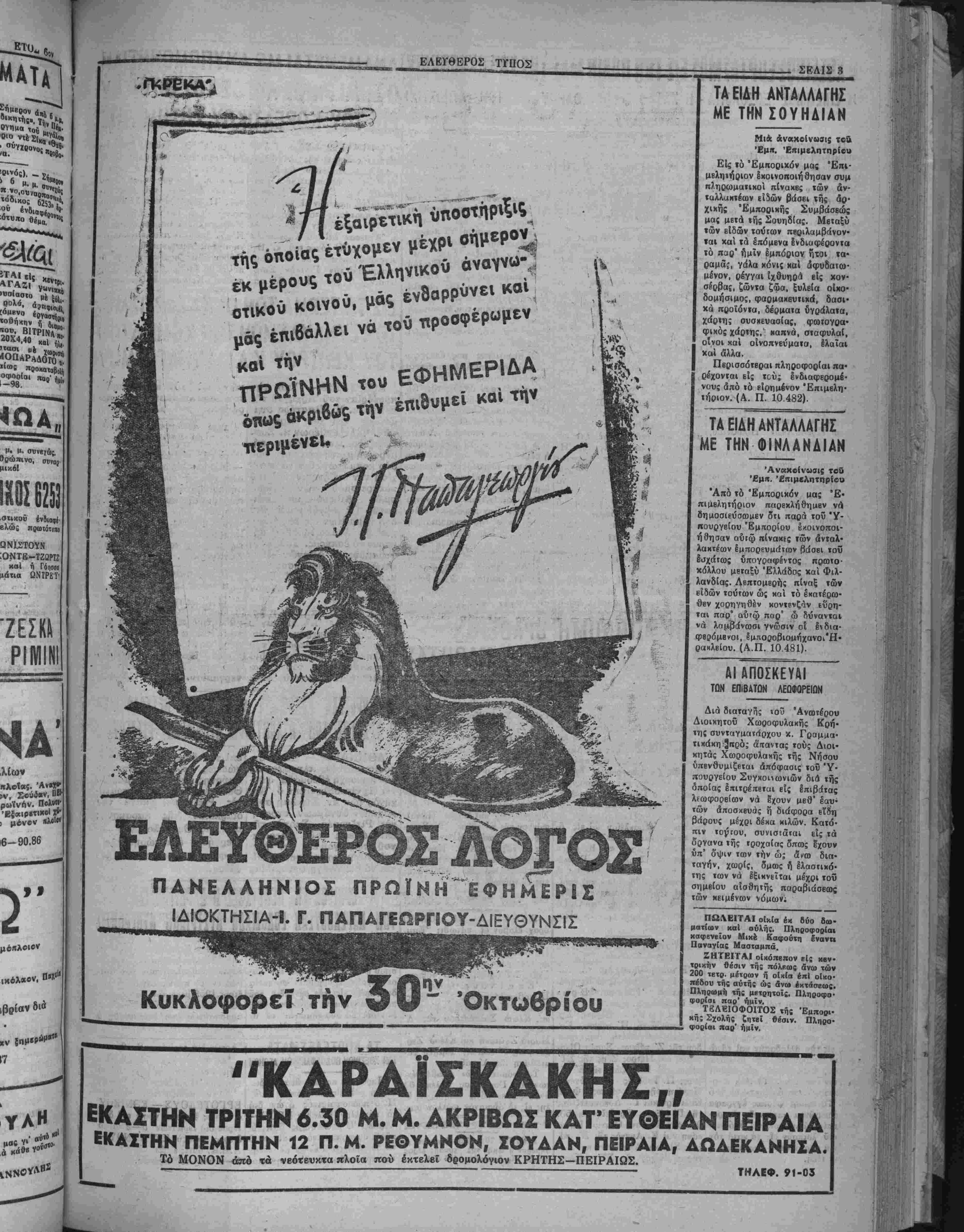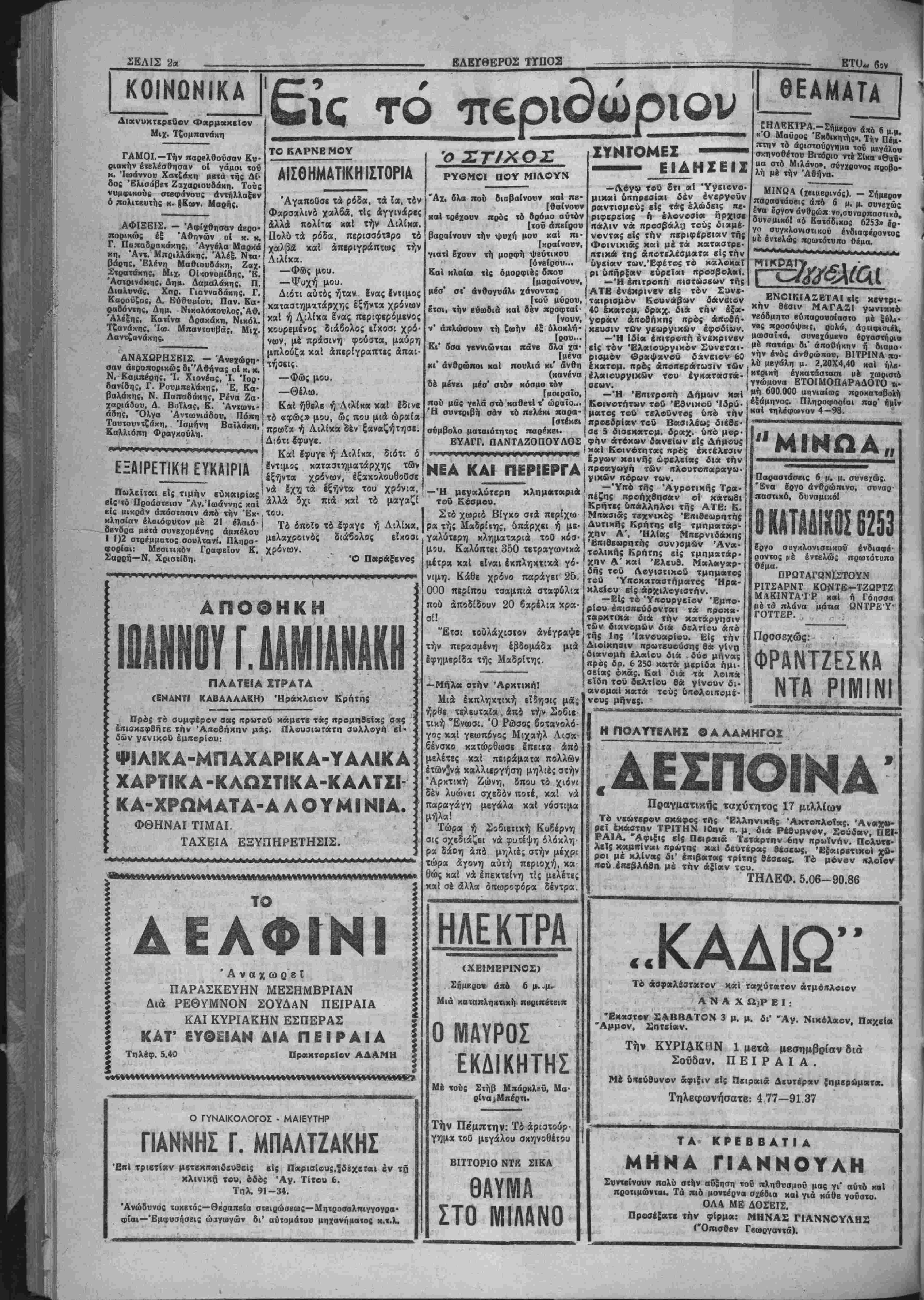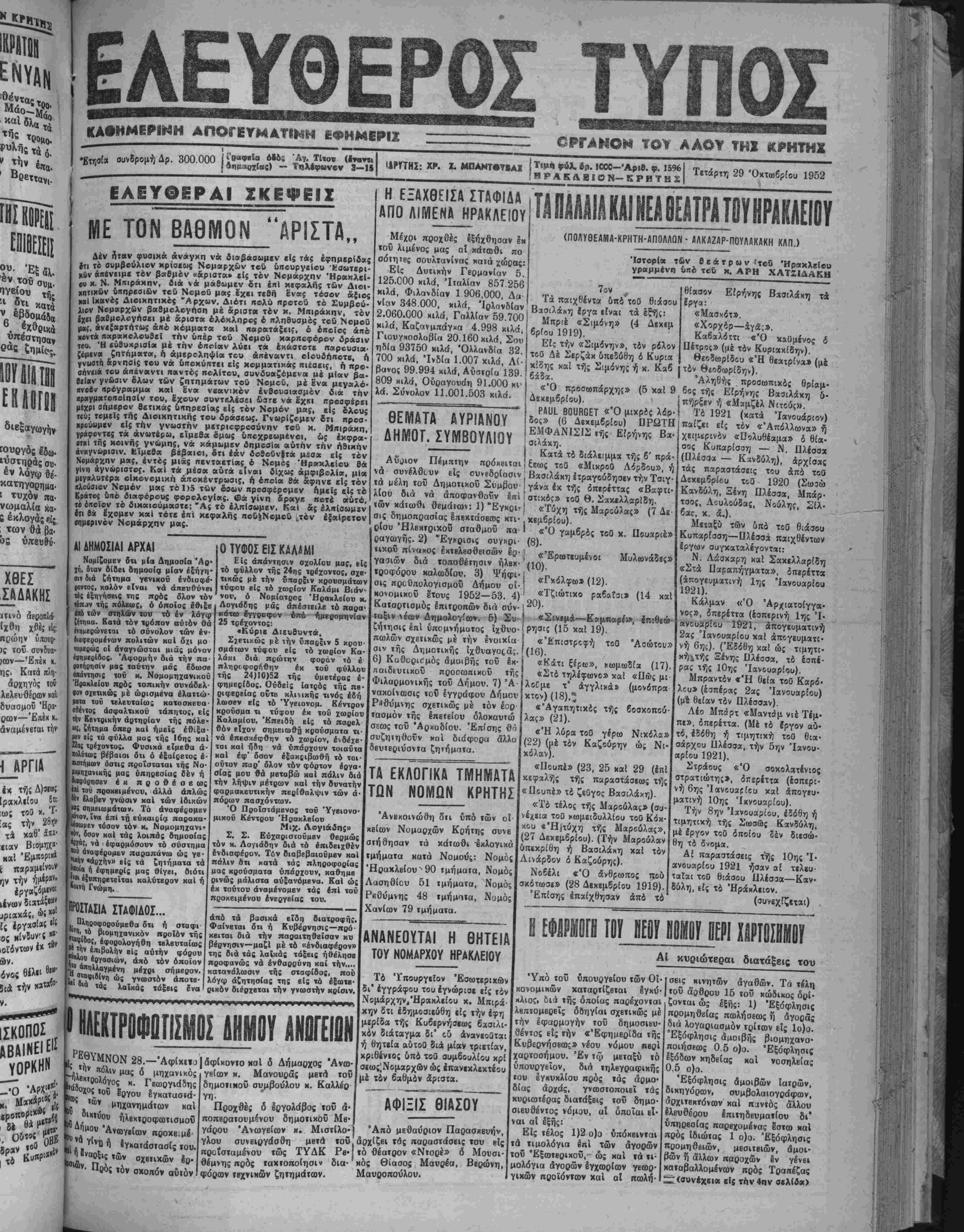 όνος 8ίλι< ΕΛΕΥΟΕΡΟΣ ΤΥΠΟΣ ΚΑ·ΗΜΙΡΙΝΗ ΑΠΟΓΕΥΜΑΤΙΝΗ ΕΦΗΜΕΡΙΣ ΟΡΓΑΝΟΝ ΤΟΥ ΑΑΟΥ ΤΗΙ ΚΡΗΤΗΖ 1η* οανδρομήΔρ. 300.000 Ι1ΡΥΤΗΣ: ». _ *ΠΑΝΤ·Τ·ΑΙ |^**·**}™Γ'*'*·*** Τετάρτη 29 Όχτωβρίου 1952 . Ε* γ Λ Κ. ί 15 Ι Ο Ν—— Κ Ρ Η Γ π Λ ΙΣΚΟΠΟ ΑΒΑΙΝΕΙΗΙΣ ΥΟΡΚΗΝ ΕΑΕΥΟΕΡΑΙ ΙΚΕΨΕΙΣ ΜΕ ΤΟΝ ΒΑΘΜΟΝ "ΑΡΙΣΤΑ,, Δέν ήταν φυσικά κνάγχη νά διοβάσωμίν είς τάς εφημερίδας ίτι τβ συμβούλιον κρίσεως Νομαρχών τοΰ ύπουργβίου 'Κααιτερι- ,ιίν άπε,νειμί τόν βαθμόν "αρίστα» «Ις τόν Νομάρχην Ήρακλεί- «ν κ. Ν. Νηιράκην, διά νά μάθωμεν 8τι έκ) κεφαλής των Διοι¬ κητικόν ύηηρεσιών τοΰ Νομοΰ μας ίχβι τεθή ενα$ τόσον &{ιος χ«Ι Ικκνό; Διοικητικώς "Αρχων. Διότι «ολύ προτοΰ τό Συμβού¬ λιον Νομαρχων βαθμολβγηση μέ αρίστα τόν κ. Μπιράκην, τόν ίχει βαβμβλβνήσβι μέ αρίστα όλοχληρος έ ηληθυσμός τοΰ Νομοϋ μα;, ανεξαρτήτως άιτο κομματα μκΙ (ταρατάξϊΚ, έ οποίος άπό κάντα παρηκολούθει την υπέρ τού Νομοΰ καρηοφόρβν δράσιν ΐου. Ή «ΰθυχριοίβ μέ την οποίαν λύει τα εκάστοτε παρουσιά¬ σωμεν* ζπτήματα, η άμεροληφία τού άπβναντι οιουδήποτε, ή γνοιβτή άρνησις τού νά ύκοκυπτβι εί; χομματΐΗάς πιέαεΐ{, ή προ- οηνίΐά τού άπάναντι π«ντέ<; πολίτου, συνίυαζέμενα ι»β μίαν βα- Βΐίαν γνήαιν δλων των ζπτημάτων τοΰ Νομοΰ, μέ ενα μεγ^λο· κνβίν «ρόγραμμα καΙ ένα νβανικόν ενθουσιασμόν διά την ιτρκγμκτοποίηβίν τού, ϊχουν συντκλέσίΐ ωατβ νά έχβι προοφίρει μιχβι οήμερον θετικας ΰπηρεσίοις είς τόν Νομόν μας, είς ολους κύ; τεμϊϊ; τής Διοικητικη; τού δράσεώς. Γνωρίζομεν διι πρβο- κριύωμίν εί; την γνωστήν μβτριοφροσύνην τοθ μ. Μπιράκη, γροΐφοντβς τα ανωτέρω, είμεθα £μως ύποχρβωμβνοι, ώς έκφρα- βτ«1 τής κβινήί γνώμης, νά κάμοαμκν ίημοσία αύτην την ηθικήν «νοιγνωρισιν. ΕϊμεΘα βεβαιοί, δτι εάν δοθοΰν|τά μεσα εί; τόν Νομάρχην μαί, έντός μιάς πίντοετίας έ Νβμός 'Ηροτχλείβυ θά γίνη αγνώριστος. Καί τα μέσα αϋτά είναι δίχω; άμφΐββλι», μΐα μΐναλυτερα οΐκονομικη άποκέντρναις, ή όποία θά αφηνε εί; τόν πλούσιον Νομόν μα{ τό1)5 των δσων προσφερομεν ημείς αίς τό Κράτβς υπό διαφόρους φορολογίας. ©ά γίνη δραγκ ποτέ αΰτό, ιβ έιτοϊον τό ίικαιούμαστ«; "Ας τό ελπίσωμεν. Καϊ άς έλπίθωμΐν ί:ι βά Εχομεν καί τότβ έιχϊ κεφαλής πο&ΪΝβμου 6τόν εξαίρετον σημερινόν Νομάρχην μας. Η ΕΞΑΧΘΕΙΣΑ ΣΤΑΦΙΔΑ ΑΠΟ ΛΙΜΕΝΑ ΗΡΑΚΛΕΙΟΥ ΑΙ ΑΗΜΟΣΙΑΙ ΑΡΧΑΙ Νομίζομεν διι μία Δημοσία Άρ' ΐή, οταν δίδει δημοσίο μίαν έξήγη- βι» δια (ήττιμα γβνικοΰ ένδιαφέ· {όντος, καλόν είναι νά άπβνβύνει τας έξηντίσβις της πρός όλον τόν «ϊυν τής ηόλεως, ό οποίος έθιξβ Μ των στήλην τού τό έν λόγω (ήτηαα. Κατά τόν τρόπον αυτόν θά ϊιημεοώνεται τό σύνολον των έν· (ιαφερομένων πολιτών καΙ άχι μο νυμεοώς οί αναγνώσται μιάς μόνον εφημερίδος. Αφορμήν διά την πά- ραιήοησίν μας ταύτην μάς εδωσβ οχάντησις τού κ. Νομομηχανικού Ήβαχλείου πρός τοπικήν συνάδελ- ΐον σχΕτικώς μ έ ωρισμένα έλαΐιώ- εοιο τοϋ ΤΒλευταίως κατασκενα- σβέντος άσφαλτιχοΰ τάπητος, είς <ήν Κβντοικήν άρτηρίαν τής πόλε- Ι!, ϊήτημα όπερ καί ημείς έθιξα- μΐν είς τα φύλλα μας τής 16ης καϊ 22ας ΤΒέχσντο:. Φυσικά είμεθα ά χολΰτως βεβαιοί ότι ό έΕαίςετος έ «ισΐήμων όστι: προΐσταται ττ)£ Νο ίομηχονιχής μας υπηρεσίας δέν ή λν έκ προθέσεως ταυ προχειμένου, άλλά απλώς έλαβεν γνώσιν καί των Ιδικών ΗΕ οηκειωμάιων. Τό αναφέρομεν όν, ίνα έηί τη εύκαΐβία παρακα εν τόσον τόν κ. Νομομηχανι· Ί ίσον καί τάς λοιπάς δημοσίας :«ίΐάς, νά έφαρμόσουν τό σύστημα «ού άναφέρομβν παραπιίνω ώς γε »ιφ «αρχήν» είς τα ζηιτιματα χά Ι'οία ή εφημερίς μας Θίγει, διότι ίιοι έξΐπηρετεϊται καλύτερον χαΐ ή 'οινη Γνώμη. ΠΡΟΣΤΑΣΙ