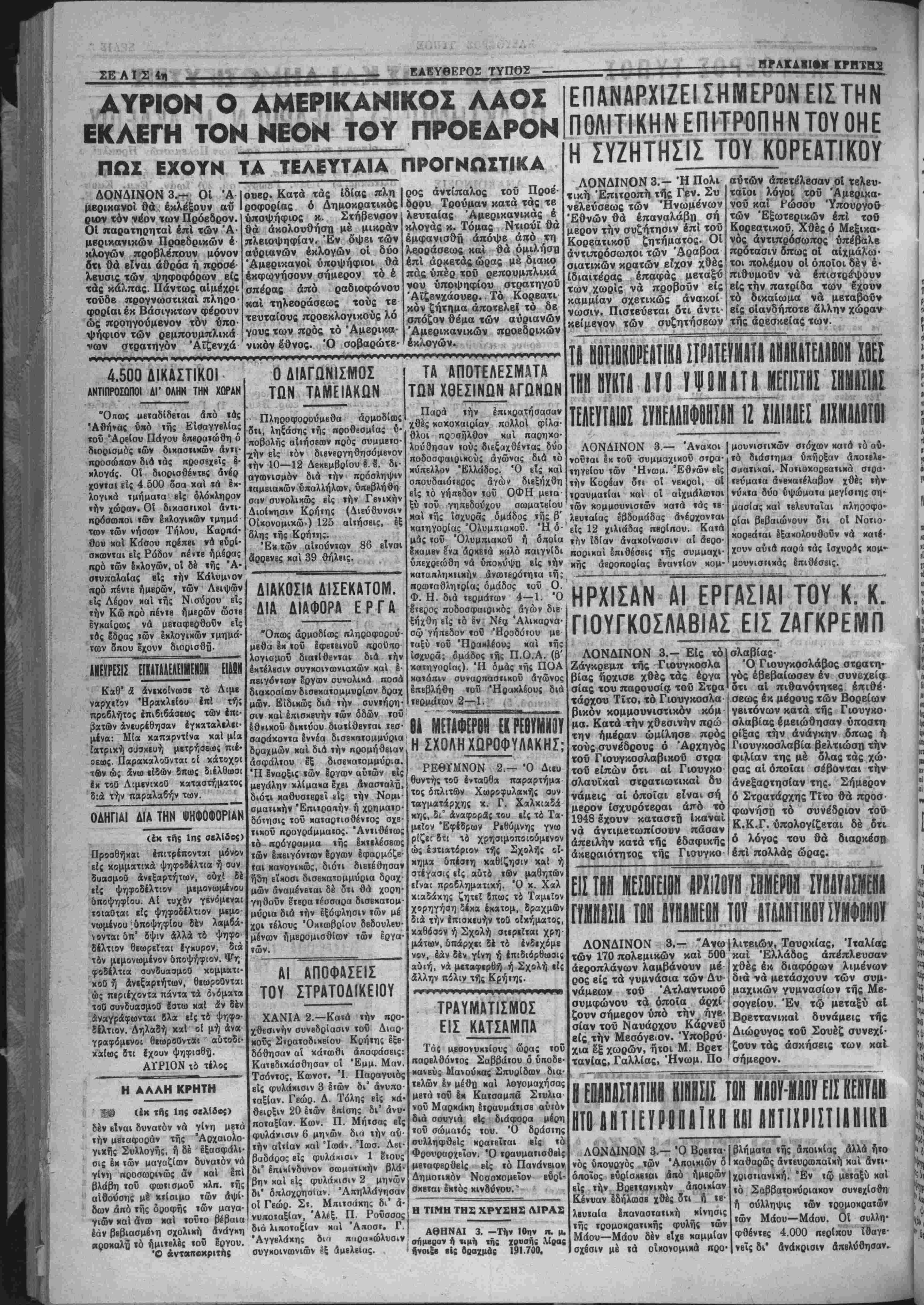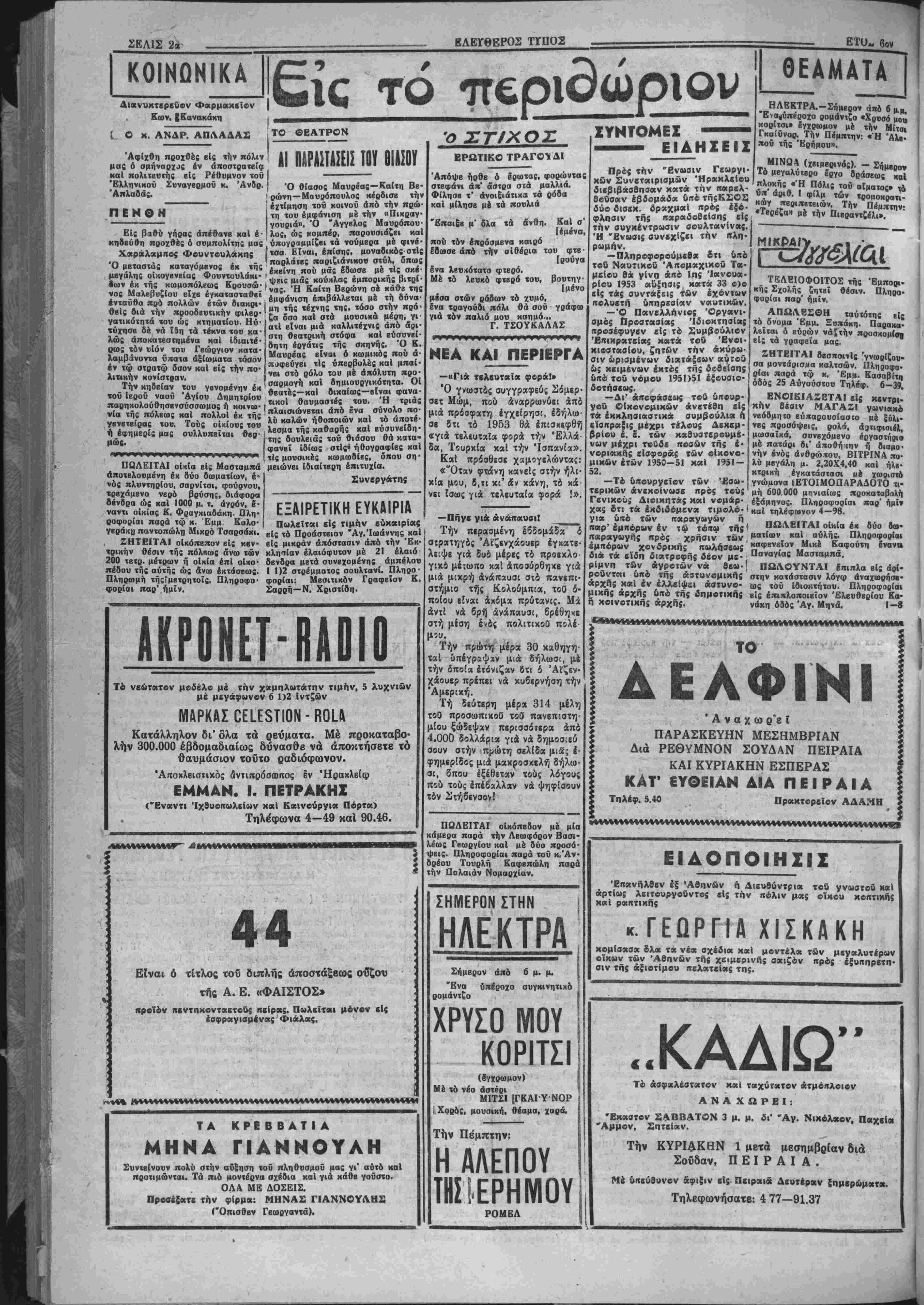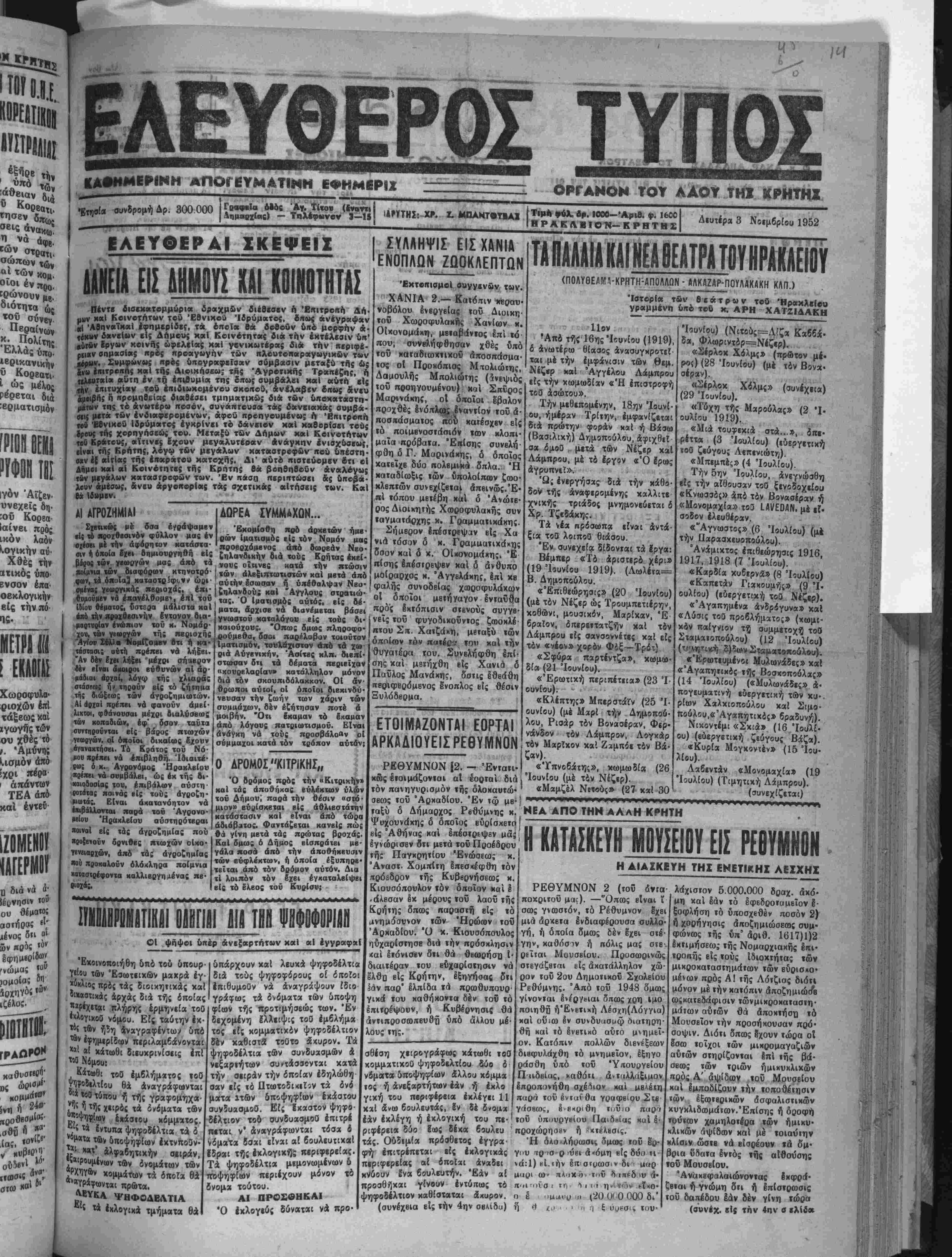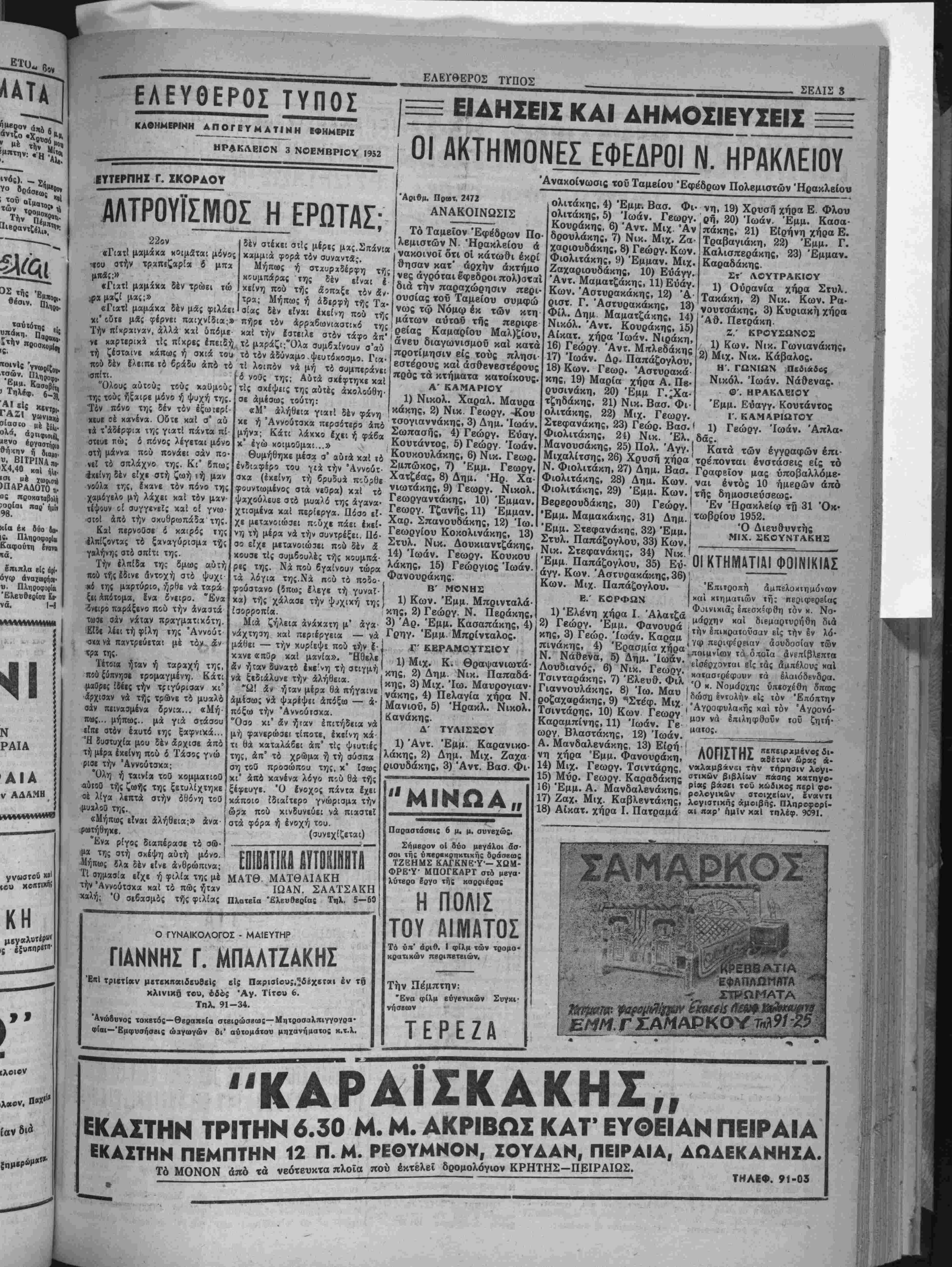 <ών επιτυχίαν τοϋ έπιίιωκομένβο σκοιτοΰ, άνίλαβϊν δπως ανευ ΐμειβήί η προμηθείοτς διαθέσει τμπματικώ; διά των ΰποκαταστη- ααΤΜν της τό ανωτέρω ποσόν, συνάπτουοα τάς δανειβικάς συμβα- βΐΐ( μετά των ενδιαφερομένων, άφοϋ προηγουμένας ή Έπιτροπή ίβυ 'βθνικοΰ Ιίρύματο; έγκρίνβι τό δανείον καΐ καθορίσει τού; ίρβ«{ τής χορηγήσεως τού. Μβταξύ των Δήμων καΙ Κοινοτήτων τβϋ Κρατους, αΐτινες εχοον μεγαλυτέραν ανάγκην ένισχθσβως, είναι τή; Κρήτης, λόγω των μεγάλων καταστρβφών πού υπέστη· ο*ν έ{ «ίτίας τή; έι.«ράτου κ«τοχή;. Δι" αΰτό πιστεύομεν ότι βΙ Δήμοι κ«1 αί Κοινότητος τής Κρήτης θά βοηθηβοθν άναλογω; των μεγκλων καταατροφών των. Έν πάση περιπτώσει &ς υπββά- λβυν άμεαως, &νβυ άργοΛβρίας τάς σχετικάς «Ιτήαβις τ«ν. ΚαΙ βα Ιδκμεν. | ΣΥΛΑΗΨΙΣ ΕΙΣ ΧΑΝΙΑ ΕΝΟΠΛΩΝ ΖΩΟΚΛΕΠΤΩΝ ΈκτβηισμοΙ ουγγβνών των. ΧΑΝΙΑ 2.—Κατόπιν «ραυ- νθβόλου Ενεργείας τού Διοικη· τοϋ Χωοοφυλαχης Χανίων κ. Οιχονομάχτ), μεταβάντος επί ιό που, συνελήφθησαν χθές υπό τοϋ χαιαδιωκτικοΰ άπσσπάσμα- οί Ποοχόπισς Μπολιώττκ, ΑΙ αΓΡΟΖΗΜΙΑΙ Σχετικώς μέ δσα έγράψαμβν <1ς το προχθεσινόν φύλλον μας έν οΐέσει μέ την άφόρηιον κατάστα¬ σιν ή όποία βχβι δημιουργηθή είς των γβωργών μας άπό τα βοιμνια των διαφόρων κτηνοτρό· ϊών άλβξ ΔΩΡΕΑ ΣΥΜΜΑΧΟΝ... Έχομίοθη πρό άρχβτών ήμβ· ρών ίματισμός είς τόν Νομόν μας προβρχόμβνος άπό βωρεάν Νεο- Εηλανβικήν διά τοΰς Κρήτας εκεί¬ νον ς οΐτινες κατά την ΤΑ ΠΑΛΑΙΑ ΚΑΙ ΜΕΑ 8ΕΑΤΡΑ ΤΟΥ ΗΡΑΚΑΕΙΡΥ (ΠΟΛΥΘΕΛΓνΤΙ-ΚΡΗΤΗ-ΑΠΟΛΛΩΝ · ΛΛΚΑΖΑΡ-ΠΟΥΛΑΚΑΚΗ ΚΛΠ.) Ιΐον 'Απότής 16ης "Ιβυνίου (1919), ό ανωτέρω θίασος άνασυγχροτεΐ ται μέ την εμφάνισιν των θεμ. "Ιστβρίβι τδν β ε* τρ «ν τοθ Ηρακλείου γρο,μμενπ υπό τοΰ κ. ΑΡΗ ΧΑΤΖΙΔΑΚΗ (Νιτους=Λ'ζα Κα66ί- Μαρινάκης, οί δκοΐοι έβαλον πριχθές §νό/τλθ|£ ,εναντίον τοΰ ά- ποσπάσμαΐος που χαιέσχβν είς τό ποιμβνοστάπιόν των χλοπι μαΐα ποόβατα. 'ΕκΙσης συνελή φάη ό Γ. Μαρινάκης, ό οποίος Χαιεΐχε δύσ κολβμιχα δπλα. Ή καταδίωξις ιών ύπολοίπων ζωο* κλεπιών συνεχίζβιαΐ απβινώς.Ε¬ πί τόπου μετέβη χαί δ Άνώτε- ρος Διοιχητής Χωοοφυλακης συν ιαγματάοχης κ. Γοαμματιχα'χης. Σήμερον επέστρεψεν εί; Χά νιά τόσον ό χ. Γραμαατιχάκης δσον χαί δ χ. Οίκονομάκης. Έ πίσης έπέστρεψβν χαί ό άνθυπο νά έκανέλθομβ', έιτΐ τού ίίίου Οέματος, ΰατϋβα μάλιστα χοΐ άπό την προχθεσινήν έντονον 6ια- μαβτνρΐαν ενώπιον τοΰ κ. Νομάρ¬ χου, των γίωργών τής περιοχής ΆγΙσν Ιίνα 14ομίΐο»βν βτι ή κα¬ τάστασις αύτη πρέπβι νά λήξβι. "Αν δέν εχβι λήξει μέχρι σήμερον <έν είναι άαοιροι βύθυνών αί άρ· [ μά&ιαι άοχαί, λόνφ τής χλιαράί | στάσεως η» τηροϋν είς τό ζήτημα ' τή; διώξεως των άγροζημιωτών. Αί ααχοί πρέπβι νά φανοϋν άμβί- λιχτσι, φθάνουοαι μέχρι διαλύσεως των κοπαδιών, έφ' δσον ταύτα συνωθούνται είς βάροί πτωχών Υΐωργάν. οί όποϊοι δικαίως έχουν άγαναχτήσει. Τό Κσάτος τοΰ Νό¬ μον «ρέηι νά επιβληθή. Ιίιαιτΐ- ίως ό κ. Αγρονόμος Ήραχλβίου πρέπβι νά συμβάλβι, ώς έχ τής δι- «αιο&ασίας τον, έπιβάλων αύσΐη «οτάτας ποινάς εί; τού: άγρο£η· μιωτάς. Είναι ακατανόητον νά έχιβάλλονται παρά τού Άγρονο- Μβίου Ηρακλείου αύστηρότεραι χαιναΐ είς τάς άγροζημίας πού «ίοίίΥοϊν δονιθβς πτωχών οΐκο· Υΐνΐιαοχών, άπό τό; άγροζημίας «ού ηβοκαλοΰν όλόχληρα ποίμνια χαιαστρέφοντα καλλιβργημένας πβ· β'οχάς. τας. Ό Ιματισμός αύτάς, είς δέ· ματα, δρχισε νά βιανέμεται βάσει ννωστοϋ κατάλογον είς τοϋς Αι- καιούχους. Όπως δμως πληροφο¬ ρούμεθα, δσοι παρέλαβον τοιούτον Ιματιαμόν, τουλάχιστον άπό τα χχο ριά Αύγβνικήν, Άσίτβς κλπ. βιεπί- στωσαν ότι τα βέματ