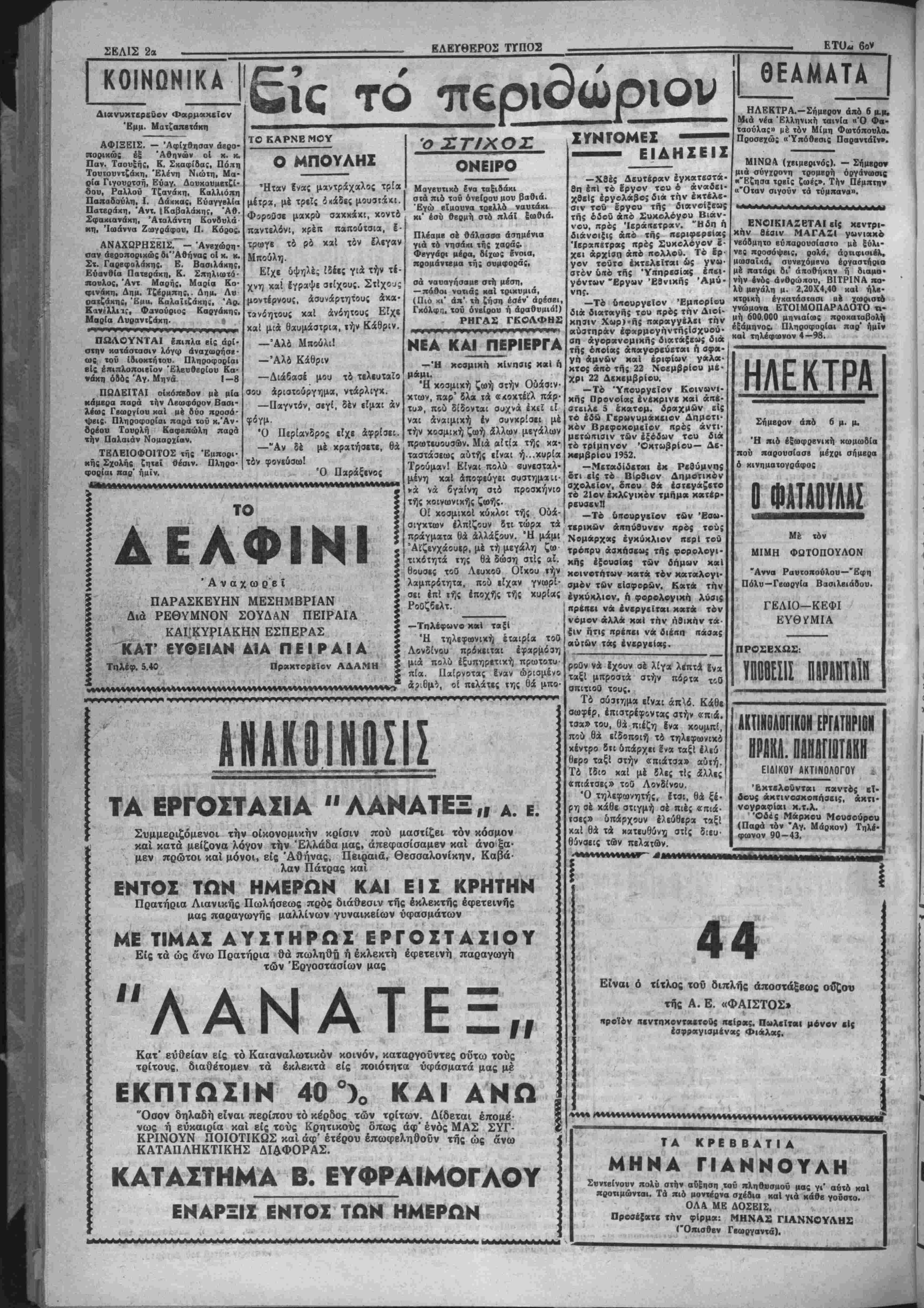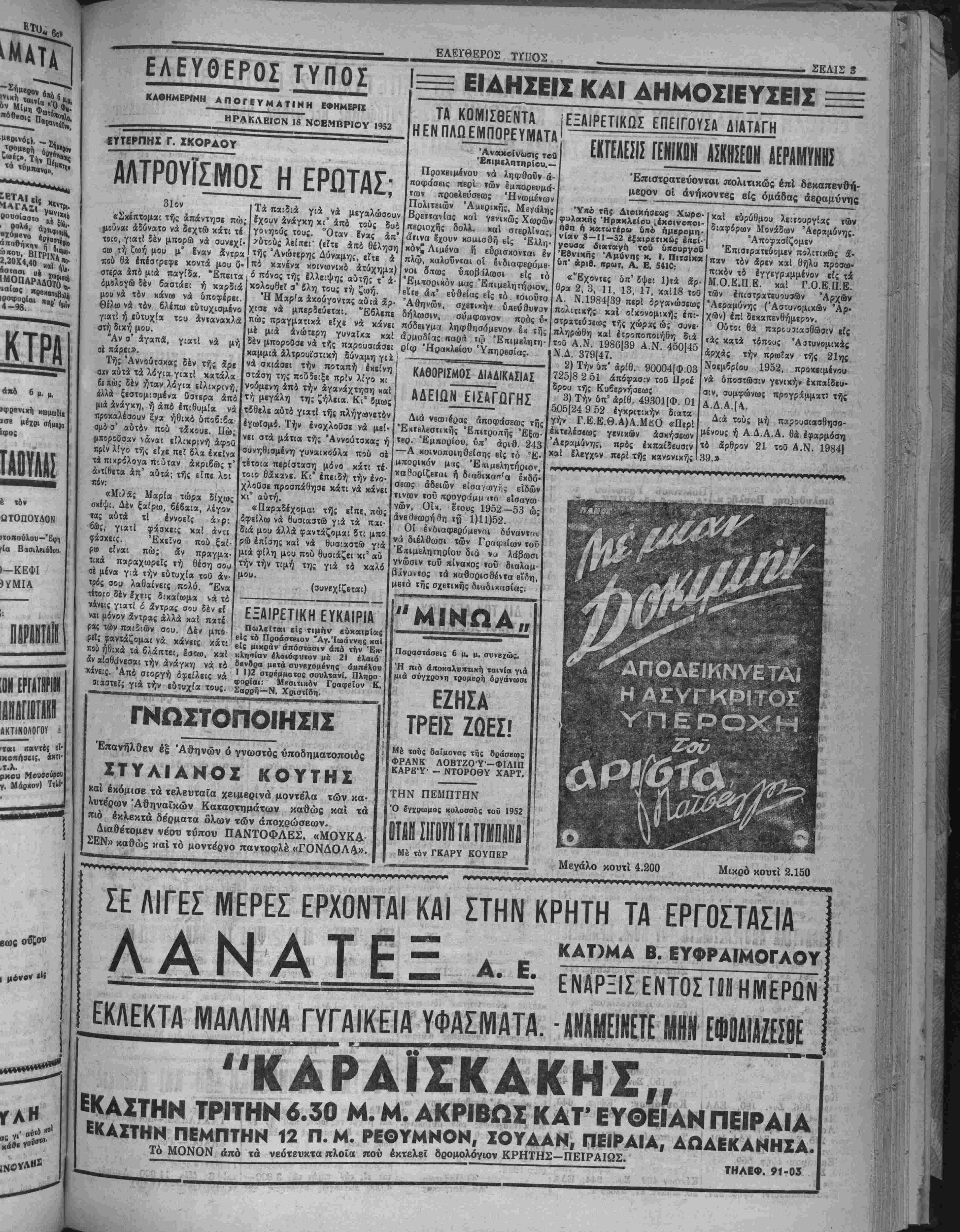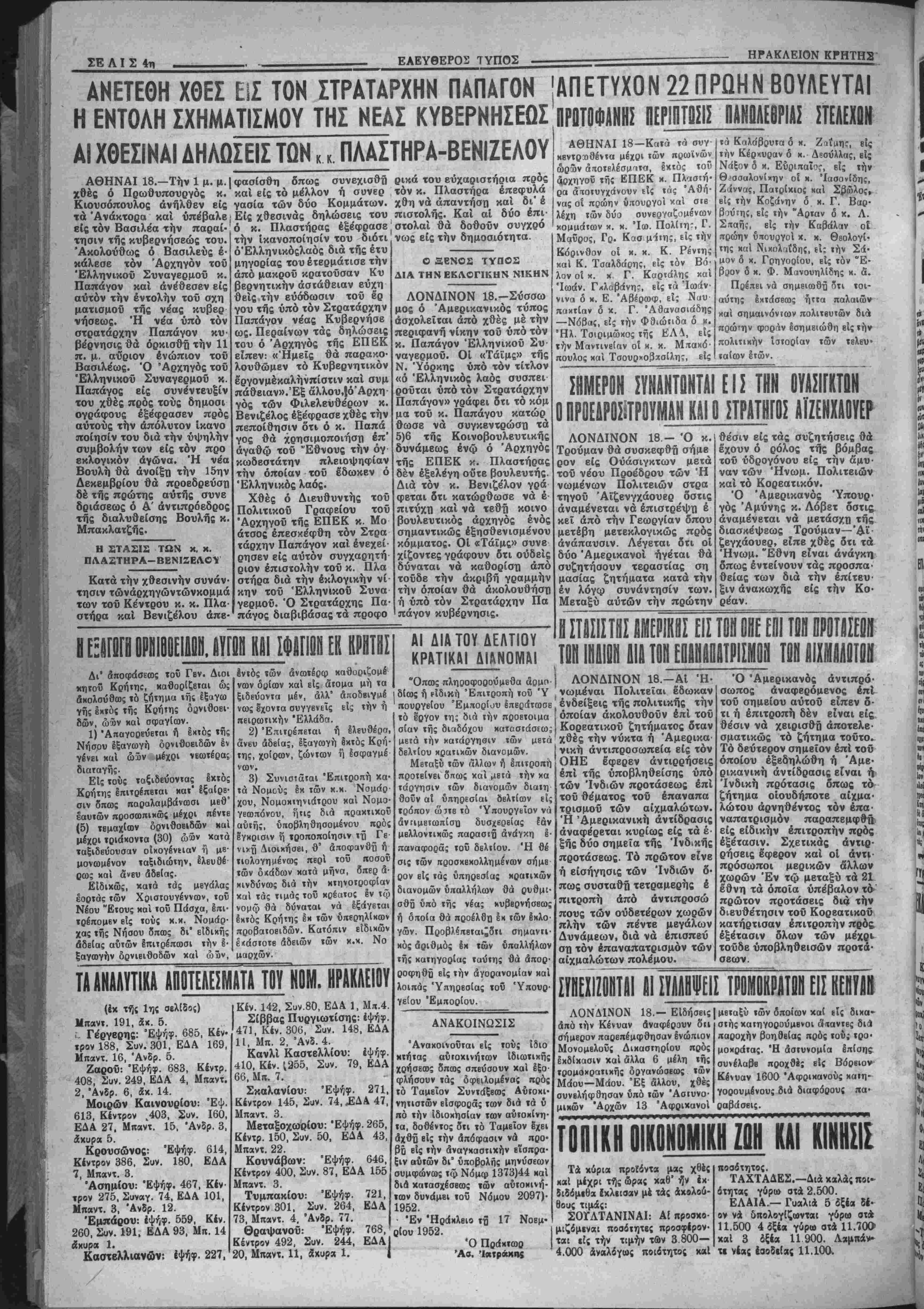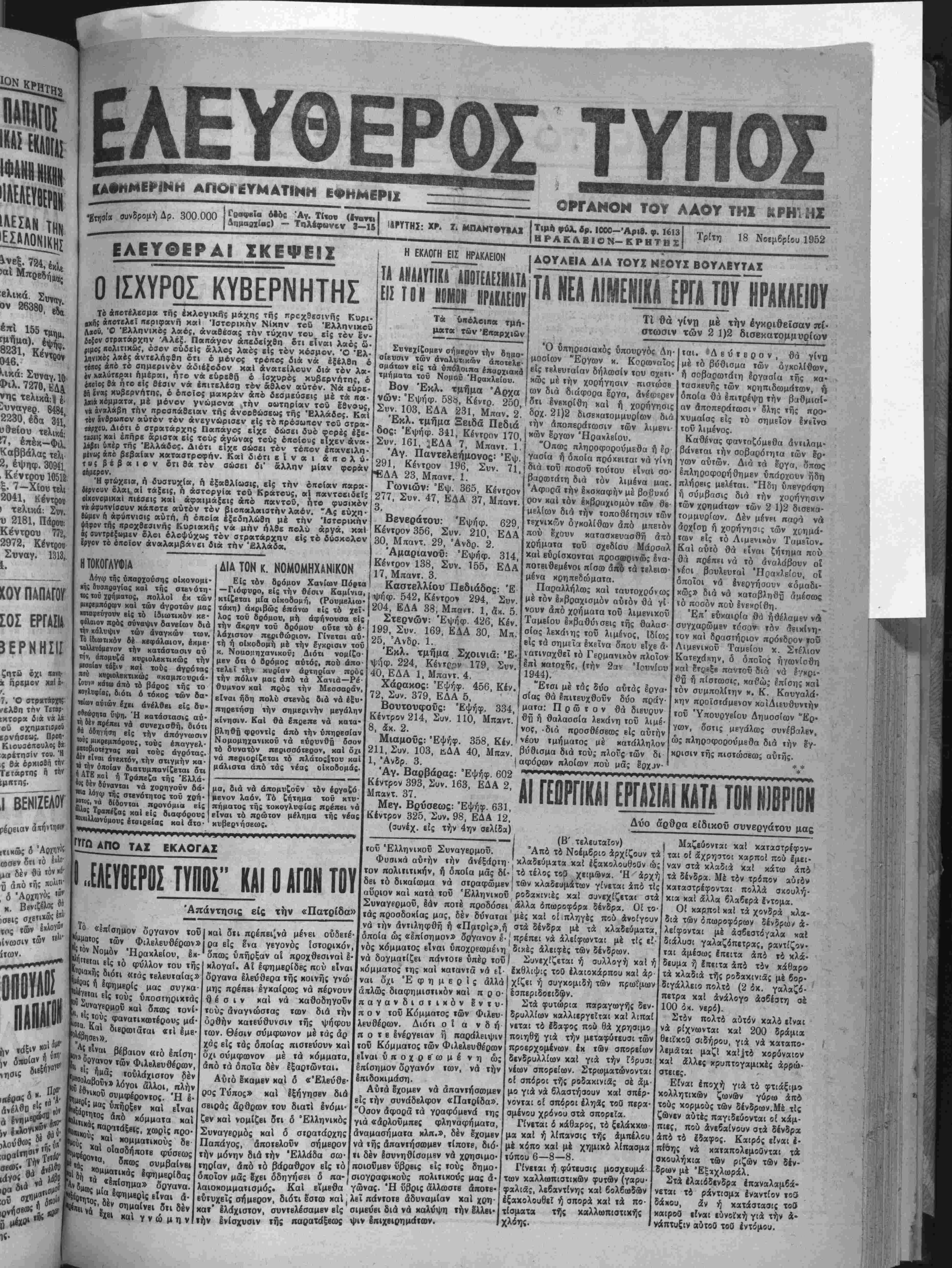ΔΕ) — Τηλε·Ην<.ν 3—1$ ΟΡΓΑΝΟΝ ΤΟΥ ΑΑΟΥ ΤΗΙ ΚΡΗ ΜΣ Ι1ΡΤΤΗΣ: XI». 7. ΜΠΑΝΤΦΤΒΑΙ Τιμ* «βλ. δρ. ΙΟΟΟ—Αριθ. φ. 1613 ΗΡΑΚΛΕΙΟΝ-ΚΡΗΤΗΣ Τρίτη 18 Νοεμβριού 1952 ΕΑΕΥΟΕΡΑΙ ΙΚΕΨΕΙΣ Ο ΙΣΧΥΡΟΣ ΚΥΒΕΡΝΗΤΗ! Τέ άηοτέλεσμκ τής έκλογική; μάχη; τής πρεχθεσινης Κυρι- ,χήί ά/ΐοτβλεϊ ηεριιρανή κα! Ιστορικήν Νίκην τβδ Έλληνικοΰ Λ«οϋ. Ό Ελληνικάς λαος, άναθέσας την τύχην τού είς τβν εν {5ίον στρατάρχην Αλεξ. Παπάγον απεδείχθη δτι είναι λαός ώ· «ιμβ; «ολιτικώί, οίον βύόϊΐς άλλας λαος είς τον κόσμον. Ό Έλ· ίηνιχβ; λαέ? αντελήφθη δτι έ μονος τροκος διά νικ εξέλθη ο τίιτβ; άτύ τό σημερινόν άδιέ{οδον καΐ άνατείλβυν διά τον λα· ^ν καλυτέρα ι ημέραι, Λγο νά ευρεθή & Ισχυρώς κυβερνήτη;, έ ίκβίο, θά ήτο αίς θέσιν νά έιτιτελέση τόν άθλβν αυτόν. Νά εύρε· 6ή ('να; κυβερνήτη;, έ οποίος μακράν άαό δεσμβύβεις μέ τα πα¬ λαιά κέμματα, μέ μόνον γνώμονα την σωτηρίαν τού εβνους, ν& αναλάβη την προσπάθειαν της ανορθώσεως τής Ελλάδος. Καΐ τίν ίνβρωΛβν αυτόν τον ανεγνώρισεν είς το πρόσωπον τοΰ ατρα- τάρχβυ. Διότι έ στρκταρχης Παπαγο; βϊχε δώσει δυο φορές έξε· »β(ΐ; καΐ έηηρΕ αριθ τα είς τοΰς αγώνας τού; οιτοΐβυς είχεν άνα- λίβει υπέρ της Ελλάδος. Διότι εΐχε σώσβι τον τόπον έπβινβιλη· μίν«; &πό βεβαίκν καταστροφήν. ΚαΙ διότι είναι ά π ο λ υ- τ ν { β έ β α ι ο ν δτι θά τον σ&ιβει δι' άλλην μίαν φοράν ίήμίρβν. 'Η φτώχεια, η ίυστυχΐα, ή έξαθλίωσις, είς την οποίαν παρα- ίίρνουν όλαι α! τάξει;, ή αστοργία τού Κράτβυς, αί παντοειδείς οικονομικαί ιτιέβεις καΐ άφαιμάξει; ά πό παντοθ, ήτο φυσικόν νά άφυιτνίσουν κάιτοτβ αυτόν τόν βιοπαλαιατήν λαόν. "Ας βύχη· (ϋμβν ή άφύΐτνισι; αυτή, Α έπβία εξεδηλώθη μέ την Ιστορικήν ψήφον τή; ηροχθεβινής Κυρικκή; να μην ήλθε πολΰ άργά, καΐ ί; βυντρίξιιμεν ολοι ολοψύχως τόν στρατάρχην είς τό δύσκολον ίρνον τό οποίον άναλαμβάνει διά την '£λλάδα. ΗΜΟΓΑΥΦΙΑ Λόγιρ τής υπαρχούσης οικονομι¬ κάς δυσπραγίας χαί τής στβνότη· τος τού χοημαΐο;, πολλοΐ έχ των μιχρεμπορων χαί των άγροτών μας «οκΐφϊύγουν είς τδ ίδιωτικόν κε¬ φάλαιον πρός σύνοψιν δανείον διά Φ κάλυψιν των άναγκών των. Τό ίδιωτιχόν δέ κεφάλαιον, έχμβ' ιαΜινόιιενον την κατάστασιν αύ την, άπομν(ά κυριολεκτικώς την μισαίαν τάξιν κσΐ τούί αγρότας ου χνρολΕχτικώς «χαμπουριά- ζοιιν» κάΐω ά πό τό βάροϊ τής το «ογλθφία;, διότι ό τόκος των δα- ηίων αύΐών έχει άνέλθει εί: δυ· οίϊώρηια ΰψπ. Ή κατάστασις αύ¬ τη 6έν ηβέπβι νά συνεχισθή, διότι *ό οδηγήση είς την απόγνωσιν ό { μβμόρουί, τούς έπαγγελ ματοβιοϊίχνας χαί τούς αγρότας, οεν είναι ανεκτόν, την στιγμήν κα· »* την οποίαν διατυμπανίζβται δτι ΑΤΕ καΐ ή Τραπέζα τής Έλλά· ί»! δεν δύνανται νά χορηγοΰν βά· «β λόγψ τής στβνότητοϊ τού χρή- ■"τος, νά δίδονται προνόμια είς «Ιας Τραπέζας καΐ είς διαφόρους «ιχιΗωνΰμους βταιρβίας καί άτο· ΔΙΑ ΤΟΝ κ. ΝΟΜΟΜΗΧΑΝΙΚΟΝ Είς τόν δρόμον Χανίων Πόβτα — Γιόφυρο, είς την θέσιν Καμίνια, κτίζβται μία οίχοσομή, (Ρουμβλιω· τάκη) ακριβώς επάνω εις τό χεϊ- λος τοϋ δρόμου, μή άφήνονσα ε! την άχρην τού δρόμου οϋτε τό έ λάχιστον περιθώριον. Πνεται αύ τή ή οΐκοδομή μέ την έγκρισιν τοτ χ. Νουοιιτιχανιχοϋ; Διότι νομίζο μέν ότι ό βρόμοί αύτόί, πού άπο η ί ί 6 Η ΕΚΛΟΓΗ ΕΙΣ ΗΡΑΚΛΕΙΟΝ Τά ύιτόλοιπα τμή- ματα των Έπαρχιών Συνβχίζομβν σήμβρον την βημο· σιευσιν των αναλυτικών άποτβλβ· ομάτων είς τά ύπόλοιπα έπαρχιαχό τμήματα τοΰ Νομοΰ Ηρακλείου. Βον Έκλ. τμήμα 'Αρχα νών: Έψήφ. 58», Κέντρ. 250 ΑΟΥΑΕΙΑ ΔΙΑ ΤΟΥ Ι ΜΕΟΥΣ ΒΟΥΛΕΥΤΑΣ ΤΛ ΝΕΑ ΛΙΜΕΝίίίΑ ΕΡΓΑ ΤΟΥ ΗΡΑΚΛΕΙΟΥ Τί θά γίνη μέ την έγκριθεΐσαν πί¬ στωσιν των 2 1)2 δισεκατομμυ