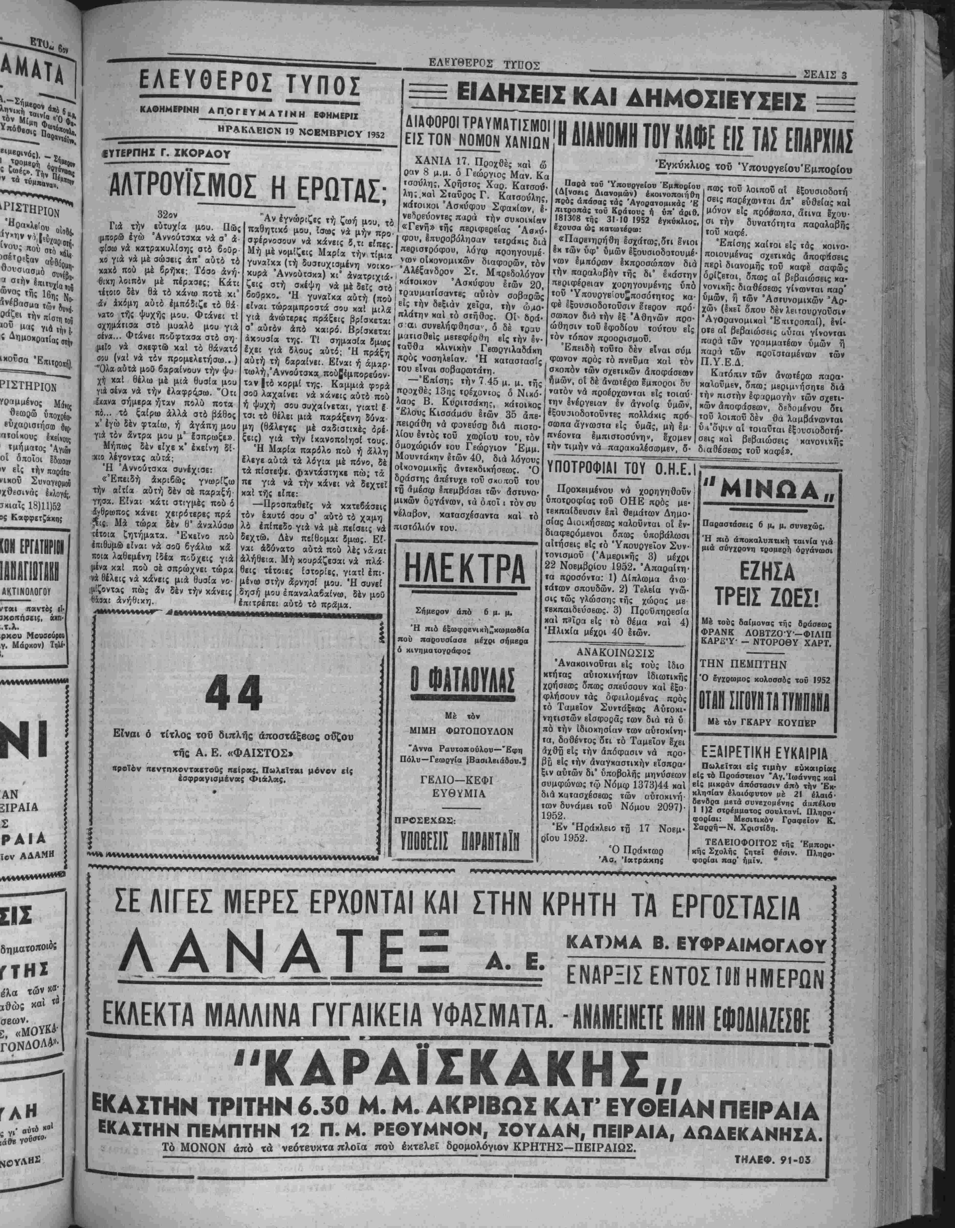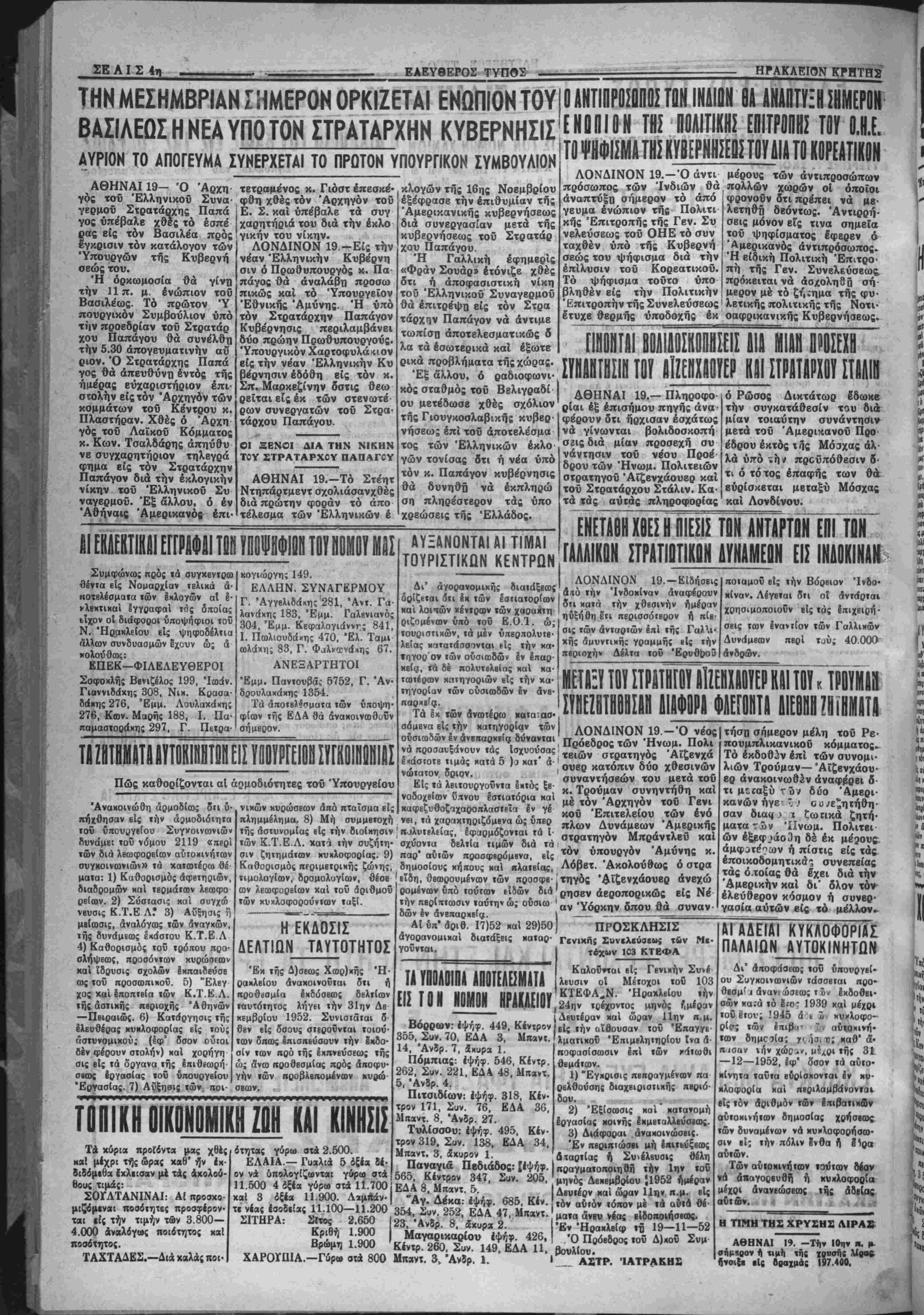 ιω ν δημοσία; γ<,ί)ϋιν; καθ" <3· «ισαν ιόν χώβ^Λ μέχρι της 31 —12—1952, έφ* δσον ΐά αύτο· κίνητα ταυτα ευρίσκονται έν κν· κλοφορΐα κα'ι «βριλαμβάνοντοι είς τόν αριθμόν των Ιΐτιβατιχων αΰτοκινήτων δημοσίας χρήσεως των δυναμένων νά κυκλοφορήσαν σιν ε!; την πόλιν ίνθα ή 8)ρα αυτών. Των αυτοκίνητον τούτων δέον «Α απαγορευθή ή κυχλοφορία έχ άνανϊώσεως ι ής άδβΐας αυτών. , ,·■ Η ΊΊΜΗ ΤΗΣ ΧΡΥΕΗ2 ΛΙΡΑ9· ΑΘΗΝΑΙ 19. -Την ΙΟην μ. μ. σήμιρον ή τιμή της ϊρυσής ίρας>