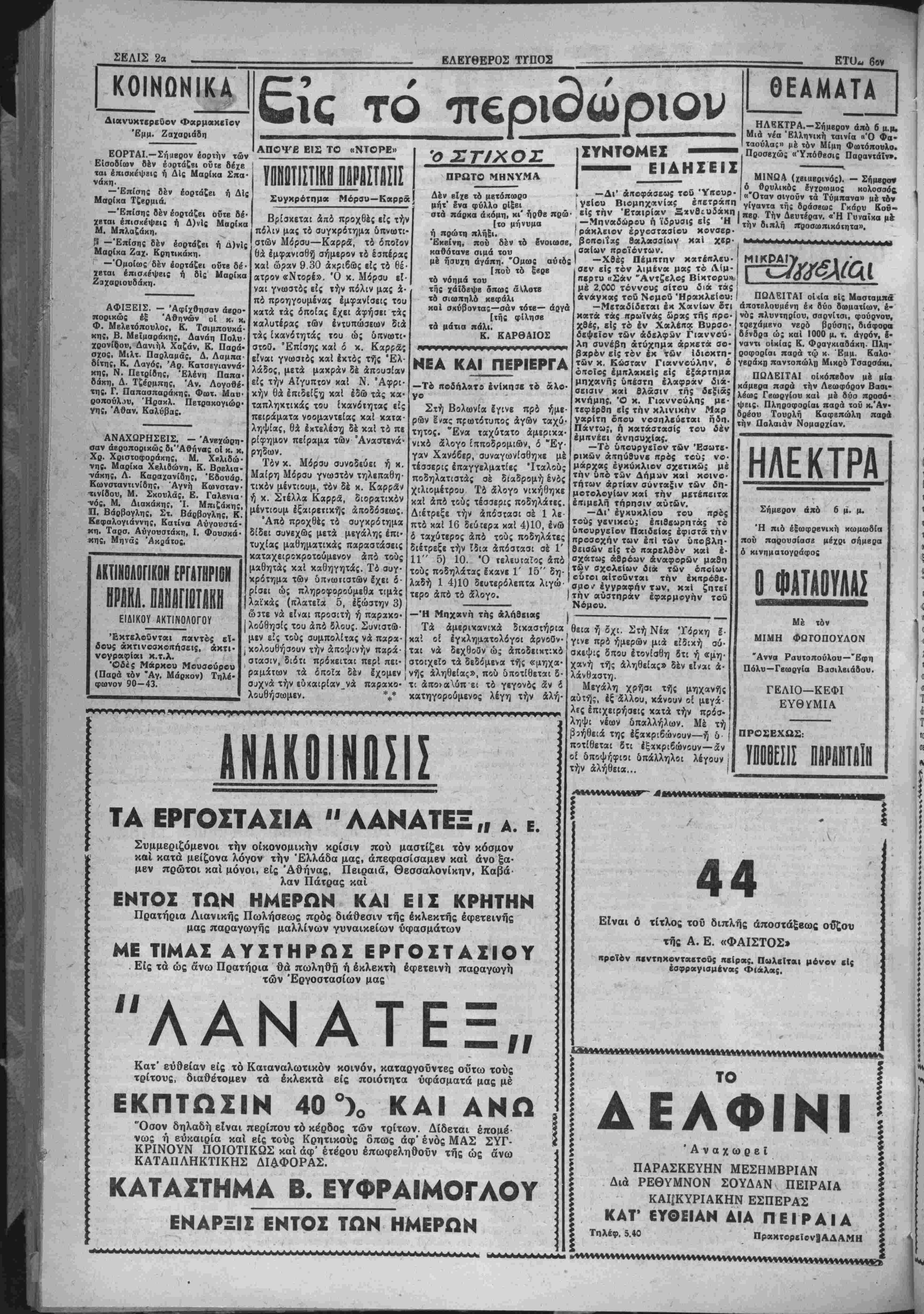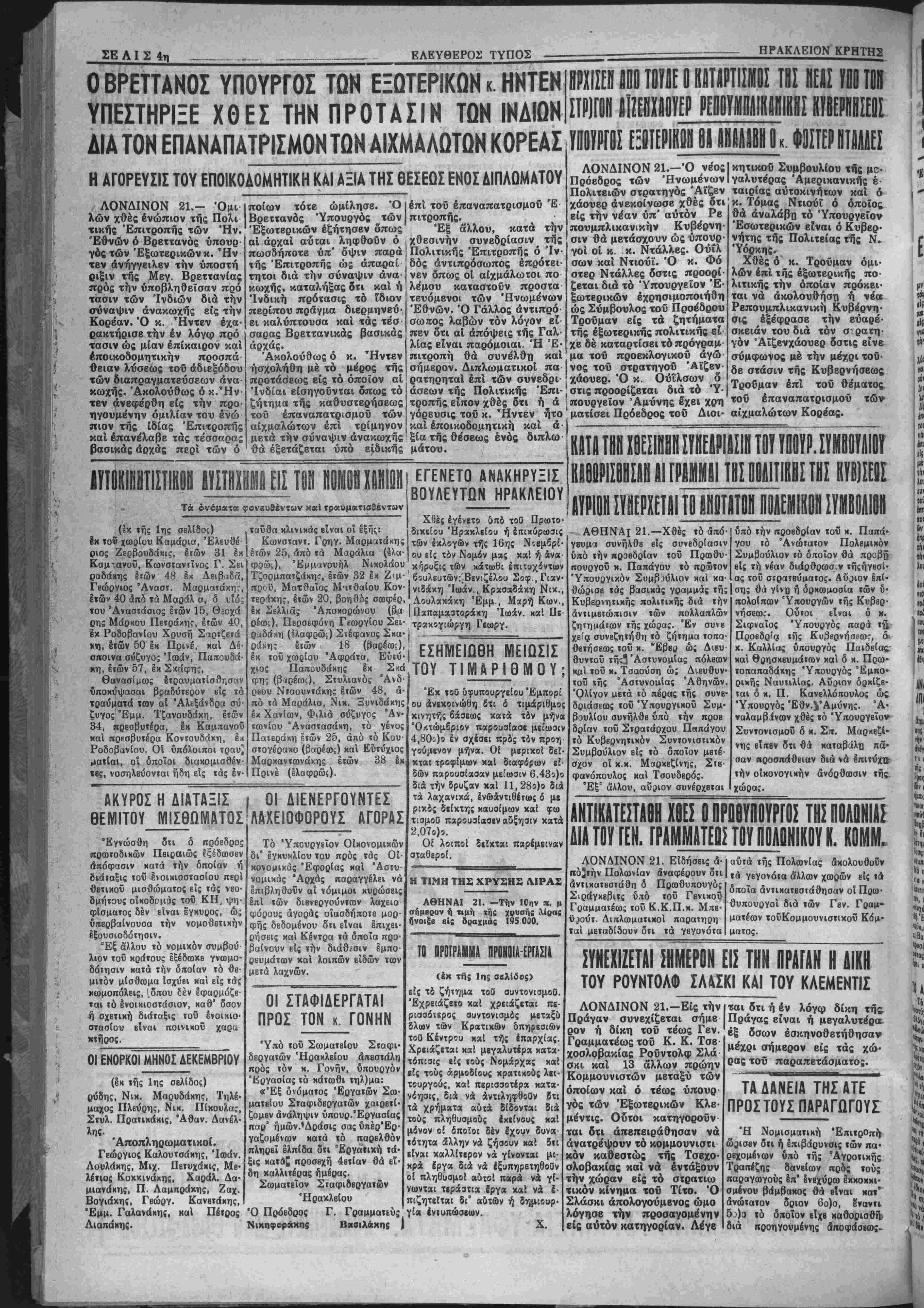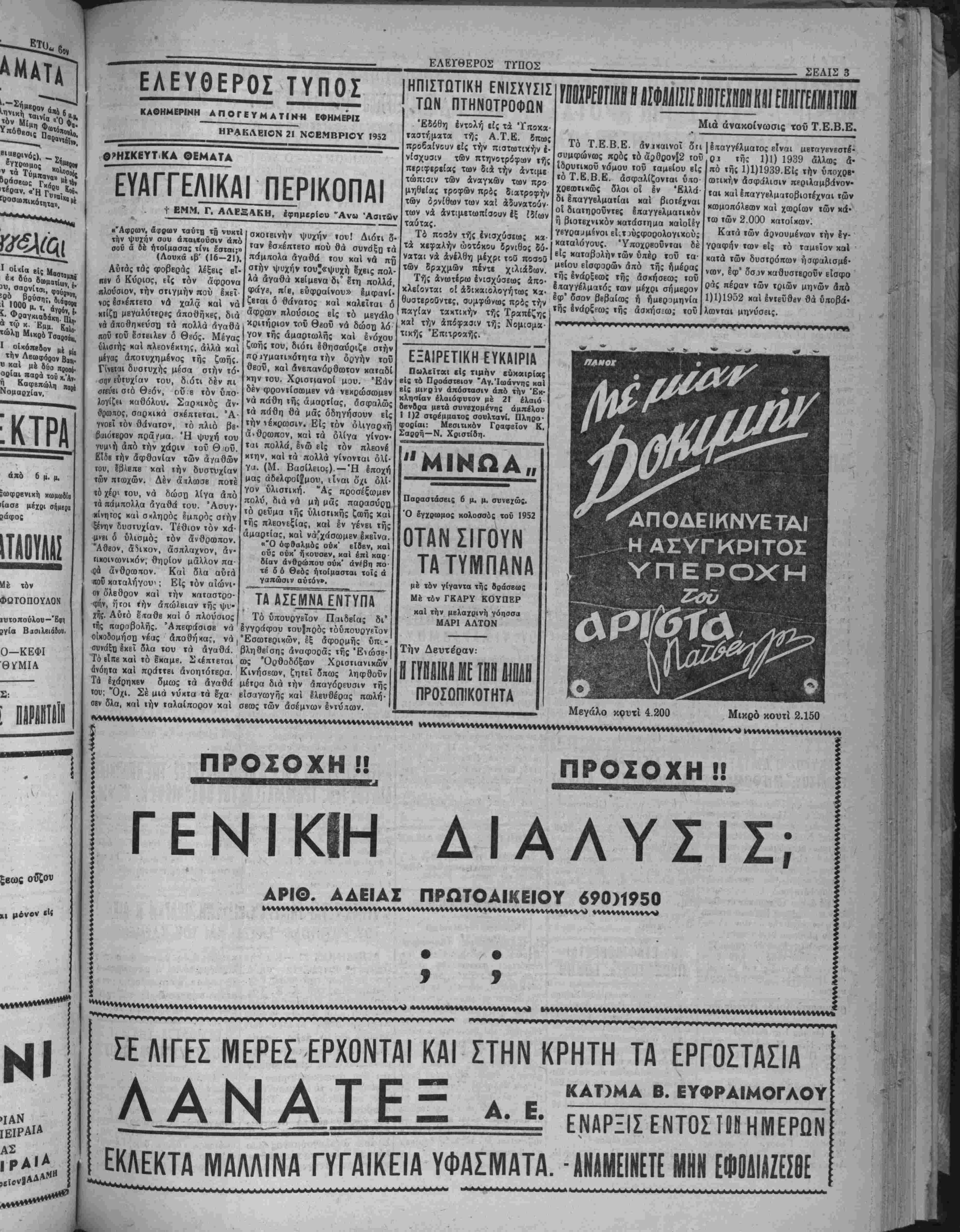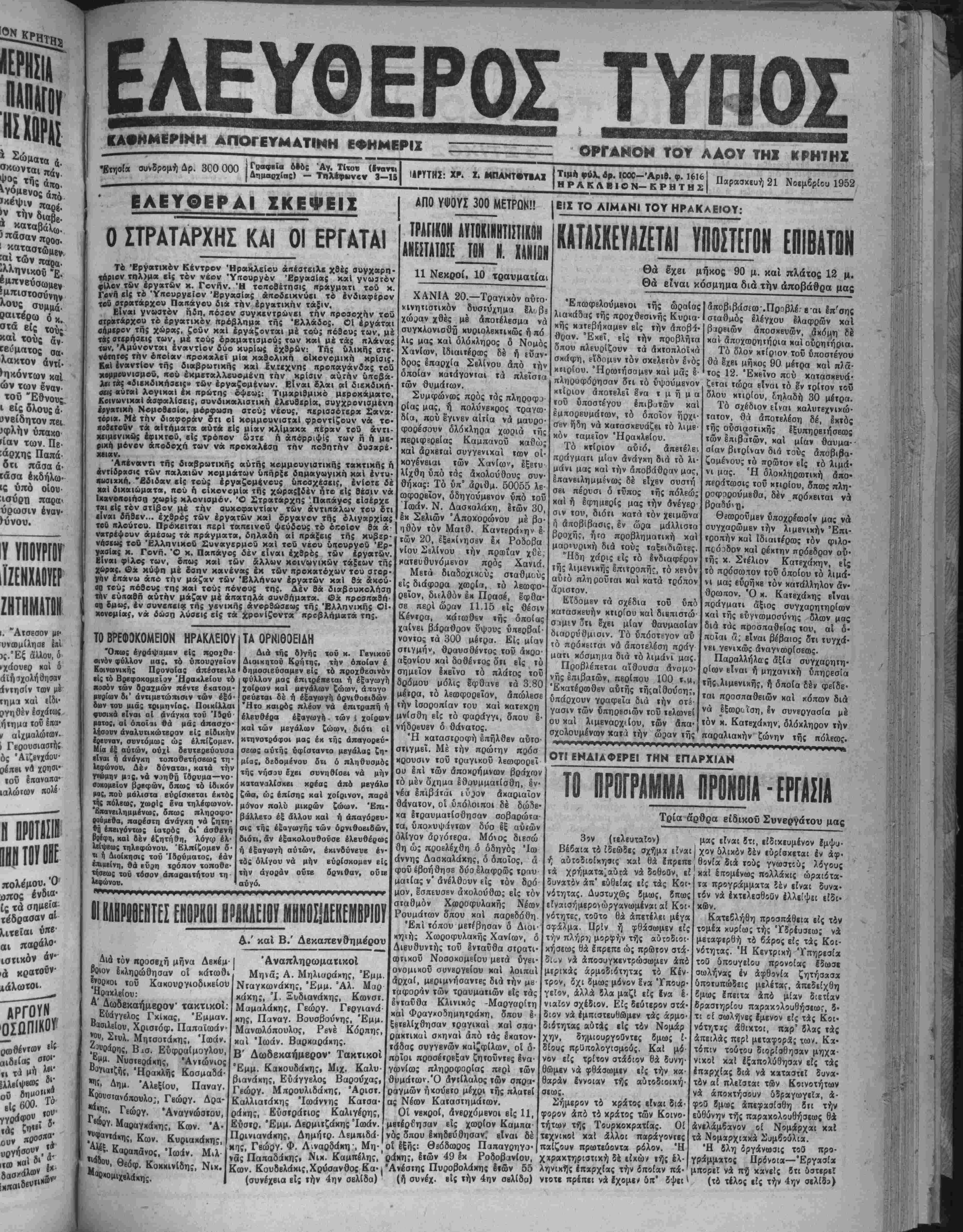 χώρας. <2χ κύψη μέ δσην κανένας έκ τών προκατόχων τού στορ γήν επάνω άπο την μάζαν των Έλλήνων έργατών καί θά απού αν τού; πόθους της καί τού; πονους της. Δέν θά διαβουκολήση τϋν εύιταθπ αυτήν μάζαν μέ άπατπλά συνθπματα. @χ προοπκθπ οο ίμωί, έν συνίίΐϊΐα τή; γβνικής Ανορθώσεως τή; 'Βλληνικής ΟΙ κονομίαί, νά δώση λύββις είς τα χρονίζοντα «ροβλήματά τη;. ρ. 1000-Αριθ. φ. 1616 ΗΡΑΚΛΒΙΟ Ν-ΚΡΗΤΗΣ Παρασχεθή 21 Νοεμβριού 1952 ΑΠΟ «ΟΥΣ 300 ΜΕΤΡΟΝ!! ΤΡΑΓΙΚΟΝ ΤΐϋϊΚΪΙίΙΙΙΟΝ ΑΙΕ.ΓίΙΟΙί_!ΙΜΙ. ΧΑΗΙΟΗ 11 Νεκροί, 10 τραυματίαι ΤΟ ΒΡΕΦ9Κ0ΜΕΙ0Ν ΗΡΑΚΛΕΙΟΥ Όπως έγράψαμεν είς προχθβ- «νόν φύλλον αας, τό υπουργείον Κοινωνική: Προνοίας άπέστειλβ είς τό Βρβφοκομεϊαν Ηρακλείου τό παοόν τών δραχμών πέντε έκατομ- μιιρίων δι' αντιμετώπισιν τών έξό- δών τού μιάς τριμηνία;. Ποιχίλλαι «ίυσιχά είναι οί άνάγκα τού Ί5ρύ ματο;, αί όποϊιι θά μά; άπασχο· λήσουν άναλυτικώτβρον είς ειδικήν Ιβευναν, συνιόμω; ώς ελπίζομεν. Μία έξ αυτών, ουχί βευτερεύουσα είναι ή άνάγκη τοποθετήσβω: τη· Ιίφώνου. Δέ» δύναται, κατα την γνώμην μις, νά νοηθή ϊδρυμα—νο¬ σοκομείον βρεφών, όπως τό Ιδικόν μος, πού μάλιστα ευρίσκεται έκτός τής πόλεω;, χωρΐς Ινα τηλέφωνον, '&ιανειλημμένωί, όπως πληροφο* βούμβθα, παρέστη άνάγχη νά Εητη· β] έπβιγόντως ΐατρός δι* άσθενή χαΐ βέν εζητήθη, λόγφ έλ· ΙίίψΕως τηλβφώνου. Έλπίζομβν δ· τι ή Διοίκησις τοΰ Ίβρύματος, εάν επιμείνη, θά εύρη τρόπον τοποθε- τήσεω; τού τόσον άπαραιτήτοΐ) τη Μφώνον. ΤΑ ΟΡΚΙΘΟΕΙΑΗ Διά τής β)γής τού κ. Γβνικοΐ Διοιχητοϋ Κρήτης, την οποίαν έ δημοσιεύσαμβν είς τό προχθεσινό φύλλον μας έπιτρέκβται ή έξιιγωγή χοίρων καί μεγάλων ζώιβν, άπαγο ρεύβται δέ ή έξαγωγή όρνιθοβιβών "Ητο καιρόί πλέον νά επιτραπή ή ελευθέρα έξαγωγή- τών 1 χοίρων καΐ τών μεγάλων ζώων, διότι χτηνοτρόφοι μας έκ τής άπαγορεύ- σεως αυτής υφίσταντο μεγάλας ζη· μίαί, δεδομένου ότι ό πληθυσμό τής νήσου έχβι συνηθίοει νά μή' καταναλίσχΒΐ χρέας ά πό μεγάλα ζύα, ώ; έπίσης καί χοίρινον, παρά μόνον πολύ μιχρών ζώων. Επι βάλλετα έξ άλλου «αί ή άπαγόρευ σις τή: έξαγωγής των όρνιθοειδών διότι, αν έξακολουθούσβ έλευθέρω ή έξαγωγή αυτών, εκινδύνευε έν τδς ολίγον νά μην ευρίσκομεν εί την αγοράν οΰτε όρνιθαν, οΰιε αύγό. Δια ΐον προσβχή μήνα Δβχέμ ΡΟ*ον Ικληοώθησαν οί κάτωθι |*00*οι τού Κακουργιοδικείοι "θαχλβΐου: Α' Δωδβκαήμερον τακτικοί Ευάγγελος Γκίκας, Έμμαν "«οιλείου, Χρισΐόφ. Παπαϊωάν *° Στυλ. Μητσοτάκης, Ιωάν. άης, Βισ. Εύφοαίμογλου, ΝυσιβθΒΐιης, 'Ανιώνιος ζ Ήοακλής Κοσμαδά Ρ' Δημ. Άλβξίου, Παναγ. Κ9θυσΐανόπουλο;, Γβώογ. Δρα- ■««Κ, Γίώργ. 'Αναγνώσΐου, 1βώ8Υ.Μαοαγκάκης, Κων. 'Α· Γυ»*«ί«ης. Κων. Κυριακάκης, «"■«ου, 06Ο(ρ>