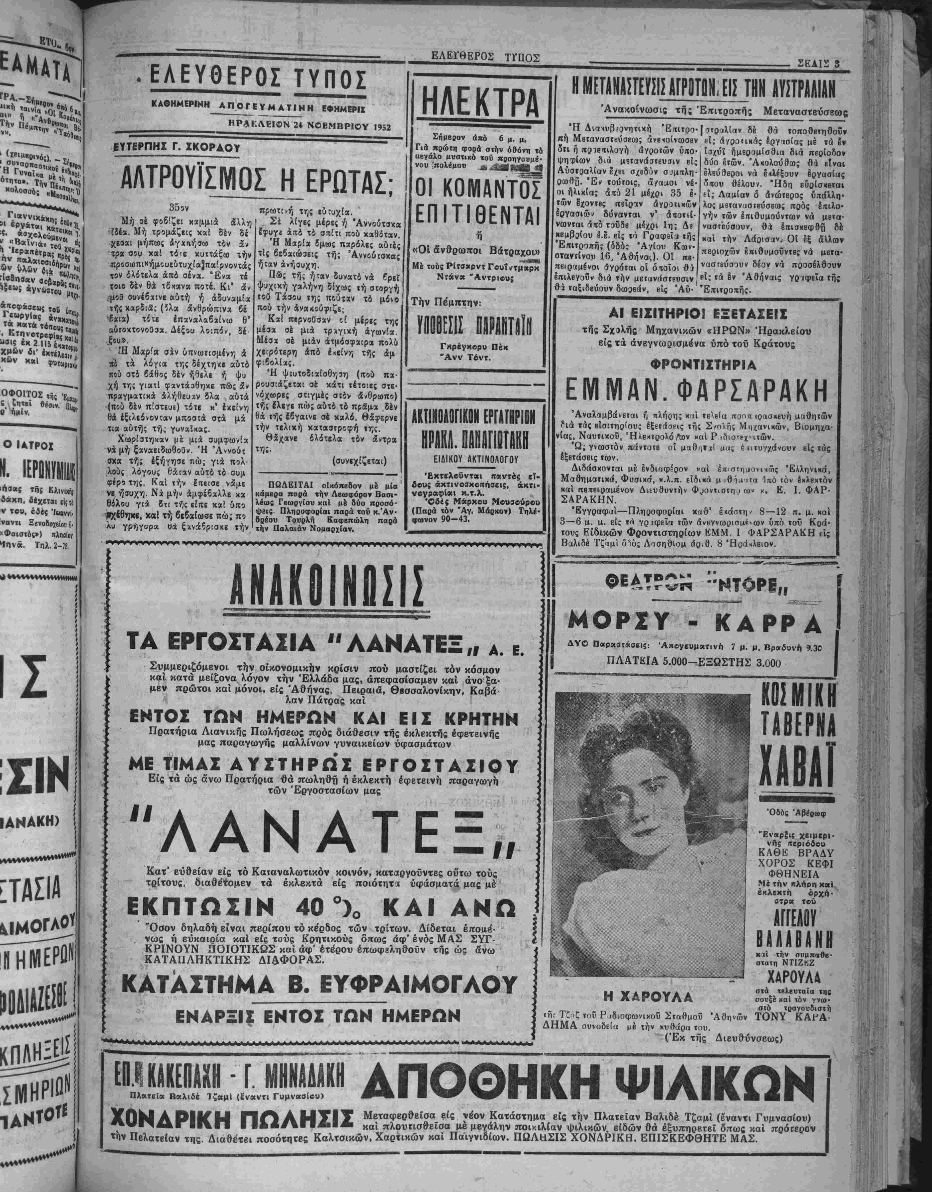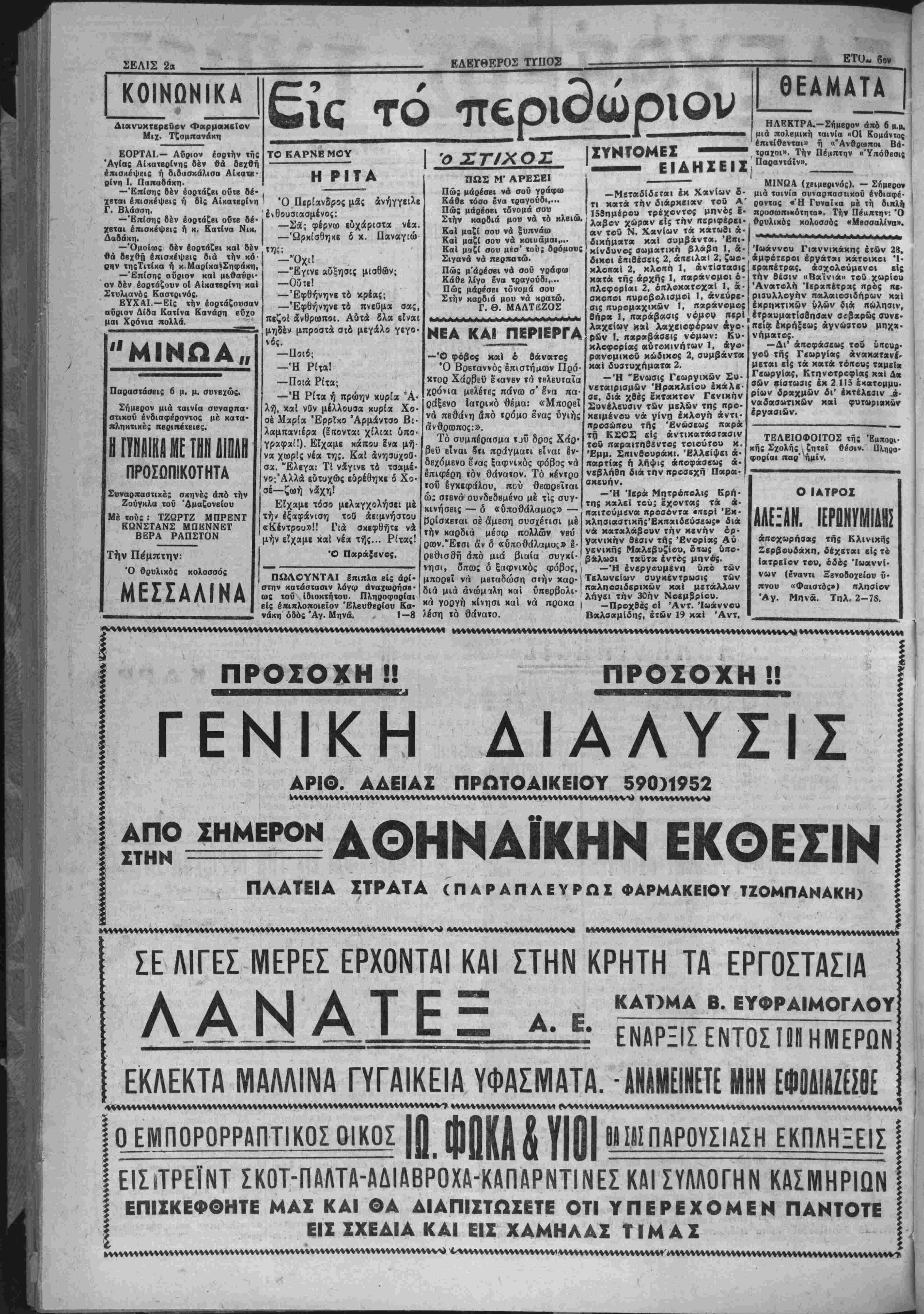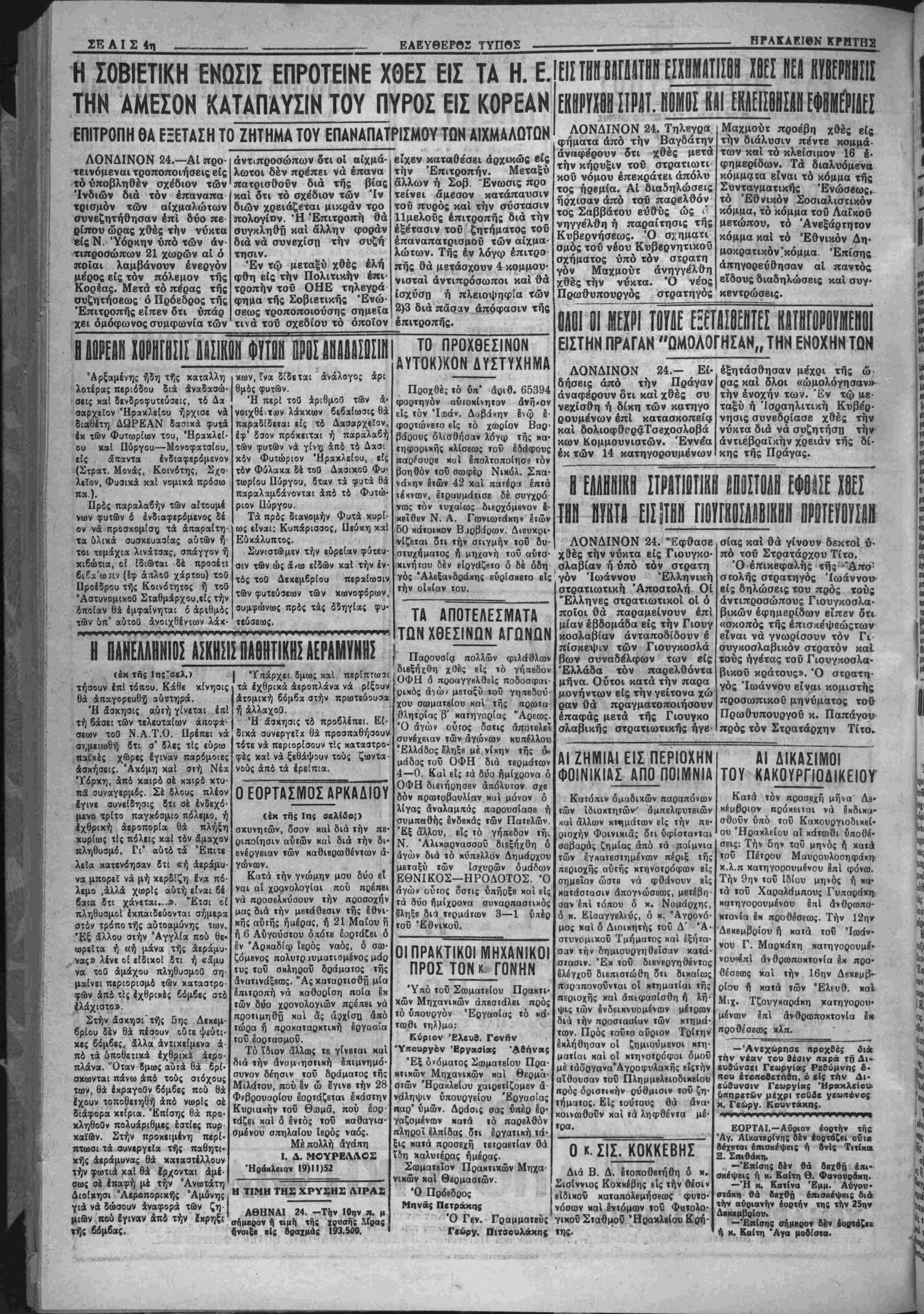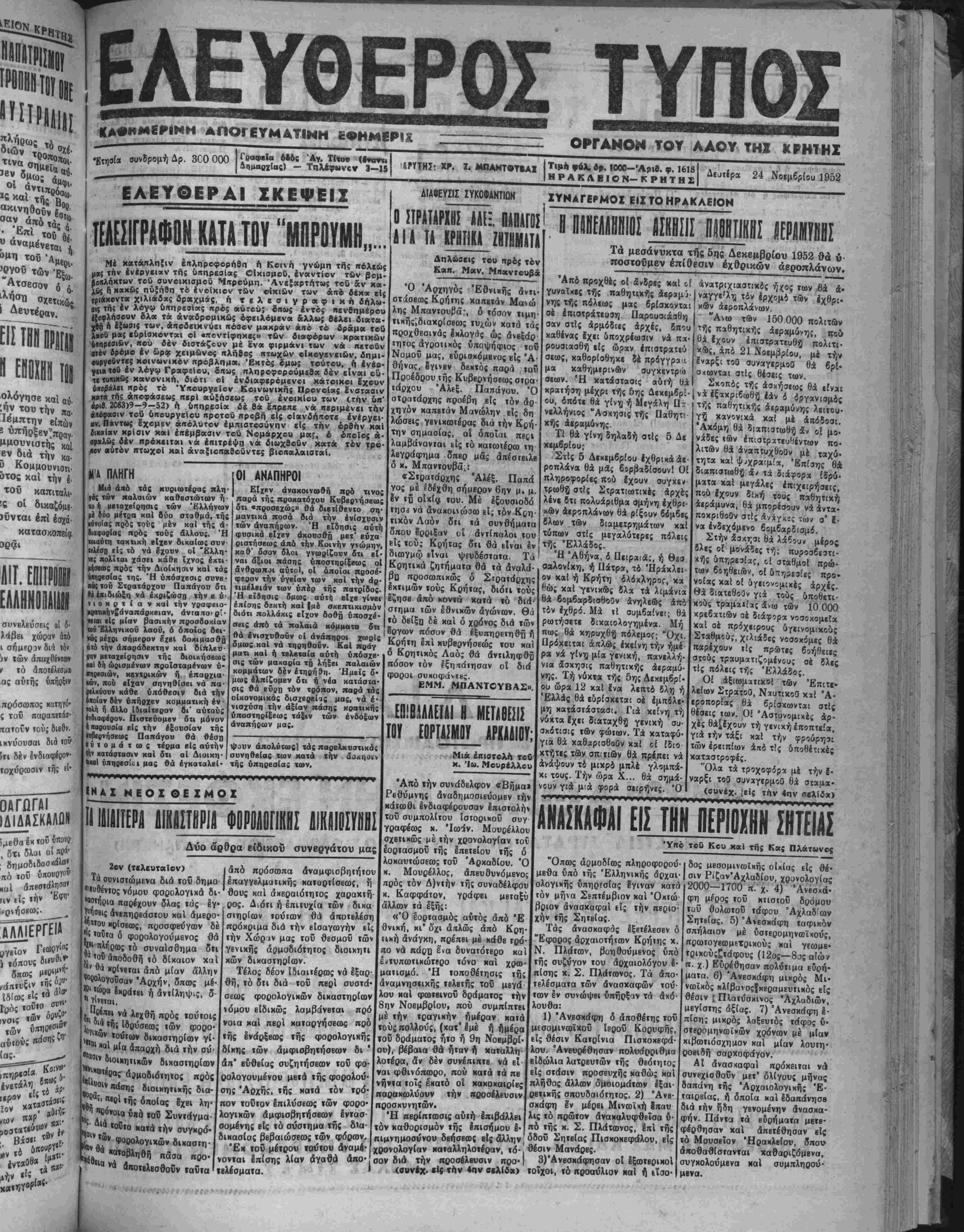 λ<ίββι χώραν υιώ ι σήμερον διά ιόν )ν των άπαχθίνταιν ι τό αποτέλεσμο! άς αυτής ΰηήρΐεν πρόσωπος κατηγό· ς τού παραΐΓΕΤίίσ· ηα«οίν «ού; διβθ». ικνύουοαι διά τον 5τι δέν Ινδιαφέρο»· τοχυρωσιν τή; ϊΐ* ΟΑΓΩΓΑΐ |ΔΙΔ_ΑΣΚΑΛΟ» ίμεθα έκ τού « , ότι δλαι αί « ■ δημοδιδασκά πό τού δηοιιογο» καΐ απΒσιά1η"αν ην είς ΐ»)ν 'ΒΦΠ' ΕΛΕΥΘΕΡΟΓ ΤΥΠΟΣ ΑΠΟΓΕΥΜΑΤΙΝΗ ΕΦΗΜΕΡΙΣ %νφ* συνδρομήΔρ. 300 000 Γραφβϊα όδός "Αγ. Τίτου (Ινα—1 ΑημαΙς) - Τηλ·φ«*νςν 3-15 ΕΛΕΥΟΕΡΑΙ ΣΚΕΨΕΙΣ ΤΕΑΚ1ΓΡΑΦΡΝ ΚΑΤΑ ΤΟΥ "ΜΠΡΡΥΜΗ,,. Μέ κατάπληίιν έπληροςρορήθη ή Κοινή γνώμη τής πόλεώς μ«; την ένέργβιχν τής υπηρεσίας ΟΙκιβμοΟ, εναντίον των βομ· ίβηλήκτΜν τού συνοικισμόν Μπρούμη. Ανεξαρτήτως τοΰ αν κα· ί% ή χακωί ηυξήθη τό ενοίκιον των ©ΐκιών των άηβ δβκ* είς (βιακοντα χιλιάδ*; ίραχμάς, ή Τβλβσιγραφική δηλώ· οί; τή; έν λέγω ΰιτηρχβίκ; πρό; αυτού; ίπω; έντό; πβνθημέρβυ Ηβφλήαβυν δλα τα άναδρομικώ; οφείλομεν» &λλω; θέλει οΊοττα- «Μ Α ί,Νβις των, αποδεικνύη πόθον μακράν ά πό τό δράμα τοΰ ί«βϋ μ αί ευρίσκονται οί «ποντίφηκβς» των διαφόρων κρατικών ύκηρεβιΰν, πού δέν διβταζουν μέ ενα φιρμάνι των νά πετοΰν οτον δρομο έν ώρα χειμώνος ιτλήβος πτωχών οιΉογβνκι&ν, δημι- β«ργβϋντε; κοινωνικόν προβλημα. 'Εκτός δμως τούτου, ή Ινίρ- γιικτοΰ έν λόγω Γραφΐίου, δπως πληροφορούμεθα δέν είναι ου· Η «υλικάς Μανονικη. διότι οί ενδιαφερομένη κάτοικοι Εχουν ύκίβάΧη πρός τό Υπουργείον Κο Πί £ XI». 2. ΜΠΑΝΤβΤΙΑΙ Ι"*»»* ·«■ «Ρ· «000-Άριβ. φ. 1618 |ΗΡΑΚ ΛΒΙΟ Ν— ΚΡΗΤΗΣ ΟΡΓΑΝΟΝ ΤΟΥ ΑΑΟΥ ΤΗΣ ΚΡΗΤΗΣ Δευτέρα 24 Νοεμβριού 1952 ΔΙΑΦΕΥΣΙΣ ΣΥΚΟΦΑΝΤΙΩΝ ς οκη. διότι οί ενδιαφερομένη κάτοικοι Εχουν ύκίβάΧη πρός τό Υπουργείον Κοινωνικήν Προνοίας £ ν στάσιν χ«τ« τή; αποφάσεως πβρι αυξήσεως τοΰ ένοικίου των (την ΰπ' άριβ. 2053)9—9—52) ή υπηρεαία δέ θά έπρεπε ν ά ηεριμενβι την «κόφαβιν τβΰ ύιιουργείου προτοϋ προβή είς οιανδήποτε ενέργει¬ αν*. Πάντως Εχομεν απόλυτον εμπιστοσύνην «Ις την όρθήν καΐ βιχαίαν κρίσιν κα» επέμβασιν τοΰ Νομαρχου μαί, δ οποίος ά οωαλως δέν προχ»ιται νά επιτρέψη νά διωχθοΰν κατά τον τρο «ν αυτόν πτωχοΐ καί άναξιοηαθοΰντΕς βιοπαλαισταί. Μ1Α ΠΛΗΓΗ Μιά άπό τας κυριωτέρας πλη γας των παλαιών καθκστώΐων ή ιο ή μεταχβί ρήσις των Έλληνας μ ούο μέτβα καΐ Ούο σταθμά, τή ι ιννοίας πρός τούς μέν καΐ τής ά ίιαφορίας πρός τοΰς δλλους. Ή τοιαύτη τακΐιχή Είχεν δικαίας συν τιλέσπ εί; τό νά έχουν οί "Ελλη- υε; πολίται χάσει κάθε ΐχνος έκτι- ιήΜΤβς πρός την Διοίκησιν καί τάς ί~οεσίας τη;. Ή ύπόσχβσις συνβ- χ«( τού ΣτροτΓΪρχου Παπάγου 5τι Η επιδιώξη νά έχοιζωσπ. την β ϋ νιοκρτίαν χαΙ την γραφβιο- κριιτικήν£άναπάοχειαν, άνΓαΐΐο>ρ:·