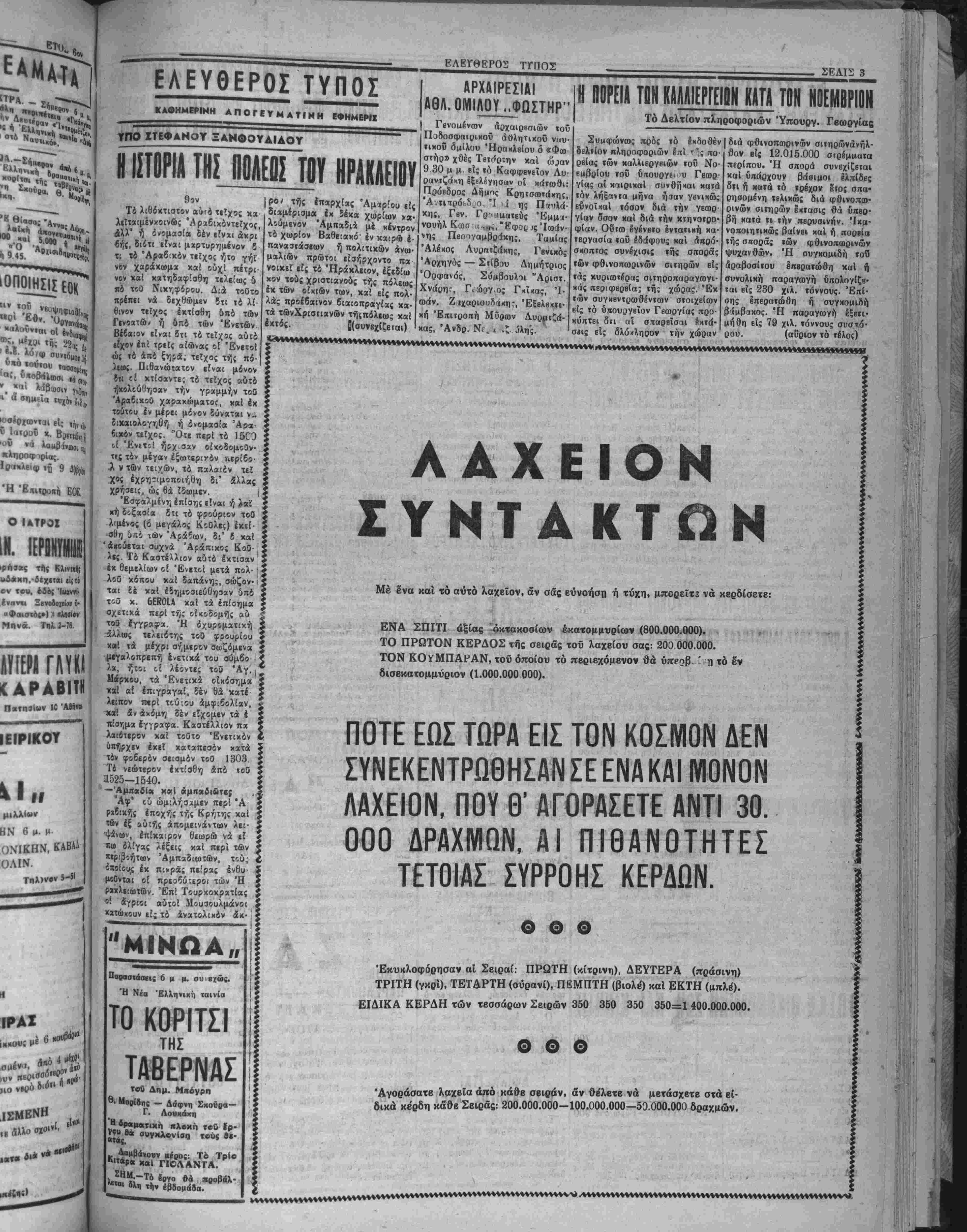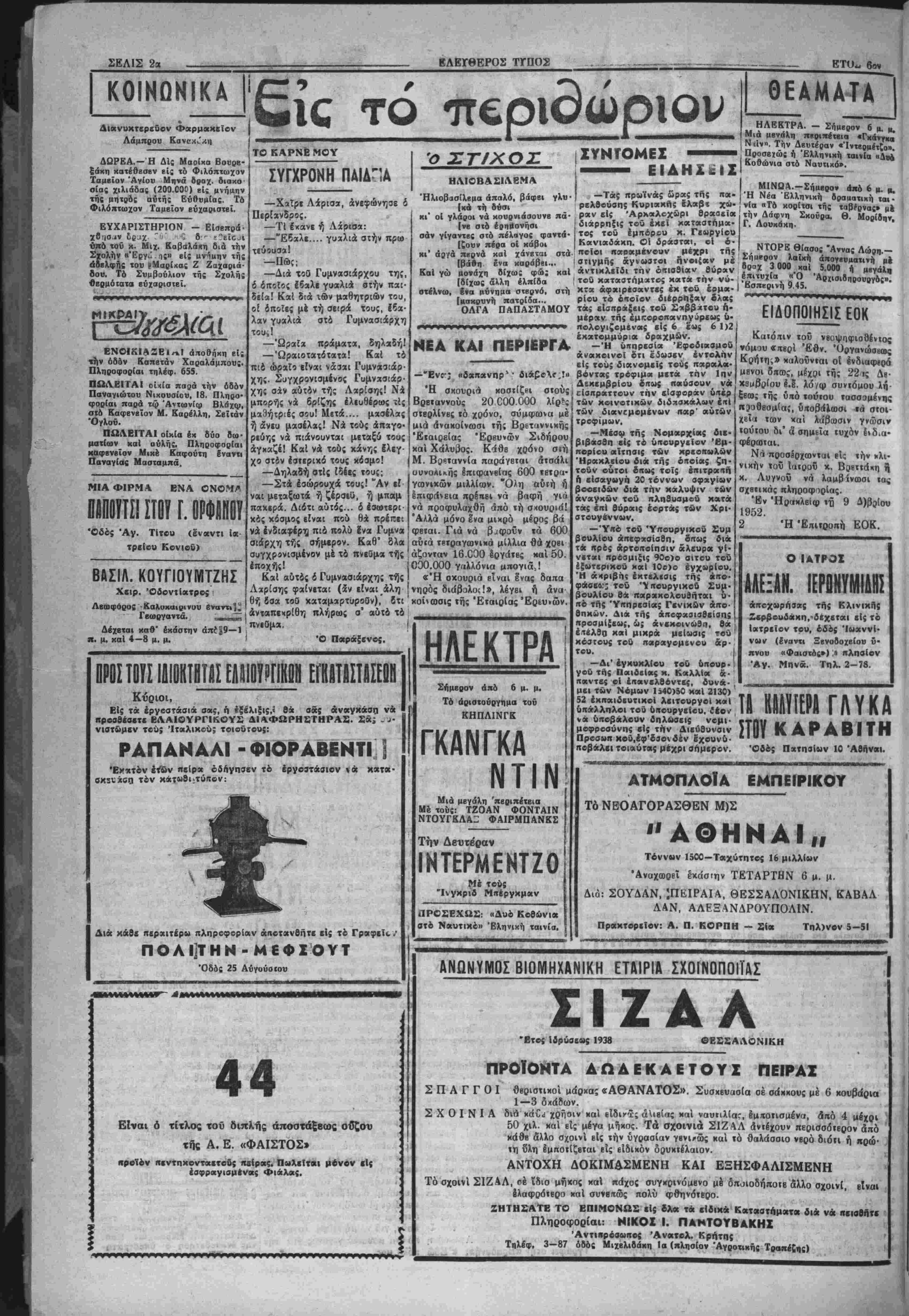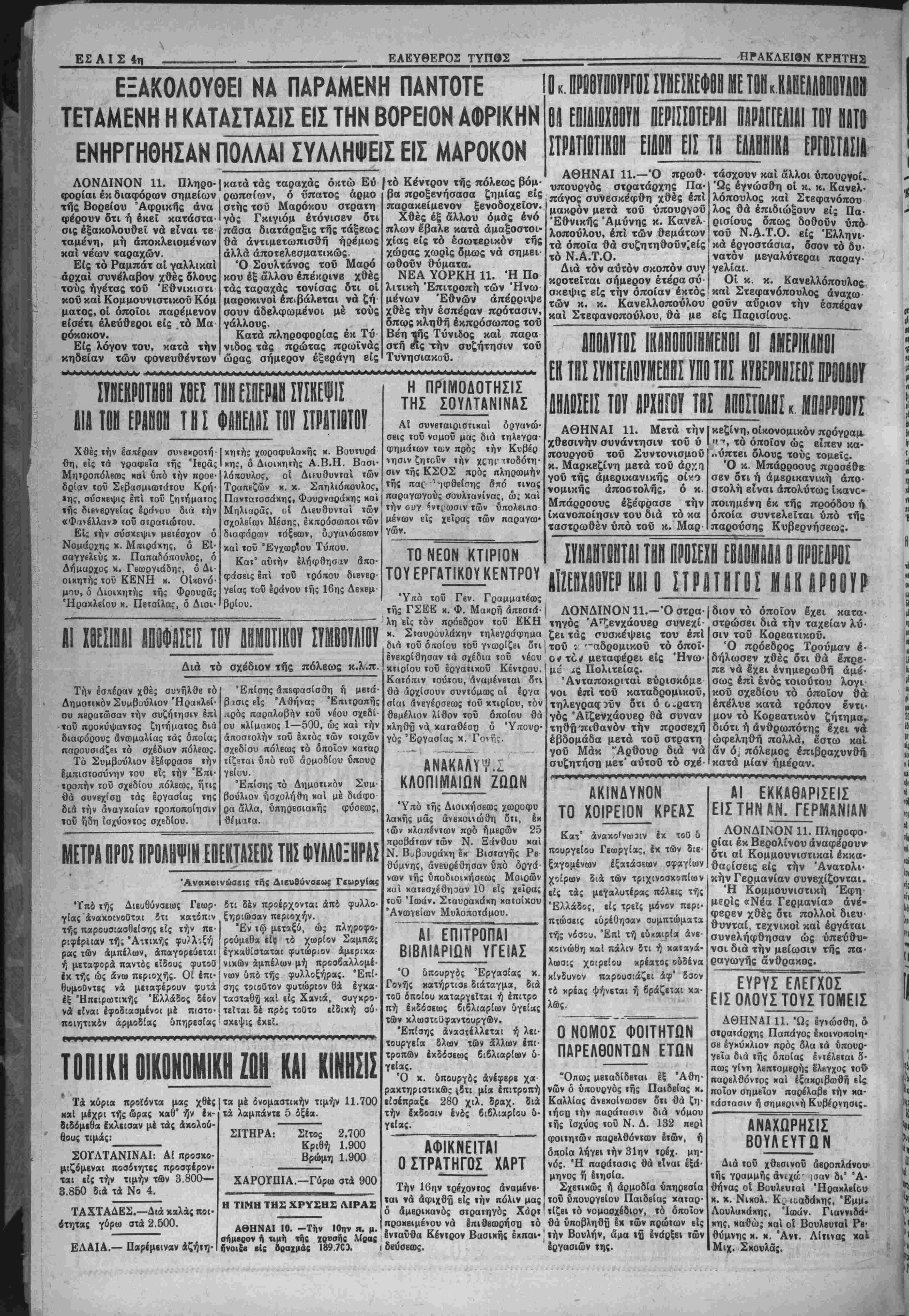 σίαι ανεγέρσεως <οϋ κτιρίου, τόν θβμέλιον λίθον τοΰ όποίου θά κληθϋ νά καταθέση 6 Υπουρ γός Εργασίας κ. Γονης. ΚΛΟΠΙΜΑΙΩΝ ΖΩΩΝ Υπό τής Διοικήσεως χωροφυ λαχής μάς ανεκοινώθη ότι, έκ ΐων κλαπέντων πρό ήμεοών 25 προβάτων των Ν. Ξάνθου «αί Ν. Βυβουράχη Ικ Βισταγή; Ρβ θύμνης, ανευρέθησαν υπό όογά- ναόν τής ύποδιοικήσεως Μοιρών καί κατεσχέθησαν 10 είς χείρας τοϋ Ιωάν. Σταυρακάκτ) χατοίκου Ανωγείων Μυλοποτάμου. "ΑΙ ΕΠΙΤΡΟΠΑΙ ΒΙΒΛΙΑΡΙΩΝ ΥΓΕΙΑΣ Ό δπουργδς Εργασίας κ. Γονής κατήρτισε διάταγμα, διά τοϋ δποίου καιαργεΐται ή έπιτρο πή εκδόσεως βιβλιαρίων υγείας των κλωοτιϋφαντουργων. Έπίσης άναστέλλΐται ή λει- τουργεία δλων των ά*λλων επι¬ τροπών εκδόσεως βιβλιαρίων 5- γ*ί-ς. Ό κ. ύπουργδς άνέφερε χά ρακτηριστικώς (δτι μία έπιτροπή είσέπραξε 280 χιλ. δραχ. διά την έκδοσιν ενός βιβλιαρίου &· γείας. ΑΦΙΚΝΕΙΤΑΙ Ο ΣΤΡΑΤΗΓΟΣ ΧΑΡΤ Την 16ην τρέχοντος άναμένβ· ται νά αφιχθή είς την πόλιν μας δ αμβρικανός στραιηγός Χάρτ προκειμένου νά Ιπιθβωοήσυ τό ενταύθα Κέντρον Βασικής έχπαι· δύ ΑΘΗΝΑΙ 11.—Ό πρωθ- υπουργός στρατάρχης Πα· πάγος συνεσκέφθη χθές επί μακρόν μετά τοΰ ύπουργοΰ Έθνικής Αμύνης κ. Κανελ λοπούλου, επί των θεμάτων τα όποϊα θά συζητηθοΰν|βίς τό Ν.Α.Τ.Ο. Διά τόν αυτόν σκοπόν συγ κροτεΐται σήμερον έτερα συ· σκέψις είς την οποίαν έκτός! των κ. κ. Κανελλοπούλου καί Στεφανοπούλου, θά με τάσχουν καί άλλοι ύπουργοί. 'Ως εγνώσθη οί κ. κ. Κανβλ- λόπουλος καί Στεφανόπου λος θά έπιδιώξουν είς Πα¬ ρισίους δπως δοθούν ύπά τοΰ Ν.Α.Τ.Ο. βίς Έλληνι- κά έργοστάσια, δσον τό δυ¬ νατόν μεγαλύτεραι παραγ¬ γελίαι. Οί κ. κ. Κανβλλόπουλος καί Στεφανόπουλος άναχω- ροΰν αυριον την εσπέραν είς Παρισίους. ΕΚ ΤΙΣ ΙΪΝΪΕΛίΥΜΕιΐρθ Ι ΟΗΑβΣΕΙΣ ΤΟΥ βΡΧΗΓΟΥ ΤΗΣ ΑΠΟΣΤΟΛΑΊ«. ΙΙΙΡΗΠΖ ΑΘΗΝΑΙ 11. Μετά την χθεσινήν συνάντησιν τοΰ υ πουργοϋ τοϋ Συντονισμοΰ κ. Μαρκεζίνη μετά τοϋ άρχη γοΰ τής άμερικανικής οίνο νομικής άποστολής, ό κ. Μπάρροους εξέφρασε την ικανοποίησιν τού διά τό κα ταστρωθέν υπό τοΰ κ. Μαρ κεζίνη,οικονομικόν πρόγραμ "Λ τό οποίον ώς είπεν κα· >νύπτει δλους τούς τομεϊς.