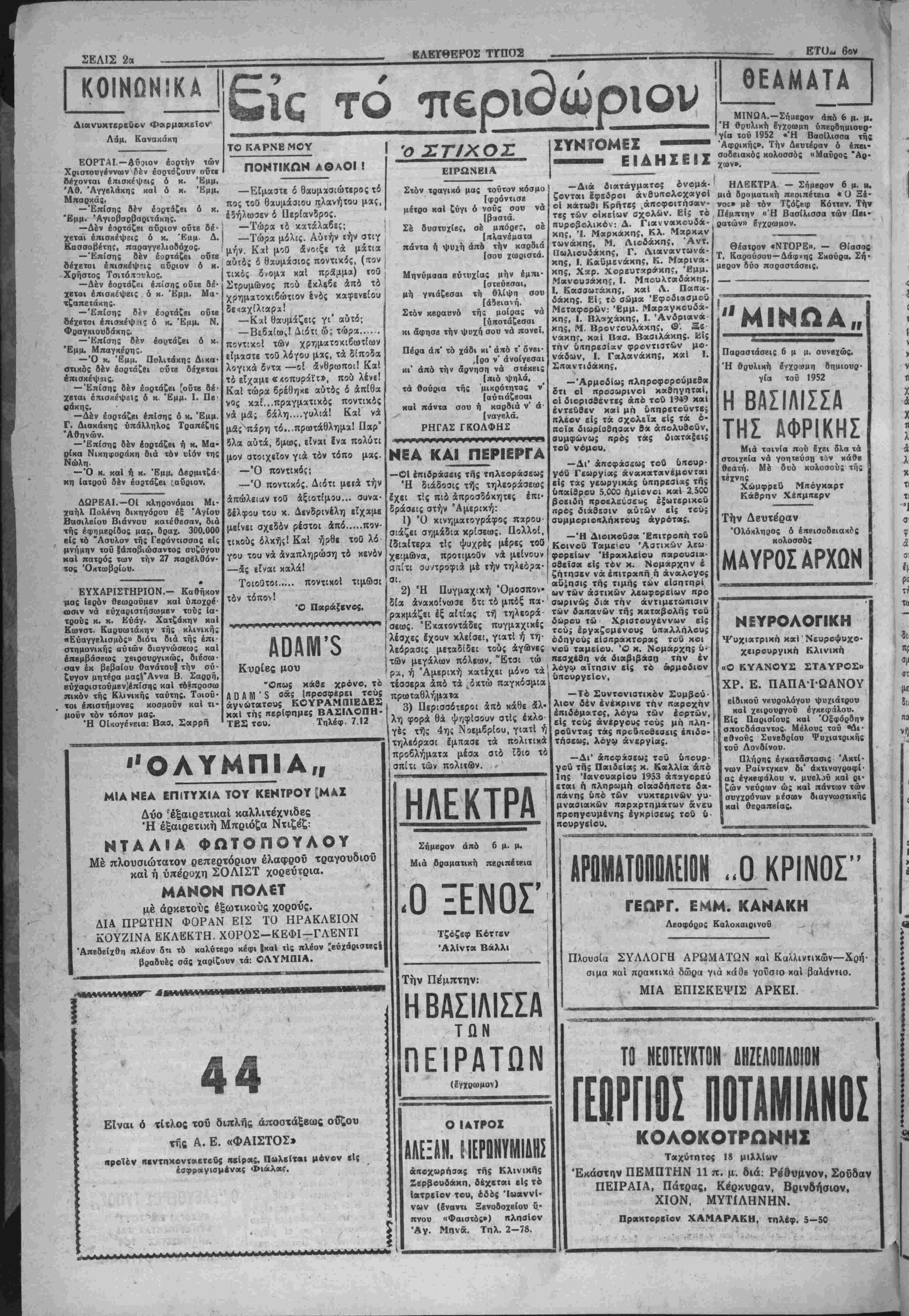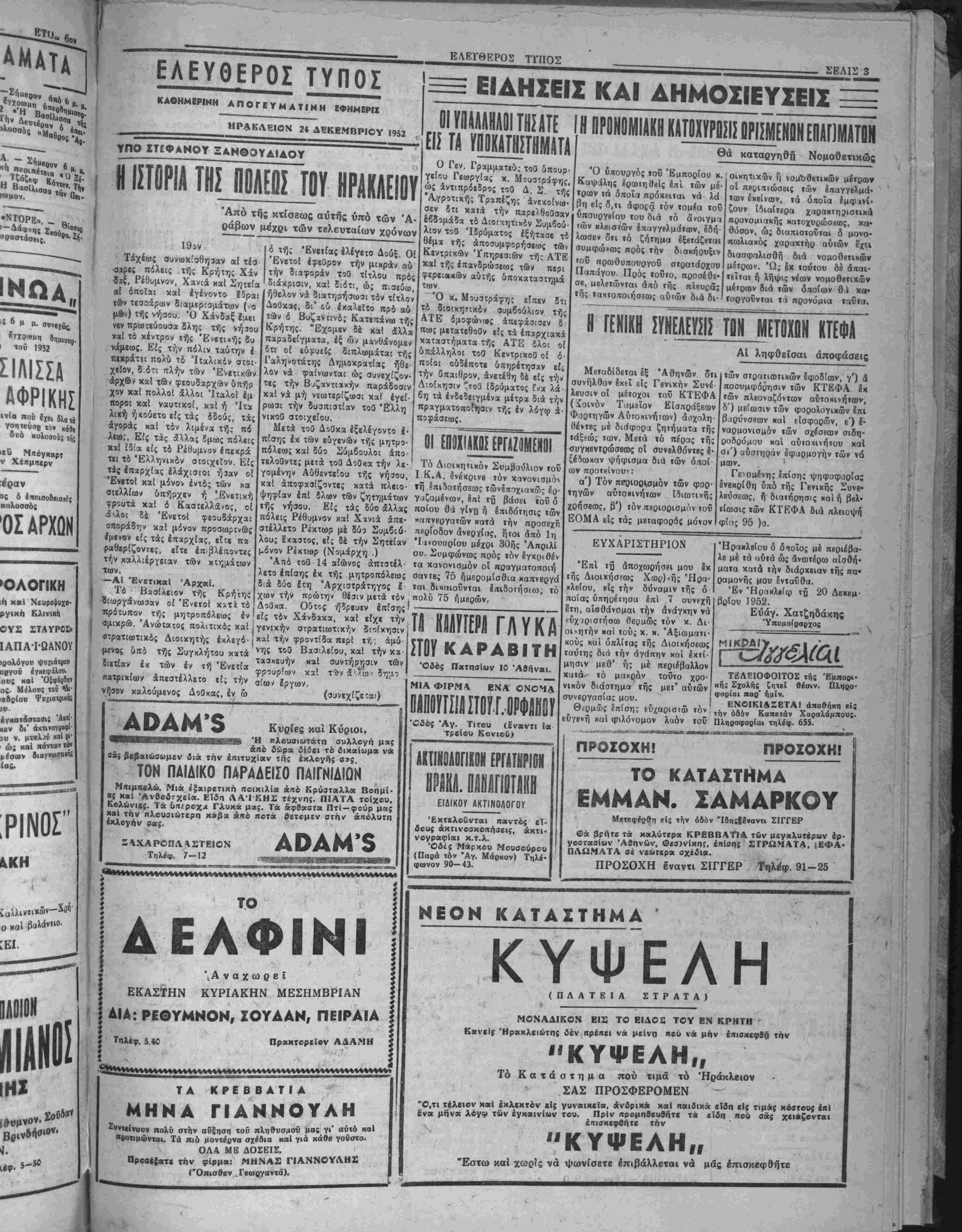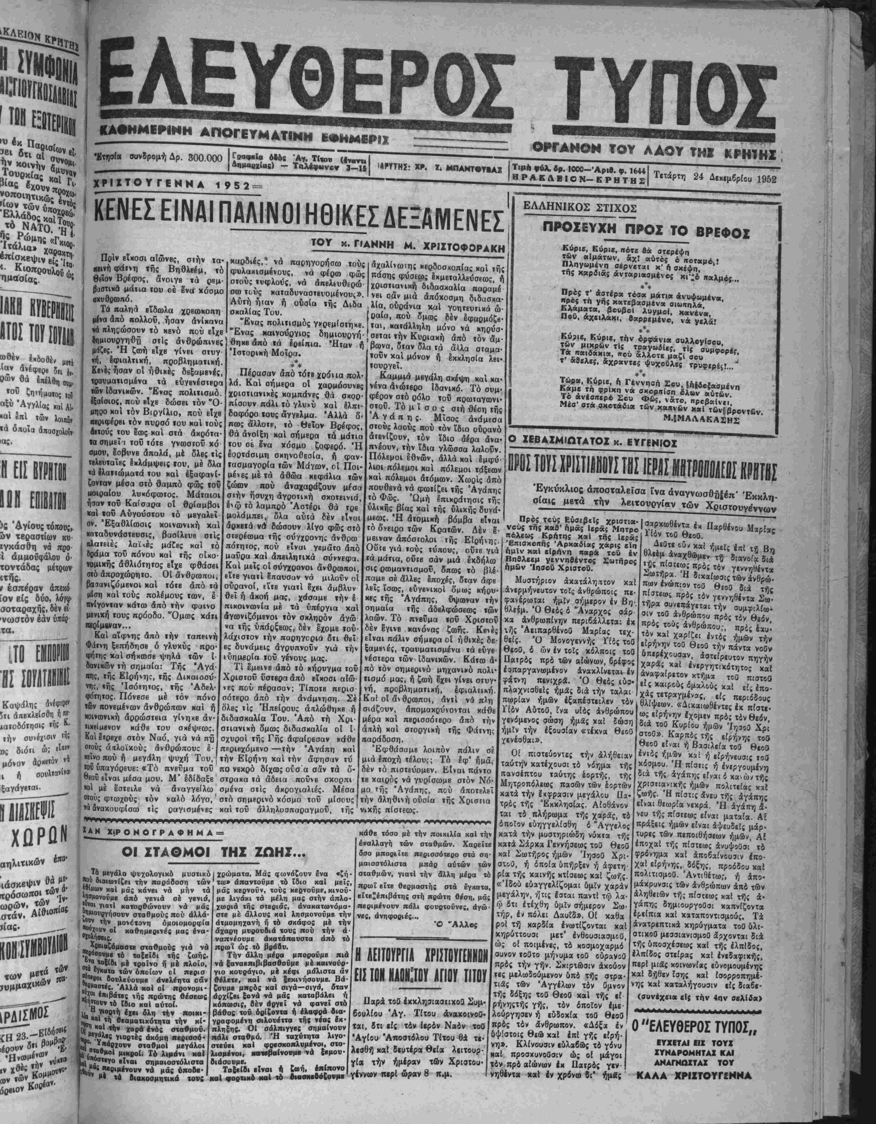 μόνον <5ο«τον ν* σουλιανίν* ΧΟΡΟΝ αηλιτικών Ίάσκβψιν ΜΚ ό '' ΕΛΕΥΘΕΡΟΓ ΤΥΠΟΣ ΚΑ·ΗΜΕΡΙΝΗ ΑΠΟΓΕΥΜΑΤΙΜΗ συνδρομή Δρ. 300 000 Γοαφεία 6Ι6ς Δί Τί~« φ 6Ι6ς Αγ. Τί« (ε, Δημαοχίας) — Τηλεφιινεν 3—19 ΟΡΓΑΝΟΝ ΤΟΥ ΛΑΟΥ ΤΗΙ ΚΡΗΤΗΣ Ι*·ΥΤΗΣ: XI». Τ, ΜΠΑΝΤΟΤΒΑΖ ΧΡΙΙΤΟΥΓΕΗΝΑ 1952 Τιμίι ·υλ. 6ο. ΙΟΟΟ-Άριβ. φ. 1644 ΗΡΑΚΛΒΙΟΝ-ΚΡΗΤΗΣ Τετάρτη 24 Δεχεμβρίου 1952 ΚΕΝΕΣ ΕΙΝΑΙ ΠΑΛΙΝΟΙΗ8ΙΚΕΣ ΑΕΞΑΜΕΝΕΣ ΤΟΥ κ. ΓΙΑΝΝΗ Μ. ΧΡΙΣΤΟΦΟΡΑΚΗ Πρίν εϊχοσι αίώνες, σιήν τα· «ινή φάτνη τής Βηθλεέμ, »ό θβϊον Βοέφος, άνοιγβ τα ρβμ- βαβτιχά μάτια τού οέ Ινα χόσμο οχυθοωπό. Τα παληά εϊδωλα χοεωχοπη ■ίνα άπό κολλοΰ, ήσαν άνίκανα *ά πληςώσουν τό κενό ποΰ εΐχβ Ιημιουογηθχ) στίς άνθοώπινες ασζες. Ή ζσ)ή είχβ γίνει στυγ ντ), Ιφΐαλτικτ), προβληματιχή. Κινές ήσαν οί ήθιχές δεξαμενές ιοαυματισμένα τα εύγβνέσιιθΓ «ών ϊδανιχών. Έ ν άς πολιτισμό Ιξαίσιος, πού εΐχε δώσει τόν Ό μηοο κπί τόν Βιργίλιο, πού είχβ κβοιςρέοει τόν πυρσό τού καΐ τού; Ιβτούς τού Ια>ς καί στά άχοότα