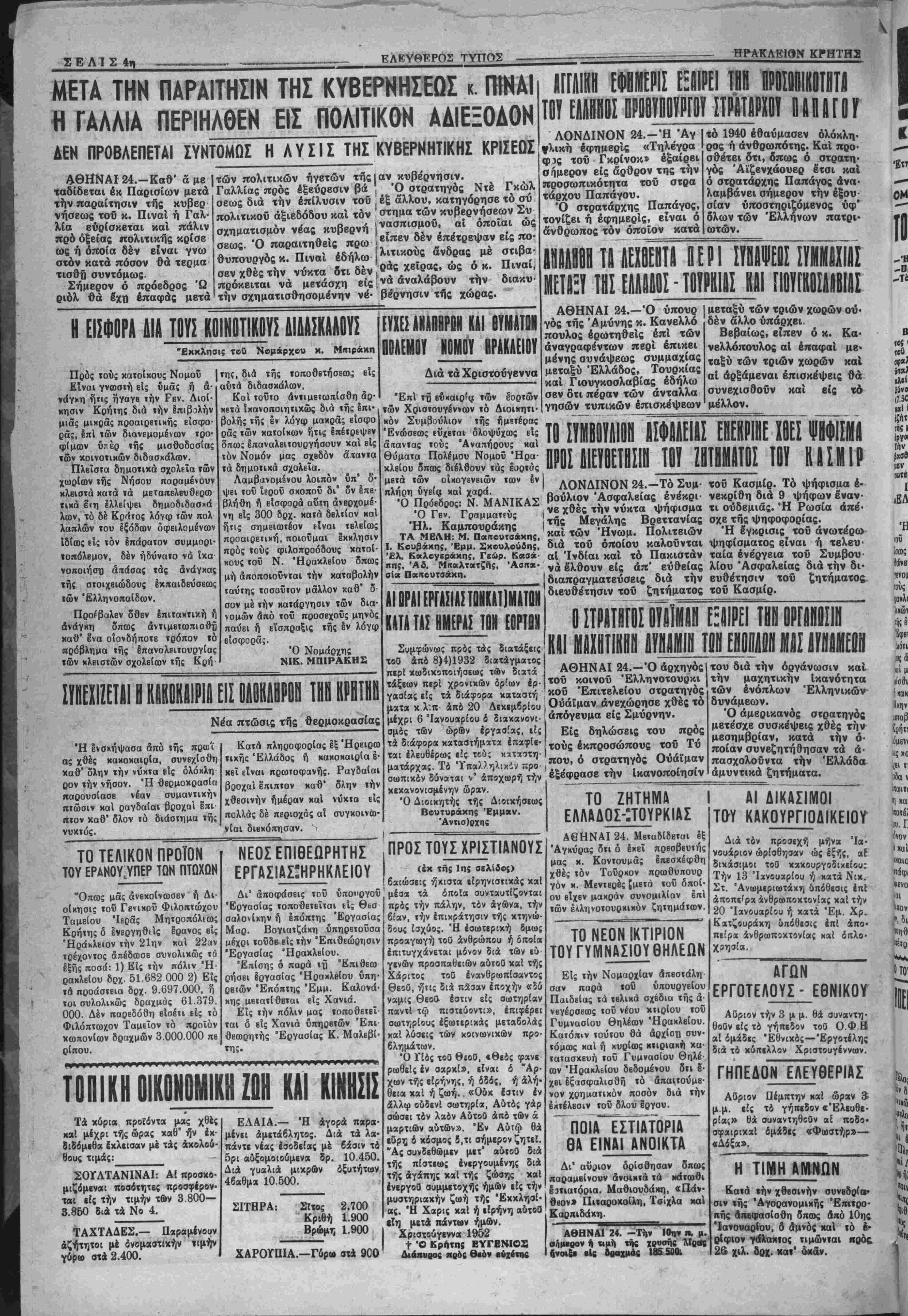 νομών <5πό τοΰ προσεχούς μηνός παύει ή είσπραξις της έν λόγω εϊσφορά;. Ό Νομάοχης ΝΙΚ. ΜΠΙΡΑΚΗΣ ΕΥΧΕ2 ΑΝΑΠΗΡΟΝ ΚΑ! ΘΥΜΑΤΟΝ ΠΟΛΕΜΟΥ ΗΟΜΟΥ ΗΡΑΚΛΕΙΟΥ Διά τα Χριστούγεννα ΣϊπΈαΊΖΕΪΙΙ Β ΚΑΚΒΚαΐΡΙΑ ΕΙΣ ΟΛΟΚΛαΡΟιΊ ΤΗΝ ΚΡΗΤΑ! Νε'α πτώσις τής θερμοκρασίας Ή ενσχήψασα άπό τής πρωΐ άς χθές κακοκαιοία, συνεχισθή καθ9 όλην την νύκτα είς όλόκλη ρον την νήσον. Ή θβρμοκρααία καοουσίασε νέαν συμανιική» πτώσιν καί ραγδαίαι βροχαΐ επι ητον καθ9 όλον τό διάοιημα τής νυκτός. Κατά πληροφορίας έξ Ήρειρω τικής Ελλάδος ή κακοκαιρία έ- κεΐ είναι πρωτοφανές. ΡαγδαΙαι βοοχαί έπιπτον καθ" δλην την χθεσινήν ημέραν καί νύκτα είς πολλάς δέ περιοχάς αί συγχοινω· νίαι διεκόπησαν. "Επί τ^ εύκαιρίςι των έορτών των Χριστουγέννων τό Διοικητι· χον Συμβούλιον τής ήμβτέρας Ενώσεως Ευχβται ολοψύχως είς άπαντας τούς "Αναπήρους καί Θυματα Πολέμου Ν ομού Ηρα¬ κλείου όπως διέλθουν τάς εορτάς μβτά των οίκογενειών των έν πλήρη ύγεία χαί χαρά. Ό Πρόβδρος: Ν. ΜΑΝΙΚΑΣ Ό Γεν. Γραμματεύς Ηλ. Καμπουράκης ΤΑ ΝΒΛΗ: Μ. □απουτσάκης, Ι. Κβυβάκης, Έμμ. Σκοολβύδης, 'Ελ. Καλβγβράκη;, Γεώρ. Κασά< πης, Ά δ. Μηαλτατζής, Άσπα· σία Πακουτσάκη. ΑΙ ΩΡΑΙ ΕΡΓΑΣΙΑΣ ΙΩΝΚΑΤΙΜΑΤΟΝ ΚΑΤΑ ΤΑΣ ΗΜΕΡΑΣ ΤΩΝ ΕΟΡΤΟΧ Συμφώνως πρός τάς διατάξεΐς τοθ άπό 8)4)1932 διατάγματος περί κωδικοποιήσεως των δΐατά τάξεων περί χρονικών δρίων ερ¬ γασίας είς τα διάφορα καταστή ματα κ λ".π άπό 20 Δεκεμβριού μέχρι 6 Ίανουαρίου δ διαχανονι- σμός των ώρων εργασίας, εί; τα διάφορα κατασχήματα έπαφίε- ται έλευθέρω; είς τοδς καταστή- ματάρχας. Τό 'ϊπα/ληλικί,ν προ σωπικόν δύναται ν9 άποχωρή την κεκανονισμένην ώραν. Ό Διοικητής τής Διοικήσεως Βουτυράκης Έμμαν. Άντισ)ρχτις ΑΓΓΑΙΗΗ ΕΦΗΜΕΡΙΣ ΕΞΙΙΡΕΙ ΤΗΗ ΠΡ0Ι0Π1Κ0ΤΗΤΛ ΤΟΥ ΕΑΑΗΙΙΟΣ ΠΡΒΟΤΙΙΟΤΡΓΟΤ ΣΤΐΓλΤΙΡΧΟΥ Π Α Π1Γ Ο Υ ΛΟΝΔΙΝΟΝ 24.-Ή Αγ ο/λική εφημερίς «Τηλέγρα αος τοΰ Γκρίνοκ» εξαίρει σημερον είς άρθρον της την προσωπικότητα τοΰ στρα τάρχου Παπάγου. Ό στρατάρχης Παπάγος, τονίζει ή εφημερίς, είναι ό άνθρωπος τόν οποίον κατά «ό 1940 έθαύμασεν όλόκλη. ρος ή ανθρωπότης. Καί προ· σθέτει ότι, δπως ό στρατη¬ γός 'Αί'ζβνχάουερ έτσι καί ό στρατάρχης Παπάγος άνα- λαμβάνει σήμερον την έξου οίαν ύποστηριζόμενος ύφ* δλων των Έλλήνων πατρι· ωτών. Α1ΙΒΑΒΒΗ ΤΑ ΑΕΧΘΕΙ1ΤΑ Π Ε ΡΙ ΠΙΝΗΙΥΜΜΑΙΙΑΙ ΜΕΤΑ:Υ ΤΗΣ ΕΑΑΑΑΟΙ - Τ0ΥΡΚ1ΙΣ Κ1Ι ΠΟΥΓΗΟΙΑβΒΙλΣ ΑΘΗΝΑΙ 24.—Ό υπουρ γός τής "Αμύνης κ. Κανελλό πουλος ερωτηθείς επί των άναγραφέντων πβρί έπικει μένης συνάψεως συμμαχίας μβταξύ Ελλάδος, Τουρκίας καί Γιουγκοσλαβίας έδήλω σεν ότι πέραν των άνταλλα γησών τυπικών έπισκέψεων Ι μβταξύ των τριών χωρών ού· δέν αλλο ύπάρχει. Βββαίως, είπεν ό κ. Κα· νελλόπουλος αί έπαφαί με· ταξύ των τριών χωρών καί αί αρξάμεναι έπισκέψεις θά συνεχισθοΰν καί είς τό μέλλον. ΤΟ ΠΜΒΟΥΛΙΟΜ ΑΣΦΑΛΕΙΑΣ ΕΗΕΗΡΙΗΕ ΧΟΕΣ 1ΦΙΕΜ1 ΠΡΟΣ Α1ΕΥΒΕΤΗΣΙΗ ΤΟΥ 2ΗΤΗΜΑΤ0Ι ΤΟΥ ΚΙΣΗΙΡ ΛΟΝΔΙΝΟΝ 24.-ΤΟ Συμ¬ βούλιον Ασφαλείας ένέκρι νέ χθές την νύκτα ψήφισμα τής Μεγάλης Βρεττανίας καί των Ήνωμ. Πολιτειών διά τοΰ όποίου καλοΰνται αί Ίνδίαι καί τό Πακιστάν νά έλθουν είς άπ' εύθείας διαπραγματεύσεις διά την διευθέτησιν τοΰ ζητήματος «ου Κασμίρ. Τό ψήφισμα ε¬ νεκρίθη διά 9 ψήφων έναν¬ τι ούδεμιάς. Ή Ρωσία άπέ· σχε τής ψηφοφορίας. Ή έγκρισις τοΰ ανωτέρω ψηφίσματος είναι ή τελευ¬ ταία ενεργεια τοϋ Συμβου λίου Ασφαλείας διά την δι· ευθέτησιν τοΰ ζητήματος τοΰ Κασμίρ. Ο ΣΤΡΑΤΗΓΟΣ ΟΥΑΐΜΑΙΙ ΕΞΑΙΡΕΙ ΤΗΗ ΟΡΓΙΗΟΙΙΗ ΚΑΙ ΜΑΧΟΤΙΚΒΗ ΑΥΗΑΜΙΙΙΤ0Η ΕηθΠΑ&η ΗΑΣ βΠΤΑΜΕΟΙΙ ΑΘΗΝΑΙ 24.-Ό άρχηγός τοΰ κοινοΰ Έλληνοτουρκι κου Έπιτελείου 