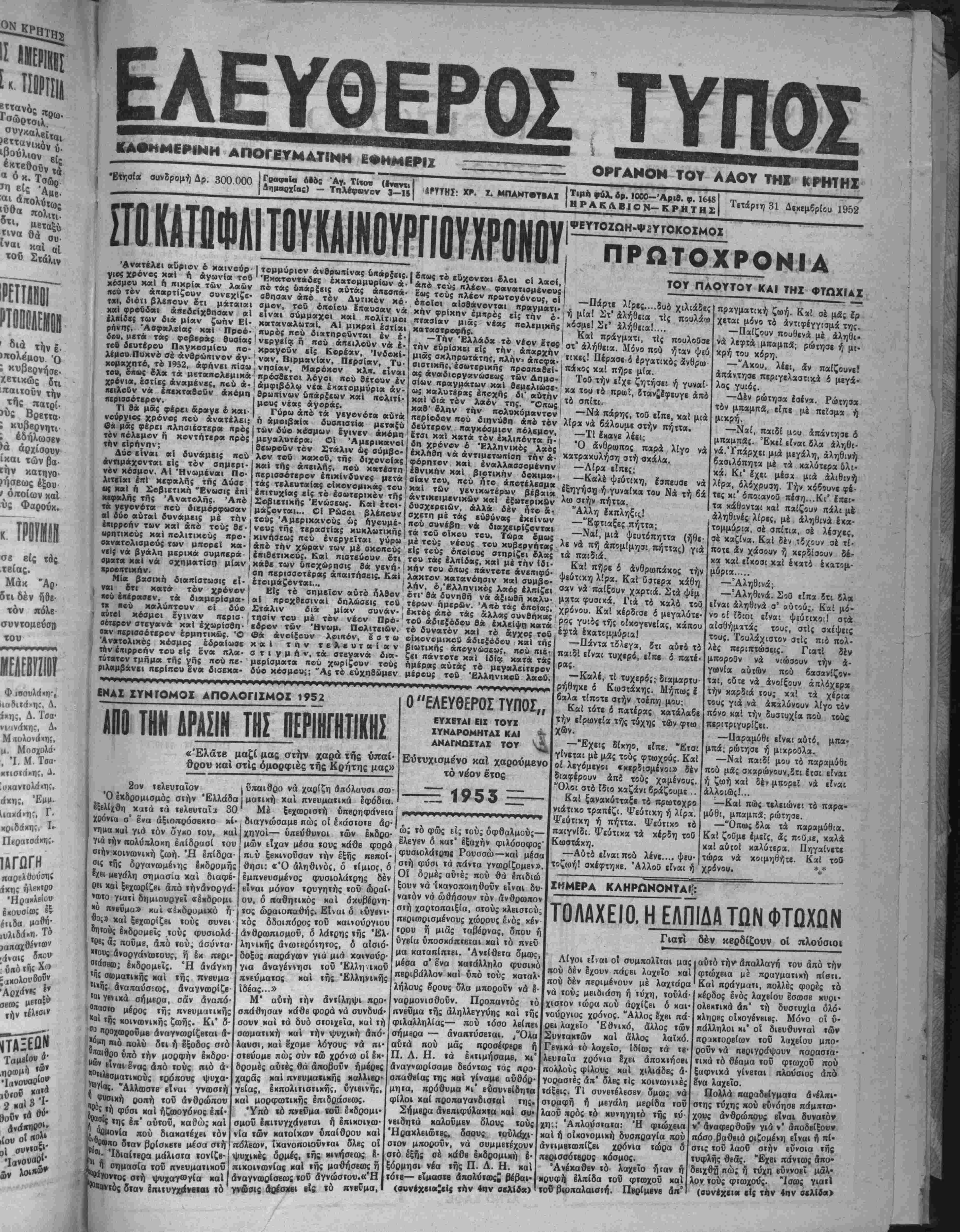 ίου, μετά τάς φοβεράς θυαίας < νεργϊία η πού άπίΐλοΰν νά έ- τού δίυτίρου Παγκοσμίου «ο- κρκνοΰν είς Κορέαν, Ίνδοχί- ΤΟΥ ΠΑΟΥΤΟΥ ΚΑΙ ΤΗΣ ΦΤΩΧΙΑΖ οί _ χ«ι διά ίλην λέμου Πυχνό σέ ανθρώπινον άγ· | ν«ν, Βιρμανίαν, Πβρσίαν, Τυ· χομαχητό, τό 1952. άφήνει «ίσω , νησίαν, Μ«ρόχον κλπ. βΐναι το», ό'τως ίλα τα μετκπολεμιχά , κρόσθβτοι λογοι ποΰ θβτουν έν χρόνια, έατίες άναμένες, πού ά-; άμφιββλω νία έχατομμύρια άν- κειλοΰν νά έπΐκταθοΰν άκόμη θρωπίνων ύπάρ£εων καί πολιτί- «ερισσότβρον. Ι μους νεας «γοράς. ΤΙ βά μας φέρει αραγβ 6 και· | Γύρω άπό τα γεγονύτκ αύτά νβύργιος χρόνβς που άν«τέλεΐ; ή άμοιβ«ί« δυσπιστία μεταξύ_____„. ,„ Ο* μάς φέρει πλησιέστερα πρός | των δύο κέσμων έγινεν άκόμη ' ί;τβι καί κατά τόν τόνηόλΐμονή κοντήτϊροι πρός ' μεγαλυτέρ*. Οί Άμΐρικανοί δή χρόνον έ Ελληνικάς πτασίαν μια; καταστρβφής. λίρες,.,.δυδ χιλιάδας 1»Ίί1 ι Λζ τό "' «««}«· πράγματι, τίς πουλοθσε μια; σκληρωτάτηί, πλήν»___Τ_ σιστικης, έσωτερικής προσπαθΐί- «ς άναδιοργανώαϊ«ς των Δημο¬ σίαν πραγμάτων καί θ ϊΐχες! Πέρασε ί Ιργατιχάς «νθρω πάχος καί πήρε μία. Τοθ την ιίχί ζητήσει ή γυναί· την της. Όπως πολοκόμαντον —Νά πάρης, τού είπε, καί μιά πβρίβδβν ηβϋ διηνύθη «πό τόν λίρα νά δάλουμε οχΛν πήττα ;δεοτϊρον παγκόσμιον πόλεμον, —ΤΙ Ι«αινΕ λέ«(· ' την εΙρηνην; Δύο είναι «Ι δυνάμεις άνημάχονται είς τον σπμβρι νόν κόσμον. ΑΙ Ηνωμεναι Πο¬ λιτειαι επί ΧΕφαλής τής Δύθϊ «$ χκι Α Σοβιετική Ένωσις επί κεφαλής τής Ανατολή;. Άπό τα γϊγβνότα ποΰ δΐΒμόρφωσαν α! δύο αυταί δυνάμεις μέ την έκιρρβην των καί άπό τού; θε- «ρητιχβϋς χ«1 πβλιτικού; προ· οανατολισμοΰς των μκορβΐ κα· νιίς να βγάλη μερικά συμπβρά ) ά ί ί ββωρβϋν τόν Στάλιν ώς σύμβο- πού ' λον τοθ κακοϋ, της διχονοίας καί της άτΒΐλπ;, πβύ κατέστη περισσότερον έπικίνδυνος μετά τάς τελευταίας οΙχονομΐΜβΐς τού επιτυχίας εί; τό εσωτερικόν της Ένώσβω;. Καί έτοι· βγ οματα κ«) νά ηροοπτιχήν. μρ μρ σχηματίση μίαν λκός Ό άνθρακος παρά λίγο νά εκλήθη νά άντιιΐίτωηίση την «· «ατρακυλήση στή σκάλα. ό ί έλ Λί η την « Φόρητον καί έναλλασσομβνην νενικ».τέρων βίβ»,« ί ε ήη ή —Λίρα εΐττες- * ί χ«1 των βς { μαζονται... Ο! Ρώσβι βλέπουν τοος Άμβρικανούς ώ; ήγβυμέ- νους τής τεραστία; κυκλωτική; κινήσεω; «βύ ένεργεϊται γύρω ά η ώ έ χ«1 των νενικ».τέρων βίβ»,« νην αντικειμενικήν χαί εξωτερικών Λω σΐήν V _____. ^ «, β _ - ^ . «. .,_ 41 Λ Λ Λ δυσχϊρΐιών, άλλά δέν ήτο &· σχετη μέ τάς ευθύνας έχΐίνων κου συνέβη νά δ τα τοΰ οΐχου τού. μέ τοΰς νέβυς τού κυβερνη'τβς ν. τού Νά τή 6* Αλλη ηξς —Έφτιαξες πήττα; πραγματιχή ζωή. Κα! σέ μίς Ιρ χεται μόνο τί άντιφίγγίσμ» της. — Παίζουν πουθενά μέ άληθι· νά λεφτά μπόμπα"; ρώτησΐ ή μι· κρή τού χόρη. —Άχοιι, λίΐι, δν παίζουνε! ά περιγελαστικ4 ό μέγα· λος γυιός. —Δέν ρώτησα έσέν». Ρώττρχ τόν μπαμπ3, εϊηε μέ πεΓσμα ή μιχρή. —Ναί, παιδί μ^ο άπάντγρε δ Έκιί είναι δλα αλν,θι- άλ ; ργ γρ άπβ την χώρβτν των μέ σκοπούς βΐς τβυ> οιτοϊόυς"στηρΓς"6νδλίί ιά παιδία,