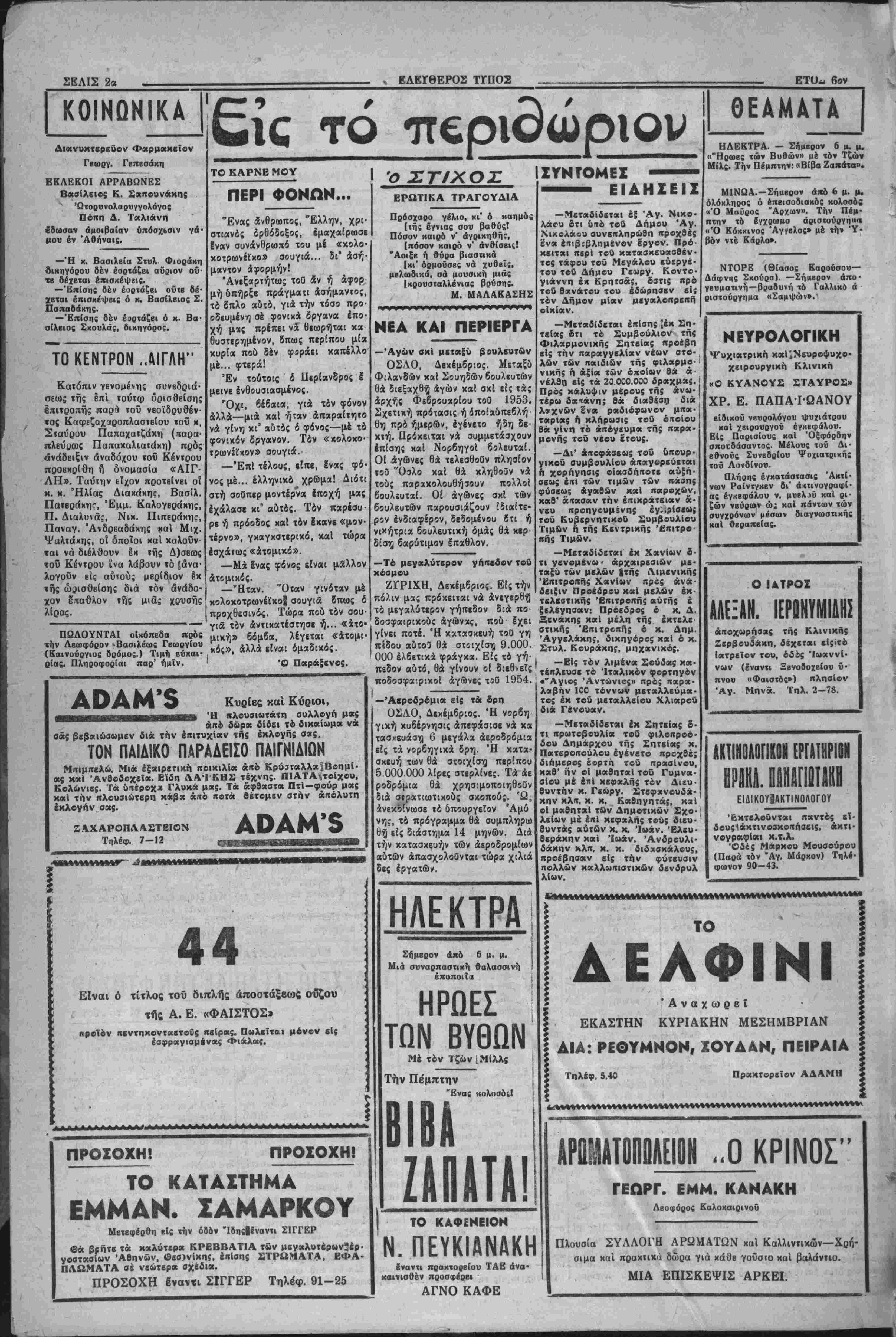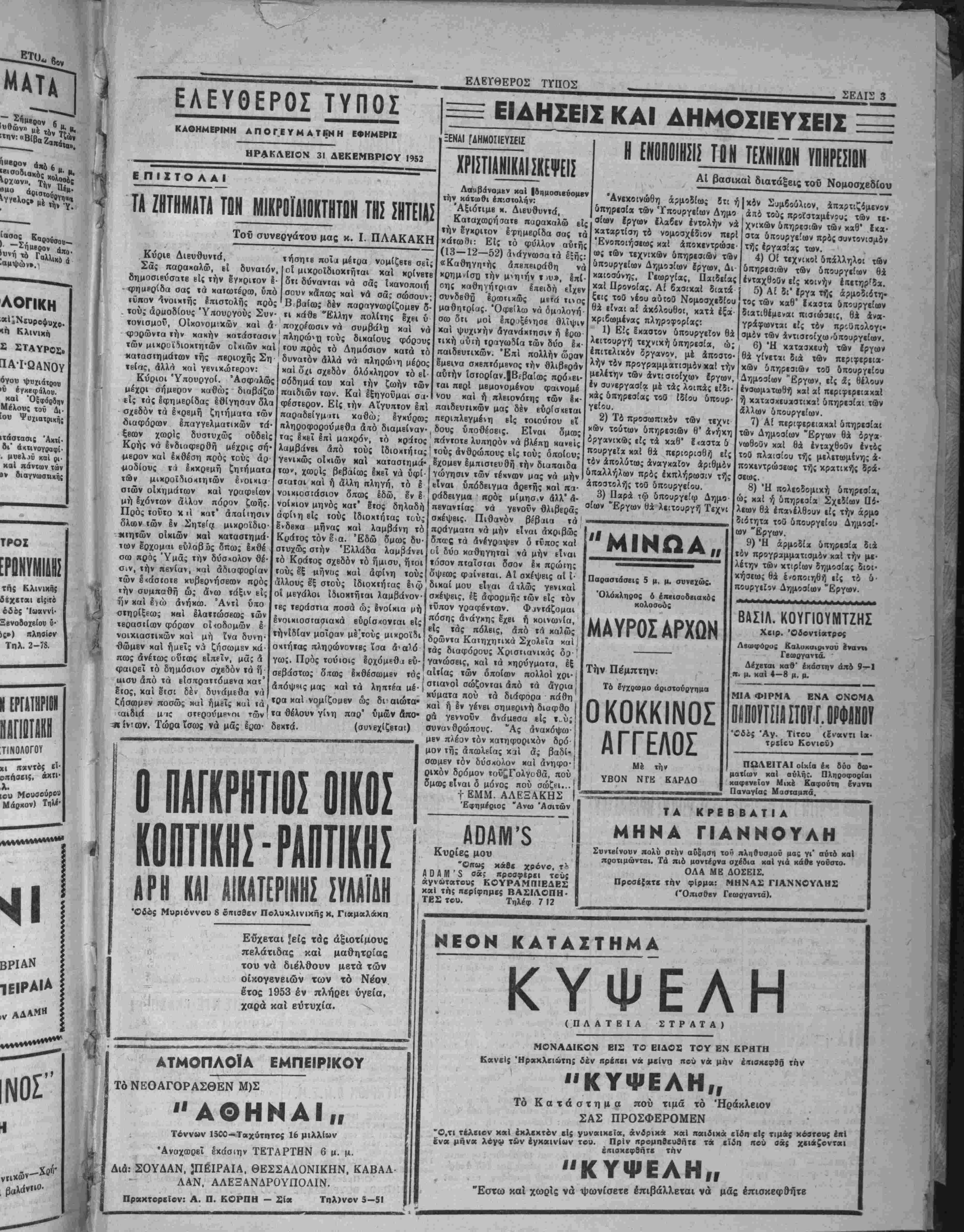 όργανικώς είς τα καθ" 1<αστα δ πουργεΐα κ«ι θά περιορισθή είς τόν απολύτω; αναγκαίαν αριθμόν δπαλλήλων πρό; εκπλήρωσιν τής αποστόλη; τοθ δΐτουργείου. 3) Παρά τψ δηουργείφ Δημο οίων Έργων θα λειτουργή Τεχνι "ΜΙΝΩΑ» Παραστάσει; 5 μ. μ. συνεχώς. Όλόκληρος ό έπεισοδειακ&ς κολοσοός ΜΑΥΡΟΣ ΑΡΧΩΝ Την Πέμπτην: Τό έΎχρωμο άριστούργημα ΟΚΟΚΚΙΝΟΣ ΑΓΓΕΛΟΣ Μέ την ΥΒΟΝ ΝΓΚ ΚΑΡΛΟ τος των καθ" Εκαοτα διατιθίμε»αι ττιστώαεΐς, θα ανα- γράφωνται είς τόν προϋπολογι¬ σμόν τβν άντιστοίχω/υπουργείων. 6) Ή καταβκιυή τ(Βν έργων θά γίνετκι διά των περΐφεριι»· κων δπηρεσιών τοθ δπουργείοιι Δημοσίων "Εργων, είς £; θέλουν ένσωμϊτωθή καί αί πιριφιριιαχαί ή κατασχΐυασΐΐχαί δπηρεσίαι τθν άλλων δπουργείιαν. 7) Αί περιφερειακχί δπηρεαίαι των Δημοοίων "Εργων θα όργα- νωθοθν καί θά ένταχθοθν έντίς τοθ πλαισίου τής μελιτωμίνη; α- ποχεντρώΐειας τής χρατικής δρά¬ σεώς. 8) Ή πολεοδομιχή δπηρεαία, ώ; καί ή δπηρεαία Σχείίων Πό¬ λεων θά έπανέλθίυν είς την άρμο διόΐητα τβθ δπουργείου Δημοσί¬ ων "Εργων. 9) Ή αρμοδία δπηρεσία δια τόν προγραμματισμόν καί την με¬ λέτην των χτιρίων δημοσίας διοι¬ κήσεως θά ένοποιηθή είς τό ύ· πουργιΐιν Δημοσίων "Εργων. ΒΑΣΙΛ. ΚΟΥΓΙΟΥΜΤΖΗΣ Χβιρ. Όδοντίατρβί Λβωφόρϋς &αλυκαι0ΐνου ίναντ» Γεωργαντά. Δέχεται καθ* εκάστην άπ5 9—1 «ι. μ. χαί 4—8 μ. μ, ΜΙΑ Φ1ΡΜΛ ΒΝΛ ΟΝΟΜΑ βίΠΟΠίίίϊΙΟΪΓ.ΟΡΦίίίϋϊ Άν- Τίτου (έναντι Ιβ· ί Κβνιοϋ) ΠαΕΙΤΑΙ οίκία έκ δύο οω- ματίων χαί ούλήί. Πληροφορίαι χαφενκίον Μιχέ Καφούτη Εναντι Παναγίας Μασταμπά. ΑϋΑΜ'3 Κυρίες μου Όπως κάθί χρόνβ, τ'- Α Ώ Α Μ ' 5 σά; ηροσφερει τούς άγνωτατους ΚΟΥΡΑΜΠΙΕΔΕΣ καί τή; ηερΐφημες ΒΑΣΙΛΟΠΗ- ΤΕΣ τού. Τηλέφ 7 12 ΤΑ ΚΡΕ Β ΒΑΤΙΑ ΜΗΝΛ ΓΙΑΝΝΟΥΛΗ Συντβίνουν πολύ σΐήν αύξηβη το» πληθυσμοϋ μαςγι' αύτ6 κα! προτιμώνται. Τα πιό μοντέρνα σχέοια καί γιά κάβε γούστο. ΟΛΑ ΜΕ ΔΟΣΕΙΣ. Προ0έ{«τ< τίιν φίρμα: ΜΗΝΑΣ ΓΙΑΝΝΟΥΛΗ2 (Όπισθβν Γεωργαντά), ΑΤΜΟΠΛΟΪΑ ΕΜΠΕΙΡΙΚΟΥ Τό ΝΕΟΑΓΟΡΑΣΘΕΝ Μ)Σ "ΑΘΗΝΑΙ,, Τόννων 1500-Ταχότπτβς 16 μιλλίων •Αναχωρεί εχάσιην ΤΕΤΑΡΤΗΝ 6 μ. μ. Διά: ΣΟΥΔΑΝ, ΠΕΙΡΑΙΑ, ΘΕΣΣΑΛΟΝΙΚΗΝ, ΚΑΒΑΛ- ΛΑΝ, ΑΛΕΞΑΝΔΡΟΥΠΟΛΙΝ. ΠραΝΤβρεϊον: Α. Π. ΚΟΡΠΗ - 2ί« Τπλ)νον 5-51 ΝΕΟΝ ΚΑΤΑΣΤΗΜΑ ΚΥΨΕΛΗ (ΠΛΑΤΕΙΑ ΣΤΡΑΤΑ) ΜΟΝΑΔΙΚΟΝ ΕΙ2 ΤΟ ΕΙΔΟ8 ΤΟΥ ΕΝ ΚΡΗΤΗ ΚβινεΙς Ήρακλίΐώτηί ίέν ηρίιτβι ν» μείνη Λού ν* μην έιτισ*«»9π "ΚΥΨΕΛΗ,, Τό Κατάστημα πού τιμά τό Ηράκλειον ΣΑΣ ΠΡΟΣΦΕΡΟΜΕΝ "ΚΥΨΕΛΗ,, Έστω καί χωρίς νά ψωνίσβτβ έπιβάλλεται νά μάς επισκεφθήτε