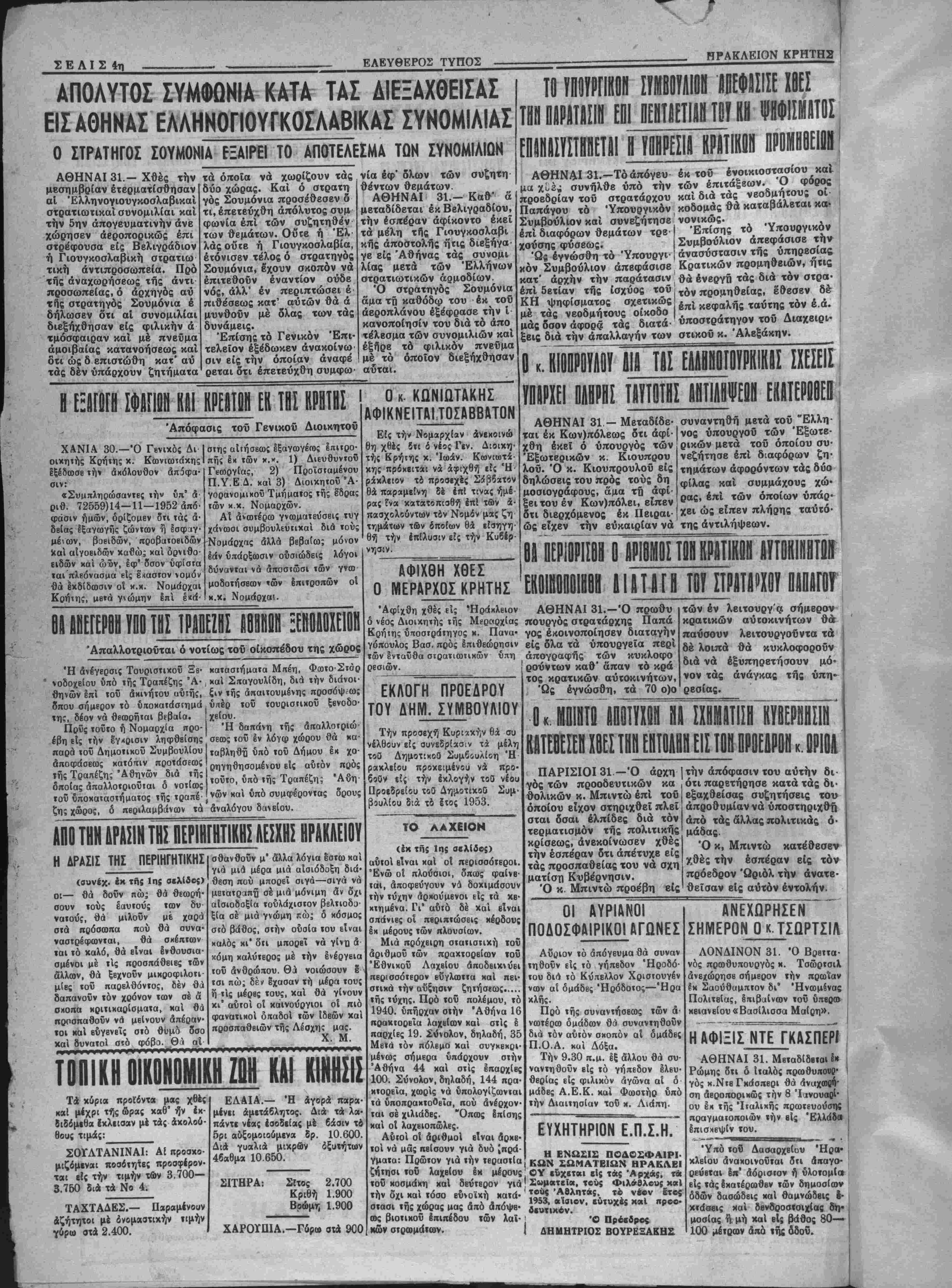 μέ<ων, βαβιδών, προβατοειδών καί αΐγοειδώ,ν καϋώ; χαί δρνιθο- ειδών καί ώϋν, έφ' δσον ύφΐσια ται πλεόνασμα είς Ιχαστον νομόν θά έκδίδοοσιν οΐ κ.κ. Νομάρχαι —Ο*ίττις, μβτά γνώμην §πί ε*ά· σ«ης αίιήσεως εξαγωγέτος έπΐΐρο- πής εκ των κ.*. 1) Διευθυντού Γεωργίας, 2) Προϊσίαμένου Π.Υ.Ε Δ. και 3) Διοικητοΰ *Α· γορανομιχοϋ Τμήμαΐος τής έ'δρας των χ.κ. Νομαρχών. ΑΙ ανωτέρω γνωματεύσεις τυγ χάνωσι συμβουλευιιχαί διά «ούς Νομάρχας άλλά βεβαία); μόνον εάν ύπάρξωσιν ούσιώδεις λόγοι δύνανται νά αποστώσι των γνω μοδοτησβων <ων επιτροπών οί Η.κ. Νομάρχαι. 8» ί1Μ ΪΡ0ΙΗΠΡΜ Μ8Κ Άπαλλοτριοΰται ό νοτίως τοϋ οίκοπέδου της χώρος Ή ανέγερσις Τουριστικοΰ Ξβ· νοδοχβίου υπό τής Τραπέζης Α¬ θηνών επί τοΰ ακινήτου αυτής, δπου σήμερον τό ύποκατάστημά της, δέον νά θεοοοήται βεβαία. Πονς τουτο ή Νομαρχία προ¬ έβη είς την έγκρισιν ληφθβίσης παρά τού Δημοιικοΰ Συμβουλίου αποφάσεως κατόιιν προτάσεως ΐής Τραπέζης Αθηνών διά τής οποίας άπαλλοτριοΰιαι δ νοΐίως ι οί ΰποχαιαστήματος τής τραπέ' ζή; χώρος, 6 πΒριλαμβιίνων τα κατασιήματα Μπέη, ΦωτοΣτάρ , καί Σίΐαγουλίδη, διά την διάνοι ξιν τής απαιτουμένης προσόψ,ως ,ύπέρ τοΰ τουρισΐιχοϋ ξενοδο χείου. Ή δαπάντι τής άπαλλοτριώ σεως τοΰ §ν λόγφ χώρου θά χα- ταβληθΐ υπό τοΰ Δήμου έκ χο ρηγηθησομένου είς αυτόν πρός τουτο, υπό τής Τραπέζη; Άθη νών χαί υπό συμφέροντας δρους άναλόγου δανείου. Ι Ο κ. ΚΩΝΙΩΤΑΚΗΣ ΑΦΙΚΝΕΙΤΑΙ ΤΟΣΑΒΒΑΤΟΝ Είς την Νομαρχίαν άνεχοινώ θη χθές δτι ά νέος Γεν. Διοιχη· τής Κρήτης κ. Ιωάν. Κωνΐιοτά- κης πρόχίΐτάι νά αφιχθή" είς Έ ράκλεΐον τό προσεχές Σάββατον θά παραμείνη δέ επί τινάς ήμέ ρας Γνα κατατ.οπιοθή' επί των ά· πασχολούντων τόν Νομόν μας ζή τημάτων των οποίων θά εισηγη¬ θή την επίλυσιν είς την Κυβέρ¬ νησιν. ΑΦΙΧθΓχΪΕΣ Ο ΜΕΡΑΡΧΟΣ ΚΡΗΤΗΣ Αφιχθη χθές εις "Ηράκλειον 6 νέος Διοικητής τής Μβραοχίας Κρήτης ΰποστραΊηγος μ. Πανα· γόπουλος Βασ. πρός επιθεώρησιν των ενταύθα στρατιωτικών ύπη ρεσιών. ΑΠΟ ΤΗΗ 1ΡΑΣΙΝ ΤΗΣ ΠΕΡΙΗΤΗΤΙΚΗΣ ΑΕΣΚΗΣ ΗΡΑΚΛΕΙΟΥ Η ΔΡΑΣΙΣ ΤΗΣ ΠΕΡΙΗΓΗΤΑΙ (σονίχ. έκ της 1ης σβλίδο;) οί— θά δοΰν πώ; θά θεωρή- σουν τούς εαυτούς των δυ¬ νατόν;, θά μιλοΰν μέ χαρά οτά πρόσοοπα πού θά συνα* ναστρέφωνται, θά σκέπτων «αι τό καλό, θά είναι Ινθουσια· σμένοι μέ τίς προσπάθβιες των άλλαν, θά ξεχνοϋν μικροφιλοτι- μ!ες τοΰ παοελθόντος, δέν θά οαπανοϋν τόν χρόνον των σέ ά σκοπα κριτικαρίσματα, καί θά προσπαΰοΰν νά μεΐνουν άπέραν· ΐοι καί βΰγενβΐς σιό θυμο δσο χαί δύναται στό φόβο. ΘΊ αί σθανθοΰν μ' άλλα λόγια έστω χαί γιά μιά μερά μιά αίσιόδοξη διά θέση πού μπορεϊ σιγά—σιγά νά μδΐατραπβ σέ μιά μόνιμη άν δχι αίσιοδαξία τουλάχιστον βελτιοδϋ ξία σέ μιά γνώμη πώ; δ χόσμος στό βάθος, στήν ούοία τού είναι χαλός κι' δτι μπορβΐ νά γίντι ά κόμη καλύτερος μέ την ενεργεια τοΰ άνθρώπου. Θά νοιώσουν έ* τσι πώ; δέν έχασαν τή μερά τους ή τίς μέρβς τους, καί θά γίνουν ' αύτοι οί καινούογιοι ο! πιό φανατιχοί δπαδοί των ίδεών χαί προσπαθβιών τής Λέσχης μας. Χ. Μ. ΤΟΠΙΚΗ ΟΙΚΟΝΟΜΙΚΗ ΖΟΗ ΚΑΙ ΚΙΝΗΣΙΣ Τά κύρια προΐίντα μας χθές καί μέχρι τής ώρας καθ ήν ίκ- διδόμεθα ϊκλεισαν μέ τάς ίχολού· θους τιμάς: ΣΟΥΛΤΑΝΙΝΑΙ: Αί προαχο- μιζόμεναι ποαότητες προαφίρον· ται είς την τιμήν των 3.700— 3.750 δια τά Νο 4. ΤΑΧΤΑΔΕΣ.— Παραμίνουν άζήτητοι μέ όνομαστιχήν τιμήν γύρω στά 2.400. ΕΛΑΙΑ.— Ή αγορά παρ«· μένΐι άμετάβλητος. Διά τα λα¬ πόντε νέας εσοδείας μέ βάσιν τό 5ρι αύξομοιούμενα δρ. 10.600. Διά γυαλιά μικρών όξυτήτων 46αθμα 10.650. ΣΙΤΗΡΑ: Σϊτος 2.700 Κριθή 1.900 Βρώμη 1.900 ΧΑΡΟΪΠΙΑ.—Γ6ρ» στά 900 ΑΘΗΝΑΙ 31.