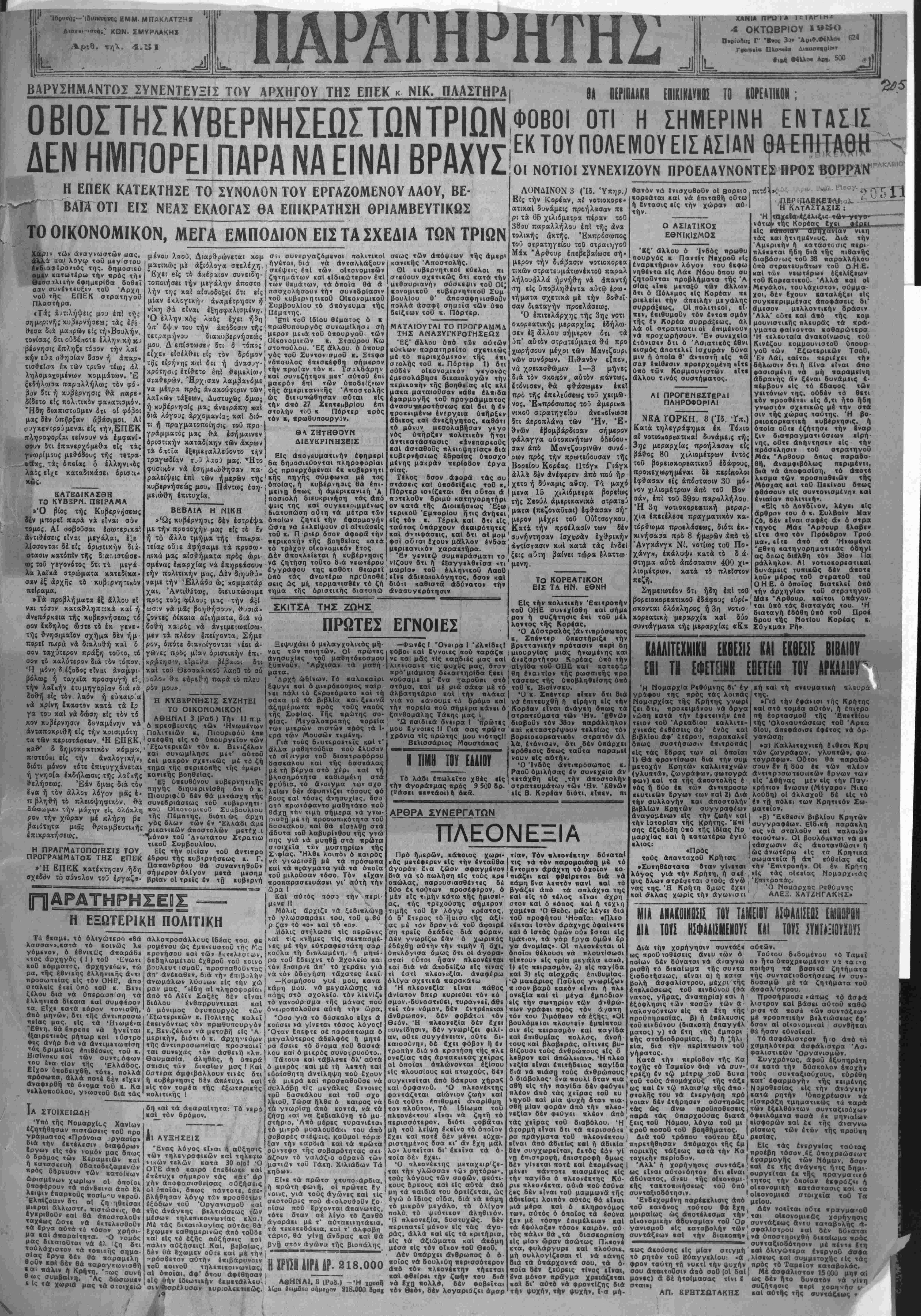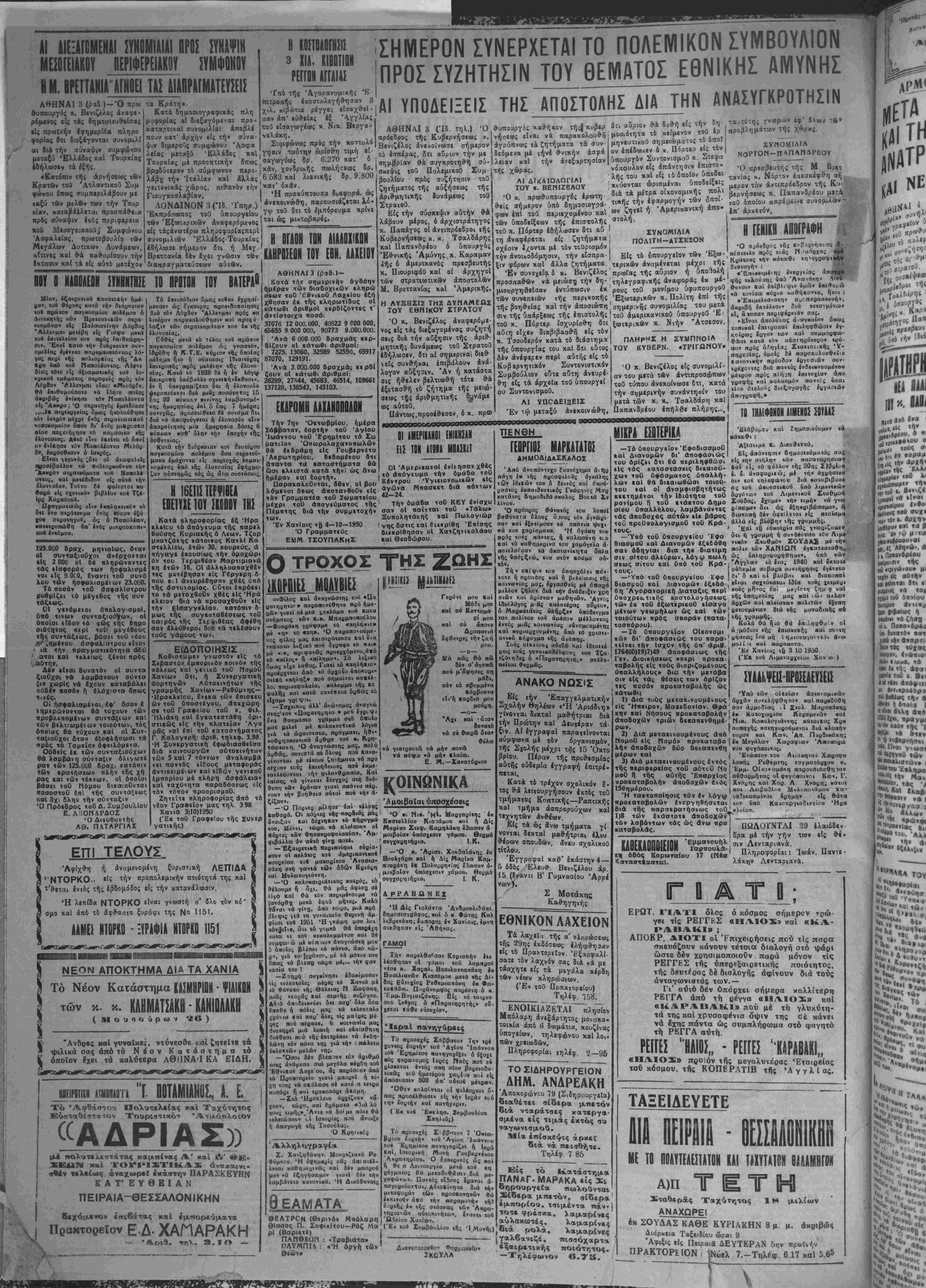 Έγγρ<ίφαΙ καθ" εκάστην 4— " ίδος Έλευθ. Βενιζέλου άρ 15 (Βνανΐι Β' Γυμναοίου νιον). - Μοτάκης ΤΟ ΙΗΑϋΦΒΗΟΙΙ ΛΙΜΕΝΟΣ ΣΟΥΑΑΣ Ελάβομεν καί ίημοοΐΒΐίϋμιιν «ά ■ά«χθι : :· Ά5ΐο;ιμβ ε. Δίευθΐνΐά, Είς απάντησιν δημοαιβύμαιό; α-ΐί. β|ς «ην στήλην «ών παραΐηρηαεαι· κοί ι!, «ό φύλλον τής 30ί]; Σ)βοίϋ« ί. έ. άναφοριΐώ; μί «ήν άχβησΐβα οιν «οβ «ηλεφωνιυ διά κα«ο()ιβααε άς «αΰ άκουαιικοϋ «πό λιμβνΐκών δογονων «ού Λιμενιιιοΐ Σ«αθμο4 Σούβας, δχομβν «ην «ιμήν νά γνοο Β/αωμβν όΐι ώς έ|ηκΒιβώσαμ8ν, ή Οιακαπή ί)βν όίβ!?ειαι βΐς πΐαίσμα άλλά β|; βλάβην ής γΒυμμής. Έ»ί «υ ΕύκαΐΒία σας γνωοιζοαβν ΰίΐ ή γρ,ομμή ή σϋν&έουαα τύυ Λιμε νΐΜό* Σταθμόν Σ0ΥΔΑ2 »» «ήν πάλιν ΐών ΧαΓ4Ι_Ν ίγκατβαΐαθη, ώς έπληοοφοοηθημΒν, ϋπά «ών "Αγγλαιν «ό ίιο- 1940 καΐ ϋκ«ο«β ού&βμία σοβαΒα συνιήοηοις ίγίνβιο ίι' δ καί οί βλάβαι καί διακοπαΐ ■Ιναι συχνοΐαΐαι 131α «οάς χειμβΒι νούς μήνας Ιπί μβ/ΐοτη ζημ α καί «ής ΰπηοεαίας μας «αι ·,ώ; άλλον άΒχων καί ηλβιοΐαιν πολιτών 4ξυηη ρβτουμινων Βιά «ής μυναβικής αΰ «ής ν{ λ ΕΘΝΙΚΟΡ^ΛΑΧΕΙΟΝ ης 29ης έκδόοεα,ς ελήφθη3Λν είς χο Πραχχοριϊον. 'Ρξαοφαλί- σατε τόν λαχνόν σας διά νά με τάσχητε είς τα μιγάΑα χί 8 ν νίων κληρώαεων. (Έ« τοθ Πρακτορείου) _______ Τηλέφ. 758, ΕΝΟΙΚΙΑΖΕΤΑΙ πλησίον Μπόλαρη Λνεξάρτηχος μονοκα. τβιχΐα άπό 6 δωμάτια, κουζίνας υπογείων, τηλεφώνου καί λο,. πών χρειιοδών. Πληροφορίαι τηλέφ. 2—95 ΤΟ ΣΙΔΗΡΟΥΡΓΕΙΟΙλΓ ΔΗΜ. ΑΝΔΡΕΑΚΗ ώ ^ρου 79 (ΣιδηρουργεΙα) ϊιαθέτει σίδερα μπετόν δια νταράτσες χαιτι.ργαι. αμένα είς τιμάς έκτός συ ναγωνισμού. Μία επίσκεψις άρκεϊ διά νά πεισθήτε. Τηλέφ 7 85 ΣΚΟΥΛΑ Είς χό Κατάστημα ΠΑΝΑΓ. ΜΑΡΑΚΑ είς _6 οηρουργεΐα πωλούνται Σίδερα μπετόν, σίδερα έμπορίου, ταιμβντα πάν- τοτε φρέσκα, λαμαρίνες αυλακωτές, λαμαρίνες ,Οια ρολά, λαμαρίνες |γαλβανιζέ, πισσόχαρτα , ·ξ«ιρετικής ποιότητος. —Τηλέφωνον β.7». ΜΙΚΡΑ ΕΣΩΪΕΡΙΚΑ —Τό υπουργείον ΈφοδιασμοΟ καί Διανομών δι* άποφάσιώς τού όρΐζει δτι βά περιληφθώσι είς τάς καταστασίς δικαιού- χων τοθ ύ«άσματος ύπαλλή- λων καί θα δικαιωθωσι τοιού¬ του εαΐ οί αναμφισβητήτως κκκτημενοι την (Βιότητα τοθ μονΐμου ή τοθ κτάκτου Δημο σίου ύπαλλήλου, λαμβάνοντες τάς αποδοχώς αυτών εΐε βάρος τού προϋαολογισμοθ τοθ Κρά- τους. —Υπό τοθ ΰηουργείου Έφο διασμοθ καί Διανομών εξεΕόθη βαν οδηγίαι δια τήε διατΐμη σιν σΐτου αλεύρων, λόγψ πωλή σεως σίτου καί υπό τοθ Κρά- τους. —■Υπό τοθ ύπουργβίου Κψο διασμοθ καϊ Διανομών εξεδό¬ θη Άγορανομική Διάταξις περί ύποχρεατικής κοσιολογήσεως των έκ τοθ έξωτερικοθ εΐσαγο μένων γΐωμήλων ώς καί των τοιούτων πρός σαοράν (πατα- . . . τοσπόρου). | Κολά Θά ή;ο θά ιπιληφθο'ν οί —Τό υπουργείον ΟΙκονομι ά·μοβιοι«ής έπιοϋεβίΐς παί συνιη κων δι* άποφάσιώς τού παρα-' ιιηοεως ϊ»α μή ίημιονογο< ντι» βνω τ«(νκι την Ισχύν τής ΰπ'αριθ· μα''-'' ""' παβαπυνα. 176460)19)7)49 αποφάσεως τής) '£« Χανίοις «ν 3 10 1950. Γβ». Διοικήσεως «περΐ προκα- ταβολής είς τοϋς διοριζομενους ύπαλλήλους» δι» την μετάβα σιν είς τας βεσεις των όρίζον τες ποσόν προκαταβολής ώς κάτωθι; Ύηό «ών οΙ«βίαιν άοΐοαμικώ« 1) Δια τοΰς μετακ>νουμβ«ους άΒχών αανβλήφθηιαν «αί παοββόθη