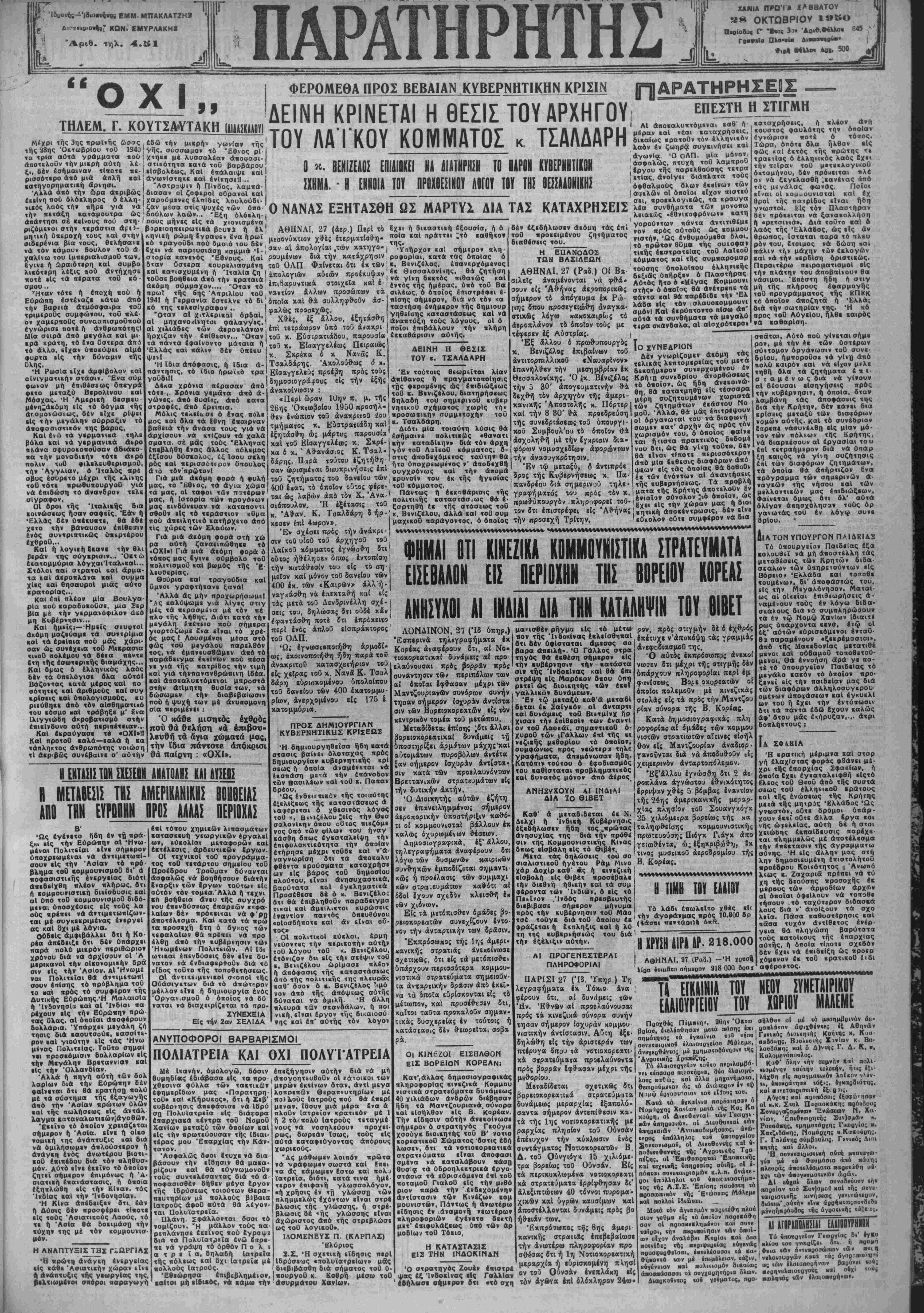 «ήν πετάξη κατάμουτρα ώς < δούλων λαώ».. Έξη όλόκλη· άπάντησι σέ κείνους πού στη- γ οους μήνες είς τα χιονισμένα ριζόμενοι βτήν τεραστία αί ι)- βορειοηπειρωτικά βουν* ή έλ μηηεή ΰπεροχή τους καΐ σχήν' ... - σιδερένια βία τους, θελήσανε νά τόν κάμουν δουλον τοΰ ά χαλίνω τού Ιμπεριαλισμοθ «ών. ΦΕΡΟΜΕΘΑ ΠΡΟΣ ΒΕΒΑΙΑΝ ΚΥΒΕΡΝΗΤΙΚΗΝ ΚΡΙΣΙΝ ΔΕΙΝΗ ΚΡΙΝΕΤΑΙ Η ΘΕΣΙΣ ΤΟΥ ΑΡΧΗΓΟΥ ΤΟΥ ΑΑΊ ΚΟΥ ΚΟΜΜΑΤΟΣ κ. ΤΣΑΛΔΑΡΗ Ο *. ΒΕΝΙΖΕΛΟΣ ΕΠΙΔΙϋΚΕΙ ΝΑ ΑΙΑΤΗΡΗ.Η ΤΟ ΠΑΡΟΝ ΚΥΒΕΡΝΗΤΙΚΟΝ ΙΧΗΜΑ. - Η ΕΝΝΟΙΑ ΤΟΥ ΠΡ0ΧΘΕ.1Ν0Υ ΑΟΓΟΥ ΤΟΥ ΤΗΣ ΘΕΣΣΑΛΟΝΙΚΗΣ Ο ΝΑΝΑΣ ΕΞΗΤΑΣΘΗ ΩΣ ΜΑΡΤΥΣ ΔΙΑ ΤΑΣ ΚΑΤΑΧΡΗΣΕΙΣ ΕΠΕΣΤΗ Η ΣΤΙΓΜΗ ΑΙ άποκαλυπτόμεναι καθ" η¬ μέραν καΐ νέαι κατάχρησις, δικαίως κρατοθν τόν ελληνικόν λαόν έν ζωηρά συγκινήσει καΐ άγωνία. Ό ΟΛΠ. μία μόνον. ' ασφαλώς, πτυχή τοθ λαμπροθ '{ργου τής παρελθούσης τετρα , ε«ίας, άνοίγει διαπλατα τούς οφθαλμούς δλων έκείνων «ών ι άφελών οί όποϊοι είχον πιστεΰ σει, προεκλογικως, τα κραυγα χαλ ρ εγινε ή ώραιότερη καΐ συμβο λικότερη λέξις «ού άντήχησε ποτέ είς τα πέρατα τοθ κό - σμου.. ΤΗταν τότΐ ή έποχή βού ή Εΰρώπη εστέναζε κάτω άπό την βαρεία άτμόσφαψα τού τριμεροθς συμφώνου, τοθ πλέ¬ ον χαμερποθς συνασπισμοθπού εγνώρισε ηοτέ ή ανθρωπότης! Μία σειρά ά πό μεγάλαι καΐ μι κρά «ράτη, τό 6να Οστερα άπό τό άλλο, βΐχαν ύηοκύψει αΐμό φυοτα *1ς την δύναμιν τής Ολης. Ή Ρωσία εΐχε αμφίβολον καΐ οΐνιγματικήν στάσιν. Ένα συμ φωνον μή έπιθεσεως δπκγρά φιτο μΐταξύ ΒιρολΙνου καΐ Μόσχας. Ή 'Λμκρική δεσρευ μενη~άκόμη είς τό δόγμα τής άι·.ομονώα»ως, δέν «Ιχε ρίψει «Ις την μεγάλην σύρραξιν άνοφοσιστικόν της βάρος. τό τηλι ΚαΙ ένώ τα γερμανικά βολά καΐ νά γερμανικά αερο πλάνα σφυροκοποθσαν άδιάκο ιτα την μοναδικήν τότε ώερό πόλιν ταθ φιλελευθερισμοθ την Αγγλίαν, ό Ιταλός πρέ σβυς έσύρετο μέχρι τής κλίνης τοθ τότβ πρωθυπουργοθ γιά νά επιδώση τό άνανδρον τελε σΐγραφον, ΟΙ βροι τής Ιταλικάς δια κοινώσεως ήσαν σαφβϊς. Εάν ή •Ελλάς δέ» ύπεκυπτε, θά ίδε χετο την βάναυσον επίθεσιν ενός συντριητικως ΰνβρτέρου ίχθροθ.. ΚαΙ ή λογιιή 6«ανε τή* θλ βεράν της σύγκρισιν... Όκτ ώ έκατομμύρια λόγχαι'ΙταλικαΙ Στόλοι «αί σχρατοΐ καΐ ώρμα τα ε. α Ι άεροπλάνα καΐ συμμα χΐες «αί θησαυροΐ μιας αΰτο ■ρατορΐας Καί έ η Ι πλέον μία Βουλγα ρΐα πού καραδοκοθσι, μΐα Σιρ β έ ή όλ ύό ρ ρ βΐα |ΐέ τή» γερμανόφιλο» μη Κυβέρνησιν... Και ήμΐίς;—-Ημείς σευφτο άκόμη μαζεύαμε τα συντρΐμια κσΐ τα έρεΐπια πού μ άς χάρι σαν ώς συνίχεια τοθ Μιερασια τικοθ πολέμου τα δίεα πεντκ (τη τής έσωτιριΐής διαμάχης.. ΚαΙ ομως δ έλληνικϋς λαός 6έν τα υπκλόγισι δλα αύτά' Βάζοντας κατά μερος καί ηο σότητις καί άριθμους «αί συγ κρΐσεις καί ύπολογισμούς, κυ ριεύθηκε άπό τόν αΐσθημα-τΐιό τού «όσμο «αί τράβηξκ μ' €να ΙλιγγιώΕη άκροβατισμό στή επικΐνδυνο σύτή περιπέτειαν·, ΚαΙ έκραύγασε τό «ΟΧΙ»! ΚαΙ προτοθ καλα—εαλά ή κα τάπληκτος ανθρωπότης νοιώση τί άκρ βώς συνίβαινε σ' αύτην ηνι.ή ρωμη εγραφβν ίνα ήρωι μ8σΟνύκτιον χθέ; έτβρματ£ο»η ί.: ν2νπα6ρ1ουησ0|ϋάσ;θ:α;μΤάδ.1-ν αί 4κολ&« .τ-ν «-γϊ ΑΘΗΝΑΙ, 27 (άερ.) Περι τό δχει ή δικαστική έξουσίσ, ή ό —'- καΐ πράττει ;«δ καθήκον Υπήρχον καΐ σήμερον πλη πάντα άντιτιθίμ· στορία κανενός 'Εθνους. Καί ρουμίνων δια την χαταχρησΐν ροφορίαι, κατά τάς οποίας ό δταν 0σ«ερα κουρελιασμένη τοΰ ΟΛΠ Φαίνεται δτι έκ των κ, Βενιζέλος, έπανερχόμενος καΐ κατισχυμένη ή Ιταλία ζή ι Α-ολογιιίιν αυτών προέκυψεν έϊ θ»σσαλονί»ης, θά ζητήση τοθσεβοήθεια ά«ό την κραταιάΐΓ ο Τ ""ια#ν "ρΒ" | / Ι νά γίνη δεκτός πιθανώς καΐ άκόμη σύμμαχον.... "Οταν 