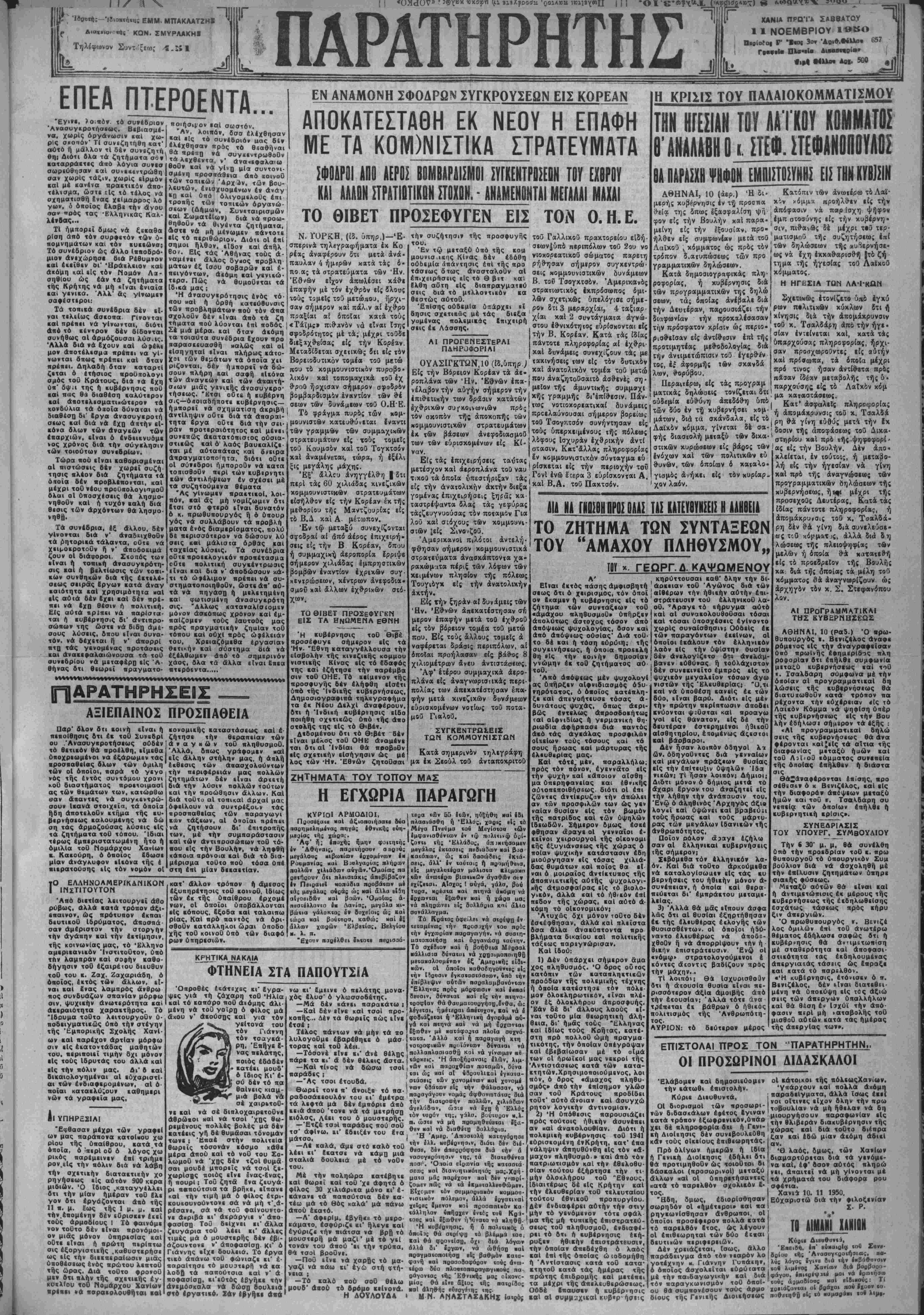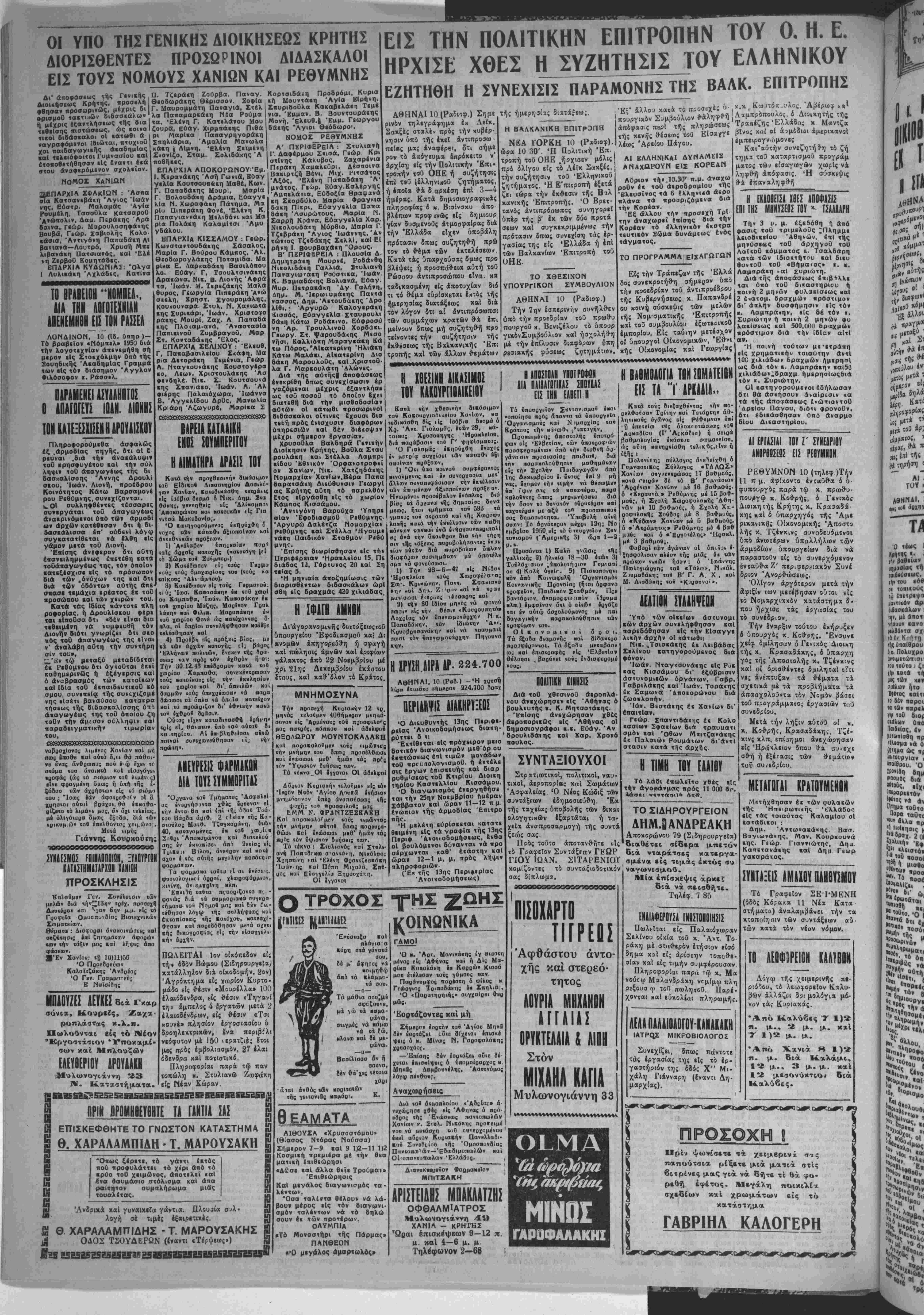 'υ ίπβιβίω «ής όλοκοιηώθΒως <ο« ΆθΜαδίου (Γ Άικάίΐο) ή θΒΐοά βαθμπλογίας ΒΜάσυυ σωμαιχΐοο, ώς αΰΐη καΐηοιίοθη τΒλικϋς,ιίνΒ ή έίής: Οολυνίίη; σύλλογης άνβιβίχθη ο Γυμνααΐιεος Σύλλογος «ΤΑΛΩΣ» Χανίαον οογ/εν«οώοα; 17 βσϋμαύς, καιά Γβιοάν δέ «ά Β' Γ°μνάοιον Άοοένων Χανίαιν μέ 16 βοθμθύς. ό «Κβοαυνό,» Ρεθύμνης με 15 βαθ- μοί;, ή Σχολή Χωοοφυλαιιής Αθη¬ νών μί 10 βαθμού;, ή Σχολή Χα- ΟοφυλαΜή; ϊοθδο; μέ 8 βαθμού;, ό Κω ιτόα.Λ'λος, Αβέρωφ χί^ Λαμπρόπουλος, ί Διοιχητής τής Τραπέζης Ελλάδος χ Μ«ντζα βΐνο; καί οί ά^μ&διοι άμερικανοΐ έμπειρογνιόμονες Κατ'αυτήν συνεζητήθη τδ ζή τημχ τού χαταρτισμοΰ προγράμ ματος των είσαγωγών χωρΐς νά ληφθή απόφασις. Ή σύσκεψις θα επαναληφθή Η ΕΚΑΟΘΕΙ.Α Μ ΑΠΟΦΑΣΙΣ ΕΠΙ ΤΗΣ ΜΗΗΪΣΪ8Σ ΤΟΪ « Τ.ΑΛΔΑΡΗ Την 3 μ. μ. εξεδόθη ή άπό φασις τοθ τριμελοθς "Πλημμε λειοδικεΐου Αθηνών, επι τής μηνυσεας τοθ άρχηγοθ τοθ ΛαϊιοΟ κόμματος κ. Τσαλδάρη κατά των ίδιοκτήτου καΐ διευ θυντοθ τοθ «Βήματος» ν. κ. Λαμπράκη *αί Συριώτη. Διά τής αποφάσεως έπιβΐλλε ται ΰ«6 τοΰ δκαστηρίου ή ηοινή 2 μηνών φυλακΐσεως Μαϊ 2 έ<ατομ. δραχμών πρόστιμον δι* απλήν δυσφήμησιν είς τόν μ. Λαμπράχην, είς δέ των ε. Συριωτην ή ποινή 2 μηνών φυ λακΐσεως καΐ 500.000 δραχμών πρόστιμον διά την ΕδΙεν αΐτί με -ετράπη »τΙ αν. Η ηοινή τούτων «Ις χρηματικήν τοιαύτην αντΐ 100 χιλιάδων δραχμών ήμερησΐ ως διά τόν κ. Λαμπράκην καΐ50 χιλιάδων.δραχμ ήμερησΐωςδιά τόν ». Συριώτην. ΟΙ κατηγορούμενοι εδήλωσαν δτι θά άσ»ήσαυν αναίρεσιν κα τα τής αποφάσεως ένώηιοντοθ Αρείου Πάνου, διότι φρονοθν, δτι εδικάσθησαν υπό άναρμο 61ου ΔιΐαστηρΙου. ΠΕΡΙΑΗΨΙΣ ΔΙΑΚΗΡΥΗΩΣ Ό Διβυθυντής 13ης Περιφ* ρεΐας 'Ανοικοδομήσιως διακη- ρύττει δ ι: ΈκτΙθιται είς πρόχειρον μειο δοτικόν διαγωνισμόν μ«θ'όρ ου εκπτώσεως επί τιμώ» μονάδων τοθ πρεϋιιολονισμοθ. η έετβλε αίς έργων έπισκίυής καΐ διαρ ρυθμ'σεως τοθ Κτιρίου Διοικη τηρίου ΚαστελλΙου Κισσάμου. Ό διανωνιομός ενεργηθήσε ται την 25ην Νοεμβριού Λιιέραν Σάββατον καί ώραν 11—12 π μ ενώπιον τής αρμοδίας Έπιτρο πής. Ή μελέτη ευρίσκεται κατατε θειμένη είς τα νραφϊα τής 13ης Περιφ Άνοκοδομηοεως, Ενθα οί βουλόμενοι δύνανται νά προ σερχωνται καθ* έΐάστην καΐ ώρα* 12—1 μ, μ, πρός λήψιν πληροφοριών. (Εκ τής 13ης Περΐφερίας Ανοικοδομήσεως) «ονισμοβ (Άμεοιιιής 3) ώαα 1—2 μ.·*· Ποοαόνΐα 1) Καλη γνώοις «ής γαλλικής 3) ήλΐΜΐα 18—30 .«όν 3) Τοϋλάχιθίον ;άπολυιήαιον Γυμναιί ου 4) Καλή ύγεΐΓ. 5) Πιαιοποιηιι «δν άπό Κοινωφβλΐ) Όογανιομόν Κοινα,νΐΜής Προνοίας (ήιοι δοφανο «αοφβΐην, ΠαιΒΐϋΛν Σ<οθμάν, Ποβ βαντόοιον, άναμοίφω .ικόν ΐ)ραμα Ηλη.) ίμφσΐνον ό«ι ό αΐίών εαγάζβ «αι εν αΰίώ άοχολοθμβνος με παι βαγιηγιιιήν ηαρακολανθηαιν «ών «οοφίμαιν «οα. ΟΙΚονομΐΜθΙ δ ο ο ι. Τα Ιξοαα διαμονήν Μαϊ δίβαΜταα ηαθ3φέαην«αι. Τα 5ξο?ί ι μ««α0αθΒ ω: «αί ίυιοΐοοφπς βΐς Έλββ«(αν θέλοοσι ^ βαοθνεΐ «ούς ίνδιαφΒθθμέ νους. ΠΟλΙΤΙΙΗ^ΝΗΣΙΣ Διά τοθ χθτσινοΰ άεροπλά- νού ανεχώρησεν «Ις Αθήνας ό βουλιυτής κ. Κ. Μητσοτάκης. ΈπΙαης ανεχώρησαν χθές άεροπορικώς είς Αθήνας οί δημοσιογράφοι κ.κ. Εύαγ. Άν δρουλιδάιης καΐ Χαρ. Χρονό πουλος. μαά: «αί ό α με 3 βαθμόν;. Φαβοο'ι ΐών άγώνων ξησφαλιοαν πλέον «ής ποώιων νΐΗΟον ήασν Πώ Πωλογιώογης «οβ «Τάλα» Ζιυμαβάιιη; ΐοο Β' Γ. Α. Μ. ΑιοΒαιιη; «οό οί όΐτ; ^ι ί μιά; 4« «ών ό Ιωάννης ό η Νικόλ. φ ΤΡΟΧΟΣ |ΙΙΙ1ΙΙί! |»ΙΙ1ΙΙΙΙί1 αιαι άνθδς «4ν «ής γβιιονιάς Μαμάοι. Ένύοΐαξα καΐ πλάγιαα κόβη α«ά γόνατά σου, οί μ* αφηεες νά ■οιμηθφ άπδ «ά Βλάμμο «ά σου. — ο— Τα μάθια σΐμ θφέζοονβ, μά ώ «ά πομα- θώνω οιιγμές νά κάμω νό «ά Ιω Μλαιβο «αί 84 με θώνω 