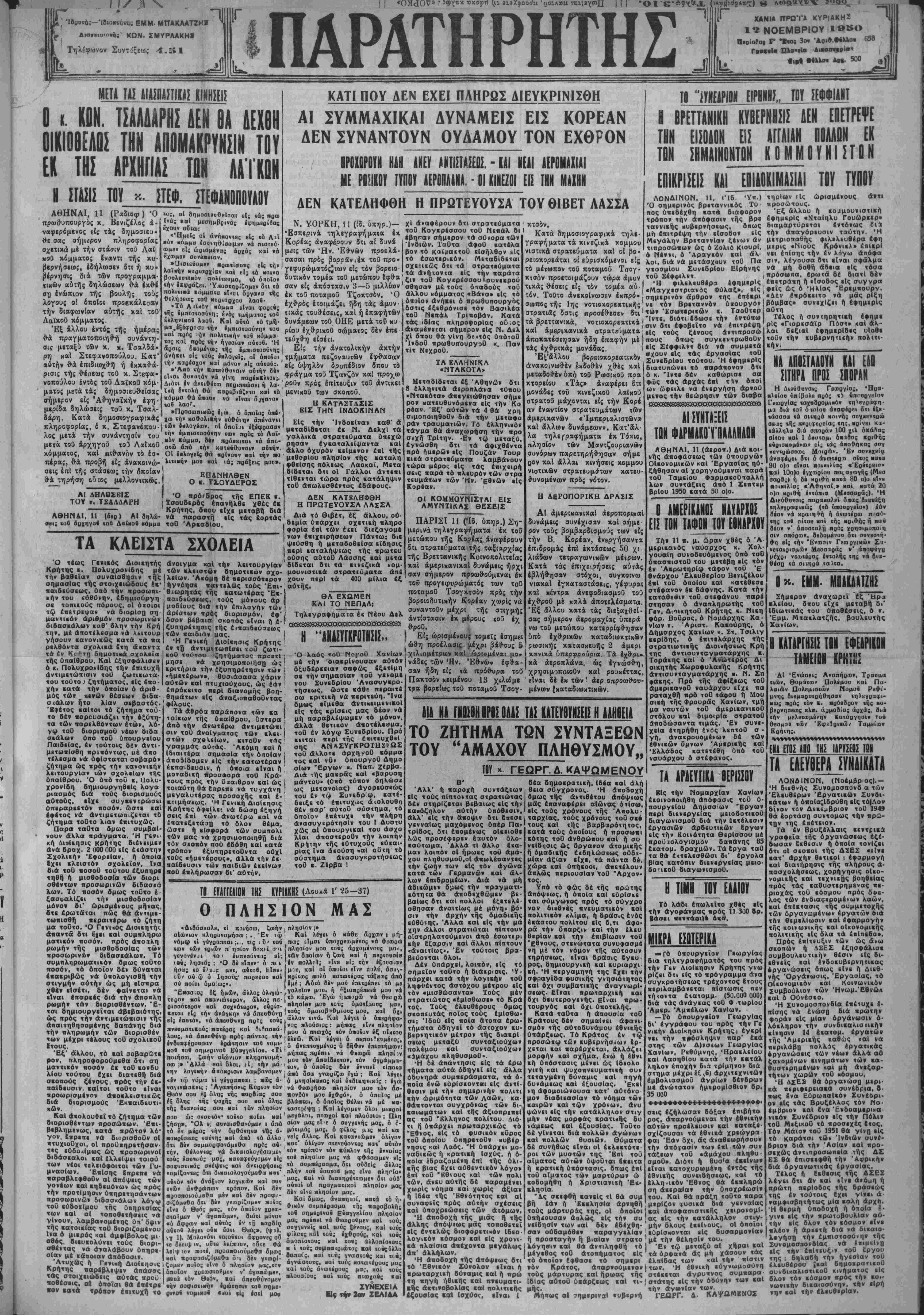 Διό«ι_ 4ν άν«ιθ<(ω έ πρός Ιπίχευξιν τού ρη ημγρφν χ ή πληροφορίας, δ κ. Στεφανόπου·)«** «·λογέα.ν;, 0| λ άΙ Τ ·!»Λ'°ι°ο«»Ί» σήμερον τα σύνορα των Ίνβιών. Ταθτα Αφοθ κατέλα βον τό καϊμαετοθ εισήλθον είς τό εσωτερικόν. Μεταδίδεται σχετικώς ότι τα στρατεύματα «*-«.. ηυι ο.β »υ «ι,,τυ * ■ » ~ ι~ - ψ «ο. · ^ά Ανήχοντα είς την παράτα «ολίιευμα, «δ ό«οϊον δυτικόν τομέα τού μετωπου εφ»α ςιν Το0 Κογερέσσουίσυνεκρού «ήν ίιφράζβι. 'ΥποσιηρίΕομεν δα «ά σαν είς απόστασιν 3—5 μιλλίων σθησαν μέ τούς όπαδούς τοΰ πολιΐιβά κόμμαΐα εί^οι όαγανα «ής % χοο ποταμοΰ Τζοκτσδν. Ό αλλου «όμματος «Βάνα» είς τό ΛηλτποίτΐΓ »ηιΐ Ηΐ.η.^_— »—β. - _ . - "... . . ' οποίον Ανήκει ό πρωθυπουργός δστις έξεθρόνισε τόν Βασιλέα τοθ Νενάλ Τριποβάν. Κατα τάς ιδίας πληροφορίας ου .ο; Αναμένεται σήμερον είς Ν. Δελ χΐ δπου θά νίνη δε·τός ΰπότοθ ΊνδοΟ πρωθυπτουργοθ κ. Παν τίτ Νΐχροΰ. ΤΑ ΕΛΛΗΝΙΚΑ •ΝΤΑΚΟΤΑ» Μεταδίδεται έξ Αθηνών δτι 8 έλληνκιά ΑεροπλΑνα τύπου «Ντακότσ» Απεγειώθησαν σήμε ρον κατευθυνόμενα είς την Κο ρέαν. Έξ* αυτών τα 4 θά χρη σιμοποιηθοθν διά την μεταφο ράν τραυματιών. Τό ελληνικόν τάγμα θά αναχωρήση την προ σ£χη Τρίτην. -Εν τω μεταξύ Αναφέρουν δτι στρατεύματα ■ κτσόν. 1 Κ«τά δημοσιογραφιχα τηλε- ρ ρμ ς λ0| δ ο μέτωπον τοθ ποταμοΰ Τσογ- γΐοσμΐου κ,σόν προιτοιμάζουν τιορα άμυν «υ Σ4» τικάςθέσεις είς τδν τομέα αυ " όν. Τοθτο ανεκοίνωσεν έχπρό- _ <ω ηβριικώαβι ή λα Ρ ρς ξ ϊ»ή ένΐολή θά ΐταρεβιάζβΐο καί «6' μενΐκοθ των σκοποϋ. κόμμα θά ιΊιαο ά ί ό ρβζβΐ κόμμα θά ιΊιαοβ νά είναι «οβ λαο*. Προσωπικάς ό οποίος ΰπί· Κατά δημοσιογραφικόν χοο την καθολικήν εύ'θύιην άπένανιι ί δ Σό)* «λέ| ό ίί ίξίφρασον 0 Λ η καταστασισ εισ την ινδοκιναν Είς την ΊνδοΐΙναν καθ' ό: μεταδίδιται έκ Ν. ΔελχΙ τα ι , ,Γ * - |*·υιυι»·.Λ«ι &κ ιι. «λβιιζι τι* λος μετα την συνάντησιν τού ^* ίόΤα"^»^"^·""^ ΰπίχώ ϊ*-τ* ^^ *γΑ ί Ι ^^ /ιαΐΛβυ ο«ω άπό «ην κατεόθυνοιν αύ«ήν. κόμματος, καί πιθανόν τό έσ· ΟΙ ββλογβΐς θά Νοίναον «αί «ήν ηο πέρας, θά προβή είς άναχοινώ- λιιι»ήν ι»0» «αί <ά; ηοάξεις μοο». ψβιίσης πόλεως Λαόκαΐ, Μετά σεις επί τής στάσεως την οποίαν θά τηρήση οβεος μελλονΐικως. ΑΙ ΔΗΛΘΣΕΙΣ ΤΟΥ ν. ΤΣΔΛΔΑΡΗ ΕΠΑΝΗΛΘΕΝ Ο Κ. ΤΣΟΥΔΕΡΟΣ Ό πρόΓδρος τής ΕΠΕΚ κ. Τσουδερός επανήλθε χθές έκ Κρήτης, δβου εΐχε μεταβή διά ΑΘΗΝΑΙ, 11 (βερ) Αί δηλώ- νά ηαραστή είς τάς εορτάς «ου άοχηγοί «οά Λαϊκοί πόμμα τοθ 'Αρκαδίου, Γ— Λ ΤΑ δίδεται δτι οί Γάλλοι Αντεπι τίθενται τώρα πρός κατάληψιν τοθ Απωλεσθέντος έδάφους. ΔΕΝ ΚΑΤΕΛΗΦΘΗ Η ΠΡΩΤΕΥΟΥΣΑ ΛΑΣΣΑ Διά τό θιβέτ, έξ άλλου, ού· δεμία ΰπάρχει σχετική πληρο Ι φορία επί των έιεΐ διεξαγομέ νων έπιχειρήσεων Πάντως διε ψεύσθη ή μβταδοθεϊσα είδησις περί καταλήψιως τής ούσης αοτοθ Λάσσης καί μετα Ό τέως Γενικάς Διοικητής άνοιγμα χαί την λειτουργίαν Κρήτης κ. Πολυχρονίδης μέ των κλειστών δημοτικήν σχο- μουνιστικά στρατΐϋματα τή» βαθείαν συναίσθησιν τής Ι λείων. 'Ακόμη δέ περισσότερον χούν περ) τα σημασΐας τής στοιχειώδους έκ·! ήγνόησε παντελώς τούς Επι- αύτϊ»ς θιωρητάς τής κατωτέρας Έκ· παιδεύσεως, τούς μόνους άρ δίδεται ότι τα κινεζικά νομ Απέ εξ χ η εγνώσθη δτι πρό ημερών ΐΐς ά ύ τα αφιχθέντα Πουζάν Τουρ λβά κικά στρατεύματα λαμβάνουν τώρα μέρος είς τάς έπιχειρή σεις παρά τό πλευρόν των στρα τευμάτων των Ήν. Εθνών είς Κορέαν, οί κομμουνισται εισ ΑΜΥΝΙΙΚΑΣ ΘΕΣΕ1Σ παιδεύσεως, υπό την προσωπι¬ κήν τού ευθύνην, έδημιούργη σ« τοπιεούς πόρους, οί όποϊοι τω έπίτρεψατ νά διορΐσο ση μαντκόν αριθμόν προσωρινήν διδασκάλων καθ* δλην την Κρή την, μέ άποτελεσμα νά λε