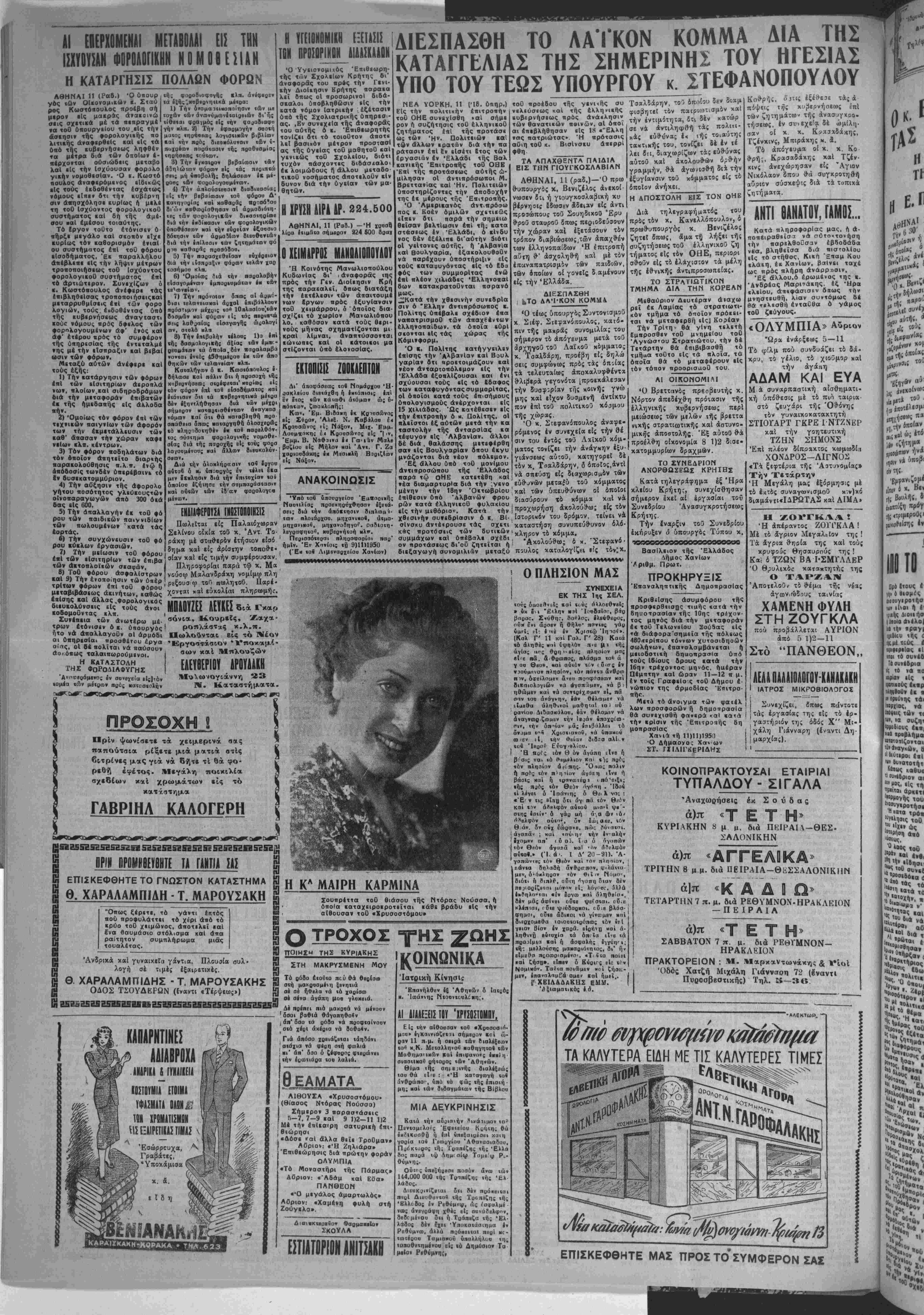 έ< τοθ Τβλ,ωνβίου 2ού5ας είς τα διάφορα'σημΐϊα τής πόλεως 480(ΐϊρίπου τόννων χυτοσιδηοών σωλήνων, έπατολσμβάνεται ή μειοδοτιΐή δηαοπρασία υπό τούς 161ους δρους κατά την 16ην τρέχοντος μηνός, ήαέραν Πεμπτην καί ώραν 11—12 π μ. έν τοίς ΓραφεΙο ς τοθ Δήμου £ νώπιον της αρμοδίας Έ'ηιτρο- πήο. Μετά τό άνοιγυα των φαιέλ λων προσφοοών ή δημοηρασΐα Θά συνεχισθή φηχρά καί κατά την κρίσιν τής Έηιτροπής 6η μοπρασΐας Χανιά τή 11)11)1950 ■Ο Δήμαονος Χανίων ΣΤ. ΓΖΙΛΙΓΚεΡΙΔΗσ Κοθ·ρί)ς, δίτις έξέ*ε3ε τάς ά ιψει; χήί κυβερνήσεως έττΐ των ζητηματω" τής άνασυγχοο. τήσεως, έν συνεχε'α δέ ωμίλη¬ σαν οί κ κ. Κοασχδάχης, Γζίνκινς, Μπΐράκης η. 8. Το άπόγευμα οί κ. κ. Κο θ·ρή-, Κρασαδάκης καί Τζέν- κινς ανεχώρησαν είς "Αγιον Νικόλαον δπου θά συγκροτηθή αΰριεν σύσκβψις διά ζητήματα. τα τοπιχά ΑΝΤΙΘΑΗΑΤΟΥ, ΓΑΗΟϊ... Κατά πληροφορίας μας, ή ά- ποπ6ΐραθ«ίσα νά σότοιτονήση την παρελθούσαν έβδοδαδα νεα, βληθεϊσα διά πιστολίου «Ις τό στήθος, Κική "Επαμ Κου χλάΐη, έκ Χανίων, βαΐνει ταχβ ως πρός πλήρη άνάρροσιν, Έξ άλλου.6 έρωμ&νος της κ. Ανδρέας Μαρι-'άκης. εί; ·Μρα (λεΐου, άηΐφάσισϊν δπως την μνηστευθή, λίαν συντόμως 64 βά τβλβσθη ενταύθα ό γάμος τοθ €(5ΛΫΜΠΙΑ» Αυριον "Ωρα ενάρξεως 5 — 11 Τό φ!λμ πού συνδυάζει τδ δά· κρυ, τό γέλιο, τό χιοΰμορ καί την άγάηη ΑΔΑΜ ΚΑΙ ΕΥΑ Μ « συναρπαοτική αίσθηματι· κή ύπόθ-εσις μέ τό πιο ταιρια στό ζευγάρι τής Όθ·όνης τδν γυναικοκατακτητή ΣΤΙΟΓΑΡΤ ΓΚΡΕ Ι-ΝΤΖΝΒΡ καί την γοητευτική ΤΖΗΝ ΣΗΜΟΝΣ Επί πλέον δίποακτος κωμωδία ΧΟΝΔΡΟΣ—ΛΙΓΝΟΣ «Τ-χ ξίφτέρια τής Άστυνομίας» Την Τετάρτην Ή Μεγάλη μας έξόρμησις μέ τδ έχτδς συναγωνισμοΰ κ:ν)κό διαμάντι«ΐΔΡΩΤΑΣ καί ΑΙΜΑ» Η ΖΟΥΓΚΑΑ! •Η άπέραντος ΖΟΥΓΚΛΑ! Μέ τδ ιδγριον Μεγαλείον της ! Τα αγρια θτιρία της καί τούς κρυφους Θησαυρούς της ! Κα. ό ΤΖΩΝ ΒΑ Ι-ΣΜΥΛΛεΡ Ό θρυλικός κατακτητής της Ο ΤΑΡΖΑΝ Άποτελοΰι- τδ *έμα της νέ*; άγοονιώδαυς ταινίας ΧΑΜΕΝΗ ΦΥΛΗ ΣΤΗ ΖΟΥΓΚΛΑ πού προβίλλεται ΑΥΡΙΟΝ άπό 5 1)2-11 Στό "ΠΑΝΘΕΟΝ,, ΑΕΑΑΠΑΑΑΙΟΛΟΓΟΗΑΝΑΚΑΚΗ Ι ΙΑΤΡΟΣ ΜΙΚΡΟΒΙΟΛΟΓΟΣ ! Συνεχίζει, ίπως πάντοτε Ι τάς εργασίας της είς τδ ίρ- γαστήριόν της ώδός Χ" Μι- I χάλη Ριάνναρη (ί/αντι Δη- (μαρχίας). ΚΟΙΝΟΠΡΑΚΤΟΥΣΑΙ ΕΤΑΙΡΙΑΙ ΤΥΠΑΛΔΟΥ - ΣΙΓΑΛΑ Άναχωρήσβΐς έκ Σ ο υ δ α ς ά)π ^ Ε Τ Η» ΚΥΡΙΑΚΗΝ 8 μ μ. διά ΠΚΙΡΑΙΧ-ΘΕΣ- ΣΑΛΟΝΙΚΗΝ ά)π -ΑΓΓΕΑΟΚΑ» ΤΡΙΤΗΝ 8 μ μ. διά ΠΕΙΡΑΙΑ—ΘΕΣΣΑΛΟΝΙΚΗΝ άΐπ «Κ Α Δ Ι Ω' ΤΕΤΑΡΤΗΝ 7 π. μ. διά ΡΕΘΥΜΝΟΝ-ΗΡΑΚΛΕΙΟΝ — ΠΕΙΡΑΙΑ ά)« «Τ Ε Τ ΣΑΒΒΑΤΟΝ 7 π. μ. διά ΡΕΘΥΜΝΟΝ— ΗΡΑΚΛΕΙΟΝ ΠΡΑΚΤΟΡΕΙΟΝ : Μ. Μαρκαντωνάκης & νίοί Οδός Χατζή Μιχάλη Γιάνναρη 72 (δναντΐ Πυροσββσηκής) Τηλ. »—»6 ΛΕκτωρ. ^^ ΤΑ ΚΑΛΥΤΕΡΑ ΕΙΔΗ ΜΕ ΤΙΣ ΚΑΛΥΤΕΡΕΣ ΤΙΜΕΣ ΕΠΙΣΚΕΦΘΗΤΕ ΜΑΣ ΠΡΟΣ Τθ' ΣΥΜΦΕΡΟΝ ΣΑΣ ■ ματος Κ 4' Ιίν «ίήι πί»οβΕΟπ»ν ψ, ν* ^ Ι*, ήν* Εμφανιζμ ,Ια» ί χ. Β«· ,(|( Βουλτ)ς, δ ΤΟ 0ρ6 Ιιους ε φ 6 βιομίς ΐκαυγιροτήσ ικ ιίναι ή ί ιμιής Αιοιιήσ |4ΐοΙαανΙλο| ίιί την ΐραγι ιχιδΐιυ της <: ΐςμέ τιυς ί ιιρΐΦΐριΙας εί ιιιαι τό συνΐθ ΤΑ ουνίδρια ιΐ( τό «α πό ιαιριαν ιΐς ι ιρατιιβύς Ικ·ρ κιΐϊβοϋ» |κ « )ΐΐριυ»ης τ Αι ίΐαρχΐβς, νά *·ις τώ» τ« «ι, ·0 συζηι 'ρμοδ'θνς «κ·; 4 '■» ν, ο ή «αθυο ριον αι ·1ς τη 4 ΊΜιτβ, 4Ρ "Ρμογής του «οτβ τρό ουνΐιηοις τΟ * «·Χ·» ώς ίΡήοι * ς οθ «αί ,,θ( ν1ί τί · - «αι ·