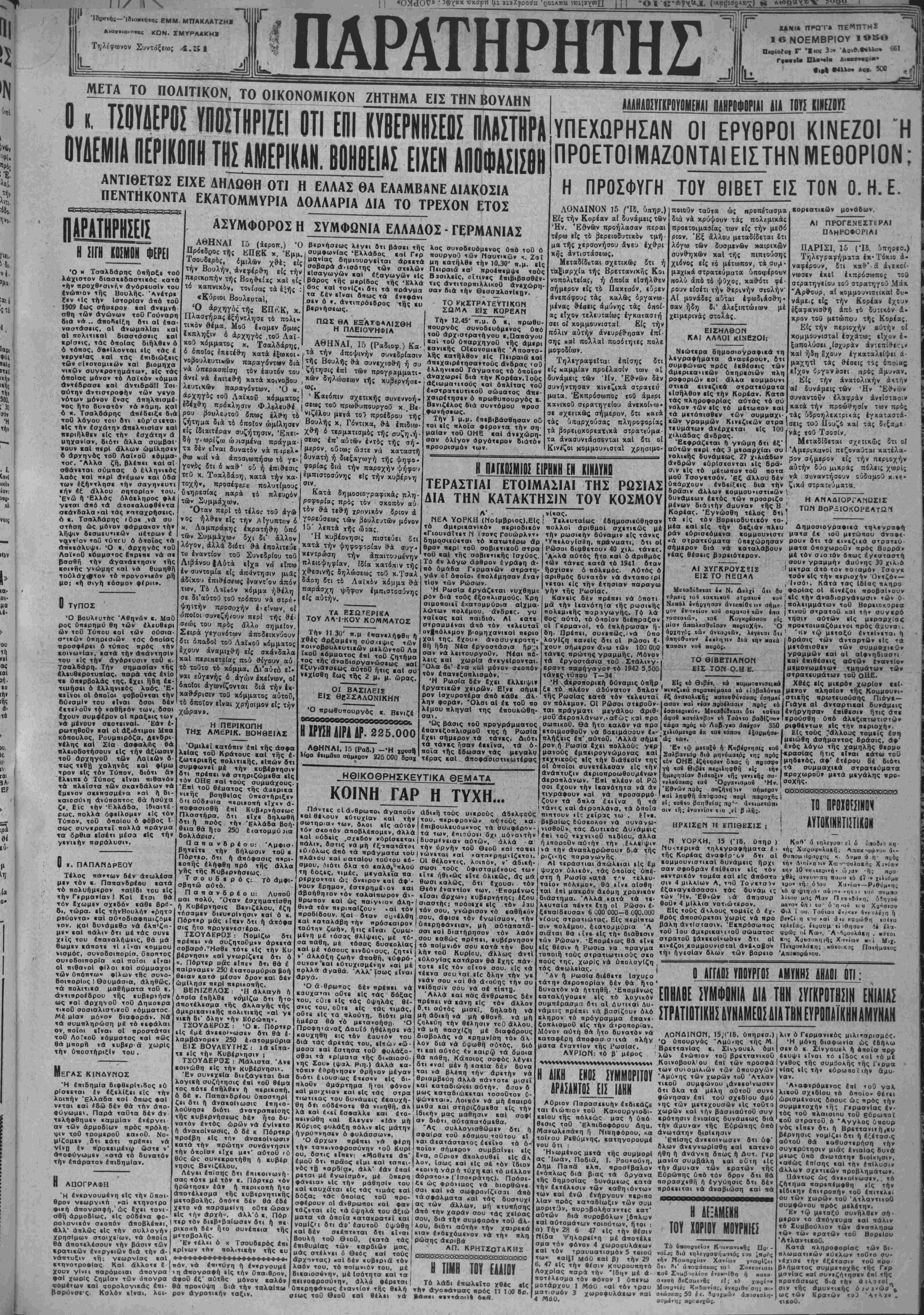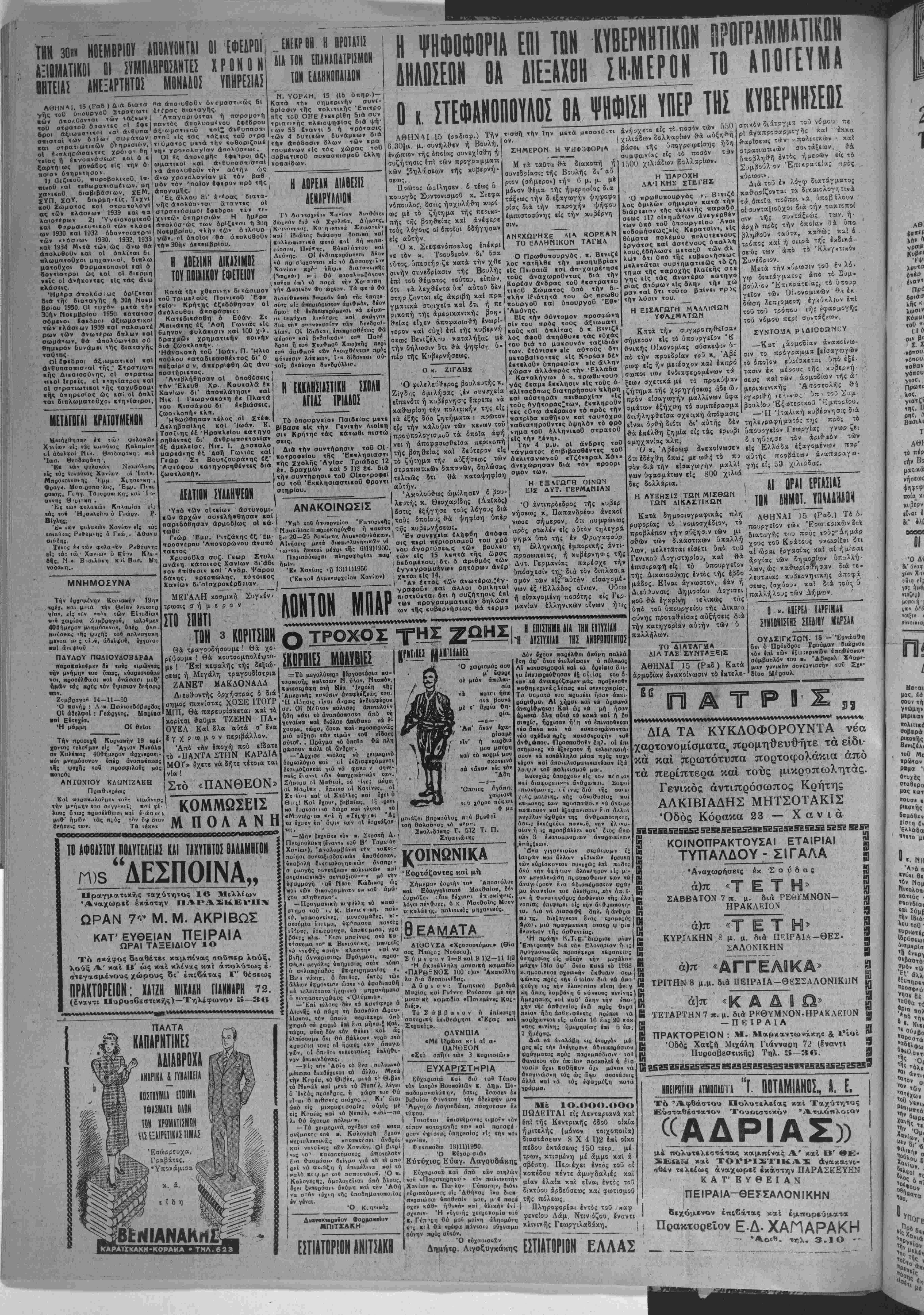 1°Λ!ΗΚ<)Ν, ΤΟ ΟΙΚΟΝΟΜΙΚΟΝ ΖΗΤΗΜΑ ΕΙΣ ΤΗΝ ΒΟΥΛΗΝ Ο}.™ΚΚ""- ΟΤΓΕΠΙ(ΥΟΕΡΝΗΣΕΩΣΠΛΑΣΤΗΡΑ ΟΥ1ΕΜΙΑ ΠΕΡΪΚΟΠΗ ΤΗΣ ΑΜΕΡΙΚΑΝ. ΒΟΗΘΕΙΑΣ ΕΙΧΕΝ ΑΠΟΦΑΣΙΣΘΗ ιΙΛΡΑΤΗΡΗΣΕΙΣ Η ΣΙΓΗ ΚΟΣΜΟΝ ΦΕΡΕΙ ■Ο ν Τσαλδάρης υπήρξε τού λβχιστον βιασκβδαστικός κατά «ήν προχθεσινήν αγόρευσίν τού ενώπιον τής Βουλής. Άνέτρε Εκν «Ις την Ιστορίαν άπό τοθ 1909 £ως σήμερον καί άνεμνή- σθη των άγώνων τοΰ Γούναρη διά νά .. άποΐεΐξη βτι αί έπα· ναστάσεις, οί ανωμαλίαι καί αί πολιτικαί διαστάσκις καί κρΐσεις, τάς οποίας διήλθεν ό ό τόπος, σ*φε(λονται είς τάς έ νεργεΐας καί τάς έπιδιώξεις των οΐκονομικών καί βιομηχα νίκων συγκροτημάτω», είς τάς οποίας μόνον τό Λαϊκόν κόμμα άντέδρασε καί άντιδοαΙΙ Τοι¬ αύτην άντιστροφήν των γεγο νότων μόνον £νας άπηλπισμέ· τος ήτο δυνατόν νά «άμη. καί ό κ. Τσαλβάρης άπέδειξκ διά τοθ λόγου τού βτι εορ'σιεται «Ις την εσχάτην άπελπισίαν καί περιήλθεν είς την εσχάτην ά μηχανίαν, διότι αλλα συμβαί· «συν καί περί άλλων ωμίλησεν 6 άρχηνός τοθ Λαϊ·οθ κόμμα- τογ. Άλλα ζή, βλέπϊΐ καί α[ σθάνεται σύμπας ό έΚληνικός λαός καί π*ρΙ άνέμων καί ύδά των έξήντλησε τήν σαγηνευτι ■ήν έξ άλλου οητορίαν τού. Ένώ ή "Ελλάς όλόκληρος φλέ γεται άπό τα άιοκαλυφθβντα σκάνδαλον αί τάς ναταχρήσεις. Α κ. Τσαλδάρης »Οοκ .νά συ στηση ώς μόνον φάρμακον τήν λήψιν δεσμευτικών υέτρων έ ναντ'ον τ ο. 0 τύπευ ό οποίος τα Λπκκάλυψ». Ό κ. άρχηνός τοθ Λαϊ«οΟ κύμματος εΉρεπκ νά σε Βσσθή τήν αγανάκτησιν τής κοινής γνώμηο καί νά θυμηθή τούλάχφτον τό προνονιπόν ρή μσ; «ή σιγή κόσμον φίρει». ΑΣΥΜΦΟΡΟΣ Η ΣΥΜΦΩΝΙΑ ΕΛΛΑΔΟΣ - ΓΕΡΜΑΝΙΑΣ την Βουλήν, άνεφέρθη είς την περικοπήν τής Βοι^είχς καί Ε{ς τό καττνικόν, τονίσας τα έςής : «Κύριοι Βουλευταί, Ό άρχηγόςτής ΕΠΈΚ, κ. Πλαστήρας έξήντλησε τό πολι¬ τικόν θέμα. ΜοΟ |»αμεν δμως ίκπληξιν ό άρχηγος ,τοϋ Λαϊ- κοθ κόμματος Κ. Τσαλδάρης, μς ημον σοβαρά ά>ισότης