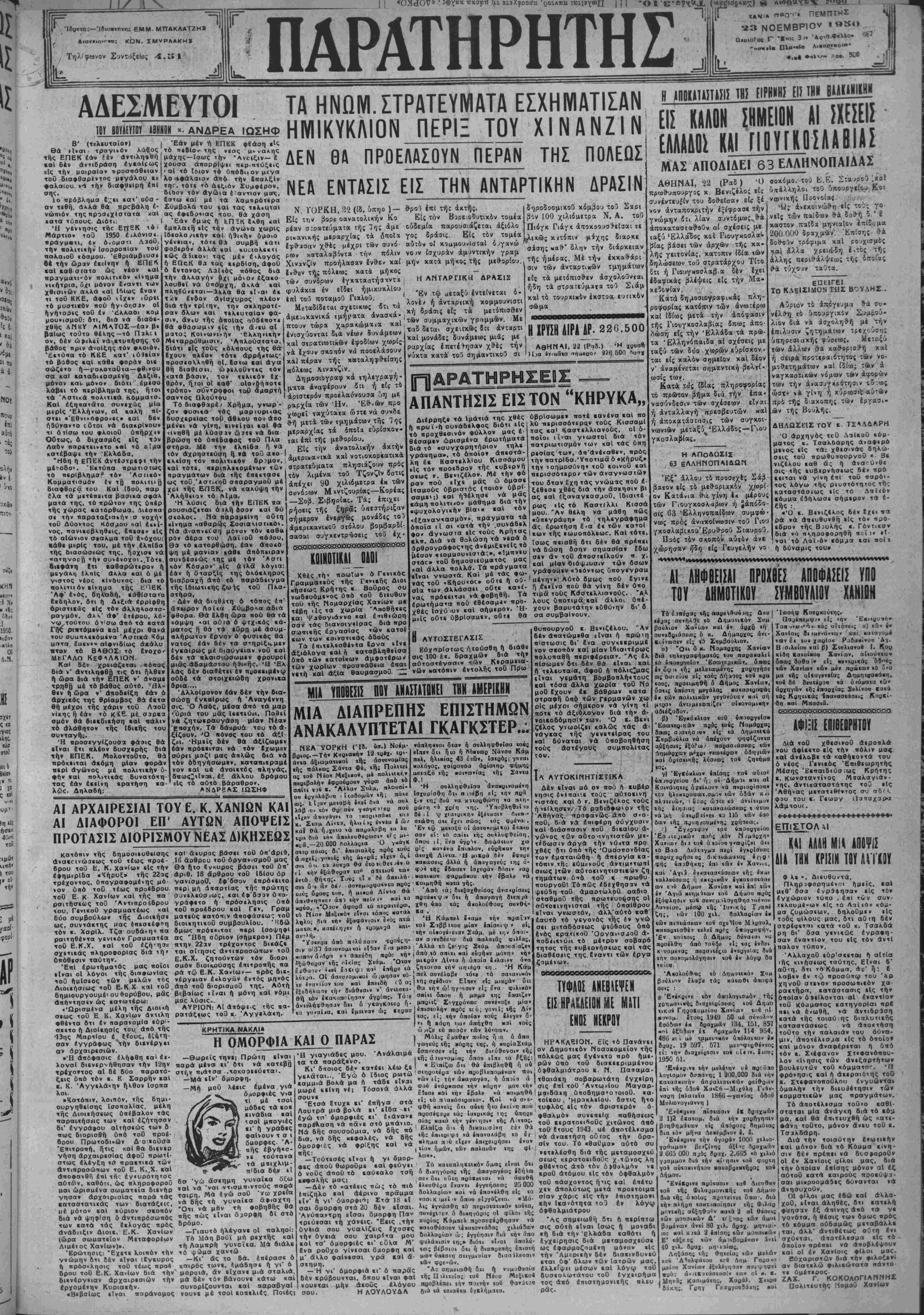 ΔβσποινΙΒπς. Μ4 <ήν ιιηβαΐΗτν ·ω- μωδία «3 ΤΑ ΚΡΛΤΟΥΜΕΝΑ» Άΐαΐάλληλα Βιά Δθαποινίδπς ΟΛΥΜΠΙΑ «Άγάπτι οιήν καΐαιγΐοσ» ΠΑΜΘΕΟΜ »Λοϊοψ οίον Ό ■· Βετιζβλος άναφ«ρόμ« νος είς τα γραφέντα υπό των έφημ·οΊ6ων διά τάς σχίσεις μβταξύ Ελλάδος «αί Γιουγκο σλαβιος εδήλωσεν δτι ούται βελτιοθνται συνβχώς ιθρισΐό μεναι έν έξελΐξΐι, προσθέσας ΑΘΗΝΑΙ 22 (άεβοττ) Ό άρχηγδς τής ΚΠΕΚ στρατη γός κ. Πλαοτήρας συνεχίζων την β-ριαμβευτικήν περιοδείαν τού άνά την κεντρικήν Μχκε- δονίαν μετέβη χθές είς Βέρροι· αν σήμερον δέ »!: Γιαννιτσά γενόμενος παντοθ δεκτδς ένθ·ου σιωδώς υπό χιλιάδων λαοΰ. Ό κ. Πλαστήρας δμιλώνχθές πρδς τδν λαόν τή; Βιρροίας δ- στις κυριολεκτικώς ιδν άποθέω σεν εξεφώνησε βαρυσήμαντο' πολιτικόν λόγον ενώπιον πολυ πληθοθς συγκεντρώσεως. Είς τδν λόγον τού 6 άρχη διασμοθ και έο ο^ομ·ηχ»ν-Λν καΐ μαλλ νωνΰφασμίτω. τάσιν τοθ ζηΐήμ»το:,τ0ο ί* πει νά γίν^ περιχοπή τολ στ&Ο 25 ο)ο επί ΐτ,ς ιΐνν™»,^ μαλλίνων ΰφασμίτω. ή ί» συν τρέχη περίπτωσις έπφολής εί- Η Έπιτροπή τάζη τ* θέμ«τ> τής