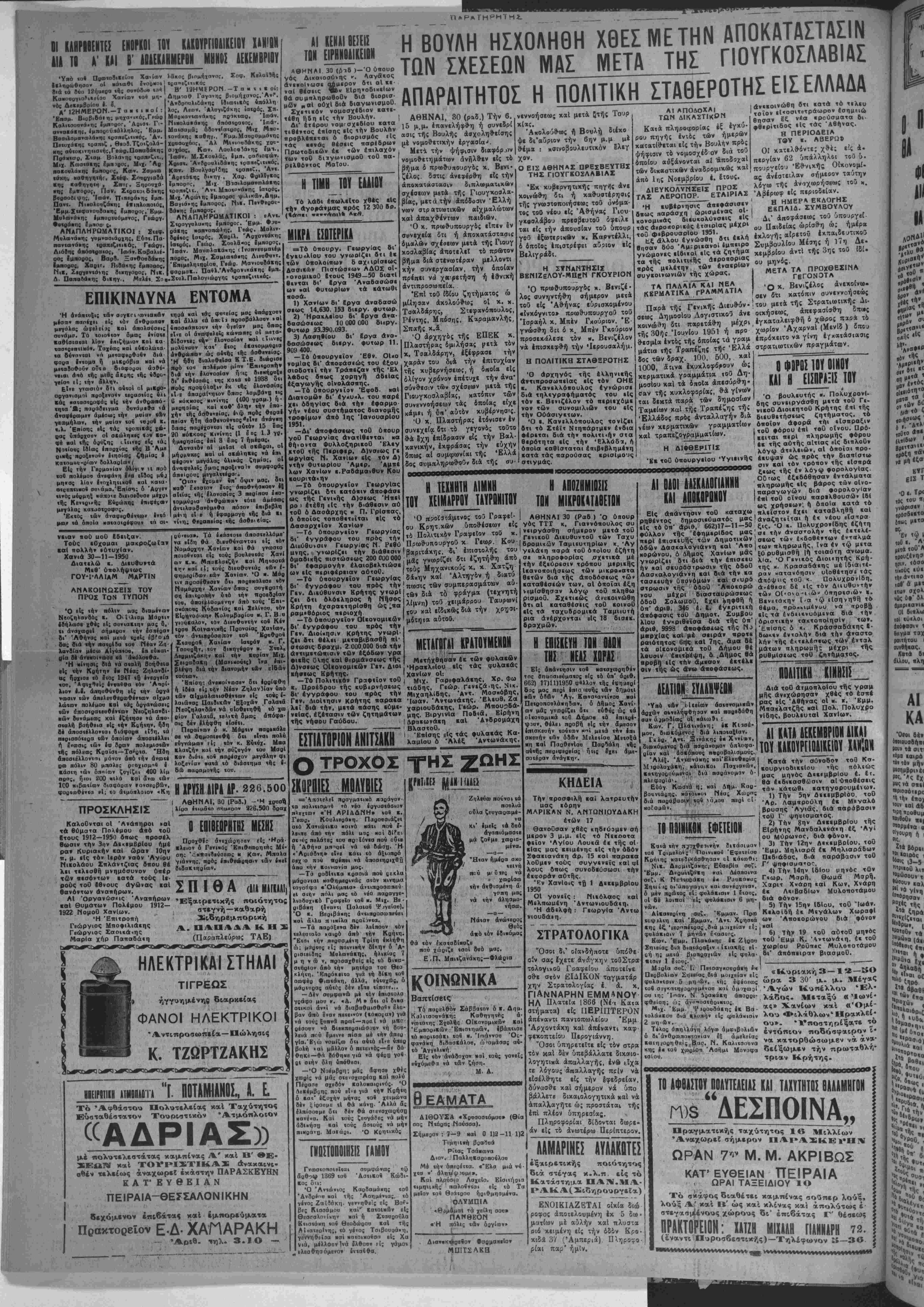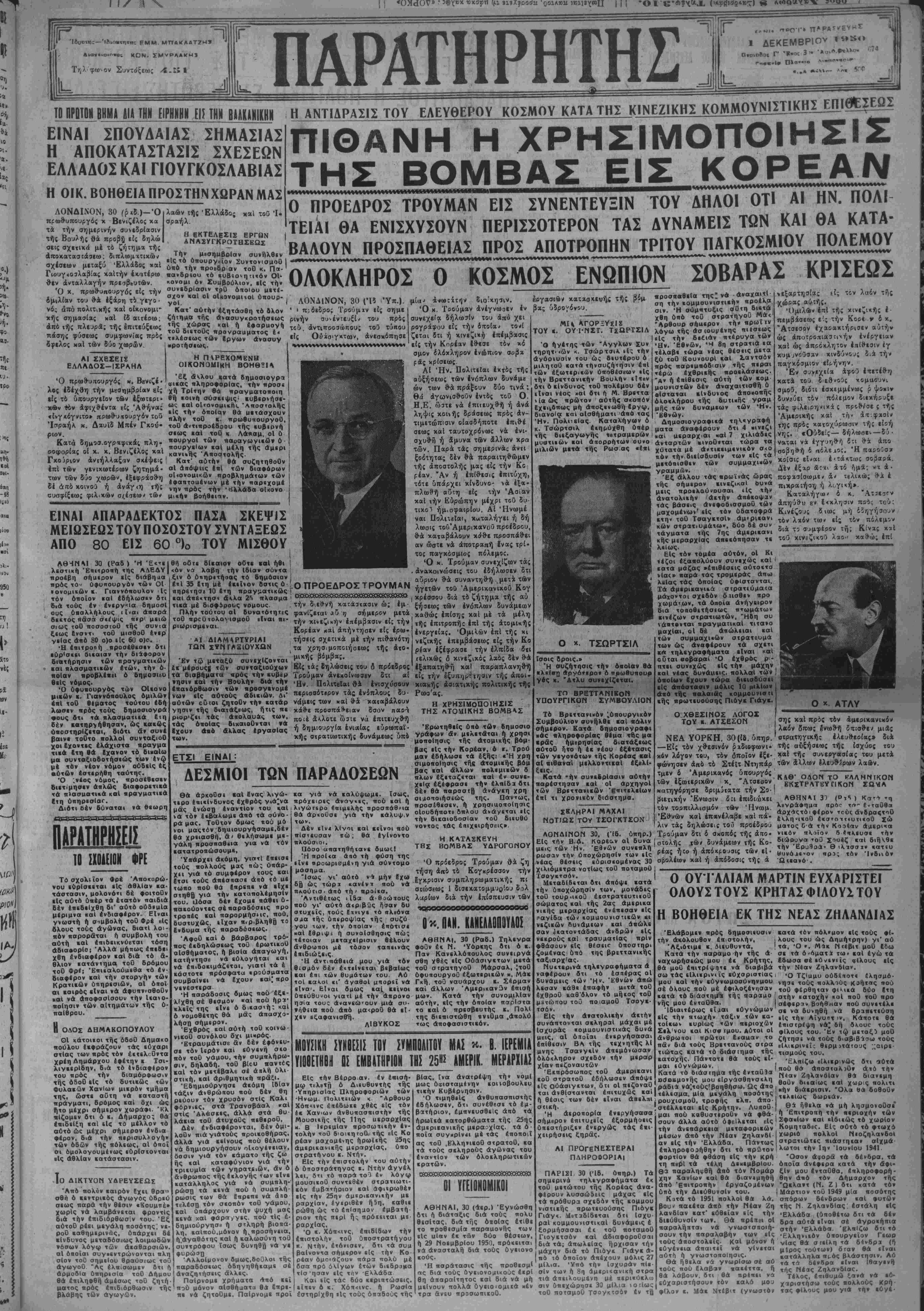 ως καΐ οΙ<ονοαικπ(, 'Λποστολής είς την οποίαν θά μετάσχουν πλήν τοθ κ, κρωθυπουργοθ, τοθ άντιπραβδοου τής κυβΐρνή σιως καί τοθ κ Λάηαμ, οί Ο πουργοΐ των παραγωγέων Ο πουργεΐων «αί μελη τής άμερι κανι»ής 'Λποατολής. Κατ' αυτήν θά συζητηθοθν αί άπόψπς επί των διαφόρων οΙ«σνομικων ηροβλημάτων των βφαπτοιιένων μέ την παρκχομβ νην πρός την 'Ηλλάδα οΐχονο μκήν βοήθειαν. Η ΑΝΤΙΔΡΑΣΙΣ ΤΟΥ ΕΛΕΥΘΕΡΥ ΚΟΣ Κ ΠΙΟΑΝΗ Η ΧΡΗΣΙΜΟΠΟΙΗΣΙΣ ΤΗΣ ΒΟΜΒΑΣ ΕΙΣ ΚΟΡΕΑΝ Ο ΠΡΟΕΔΡΟΣ ΤΡΟΥΜΑΝ ΕΙΣ ΣΥΝΕΝΤΕΥΞΙΝ ΤΟΥ ΔΗΛΟΙ ΟΤΙ ΑΙ ΗΝ. ΠΟΛΙ ΤΕΙΑΙ ΘΑ ΕΝΙΣΧΥΣΟΥΝ ΠΕΡΙΣΣΟΤΕΡΟΝ ΤΑΣ ΔΥΝΑΜΕΙΣ ΤΩΝ ΚΑΙ ΘΑ ΚΑΤΑ- ΒΑΛΟΥΝ ΠΡΟΣΠΑΘΕΙΑΣ ΠΡΟΣ ΑΠΟΤΡΟΠΗΝ ΤΡΙΤΟΥ ΙΐΑΠ(ΟΣΜΙΟΥ ΠΟΛΕΜΟΥ ΟΛΟΚΑΗΡΟΣ Ο ΚΟΣΜΟΣ ΕΝΩΠΙΟΝ ΣΟΒΑΡΑΣ ΚΡΙΣΕΩΣ ΛΟΝΔΙΝΟΝ, 30 (Ί5 'Υπ.) ' · π.όεδρος Τρούμχν είς σημε | ρινήν συνέντεοζί/ τού πρδς τού, άντιποοσώπους το5 τύηου είς Ούίσιγχτων, άνεσχάπησε ΕΙΝΑΙ ΑΠΑΡΑΔΕΚΤΟΣ ΠΑΣΑ ΣΚΕΨΙΣ ΜΕΙΩΣΕΩΣ ΤΟΥ ΠΟΣΟΣΤΟΥ ΣΥΝΤΑΞΕΩΣ ΑΠΟ 80 ΕΙΣ 60 °)ο ΤΟΥ ΜΙΣΘΟΥ ΛΘΗΝΜ 30 (Ραδ) Ή Έ«*ε λβστική 'Εηιτροπή τής ΛΛΕΔΥ προέβη σήιιερον είς διάβηιια κρός τό" θφυπουργόν των ΟΙ • ονομΐιών κ. ΓιαννόπουΧον . Ις τόν οποίον καί εδήλωσεν δτι δια τούς έν ενεργεια δημοσΐ ούς οπαλλήλους ιΙ«αι άπαρά δεκτος Λασά σ«<ψις π»ρΐ μιιώ σΐως τοθ ποσοστοθ τής συνιά ξεως 6νσντ> τοθ μισθοθ έ»ερ