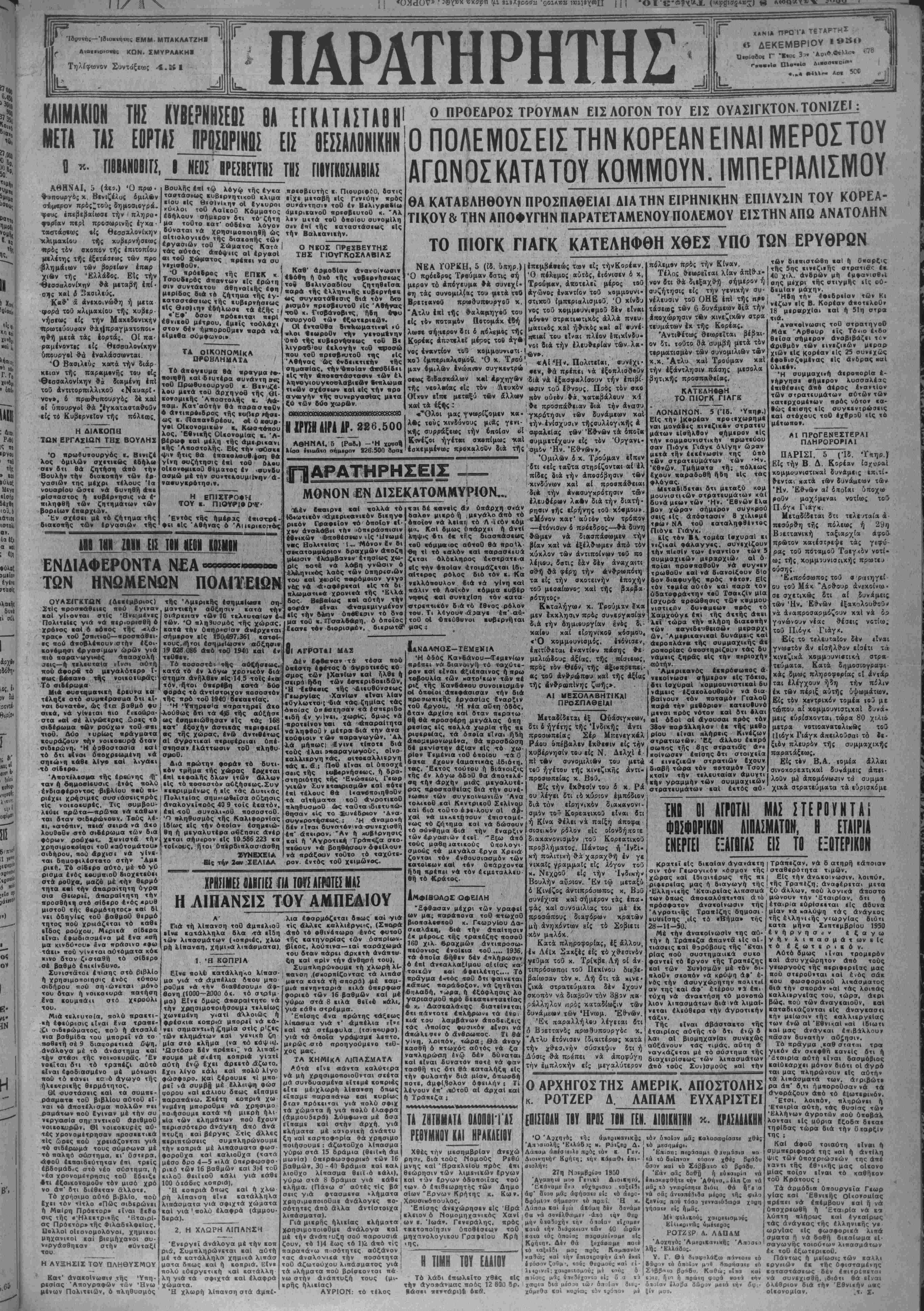 -<*σρά τοθ κλιμαχίου τή; κυβερ¬ νήσεως είς την Μαχιδονιχήν ΐϊρωτεύουααν θα ^πραγματοποι¬ ηθή μεΐά τάς εορτάς. Οί πα· ραμένοντες είς θεσσαλονίκην ϋπουργβΐ θά έναλάσσωνται. Ό Βασιλεύς χοκά την διάρ¬ κειαν τής παρκμονής τού είς ■θεσσαλονίκην θά διαμένη επι τοθ άντιτορπιλλιχοΰ ΐΝαυαρϊ· νόν·, ο πρωθυπουρν'ος δέ καί βί ύπουργοί θά £έγχατασταθο3ν είς το Κυβερνείον τής πόλεως. Η ΔΙΛΚΟΠΗ ΊΏΝ ΕΡΓΑΣΐαΐΜ ΤΗΣ ΒΟΥΛΗΧ «Γου «ου Ό πρω6υ«ουργός ν. Βινιζί. λος ομιλών σχετικώς κδήλω σιν δτι θά ζητήση Λπό την Βουλήν την διακοπήν των ερ· γασιών της μκχρι τέλους Ία νουαριΌυ ώστε νά δυνηθή *πε ρΐσπαστος ή κυβέρνησις νά ε¬ πιληφθή των ζητημάτων των βορΐΐων επαρχίαν. Έν σχέσει μέ τδ ζήτηαα τής βιακοπής των εργασιών τής ουν μα τοθτο κατ' ουδένα λόγον δύναται νά χρησιμοποιηβή ώς αΐτιολογικόν τής διακοπής των εργασιών τοθ Σιίματος Κατά Ι τάς αύτάς άπόψπς αί εργασΐ αι τού Σωματος πρΐπει νά συ ΟΑ ΕΓΚΠΙΙΠΙΙΒΙΙ' °ΠΡ0ΕΑΡ0Σ τρουμαν εισ λόγον τού εισ ΕΙΣ ΒΕΣΣΑΛΟΝΙΚΗΝΙΟ ΠΟΛΕΜΟΣΕΙΣΤΗΝ ΚΟΡΕΑΝ ΕΙΝΑΙ ΜΕΡΟΣΤΟΥ ΑΓΩΝΟΣΚΑΤΑΤΟΥ ΚΟΜΜΟΥΝ. ΙΓνΐΠΕΡΙΑΑΙΣΓνΙΟΥ ΘΑ ΚΑΤΑΒΛΗΘΟΥΝ ΠΡΟΣΠΑΘΕΙΑΙ ΔΙΑ ΤΗΝ ΕΙΡΗΝΙΚΗΝ ΕΠΙΛΥΣΙΝ ΤΟΥ ΚΟΡΕΑ- ΤΙΚ0Υ6 ΤΗΝ ΑΠΟΦΥΓΗΝ ΠΑΡΑΤΕΤΑΜΕΝΟΥΠΟΛΕΜΟΥ Ε1ΣΤΗΝ ΑΠΩ ΑΝΑΤΟΛΗΝ ΤΟ ΠΙΟΓΚ ΠΑΓΚ ΚΑΤΕΛΗΦΘΗ ΧΘΕΣ ΥΠΟ ΤΩΝ ΕΡΥΘΡΩΝ ι. Πιουριφ6ϋ, δστις . οί (γκυροι συνάντησιν τοθ εν Βελιγραδίω «« Ααικου Κόμματος άμερικανοθ πρτοβευτοθ κ. "Αλ σήμερον δτι τόζήτη λεν υ«τά τοθ δποίου συνομΐλη σιν επί τής καταστάσεως είς την Βαλκανικήν. Ο ΝϊΟΣ ΠΡΕ2ΒΕΥΤΗΣ ΤΗΣ ΓΙΟγΓΚθΣΛΛΒΙΛΣ νεχιαθοθν. Ό πρόεβρος ΕΠΙΚ Καβ' ααμοδΐαν ανακοίνωσιν αιν συντάκτου μερίδος διά τό τής ?νη- εγ- "βρ* ζητηθκισα. διά - —▼ —-. ιΐμυκιιται περι — συργοθ έθνικοθ μίτρου. εμείς τοόλάχι / οί ίν«< στον δέν ήμτιοροθμεν «αρά νά είμεθα σύμφωνοι» τω» ΤΑ ΟΙΚΟΜΟΜΙΚΑ Π#ΟΒΛΗΜΑΤ& Τ6 Λττβνευμα βά βρβγμα ··>.