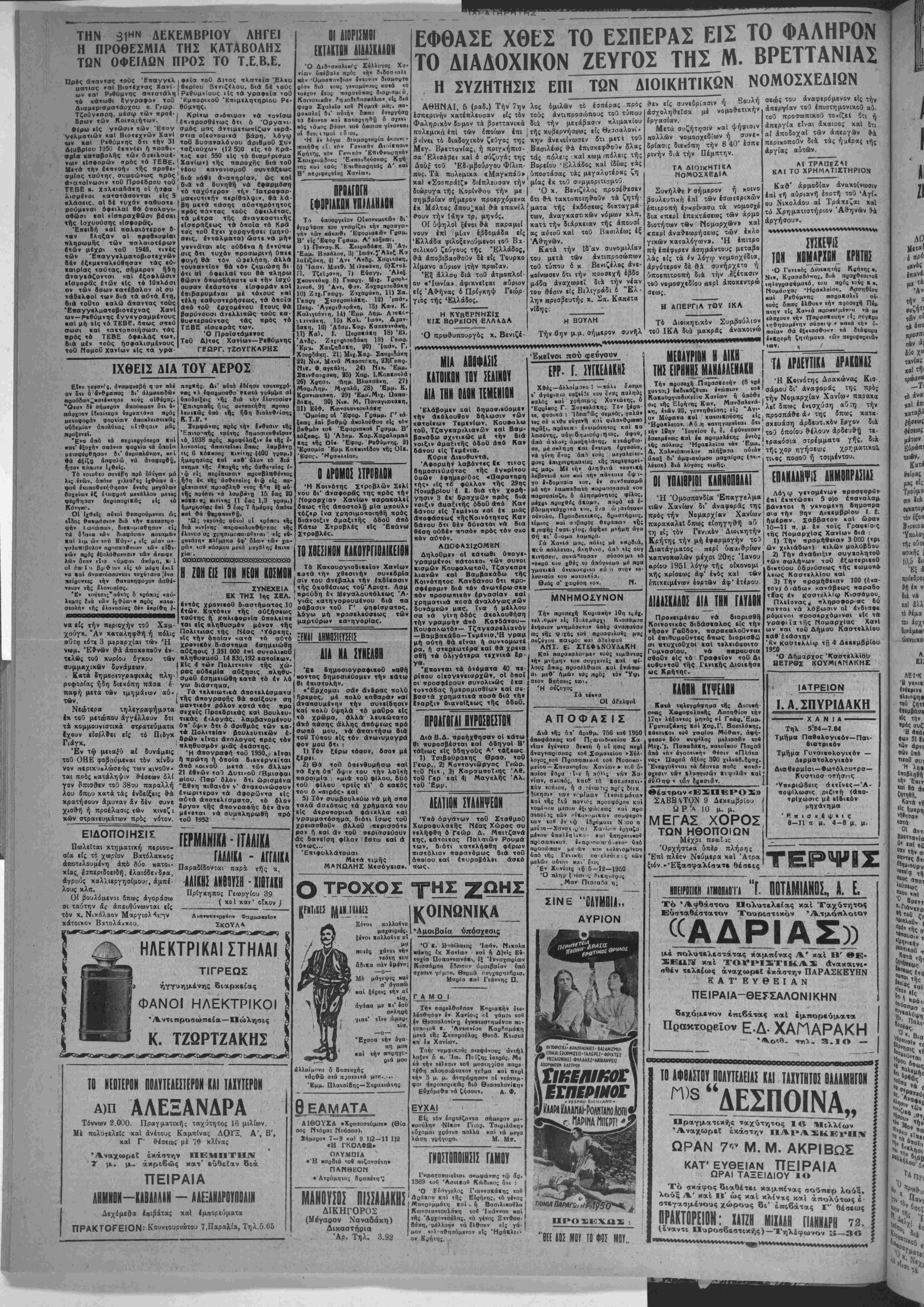 ρόμενοι ποοσερχόμβνοι εΙ< τά- γραφΐϊαΐ ιης ΝοααρχΙας ΧανΙ ών »αι τοΰ Δήμσυ ΚαστελλΙου καθ'έΐάστην "Κν καστελλΐω τη 4 Δεκεμβριού 1950 Ό Δήμαρχος 'Καστιλλίου ΗΕΤΡΟΣ ΚΟΥΜΙΑΝΑΚΗΣ Θέατρον «ΕΣΠΕΡΟΣ» ΣΑΒΒΑΤΟΝ 9 Δεκεμβριού ΩΡΆ 10 μ. μ. ΜΕΓΑΣ ΧΟΡΟΣ ΤΩΝ ΗΘΟΠΟΙΩΝ Μεχρι πβΐίΐκ Όρχήστ*α 6πέρ πλήρης Επί πλέεν Νβύμερα καί Άτρα ξιέν.-'Εξασφαλίσατε θέσεις ΙΑΤΡΕΙΟΝ Ι.Α.ΣΠΥΡΙΔΑΚΗ ΧΑΝΙΑ Τηλ 5*84-7.64 Τμήμα Παθολονικόν—Παι¬ διατρικον Τμήμα Γυναικολογικον — Δερματολονικόν Διαθερμίαι—Φωτόλουτρσ— Ύττκριώδϊΐς αΐτινες—'Α- ποψΐλωαις ριζιεή (απο- τρίχωσις μέ ειδικόν μηχάνημα ■Ρπισκίψβις 8—11 π μ. 4-8 μ. μ. ΤΕΡΨΙΧ ΙΗΕΙγΟΙΙΙΗ εΤΗΟΠΑΟΤΑ "Γ Π0ΤΑΜ1ΑΗ0Σ., λ. Ε. Τό Άφθάστου πΒύσταθέατατον Πολυτελείας Τουριστικόν καί Ταχύτητος Ατμόπλοιον «ΑΔΕΙΑΣ» μέ ηολυτελεστάτας χαμπίνας Α* καί Β' ΘΕ- ΣΕΩΓ¥ καί ΤΟΥΡΙΣΤΙΚΑΣ άναχαινι- βθέν τελείως αναχωρεί εκάστην ΠΑΡΑΣΚΕΥΗΝ ΚΑΤ' ΕΥΘΕΙΑΝ ΠΕΙΡΑΙΑ-ΘΕΣΣΑΛΟΝΙΚΗΝ δεχόμενον επιβάτας καί έμπορεύματα Πρακτορείον Ε·Δ· ΧΑΠΑΡΑΚΗ , 31.10 — ΠΡΟΣΕΧΩΣ: "ΒΕΕ ΔΟΣ ΜΟΥ ΤΟ ΦΟΣ ΜΟΥ.. ΙΟ ΑΦΙΙΣΤΟΥ ΟΟΑΥΙΕΛΕΙΑΣ ΚΛΙ Τ1ΠΤΗ1Ο! ΟΑΛΑΜΗΓΟΝ ί^ΕΣΙΙΟΙΝΑ,, Πραγματικής^αχύτητος 16 ΜιλλΓων Αναχωρεί εκάστην ΠΑΡΛΣΚΈνΗΝ ΩΡΑΝ 7^ Μ. Μ. ΑΚΡΙΒΩΣ ΚΑΤ'ΕΥΘΕΙΑΝ ΠΕΙΡΑΙΑ ΩΡΑΙ ΤΑΞΕΙΔΙΟΥ ΙΟ οτε ^Τ^ ϊε κ*μ««νας σούπερ λούξ, ύξ Α' καί Β ως καί κλίνας κα, απολύτως έ γ*σμένους χωρους δι' επιβάτας Γ' θέσεως «Π επιβάτας Γ' θέσεως ΜΙΗΑΗ Π1ΝΝΛΡΗ 72.