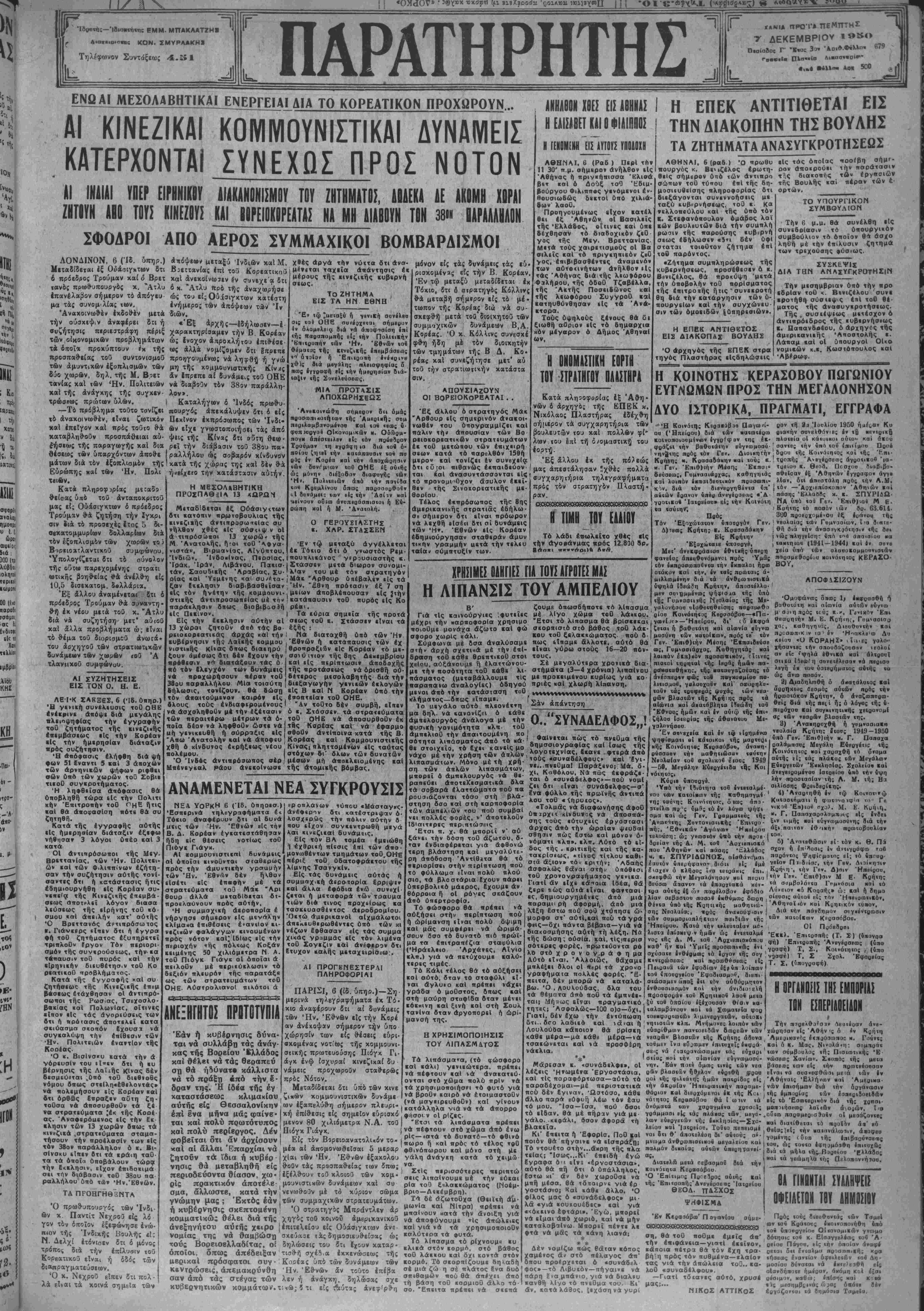 'Κηιιροηήν των Ήν. Εθνών <οβ θ ΛΟΝΔΙΝΟΝ, 6 (Ίδ. δπηρ.) «πόψεων μκταξύ Ίνδιων καί Μ. Χ?δς άργά την νύττα βτι άνα- Μεταδίδεται έξ Ο-όάπΐγχτων δτι Βρεττανίας επί τοΰ Κορεατΐκοΰ ό πρόεδίος Τρούμαν καί δ Βρετ καί ανεκοίνωσεν έν συνβχεα δτι τανός πρωθυπουργός κ. "Ατλυ ό κ. Άτλυ προ τής αναχωρήσε έπανέλαβον σήμερον τό άπόγιυ· ώς τού «ίςθύ^σιγκτων κατέστη μα τάς συνομ<λίας των. ένήμερο; των άπόψεων των Ίν Ανακοινωθέν εκδοθέν μΐτά διών. την σύσκεψιν άναφέρει δ:ι ή «Έξ άρχής— Ιδήλωσβν—έ συζήτησις περιεστράφη πέριξ χαρακτηρίσαμεν την Β. Κορέαν των οικονομικήν προβλημίτων ώ; Ινοχον άπροκλήτου έπιθ·έσβ· τ* όϊτοΐ* προκύπτουν ί* τής ως άλλ* νομίζομεν δτι Βπρεπε προσπαθείας τοΰ αυντονισμοϋ προηγουμένως νά ληφθξ ή γνώ των άμυντικών έξοπλισμών των μη τής κομμουνιστικάς Κΐν^ς δύο χωρων, δηλ. τής Μ. Βρετ άν Ιπρεπε αί δυνάμεις τοΰ ΟΗΕ τανίας καί των Ήν. Πολιτικών νά διαβοΰν τόν 38ον παράλλη- χαί τή; άνάνκης τής συγκεν- λον». τρώσβως πρώτων ύλων. | Καταλήγων ό Ίνδός πρωθυ- —Τί πρόβλημα τούτο τονίζε,ι «ουργός άπεκάλυψεν δτι δ είς τό ανακοινωθέν, είναι ζωτικόν ΠεχΙνβν έκπρόσωπος των Ίνδι- χαΐ έπεΐγον καί πρός τούτο θ·ά ών εϊχε γνωστοποιησισ τάς άπό χαταβληθΌΰν προσπάθειαι αύ· ψεις τής Κίνας δτι βδτη θεώ· {ήσεως τής παραγωγής καί δια ρεΐ την διάβασιν τοΰ 38ου πά- θέσεως των υπαρχέντων άποθε ραλλήλου ώς σοβαρόν κίνδυνον μόνον εί; τάς δυνάμεις τάς ιυ· μάτων διά τον έξοπλισμον τής κατά τής χώρας της καί δέν 9-α Εύρώπης καί των Ήν. Πολι ήνείχετο την κατάστασιν αυτήν. Τίΐων. Κατα πληροφορίας μί:αδο θείοας 6π6 τοθ άνταποκριτοϋ μας εί; Ούάσιγκτων δ πρόεδρο; Τρούμαν *ά ζητήση την ·νκρι σιν διά τό προσεχές ϊτος 5 δι- θβκατομμυρίων δολλαρίων δια τον έξοπλισμον των χωρων το; Βορειοχτλαντικοϋ συμφώνου. Ύπολογίζιται δτι το σύνολον τή; οϋτω παρεχομένης στρατι ωτικής βοηθείας #α ανέλθη είς 10,5 δισεκατομ. δβλλίρια. Έξ άλλου αναμένιτο» δτι δ ηρόιδροί Τρούμαν θ·α σανανχη θ·ί} έκ νέου μετά τοθ κ. "Ατλυ δια νά συζητήση μετ* αύ(θΰ καί άλλα προβλήματα ώ; Είναι τό θέμα τοΰ δΐορισμεΰ ανωτά¬ του άοχηγοΰ των στρατιωτικών δυνάμειον των χωρων ιοΰ Ά τλαντικοΰ συμφώνυυ. ΑΙ ΣΥΖΗΤΗΣΕΙΣ ΕΙΣ ΤΟΝ Ο. Η. Ε. ΛΕ·Ι·Κ ΣΑΚΞΕΣ. 6 (Ίδ. ΰπηρ.) Ή γινική συνέλευσις τοθ ΟΗΕ ενέκρινε άπόψε δια μκγάλης πλϊιοψηφΐας «ήν εγγραφήν τοθ ζητήματος τής κινεζι«ής επεμβάσεως είς την Κορέαν είς την ημερησίαν διάταξιν νρός συζήτησιν. ■Η απόφασις ελήφθη δια ψή •ών 51 Εναντι 5 καί 3 άποχών των άρνηνικων ψήφων ριφθει σών υπό των χωρων τοθ Σοβιι τικοθ συνκροτήματος. Ή ληφθεϊσα Απόφασις θά υποβληθή τ ώραι είς την Πολιτ κή» Επιτροπήν τοθ <~ΉΕ ήτις καί θά αποφασίση πότβ θά συ ζητηβη. Κατά τής έννρα»ής αυτής είς ημερησίαν διάταξιν εξεψω νήβησαν 3 λόγοι υπέρ καί 3 κατά ΟΙ άντιπρόσωποι τής Μεγ Βρεττανίας, των Ήν. ΠολιτΕΐ- ων «αί των φ,λιτιπίνων εζήτη¬ σαν την συζήτησιν αυτής τονΐ- σαντες δτι ή κατάστασις ήτις εδημιουργήθη είς Κορέαν συ· νβπϊΐα τής Κινεζιιής έπβμβά- σεως αποτρλΐϊ λόγον διασα λεύσβως τής εΐρήνης τοθ «ό- σιιου «οί απειλήν κατ' αυτής Ό Βρεττανός αμτιπρόσωτος ν. Γιάνυρς ΐΐπιν βτι ή έγγρατ φή τοθ ζητήματοο έξυπηρβτβΐ τριπλοθν Εργον Τόν περιορι¬ σμόν τής συννρούσβως, τήνΐια τάπαυσιν τοθ πυρός καί την «Ιρηνικήν 6ΐίυθέτησ.ν τοθ Κο ρεατικοΩ προΒλήματος. Κατά τής έννοαφήζ καί συ· ζητήβεωί τής Κινΐζιΐής έπβμ βασιως έτάχθησαν οί άντιηρό σωηοι τής Ρωσίας, Τσεχοσλο¬ βακίας «αί Πολωνίαν, οΐτινες «Ιπον είς τας άνοριύσεις των δτι ή τιρόιασις αποτελεί κατα σκύ
