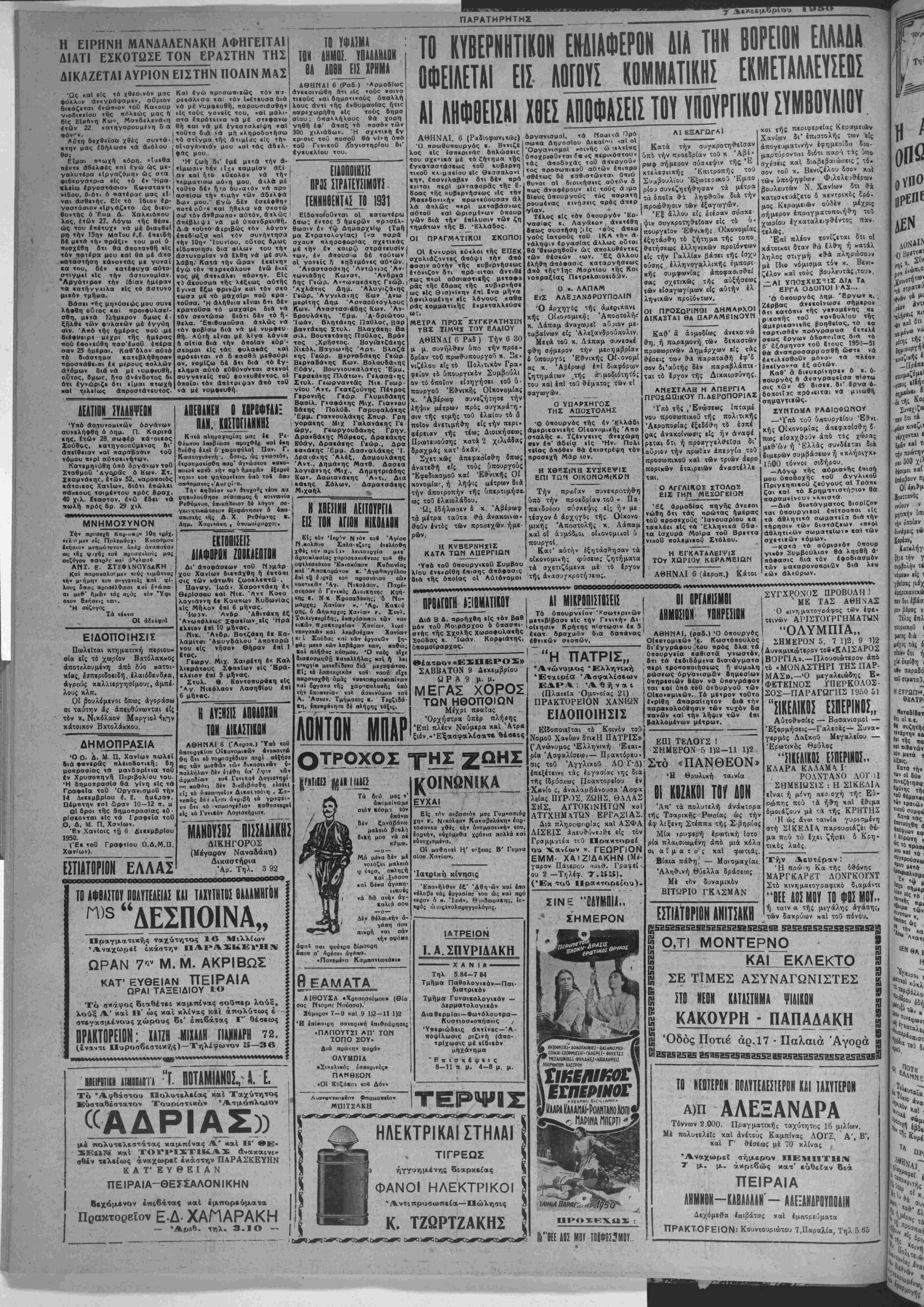 των βεσεων <ων. Έξ αλλου έλήθη απόφασις καταργήσιως άπό της» 1ης ΜαρτΙου τής Κοι νοπραξίας Πετρελαιοειδ^ν. Ο κ. ΛΛΠΑΜ ΕΙΣ ΑΛΕϊΑΝΔΡΟΥΠΟΛΙΜ Ό άρχηγός τής άμεοικανι κης Οίχονομικη; Αποστολήν κ. Λάπαμ αναχωρεί αυριον με¬ ταβαίνων είς Άλεξανδρούπολιν. Μετά τοΰ κ. Λάπαμ σννεσκέ φθ·η σημερον την μεσημβρίαν ί ύπουργίς Έθ·νικής Οί^ονομί άς κ. Άβέριβφ ίτί διαφόρων ζητημάτων .τής ά,μοδιότητό; τού καί επί τοΰ θέμχτο; τθ)ν ε! σαγωγών. Ο ΥΠΑΡΧΗΓΟΣ ΤΗΣ ΑΠΟΣΤΟΛΗΣ •Ο Οπουργός τής έν Ελλάδι άμερικανικής ΟΙΐονομκής Άπο σταλής κ. Τζίνγκινς άνεχώρη οεν έπ' άδίΐα «Ις Ήν, Πολι τείας οπόθεν θά επιστρέψη τόν προσέχη Μάρ ιον. ΑΙΕΞΛΓΩΓΛΙ Κατά τήν συγ·*ροτη*εΐσαν υπο τήν προεδρίαν τοθ κ Άβί· ρωφ σήμερον σύσκεψιν τής Έ κτελεο,,ικής 'Κΐτιτροπής τού Συ^βουλίου Έξωΐεδνκοό Έμπ° ρ£ο^ συνεζητή»ησαν τα μέτρα τα ίποΐα ^■^ ληφ9·οΰν δια την Ιπροωθηοιν των Ιξαγωγών. Ι *Ε6 *λλου είς ετέοαν σύσκε ψιν συγκροτη^εΐοαν είς το υ¬ πουργείον Έ&νιχήί ΟΙκονομίας έξτ)τάσ»η τδ ζήτημα τής τοπο »ετήσεαις έλληνιχών προίόντων είς την Γαλλίαν βάσει τής ίσχυ ούσης έλληνογαλλικής έμπορι κί)ς συμφωνίας άποφασισθεί β«ς σχετικώς τ»ς αυξήσεως των είσαγωγίμων είς αυτήν έλ ληνΐκών προϊόντων. ΟΙ ΠΡΟΣΟΡΙΝΟΙ ΔΗΜΑρλΟΙ ΔΙΚΑΣΤΑΙ ΘΑ ΠΑΡΑΜΕΙΝΟΥΜ Η ΧΘΕΣΙΝΗ ΣΥΣΚΕΨΙΣ ΕΠΙ ΤΩΝ ΟΙΚΟΝΟΜΙΚΟΝ Τήν πραιίαν συνεχροτήθ-ΐ] υπο την προεδρίαν τοΰ « Πά πανδΐέου σύσκεψις είς ήν με τέσχον δ άρχηγ6ς τής Οίκονο μικής Άποστολής κ. Λάπαμ κ αί οί ά^μόδιθι οίκονομΐκθΐ ύ πουργοί. Κατ' α&τήν ?ξΓ|τάσίί·7)σαν τα οίκονομΐκής φύσεως ζητήματα τα σχετιζόμενα μέ τό Ιργον τής άνααυγκροτή3ε(ΐ);. Καθ' & άίμβδίως άνεχο νώ 1, ή ΠΛραμονή των δΐχαστων προσωρινήν Δημάρχων κίς^ τάς ίς ρ σον δι'αύτής δέν παραβλάπτι- τ«ι το ίργον τής Δικαιοσύνης. κοι τής περιφερείας Κεροτμιιών Χανίων δι' ίπιστολής των είς απογευματινήν ίφημεοίδα δια- μαρτύροντγΐΐ διότι παρΛ τ^ς ^«ο· σχέαεις καΐ, διαβεβοιιώσεις; τό. σον τοΰ κ. Βενιζέλου δσον καΓ των ύποψηφίων Φιλελεο9·ίρων Βουλευτών Ν. Χανίων δτι »ά χατεσΗευάζετο δ χεντριχός Σρό· μος Κεραμειιον ουδέν ^ μέχρις οήμερον έπραγματοποιή6·η χωρίου Ιγκαταλειφθέντος τελώς. Επί πλέον τονΐζεται δτι οί κάτοΐχοι δταν »ά δλθ-η ή «ατάλ τοθ παν ληλος στιγμή «»* . μέ ΐϊιβ νόμισμα τίν κ. Βενι- ζίλον καί τοΰς βουλευτάς .τού». -ΑΙ ΥΊΟΣΧΕΣα-ΐΣ ΔΙΑ Τ* — ΕΡΓΑ ΟΔΟΠΟ1 ΙΆΪ... ■ό δπουργός Δημ. Έργων «. ΖίρΒας ανεκοίνωσε σήμερον 6<ι κατόπι. τής νενομένπς π« ρ^κοπής τοθ «ονδυλΐου τής αμερικανικΒς βοηθείας, το κα ταρτισθέν πρόνραμαα έΐτελ* σεως δργων όδοπσιΐας 6«Λ τό Ρ' εξάμηνον τοθ 6τους_ 1950—51 Θά άναπροσαρμοσθή ώβτε νά £<τΕλεσθο0ν μόνον τά ήλιον Ιπείγοντα έξ αυτών Καθ" α διβυκρΐνησεν ό κ. ϋ- «ουρνός ή άναγραφβισα πίστω 45 δισεκ. δι ίρνα ό· πρό«βιται νά μϊΐωθή τής ,'Ενώυε», ίπταμέ νού προσωπικού τής πολιτικάς Άεροποιίίας εξεδόθη το έσπέ οας ανακοίνωσις είς ήν άναφέ ριται βτι ή προαγγελθείσα δι* _ αυριον την πρωΐαν άπείγία τού ί προσωπικού καί των τριών άερο πορΐχβν έταιρειων άναστέλλε ται. Ο ΑΓΓΛΙΚΟΝ ΕΙΣ ΤΗ/< ΜΕΣΟΓΕΙΟΝ '6ξ αρμοδίας πηγης άνεκοι νώθη δτι τάς πρώτας ημέρας τοθ προσεχούς Ίανουαρίου κα ταπλέει είς τά Έλληνικά ΰδα- τα Ισχυρά ΜοΙρα τοθ Βρεττα νικοθ πολεμικοθ Στόλου. Η ΕΓΚΑΤΑΛΕΙΨΙΝ ΤΟΥ ΧΩΡΙΟΥ ΚΕΡΛΜΕΐαΝ ΑΘΗΝΑΙ 6 (άεροπ.) Κάτοι ΣΥΝΤΟΜΑ ΡΛΔΙθΦ-ΝΟτ* —'Γτιδ τοΰ 6ηουρ/είου 'Εθνι χής Οίκονομίας απεφασίσθη 2 πως είσαχθ^ϋν άΐτδ τ4ς χώοας ή Ελλάς συνδέεται δια. συμβάοιων ή ακλήοιγκ» ί 1500 τόννοι σιδήρου. —Λόγω τής αΰριανής έττισή μου ύποδοχής τοθ άγγλικοθ Πριγκηπικοΰ ζεύγους αί Τ