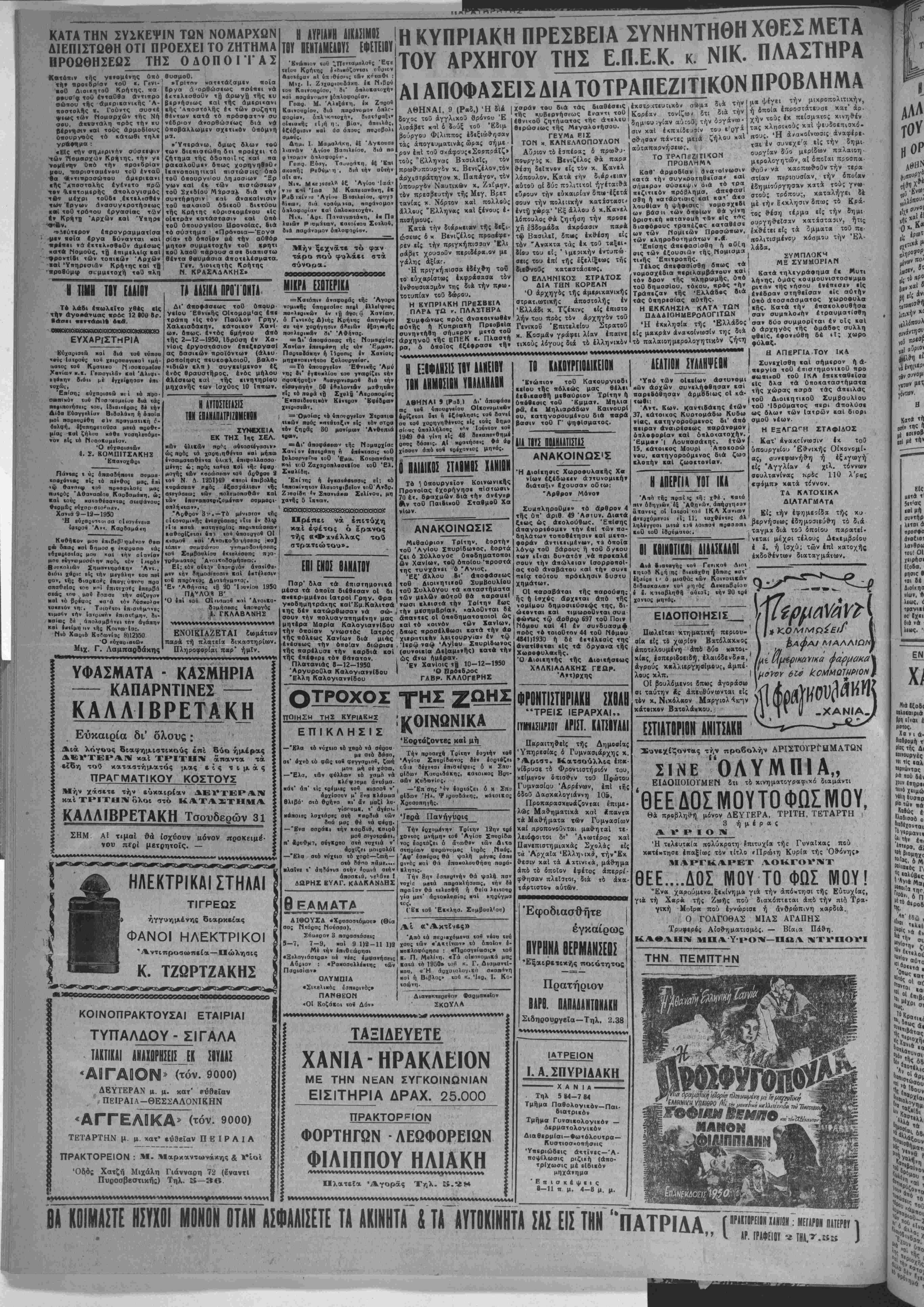 οών Κ»8<ονίος. Ι —Έκ'οης *ίν ίοαιάζβι δ κ Σπυ θ13ων Ή«. Χουαοπηγής. Ίβρά Πανήγύρις Τή» βοχομένην Τρίιην 12ην χονΐος μνήμην «οβ 'Λγίου νος έαοτάζΒΐ ό άνωθεν «ών βιτα ο«ηο1(&ν φβρωνυμος ΙβοΑς Μαός, θά ψαλή μέγας έοπβ έθή ά Ηλαΐνε τ' άηίόνια στήν Ρομιά άποσκιά, Λ-ΡΗΣ ΕΥΑΓ. ΚΑΔΚΑΝΔΗΣ Θεαματα (Θία ΑΙΘΟΥΣΑ «Χπυαασιόμοο» οος Ν«όοας Νονοοα). Σήιιβοον 3 παοαστάσβι; 5-7. 7-9, «αί 9 1)2-11 1)8 Μβ «ήν εηιθεώοηαι «Ξβλπγιάαΐοα» υ έ νιες έμφανήοβις Αΰοιον : «Ρακοσαλλέϋΐτις «ών Παριαίων» ΟΛΥΜΠΙΑ έοπιοινός» ΠΛΜΘΕΟΝ «ΟΙ Κοζάΐοι «οί Δόν» Άφ' υ; ψ μ Κΐ'ίις κοί θΐί έπα«ολαυθήβη ΐλητις. Την 8ην έατιβο«νήν θά ψαλϋ παν ναχίε μειά παβαΜλήσΒοος, την 8β πβαιΐιΐν Θά κλΒσβή ή θβία λβιιοοο γία μβΐ,' άαΐοιιλββίας καί κηοθγ «ος'. (Εκ <ο6 "Εκκληο. ΣυμβουλΙθϋ) Αί «Άχτίνες» Άπ6 (ά ηεοιιχΰμενα «ο» νεοα «βθ χοα: «ών αΆκτΙνων» «6 οποίον έ- ■οκλοιρόοησβ : «Ποοσγβίοοις» ιοά κ. Π. Μβλίΐη. αΤά οΐκπναμικά μας ΐαιά τα 1950» ιοβ κ. Γ. ΔιαμανιΙ- ■00, «Ή άοχαιολογική η ■οί ή Βιβλο;» »ο€ κ, Ίβα. Ι, Κο- «οώ»η· ΣΚΟΥΛΑ ΤΑΞΙΑΕΥΕΤΕ ΧΑΝΙΑ - ΗΡΑΚΛΕΙΟΝ ΜΕ ΤΗΝ ΝΕΑΝ ΣΥΓΚΟΙΝΩΝΙΑΝ ΕΙΣΙΤΗΡΙΑ ΔΡΑΧ. 25.000 πρακτορειον ΦΟΡΤΗΓΩΝ ΛΕΩΦΟΡΕΙΟΝ ΦΙΛΙΠΠΟΥ ΗΛΙΑΚΗ Πλατεία Αγοραίς Τηλ. 5.28 ΤΟ ΚΑΚΟΥΡΠΟΔ1ΚΕΙΟΝ 'ϊνώκιον τοθ Κακουρνιοβι κεΐου της πόλεώς μας θέλει βκδικασβή μεθαύριον Τρίτην ή ΰαβθεαιις τοθ 'Κμμαν. ΜηΜα ρα, έκ ΙΙηλιαράδων ΚαινουρΙ ου, κατηνορουμένου διά ααρά βάσιν τοθ Γ φηοΐσματος. ΔΙΑ ΙΊΙΣ ΠΟΑΗΑΑΤΙΣΤΑΣ ΑΝΑΚΟΙΝΩΣΙΣ ΔΕΑΤΙ8Ν .ΥΑΑΗΨΕΒΝ ■Υπό άατυν-μι Ή ΑιοΙκησις Χωροουλακής Χά νίων ε(εδωκΐν άιτυνομικήν διάταξιν Εχουσαν ούτω: Άρθρον Μόνον ΣυκπληροΟμεν τό άρθρον 4 τής ΰπ' αριθ. 49 Αστυν. Διατά ξεως ώς ακολούθως. ΈπΙνης άπαγορεβομΕν την επί των πα- δηλάτων τοποθετηαιν καί μετα¬ φοράν αντικείμενον, τα όποϊα λόγω τοθ βάρους ή τοθ δ^κου των ιΐιαι δυνατόν ,νά πρακαλέ σουν την απώλειαν ΙσορροποΙ- άς τοθ άναβάτου κα) την συνΐ π«(ο: τούτου πρόκλησιν δυστυ χημάτων. ΟΙ καοαβαται τής παοούβη; ήί τ) 1»χώς άρχεται άπό τής νομΐμου δημοσιεύσΐφς της, δι· ώκονται εαΐ τιμωοοθνται συα Φώνως τφ άοθρψ 697 τοθ Ποιν Νόμου καί 41 £ν συνδυασμφ πρός τΑ τοιοθτον 44 τοθ Νόμου 4841)1930 ή δέ εκτέλεσις της άνατΐθβται είς τα δργανα τής Χωροφυλακής. Ό Αιοικητής τής Αιοικήσεως ΧΑΛΚΙΑΔΑΚΗΣ ΓΕΩΡ. Ά»τ)ρχης ΦΡΟΝΤΙΣΤΗΡΙΑΧΗ ΣΧΙΑΗ "ΤΡΕΙΣ ΙΕΡΑΡΧΑΣ, ΑΡΙΣΤ. ΚΑΤΣΙΥΑΑΙ Άντ. Κων. χαντιδάκης 37, κάτοικος Κυοτομάδω Κυδω *Ιας, κατηγορούμενος δι' άπό πείραν άναιρεοεως παράνομον όπλοιρορΐαν καί όπλοκατοχήν. Έμμει» Ί Λουπασά*ης. έτων 15, «άτοικος ΜουρΙ Άποκοοώ νού, κατηγορούμενος διά ζωο κλοπήν καί ζωοκτονΐαν. Η ΑΠΕΡΓΙΙ ΥΟΤ «1 τής ηροοϊ ις «ή; χββ ηΐν όβηγιάν έ| 'Αθηνιή*. άή αιιανκς ο! Ιαΐοοϊ 'οΐί ΙΚΛ Χανίων ανεαχόμΐνοι ϊΙ; 11, ιαχθέντβς άλ ληλίγγοοι μηά «)4 λοιποί ποοα^οηι ΚϋΟ (οθ ίδο«μι«ο(. ΒΙ ΚΒΙΝΙΤΙΚ01 ΔΙΔΑΣΚΑλΙΓ 4ιΑ Ιιαιαγής <ο< Γβτικο* Λιπι εηΐο8 Κοή ής Λιβίάχθη |δπα>ς ·αΐ'