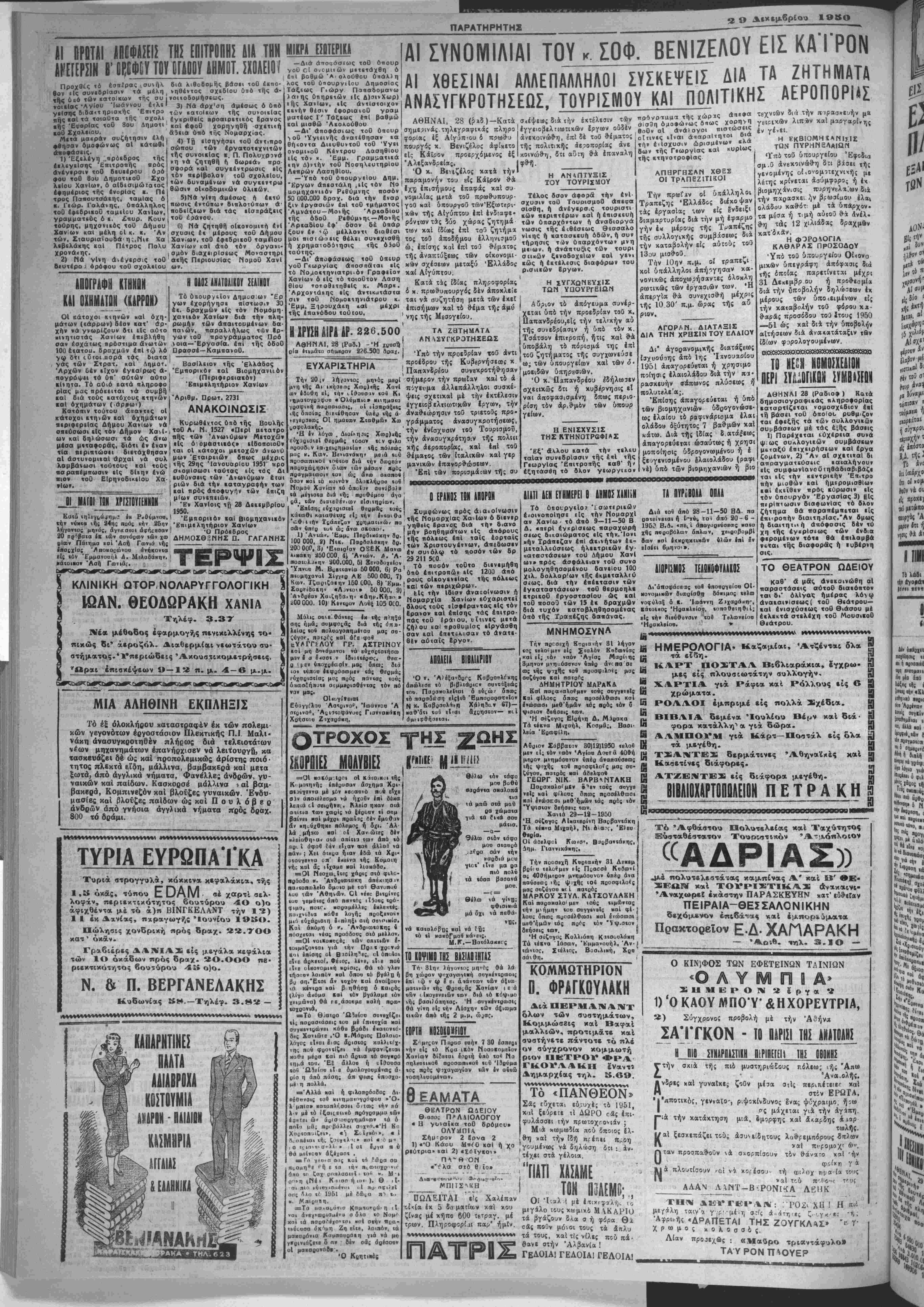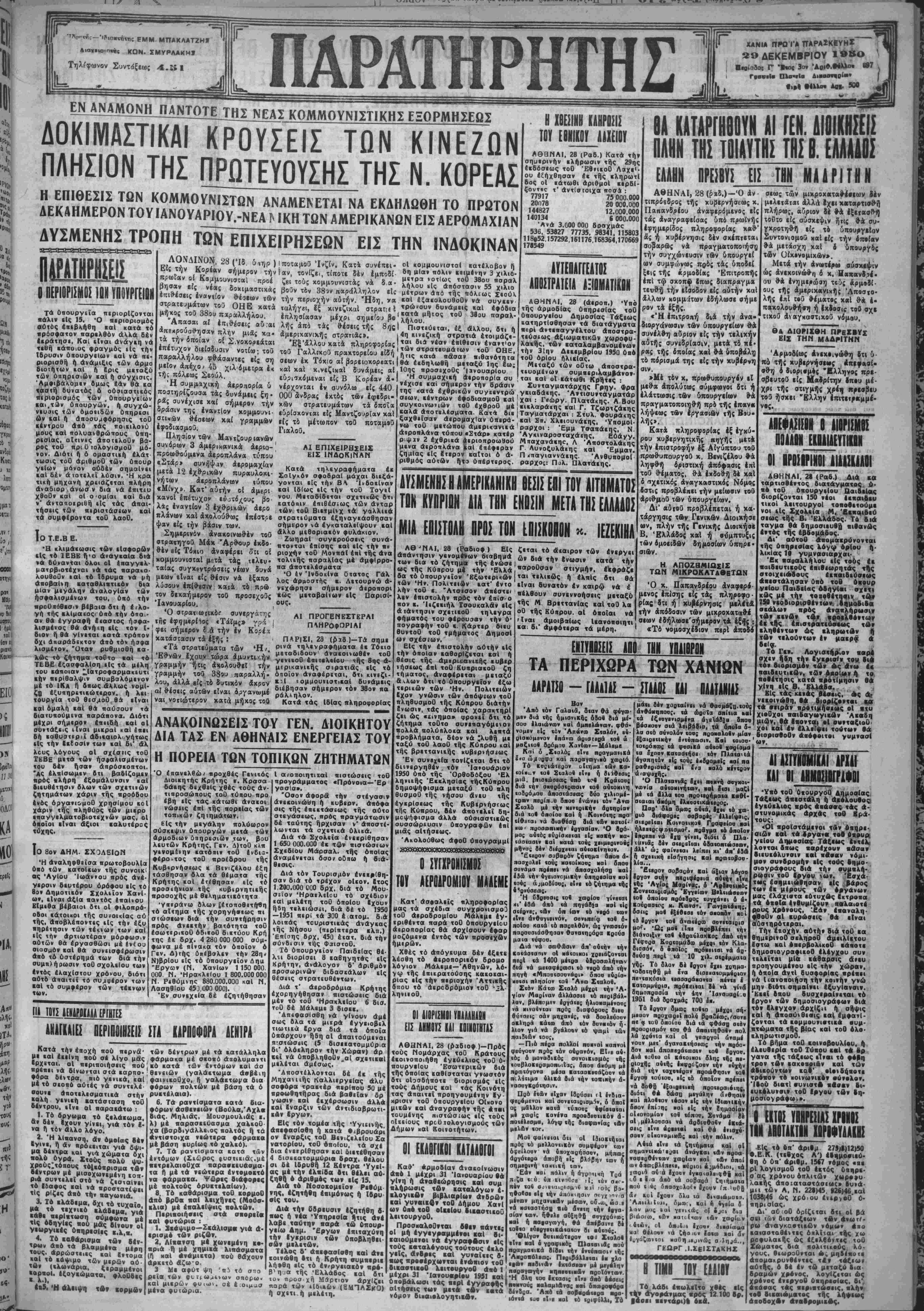 1—1—(—Ι—(—(—Ι—(—(—Ι—<_(_(_(_(_ ΠΕΡΙΟΡΙΣΜΟΝ ΙΟΝ ΥΠΟΥΡΓΕΙΟΝ Τά όπουργεϊα ττϊριορΐζονται πάλιν είς 15. Ό ηεριορισμός αΰτός επεβλήθη «αί κατά χό πρόσφατον παρελθόν οΗλά δεν εεράτησε, Και ιίναι άνάγκη ν ά τεθή κάποιυς φραγμός είς την Ιδρυσιν υπουργείων καΐ νά πε- ριορισθή ή ανάμιξις των άρμο βιοτήτων ιαΐ π Ερις μεταξύ των θηηρεσιΰν «αί ή σύγχισις. 'Λμφιβάλομε» δμως εάν Θά κα «ασ<ή δυνατάς 6 οΰσιαστκός περιορισμός των , υπουργείων και,«3ν ύπουργων, ή συγχώ- νευαις των όμοιιδών ύπηρεσι ών καΐ ή άποσυμφόρησις «οθ εεντρου άαό «άς ιτοικιλσνύ μους καΐ πολυανθρώπους υπη¬ ρεσίας, αΐτινες άποτελοθ» βα- ρος τ ου πριϋτολογισμοθ μό¬ νον. Διότι ή δ σμαστιΐή έλάτ τωσις τοθ άριθμοθ «ών υπουρ γΐΐων μόνον ουδέν σημαίνει καΐ 6έν άτοτελεϊ λύσιν. Ή κρα τική μηχανή χρειάζεται πλήρη άναδιορ , άνωσ ν δια ν ο έπιτιυ χθοθν «αί οί θ'θμίαι καΐ δια ν* άντααοεριθή είς τάς άπαι- τήσεις «ών περιστάσεων καΐ τα συμφέροντα τοθ λαοθ. ϊθ Τ.Ε.Β Ε. Ή κλιμάκωσις των εισφορών ΛΟΝΔΙΝΟΝ, 28(Ίδ. δ*ηρ ) Ιποταμοΰ Ίνζίν. Κατ* συνέπει- Είςτήν Κορίβν σήμερον τήνΐαν, τονίζε., τίποτε δέν έμποδι" πρωΐαν οί Κομμουνισταί προέ ζει τούς κομμουνιστάς να δα- βησαν είς νέας δοκιμαστικάς βοΰν τ6ν 38?ν παράλληλον είς έΓτιθ-έαεις εναντίον θέσεων των την περ.οχήν αυτήν. Ήδη, να στρατευμάτων τοΰ ΟΗΕ χατα ταλήγβ·, ϊξ κινεζικαΐ σχροΐΓίίΙ μήχος τού 38ου πχραλλήλου. έπλησίασαν μέχρι σημείοο βο Άπασαι αί έίΐιθβσεις βυ.αι ' απε<ιρούσί>ησαν πλήν μιδς κα·