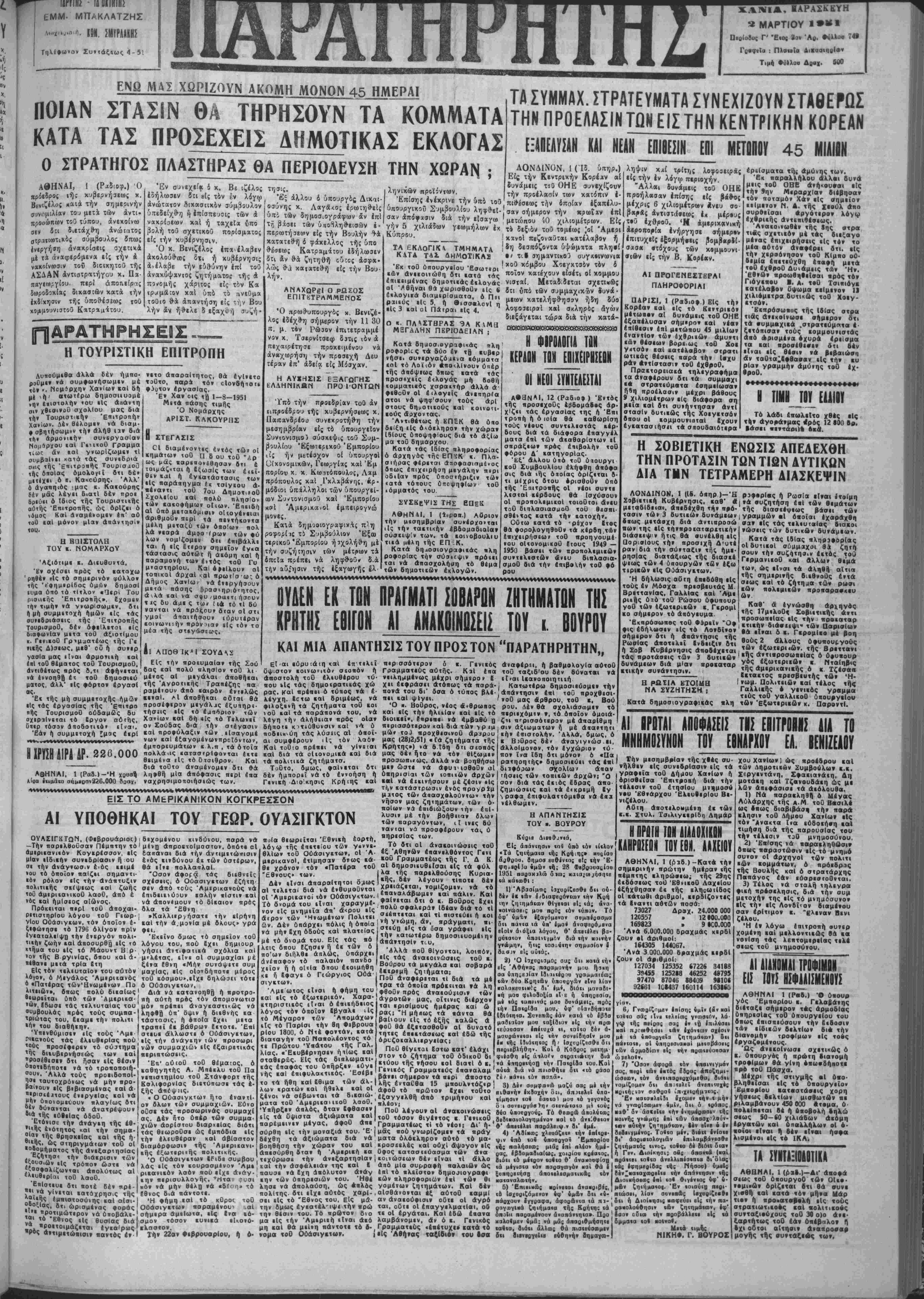 τρ<χμβ:ον χαί υπο τδ ηνεΰμα τοθτο θ·α απαντήση είς την Βου λήν αν ή*ελε δ εξαχθή συζή- τησις. Έξ άλλου 4 υπουργος Δικαι- οσύνης κ. Λαγά<ο; ερωτηθείς υιτό των δημοσιογραφίαν άν επί ημ βάσει των έ· ΤΑ ΣΥΜΜΑΧ. ΣΤΡΑΤΕΥΜΑΤΑ ΣΥΝΕΧΙΖΟΥΝ ΣΤΑΘΕΡΩΣ ΤΗΝ ΠΡΟΕΛΑΣΙΝΤΩΜΕΙΣΤΗΝ ΚΕΝΤΡΙΚΗΝ ΚΟΡΕΑΝ ΕΞΑΠΕΑΥΣΑΝ ΚΛΙ ΝΕΑΝ ΕΟΙΙΕΣΙΝ ΕΠΙ ΜΕΤΟΠΟΥ 45 ΜΙΑΙ1Ν ΛΟΝΔΙΝΟΝ, 1 ( Ιδ. Είς την Κεντρικήν Κορέχν ίζ ) αί ληνικών πρςϊίντων. * ' ' ι Έπίσης ενέκρινε την δπδ τοθ υπουργικον Σομβουλίου ληφθεΐ-1 σανάπίφ^ δία την εΐσαγα» ' μετώηου δυνάμεις τί Ο ΟΗΕ την προέλασίν των αυνεχίζουν χατόπιν έ- λήψιν κ*ί τρίττ^ς λοφοοειρίς •ίς-φ έν λίγφ περιοχήν. Άλλαι δυνάμεις τοϋ ΟΗΕ προήλκσαν Ιπίσης είς βά&ος μέχρις 6 χιλιομέτριβν *νευ σο Η ΤΟΥΡΙΣΤΙΚΗ ΕΠΙΤΡΟΠΗ ΛυπούμεΘα άλλά 6έν ήμπο· ρσθμε» νά συμφωνήσωμεν μέ τ&ν ,, Νομάρχην Χανίων «αί δή μΐ ή ατωτίρω δημοσιιυομέ »ην ίεΐστολήν »ου είς άηάντη σι» χθισινοθ σχολΐου μας δια τή» Τουρισκκήν Επιτροπήν Χανίων. Δέν θέλομεν ν Λ διαμ- Φ σβητήσωμβν την άλήθ υ» δια τή* άρμονικήν συνβργασίαν Νομαρχου καΐ ΓεικοΟ Γραμμα τίωο άν εαΐ γνωρίζωμεν τί συμβίίνει κατά τάς συνεΒριά σβις τής 'επιτροαής Τουρισ,ιοΰ τής οποίας όμολο,ιϊ δτι δέ* μΐτίχει .6 ι. Κακούρης. Άλλ' ό άγαηηιός ιμας κ. Καΐούρης 6ίν μας λέγει διατί δέν προ· δριόίΐ ό Ιδιος τής Τουρισ«ι«ής αυτής Έπι«ροπής, ώς όρΐζει ό νόμος Καί αναμένομεν ιπ' αύ τοθ εαΐ μόνον μίαν απάντησιν «ου. Η ΒαΐΣΤΟΛΗ ΤΟΥ ·. ΝΟΜΑΡΧΟΥ Άξιότιμι ι. Διευθυν«ά, Έν οχίσει πρός τό ιαταχω ρηθέν υΐς τό σημερινόν φύλλον τής 'β'φημερΙΒος υμών δημοσί ΐυμα υπό το τίτλον «Π(ρί Τού ρισιικής Επιτροπήν», εχομεν τή» τιμήν νά γνωρίσωμεν, Οτι ή μή συμμιτοχή ημών είς τάς συ»εδοιάσεις τής Επιτροπήν ΤουρισμοΟ, δέν όφείλεται είς διαφωνίαν μετα τοθ άζιοτ(μου κ. ΓενικοΟ Γριμίΐατέως τής Γ« νιεής Δ)σ·ως, μεθ' οδ ή συ?ερ γασΐα μας ιΤναι άρμονιιή καΐ εκΐ τοθ θίματος τοθ ΤουρισμοΟ, αντιθέτως πρός δ,τι άφήνεται νά εννοηθή έτ τοθ δηαοσιεύ ματος, άλλ' ·1ς φόρτον βργασί ας· Έι τής μή συμμετοχής ημών είς τας εργασίας τής Έττιτρο κης ΤουρισμοΟ ουδαμώς 6υ σχιριΐνεται τό Εργον αυτής, ϋπ·ρ τόσον αηοδοπιό» είναι. Εάν ή συμμετοχή £μας έκρί θά έγΊ'ετο εΐονδήιοΐι νετο άπαραΐτητος, τουτο, τιαρςΐ τό» φόοτον εργασίας. Έ* Χαν'οις τΗ 1-8-1951 Μιτά πάσης τιμής "Ο Νομάρχης ΑΡΙΣΤ. ΚΛΚΟΥΡΗΣ Π ΣΤΕΓΛΣΙΣ ΟΙ διαμένοντις έντός τώ» οί κημΛτω» τοθ α 6 ου τοθ Άρ ως μάς «αρετιονίβησαν Οτι ε τοιμάζι.ται ή δξωβΐς των έιεϊ- θεν «αί ή εγκατάστασις των είς παράηηγμα έκ τσΐγεου ά- «ίναντι τοθ 7ου Δημοσίου Σχοκεΐου ΐαί πολύ τιλησ'ον των καιοοήμων οΐίων. Έ<ι«ι5ή αί υπό μετακόμιβι» οΙ»ογβν·ιαι αριθμοθν πΐρί τα πεντήκοντα μελη μεταζύ των οποίων οολ λα νιαρα αμ>ο <ρων των ού λων νομίζομεν δτι ίηιβάλλ· »αι ή είς ετιρον σημείον έγ*α τάστασις αύτώτ ή <*»όμη καί ίι ηαραμονή των έντός τοθ Γυ μταστηρΐου. Καί 6»·1λουν αί τοπικαί αρχαί κοί ηρωιΐσω; ό Δήμος ΧανΙω/ νά έτεργήοουν μετΛ πάσης δρασ«ηρι6»ητος, άλα ΐαΐ να σ^υ /μοα«τι ήσουν τχς 6υ άμε ς τωκ ((α ι0 τί δΰ νανται νά βρό^ου» δταν οί στι γμαΐ άπαιτή/ίουν ιύρυιεραν «οινωνυήν τιρόν >ια» »((; τ6ν το