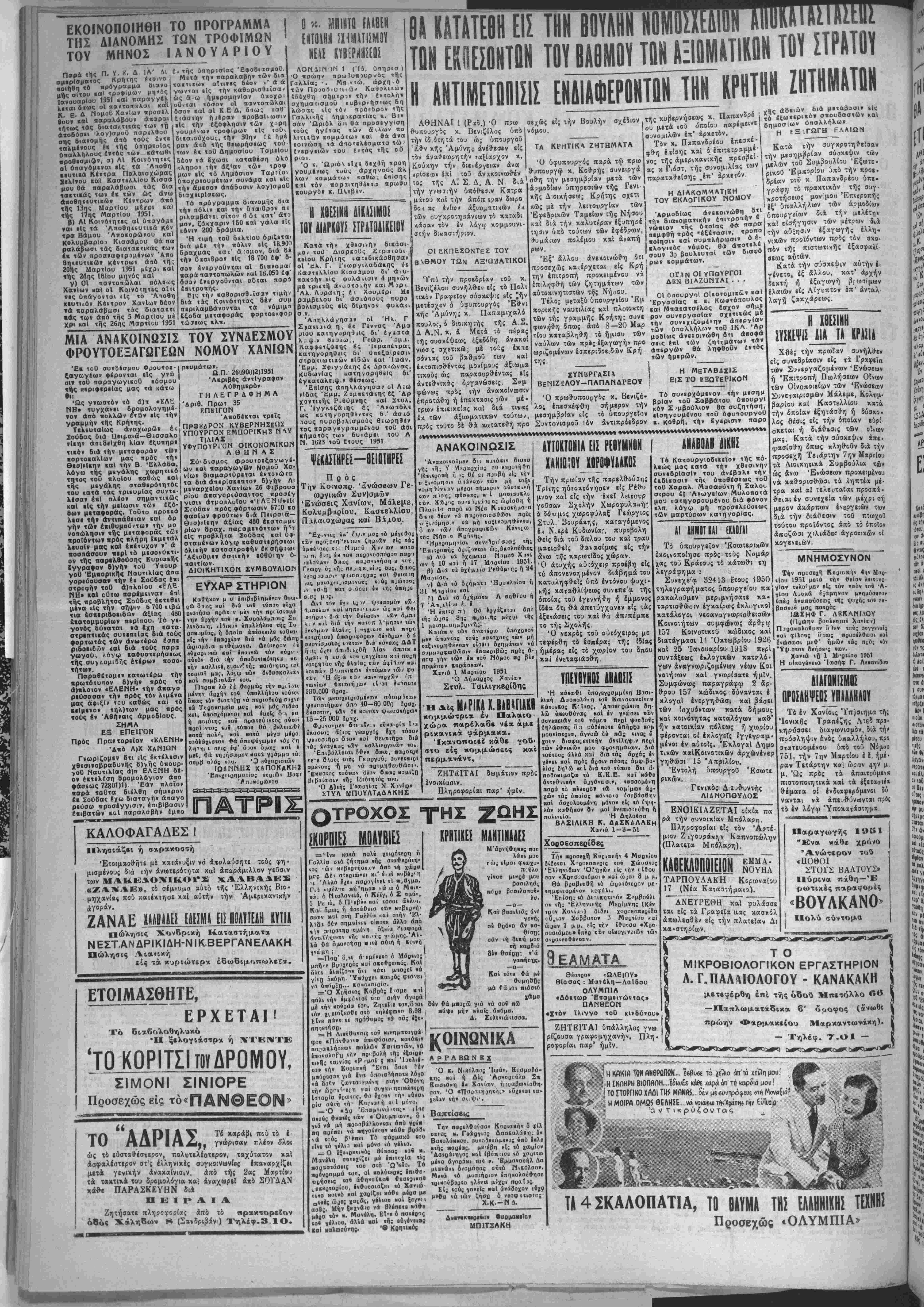 αήι>ιιοο<326.000 Είς την προιυμαΐα* τής Σού 6ας καί πολύ πλησίον τοθ λι μένος αί μεγάλαι αποβήΐαι τής Άνοοτΐίής Τραπέζης ηα ραμειουν από καιρόν εντελώς κινα). Αί αποθήκαι οδΊαΐ θά ποοσί·«ρον μεγάλας έξυιιηρί- τήσ·ις ιΐς τό έαπόριο» των Χανίων «αί δή «[ς τό ΤίΚωνιϊ όν Σούδας διά την στέγαοιν καί προφύλαξιν των ιΐσαγομέ νων καί έξαγομένωνττροΐόντων, έμπορκυμάιων κ λ.π , τα ότοϊα πολλάιΐς καταστρίφονται είτε θειμβνα είς τό ϋταιθρον. Καί διά τοθτο αναμένομεν δτι θά ληφθή μΐα απόφασις περΐ έπα ναχρησιμοηοιήσιώς των, η περωτής»εα»ν είς την Βουλήν τα κατατεθή ί φάχελλος τής υπο θέσεως Κατραμάτου εδήλωσεν 8τι άν &« ζητηθί) οίόΐος άσφ«· λώς θ} κατατεθή είς την Βου¬ λήν. θβΙ Ο ΡΩΣΟΣ ΕΠΙΤκΤΡΑΜΜΕΝοε Ό πρω8·υπουργός χ. Βενιζέ- λος έδέχ^ σήμερον την 11 30 τ. μ. τβν Ρώίβν Ιπιχετραμμέ νόν χ. Τσερνίτσεφ δίτις ιόν ά πεχαιρέτησε π,οοχειμένου νά αναχωρήση την προσέχη Δευ τέραν έπ' αδεία είς Μούχαν. Η ΑΥΙΗΣΙΣ ΚΛΛΗΝ1ΛΛΜ ΕΞΑΓΩΓΗΣ ΠΡΟ ΙΌΝΤΩΝ "Υπό την προεδρίαν τοθ άν ππ/»οέδ?ου τής κυβερνήσεως κ. Παπανδρέου συνεκροτήθη την μεσημβρίαν είς τό υπουργείον Συνιονισμο) σύσκιψις τοΰ Σομ- βουλίου Έξωτε^ικοΰ Έμπορίου ».ί; ήν μΗϊέοχον οί ΰπουργοί Οίκονομιχών, Γεωργίας χαί Έμ ηορίον χ. κ. Κωτιάπουλος, Λαμ πρόπουλος χαί Γχλχβάνης, «ρ· μόδιοι ΰπίλληλοι των υπουργεί¬ ων Συντονισμοί) καί Έμπορίου Ί 'Αμεριχανοί ίμπειρβγνώ μονες. γφ η ροφορίις τί Συμβούλιον Έξοο τεριχοθ Έμπορίου ήιχολήθη μ£ την συζήτησιν των μέτρων τ» 4π:Εα πρέπΐι νά ληφθ·οϋ/ δ.ά αύξησιν τής έξαγωγής ίλ γήν 5 χιλιάδων Κύπρου. ΤΑ ΕΚΛΟΠΚ* ΤΜΗΜΑΤΑ ΚΑΤΔ ΤΑΣ ΔΗΜΟΤΙΚΑΣ Έκ τοθ θπουργιίου "Εσωτΐρι κων άνεΐοκώθη δτι κατά τάς έπικίΐμένας δημοτικάς έκλονάς αί Αθήναι β·ϊ χωρισθοθν ιίς 6 έιλογΐίά διαμίρΐοαατα, ό Π»ι ραιΐϊύς ·1ς 5, ί| 9ίσσ·λονΙ η •Ις 3 καί οί Πάτραι είς 4. Ο «. ΠΛΝΣΤΗΡΑΣ 3Α ΚΜΗ ΜΕΓΑΛΗΝ ΠΕΡΙΟΔΕΙΑΝ : γεωμήλων ίχ τ4 δεξιόν μ , ' χανοΐ πεζοναΰται κατέλαβον ί| [ δτ] δεσιτέζοντα ύψιΰματ* πλη·ί ε/ Τ'.Ι 3ημχντΐΝθο συγχ·ινωνια Ι χοϋ χόμβου Χ^εγχτσδν τον ί ποίον χατέχουν εισέτι οί χομμου νισταί. Μεταδιίεται σχετικώς ίΐι ύΐτά των συμμαχικόν 8υνά· μΐων κατελήφ&ησο'ν ήδη δύο λο^οσειραί καί σκληρο; αγών διεξάγεται τώρα δια την κατά- πιθβσεως την ίποίαν ίξαπίλυ- χήν κ,βωΐχν έπΙ(ρ*·*ς άντιυϊά«ως έΗ μέρβυς 10 χιλιόμετρον. Είς,τεΰ έχθροΰ. <Η άμεριχ^νική τοΰ τομέως ,'οί Άμε.9ΐΙάεβοιτο»(α ενήργησε σήμερεν ίτϊΐτυχιΐς 4ξΟ(9μή«εις βομβκρεΊ σ«<ΐ« β-τόχους των κβμμουνι »«»ν εί; την Β. _ορί«ν. δηιιοσ.ογραιθικάς πλη ρρς τα δύο έν τΒ κυβκρ νήσε· συ*·ργαζόαενα κόμματα κοΐ τό Λοϊιόν «πο<λΙνου» όπερ - τής απόψιως 9πως κατά τάς τιροσ*χεϊς £<λογάς μή δοθή κσμματικός χαραιτήρ άλλά ά1 •βθοθν οί £<λογείς άνεπηρία στοι νά ψηφ'σουν τοος άρ( στους δημοιικούς «αί κοινοτι- κούς άρχοντος. Αντιθέτως ή ΕΠΕΚ θά υπο δείξη ιίς ολόκληρον την χώραν (θίους ύΐτοψηφίους διά τό άζ(ω μα τοθ δημάρχου. Κατά τάς Ιδίας πληροφορίας ό άρχηνος της ΕΠ3Κ κ. Πλα· σιήρας φέριται ιίηο·ασιαμέ*ος δπως έπιχ<ιρήση μεγάλην π·ρι οδιΐαν πρός υποστήριξιν τώ* ιατά τόπους ύιτοψη·Ιων τοθ . όμματός τού. ΑΘΗΝΑΙ, 1 (Ιίροπ.) Αυριον την μεσημβρίαν συν«ο/ο»ται ιίς «ήν τακτικήν έβδομαδιαΐαν ούσ«ϊψ'ν των. τα κοηοβουλιυ τικά ιιβλη τής ΕΠΙΚ. Κατά δηαοσιογραφικάς πλη ροφορίας την σύακψιν πρόιει ται νά αηασχολήση τό θεμα των δημοτικων έκλογών. Η Φ1Ρ0Α0ΓΙΑ ΤΩΝ ΚΕΡΑΩΝ ΤΩΝ ΕΒΙΧΕΙΡΜΣΕΒΝ ΟΙ ΗΕΟί ΣΥΝΙΕΑΕ1ΪΑΙ ΑΘ3ΝΑΙ, 12 (Ραδιθφ ) Έντός τής προσεχούς βρδομάββς άρ· χΐζει τάς εργασίας της ή Επι τροπή ή ό ιοία Θά καθωρΐση «ούς νεους συντελεστάς ε,ίρ- δού