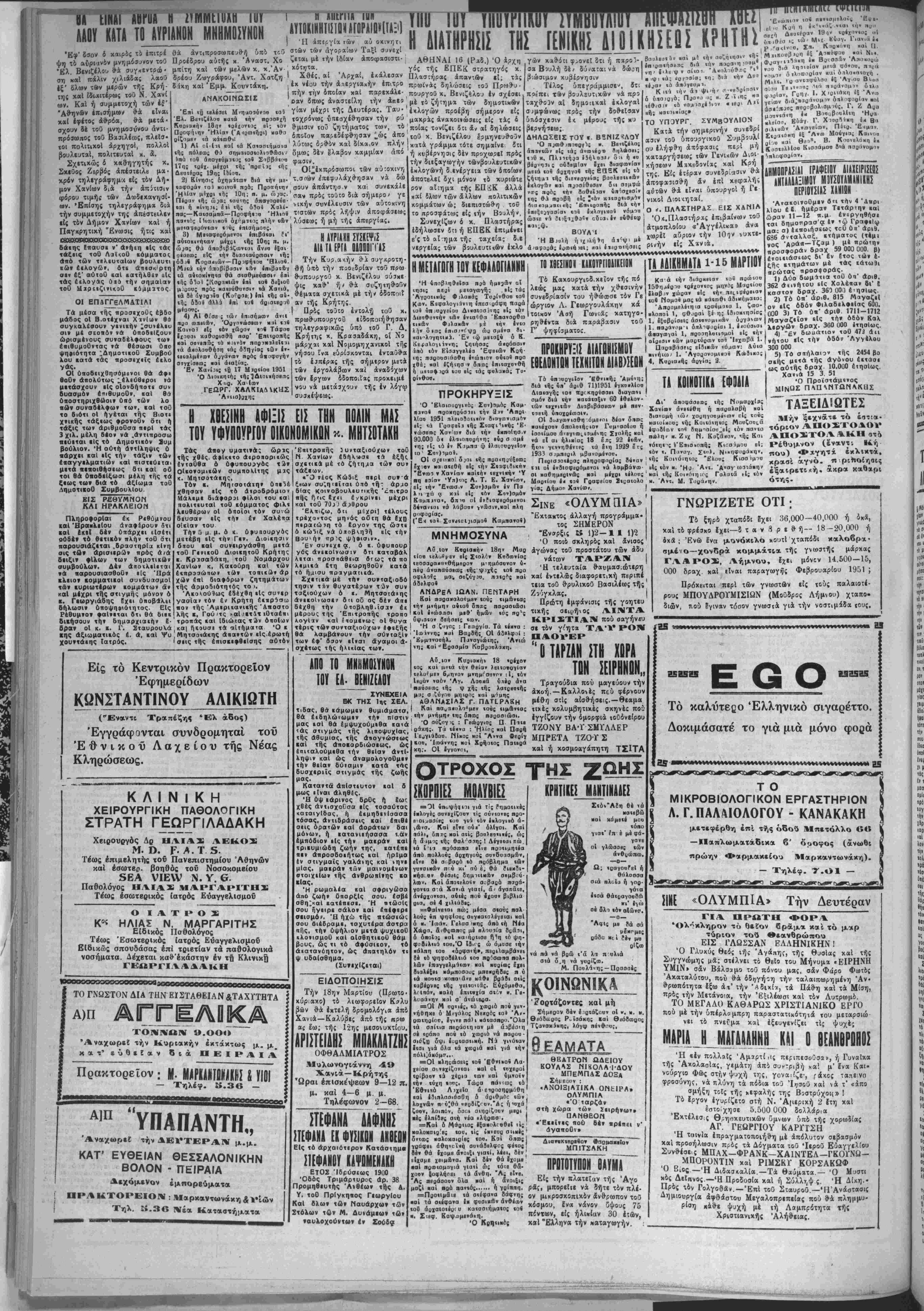 «ά νοο<ο κοπα'ά»β κ«θι βριϋι οιίς «αβερνι; «τ); γβι«οιΐάς. Εΰχόμβθα, ληηόν, ιαλή ίπκνχία οι;.» ι. Γ»· λοοάκην Μοί α' άνώι&οα. =01 Μ υονιέ;, «ό χτοαιό πού γί«· •ήθηκβ ό Μκγαλος Νβ»ο6ς ιο» Ά»· θακηοίοο, βγινβ ηά?ι Μάιααηοο.Όλα «ά σ»1«ιο ηβραοτη ιαν μέ ά^βέαιη αε «ρόηο πού «ό χωοιό νά ηαα,υυ- σισζΐ) δψι ίϋυ«αοιιν)ή. Μί γινό«αν •«αι γιά όλα «ά κβοπιά ιαί γιά «ήν πόλι,ϊκόμΐτ... —ΟΙ κληοωαΕΐς «οί "Εθνι.ο· Λα· χβΐοα οΐΐ«εχ1ζαν«αι «αί οί «οχβαοί «ρΐβοαν «ά χίςια «ών καί ϋμνοίν ιή» τύχη ΐΊΐς, Τώβα παν πας «ό 'Εθνιιό Λιχβΐο άειοοοηομπθη «αί ίίιηλαοιόαθη ό άριθμος «ών. λαχντάν ηΓ«;θά ·*ο8ίζ·'«ν.Άς ή '«χά ' ζοον, λοιπθν, όοιι αιηοιζουν ■έ; έλπίδες σιή νβα «λήραιβ'. | Καί δ Μόα«ιος 1ξα«ολοαθεΙ 11; «αλοΝαιβ'ε; «ου, «ίς {«ίβυρ σ_ιι«ες ' όνια>; «αλοκα>ο'8( ιο<)· Κσί ο,ιωςΙ γααφβι όθηνεϊ<ή αυνάοβλφος φέ«ος, 8β» Θά ίχομβ άνοιζι για«(, λάβι. βέν ' είχαμε χβιμΔνα. Καί δεν θά 2χομε «αί πρακομαγιά γΐατΐ ώς «ό:β θα· χοο» ξοφλήαβι τα άνθη. "Αί βΐνβ. . , Ας ηβαάοοο» δλα «αί ή άνοιξις Ε-'ς την πλατείαν τής Αγο μαζί «αί ποό ηα»«ός...... ή γοίπππ. ρ£(, μπορεΐιε να δήτε τόν πλέ· =Π0ο«ιμα»β «ά ο«ίφα»α βάςρνης ον μΙΜροσχοπιχον άνθρωπον τοθ 'Ζορταζονιες καί μή Σήμβοον δέ* ι ιοτάζουν οί ν, κ. κ. θίόδουοος Ρ^ϊαάκη; και θβόδωρος Τζανακίκης, λόγφ ΘΒΑΤΡΟΝ ΩΔΕΙΟΥ ΝΙΚΟΛΑ·|·ΔΟΥ ΜΠΕΜΠΑΣ Δ08Α ί «ΛΝΟΙΞΙΑΤΙΚΑ ΟΝίΐΙΡΛ» ΟΛΥΜΠΙΑ «Ό ιαρζάν στή χώρα τώ» ϊειρή»ωτ» αΑΝΘΕΟΝ •Έκεΐ··ς ποΟ 6έ* βρίηει ν άναηοθι» Δια~κ««οείον ·αομα«ε!ον ΜΠΙΤΣΛΚΗ ΠΡΩΤΟΤΥΠΟΝ 8ΑΥΜΑ 25252! Ε Ο Ο 252525 Τό καλύτεςο Έλληνικό σιγαρέττο. Δοκιμάσατέ το γιά μιά μόνο φορά 25 Ι 1 τ ο ΜΙΚΡΟΒΙΟΛΟΠΚΟΝ ΕΡΓΑΣΤΗΡΙΟΝ Λ. Γ. ΠΑΛΛ.ΙΟΛΟΓΟΥ - ΚΑΝΑΚΑΚΗ μετεφέρθη επί τής όδού Μπετόλλο ββ —Παπλωματάδικα β' οοοφος (άνωθι πρώην Φαρμακείον Μαρκαντωνάκη). 1 ' " ■ «.·.·— Τηλέφ. 7.ΟΙ — ·. Σ«βφ. Κοψαιμ«»ά«η. Ό Κοΐ)«ι»ος πίντων, είς ηλικίαν 30 έτών, κ«1 "Ελληνα την καταγωγήν. Ι1ΗΕ «ΟΛΥΜΠΙΑ> Την Δευτέραν
