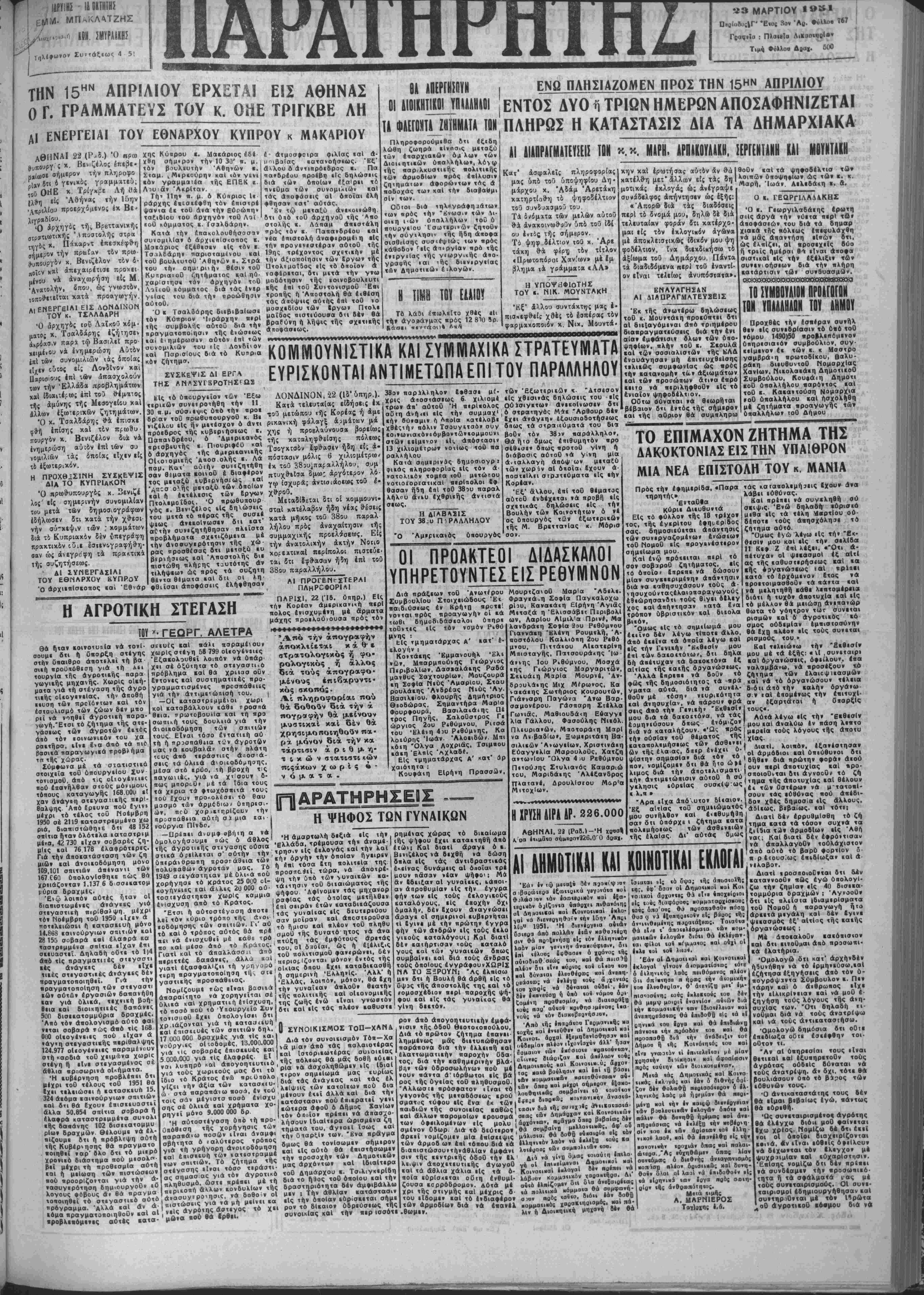 Γςαφβϊυ : Πλαιβΐα ΛιΚαοι<χ)ΐ»ν Τιμή ΦύΚλοα Αα,αχ. 600 ΤΗΝ 15ΗΝ ΑΠΡΙΛΙΟΥ ΕΡΧΕΤΑΙ ΕΙΣ ΑΘΗΝΑΣ Ο Γ. ΓΡΑΜΜΑΤΕΥΣ ΤΟΥ κ. ΟΗΕ ΤΡΙΓΚΒΕ ΛΗ Α| ΕΝΕΡΓΕΙΑΙ ΤΟΥ ΕΘΝΑΡΧΟΥ ΚΥΠΡΟΥ κ Μ4Κ4ΡΙΟΥ ΑΘΗΝΑΙ 22 (Ρ- φυπουργ ς χ- Βενιζίλος ρ«(α>οι σήμερον την πληροφο
