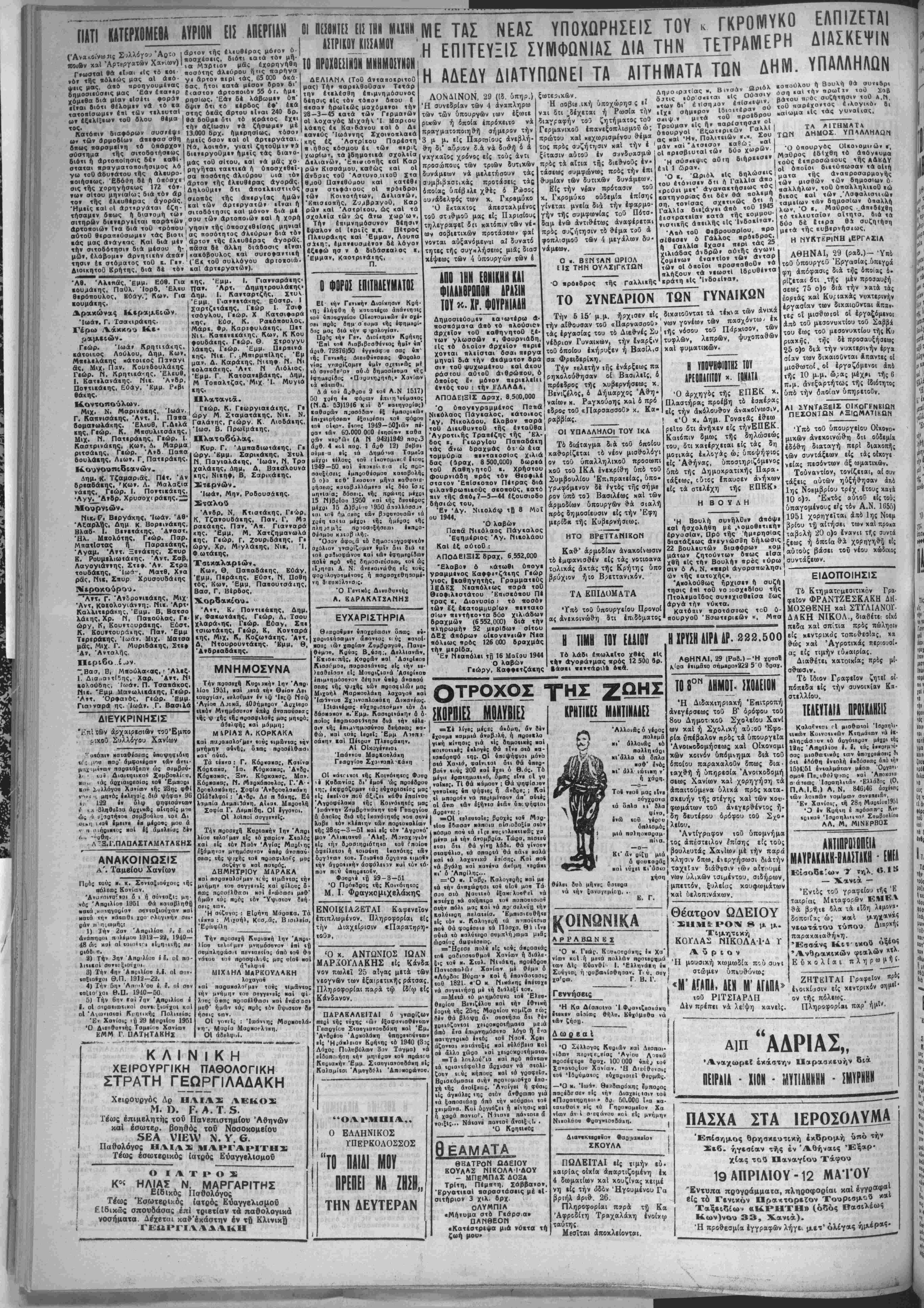 ριακ»3«. τ^ί δ> πρ°β<*υξήοιως 25 ο)ο διλ την νυκτερινήν εργ« οίαν των δικαιοθνται Απαντες ςί μΐσ&ωτοί.οί έργαζόμενοι άπ6 τής ιο μ·μ· ώ/α» ^χ·» % 6 π.μ. ανεξαρτήτως τής ιδιότητος ύπδ την δηοίαν ύπη&ιτοϋν. ΑΙ ΝΑ ΠΕΣΟΝ1-Ν θΝΝ ΑΞΙβΜΑΤΙΚΟΝ 'Γπώ τοθ ΰπουργεΐου Οίχονο- μιχών ανεκοινώθη δτι ούδεμΐα εδόθη διαταγή χών συντάξεων Η ΤΙΜΗ ΤΟΥ ΕΑΑΙΟΥ Τό λάδι έηωλιΐτο χθ*ς είς τ Ι) ν άγο·άνμας «ρός 12 500 9ρ. Βάσει «ιντάοΟΙι 6κβ. ΟΙ «άϊπιοΐ «ής Κοινόιηιος Φι)υο <ε Κοδοονίας 8ι' Ιιιοί ώς ηοοέοουυ ιη;, έκφοόζομεν ιά; Ε«χαοιο«ίσς μας β(; {«εΐνον πού άξιζβι «άθί ΐπαΐνου ΆγοοφνλαΝα ιή: Κοινό»η«ός μας Ιωάννην Ζ'ίμβοϋκάιιην «ο« Γί ό όΐ Οά ή Ιό ΣΚΟΡΒΙΕΣ ΜΟΛΥΟΙΕΣ ι —Σέ λίγβ; μέςες άκόμη, άν Β·ν Ιχοομε καμμιά άναβολή, ή ποοχλα νίκη Μΐνηοις γιά «1; Βημοιικές «αί «οινοΐκέ; {«λογΐς Θά ίΐνβ α«ό »α- «αιόοοφό τη;. Ο» νποψήφιοι μόνο αιά Χα»ισ, φαίνκαΐ ό«ι θά 0πβο· βα«ν «ού: 200 «οί «χβι ό θ.ός. Τό μίγο Ιρωΐημιχιιό, όμως είνε οί γυ ναΐκβς. ΤΙ θά Νάμοαν ; θά ψηφίσιον γβναί»βς 4π ψήφιε; ή ά·οοβ; ; Καί «1 ιιποοο«ν να κευΐμίνουν άη' οδ«4ς οί άνω «ών ί-ήν«α ί«ών ύΐΐψήφΐαι ό όιοΐος Οιά ιή;Ιπανόιηίό; «οα οονί λαββ _ «όν κΧίηιην «ών ηοριοκαλίον Ι ,1οο §βωοαν «αηοια "αΐσ.οδοξίο ο«όν β η ρ(ο>