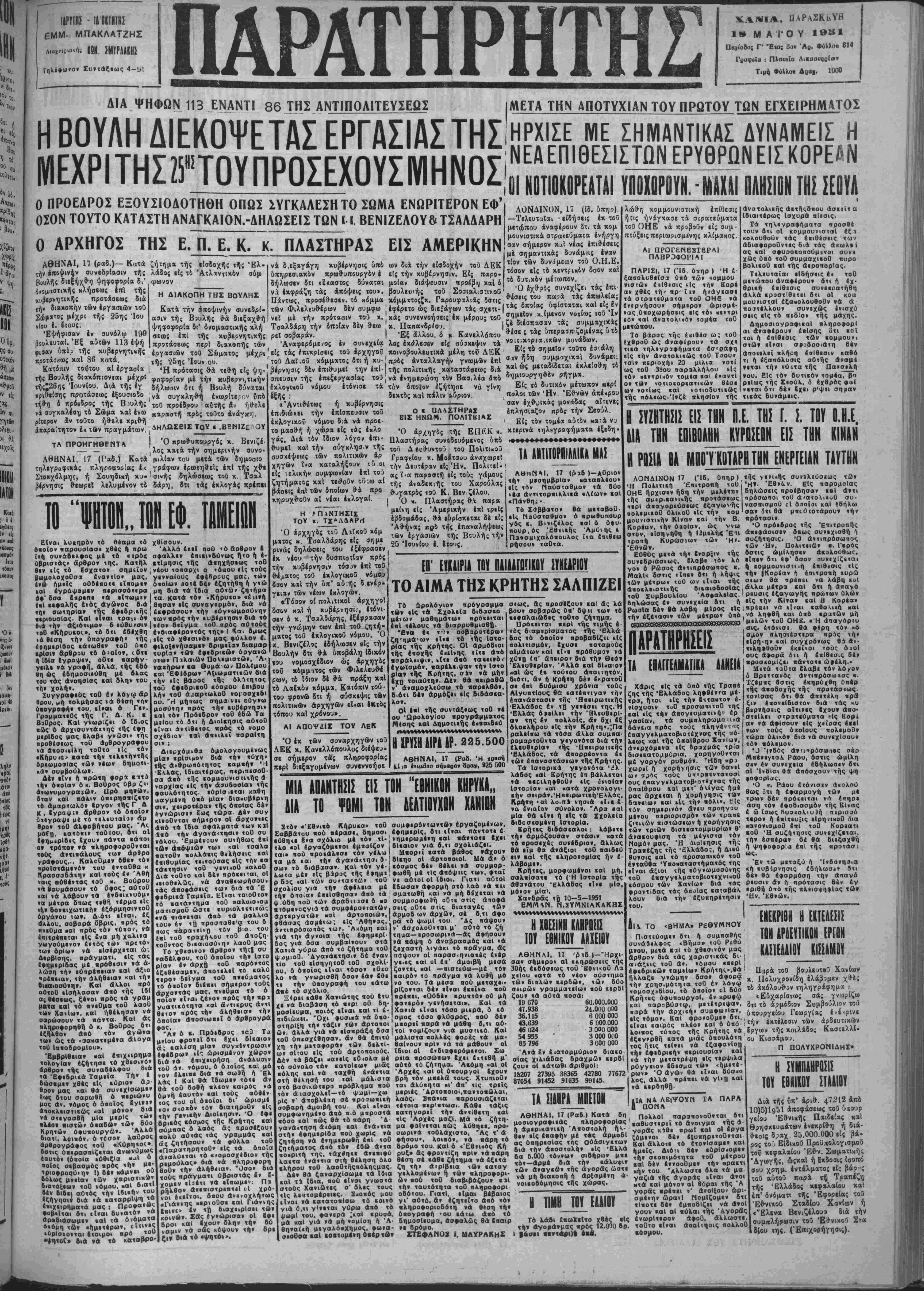 τηλεγραφικάς πληροφορίας ε< γράφων ερωτηθείς έηΐ τής χθε Στοχχόλμης, ή Σουηδΐκή χυ·' σΐνής δηλώσεως τοθ χ Τσαλ θεωρεΐ λελυμένον το δάρη, δτι τάς εκλογάς πρέττει III "ΜΟΙ 1ΕΦ. ΒΗ ψηφοφορία δι* όνομαστικής κλή Τσαλδάρη την ίπ^ίαν δέν θεώ σεοος επι τής κυβερνητικάς ρεΐ σοβαράν. | Έξ «λλου, ό χ Κανελλόπου προτάσεως περί διακοηής των Αναφέρομεν έν συνεχιία λος εκάλεσεν είς σύίχεψιν τα εργασιών το3 Σώματος μέχρι' είς τάς ίπικρίσεις τοθ άρχηγοΰ χοινοβουλευτΐκά μέλη τοϋ ΑΕΚ τής 25ης Ίοαν ου. ' τού Λαί,οΰ χόμματο; δτι ή κυ· πρός ανταλλαγήν γνωμδεν επί •Η πρότασις θά τεθή είς ψη- βέρνησις δέν έπιθυμεΐ την επί '-Λ- ■ Είναι λυεηρον τό Θέαμα τό οποίον παρουσΐασε χθές ή πρω ΐ·ή συ»άδ«λφος μέ τδ «ΐρος Οβρισιάς» άρθρον της. Κατήλ θεν ιΐς τό Εσχατον σημιΐον, βωμολοχοθσα ένανΐΐο» μας, <»ω ημείς ουδέποτε ιϊιιομε» καΐ εγρόψαμεν «ερισσότιρα άφ' βσα Εαρεπε <ά είπωμενΙ εκΐ εεφαλής διός αγώνος β·ά την σωτηρίαν τής εφέδρ.»ής; περιουσίας. Καί είναι τρα>· ό*