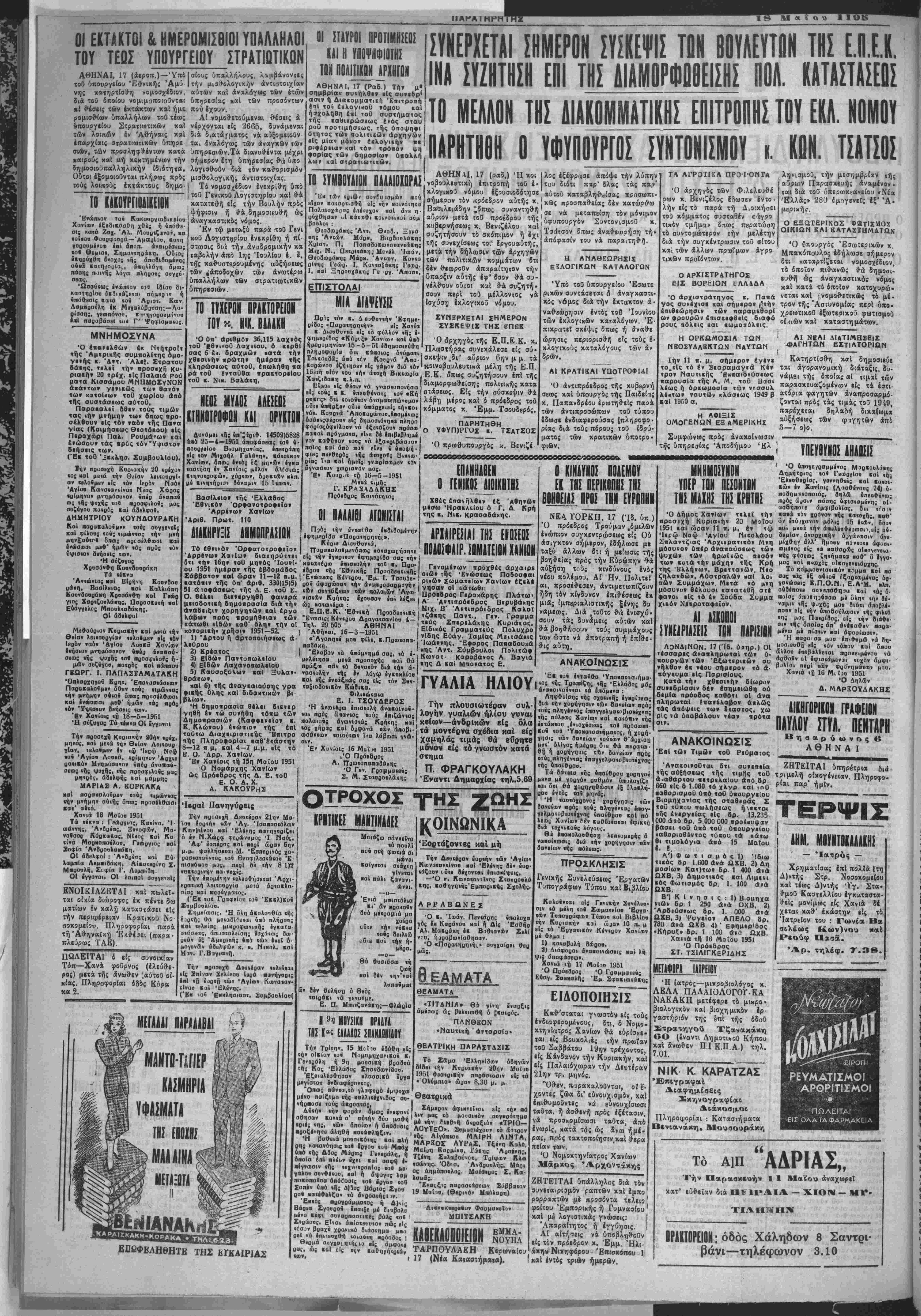 Χανιά <ϋ 17 Μοίοο 1951 Ό Ποθιαοος Ό Γοαμμαίβύς Εύαγ. Σακκαλής Έμ. ΣφαΒιωιάΒη; ΕΙΑΟΠΟΙΗΣΪΣ Κ«θ·'σταται γνωστόν είς τούς ενδιαφερομένους, δτι, ό Νομβ- χτηνΐατρος Χανίων &ά εδρίσχε· ται είς Βουχολιές την πρωΐαν τοθ Σαββάτου 19ΐ?ν τρέχοντος, είς Κάνδανον την Κυριακήν, καί είς Παλαιόχωραν την Δευτέραν 21ην τρ. μηνός. "Ο&εν, παρακαλοθνται, οί έ¬ χοντες ζιϊα δι' ευνουχισμον, χαί έπιθυμοθντες νά εύνουχίαωσι ταυτα, ή άοθενή πρός εξέτασιν, να προσκομίσωσι ταυτα, άπό ενωρίς, κατά τος ώς δνω ημέ¬ ρας, πρός ταχτοποίησιν.χαΐ θερα πείαν των. Ό Νομοχτηνίατρος Χανίων Μάρκος Αρχοντάκης ΑΙΚΙΓΟΡΙΙΟΙ ΓΡΑΦΕΙΟΝ ΠΑΥΑΟΥ ΣΤΥΛ. ΠΕΝΤΛΡ1 Βησαρύωνος β ΑΘΗΝΑ Ι ΑΝΑΚΟΙΝΩΣΙΣ ΈβΙ τώ» Τιμώ» τοθ Ρευμαιος _________^_________ 'Α*α(οι»ο0ται Οτι συνεπεία ΖΗΤΕΙΤΑΙ ύπηρέτρια δια τής αθξήσιως τ«ϊς τιμής τοθ τριμελί) οίχογένβΐαν. Πληροφο- α.αβάρτου ικτρελαίου ατιό.δρ 0{βι _ ' · Λα,ν ιν Ύ 660 είς 6 1.080 τό ί ΐθ Ρ 1 ΚΛρ ** .ρ χνρ (αΐτηθ ΒαθορισμοΟ ύαό τοθ ύ«ουργεΙου Βιομηχανίας τής σταθεράς Σ τοθ τύηαυ πωλήσεως ήΛκτρι ■ής ενεργείας είς δρ. 13.235 000 ααό 6ρ. 5 000 000 αροεκυψχν βάσιι τοθ υπό τού ύπουργεΐου •οθοριοθίντος τύβου τα πάτω θι τιμολόγια οηό 15 ΜαΙου *· Ε. Α') Φ ω τ ι σ μ ό ς 1) Ίδιω τκός δρ 1.600 άν* ΩΧΒ. 2) Δή μοσΐω» Κατ)τω» δρ. 1 400 άνά ΩΧΒ, 3) Δημοτιεός καί Λιμένι (ός Φωτισμός δρ. 1. 100 άνά ΩΧΒ, Β') Κ Ι ν η σ ι ς : 1) Β>ομηχα