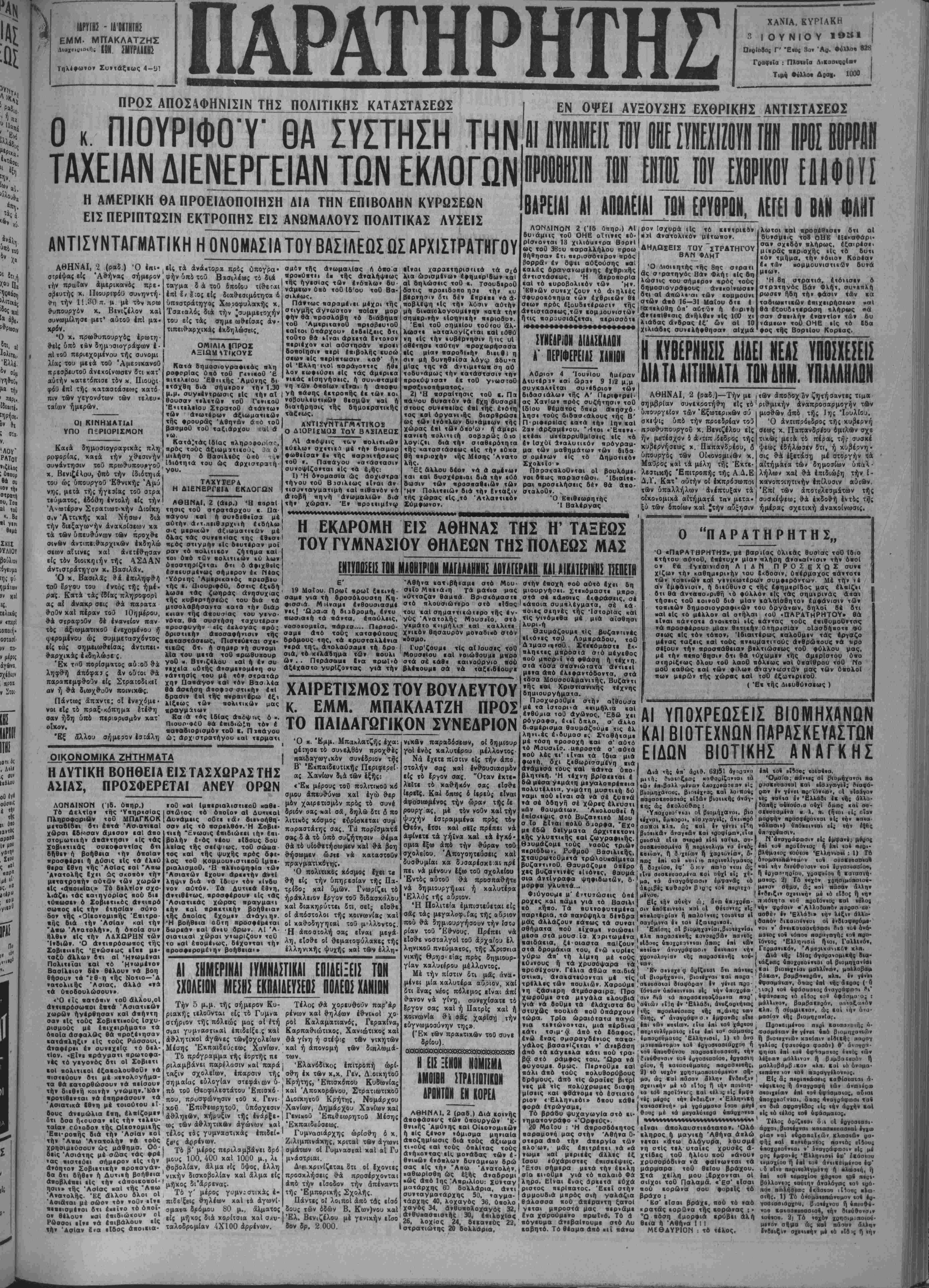 ΙΙΡ.ίΙ< - 1Δ0ΙΤΗΤΗΣ ΕΜΜ- ΜΠΑΚΛΑΤΖΗΣ ........μ. ΙΟΝ ΣΗΪΡΑΑΙΗί Τηλέφωνον Συντάξεως 4-1Π ΠΑΡΑΤΗΡΗΤΗ- ΧΑΝΙΑ. ΚΥΡΪΑΚΗ 3 Ι Ο Υ Ν Ι Ο Υ 19ΕΪ1 Πβρίοοθς Γ' 'Εΐος 3ον 'Λο. Φύλλο· 828 Γοαφεΐα : Πλσηΐα Διΐαα«ΐ)ρ(αον Τι»·) ·νλλο· Δααι. 1000 ΠΡΟΣ ΑΠΟΣ4ΦΗΝΙΣΙΝ ΤΗΣ ΠΟΛΙΤΙΚΗΣ ΚΑΤΑΣΤΑΣΕΩΣ Ο«. ΠΙΟΥΡΙΦΟ Υ' ΣΥΣΤΗΣΗ ΤΗΝ ΕΝ ΟΨΕΙ ΑΥΞΟΥΣΗΣ ΕΧΘΡΙΚΗΣ ΑΝΤΙΣΤΑΣΕΟΣ ΤΑΧΕΙΑΝ ΔΙΕΝΕΡΓΕΙΑΝ ΤΩΝ ΕΚΛΟΓΩΝ Η ΑΜΕΡΙΚΚ ΘΑ ΠΡΟΕΙΔΟΠΟΙΗΣΗ ΔΙΑ ΤΗΝ ΕΠΙΒΟΛΗΝ ΚΥΡΩΣΕΩΝ ΕΙΣ ΠΕΡΙΠΤΩΣΙΝ ΕΚΤΡΟΠΗΣ ΕΙΣ ΑΝΩΜΑΛΟΥΣ ΠΟΛΙΤΙΚΑΣ ΛΥΣΕΙΣ ΑΝΤΙΣΥΝΤΑΓΜΑΤ1ΚΗ Η ΟΝΟΜΑΣΙΑΤΟΥ ΒΑΣΙΛΕΩΣ ΏΣ ΑΡΧΙΣΤΡΑΤΗΓΟΥ ΑΘΗΝΑΙ, 1 (ραδ.) Ό επι· είς τα άνάκτορα πρός ύπογρα· σμόν τής άνωμαΜας ή όβο α ιΐνι τρέψαςείς Ά&ήνας σήμερον |φήνδπβ τού Βασιλέως τό διά , ^°"^:^^ςί.*?^ή*·βω.ς ^°, την πρωίαν αμερικανάς πρε¬ σβευτάς χ. Πιουριφόϋ συνηντή¬ θη την 11.30 π. μ μέ τόν προ» «υπουργόν χ. Βενιζέλον καί συνωμίλησε μετ' αϋτοθ επί μα· χρόν. Ό χ. πρω!Κ>πουργός ερωτη¬